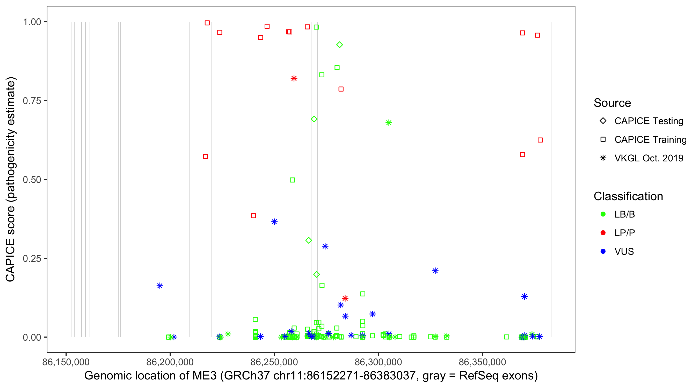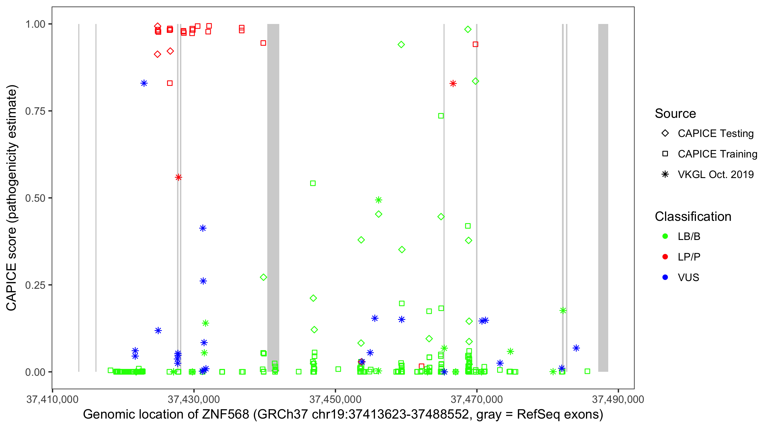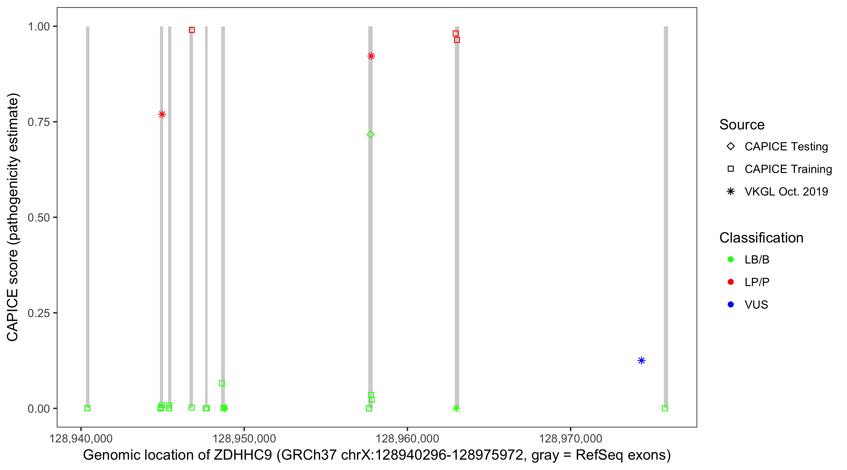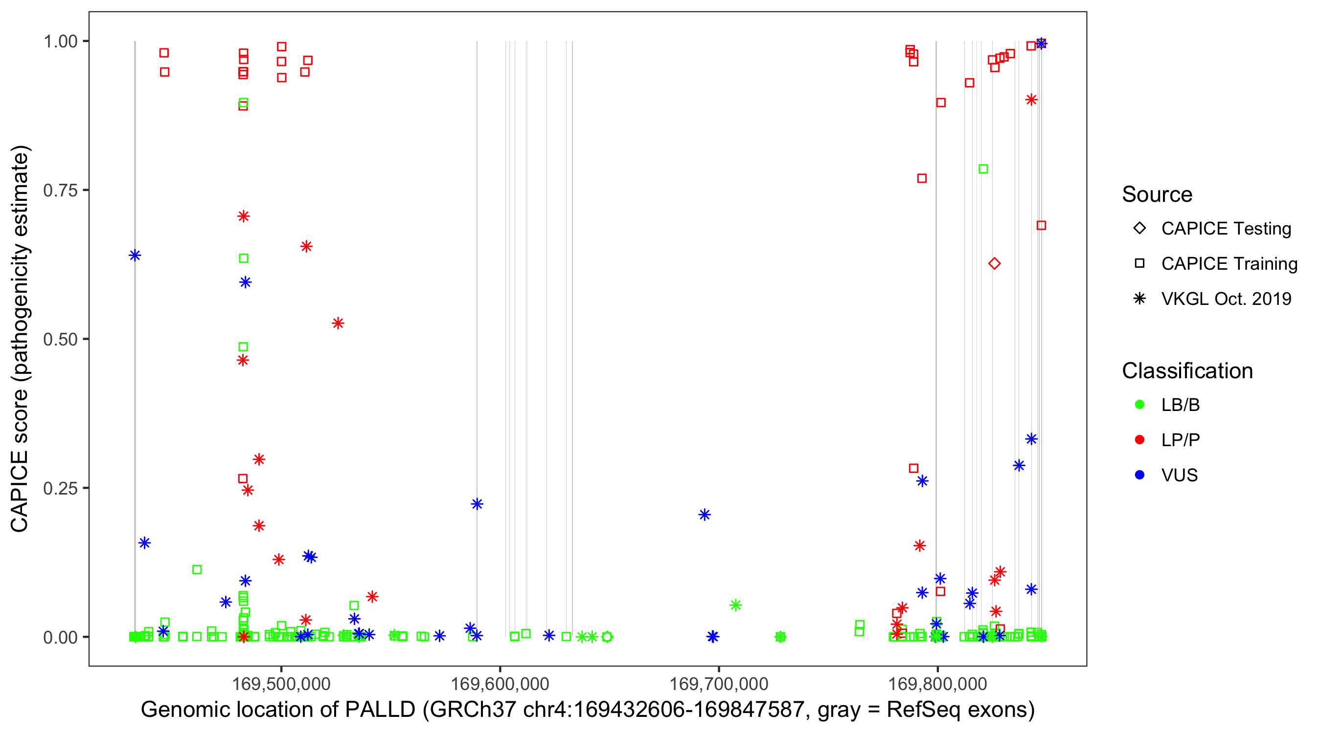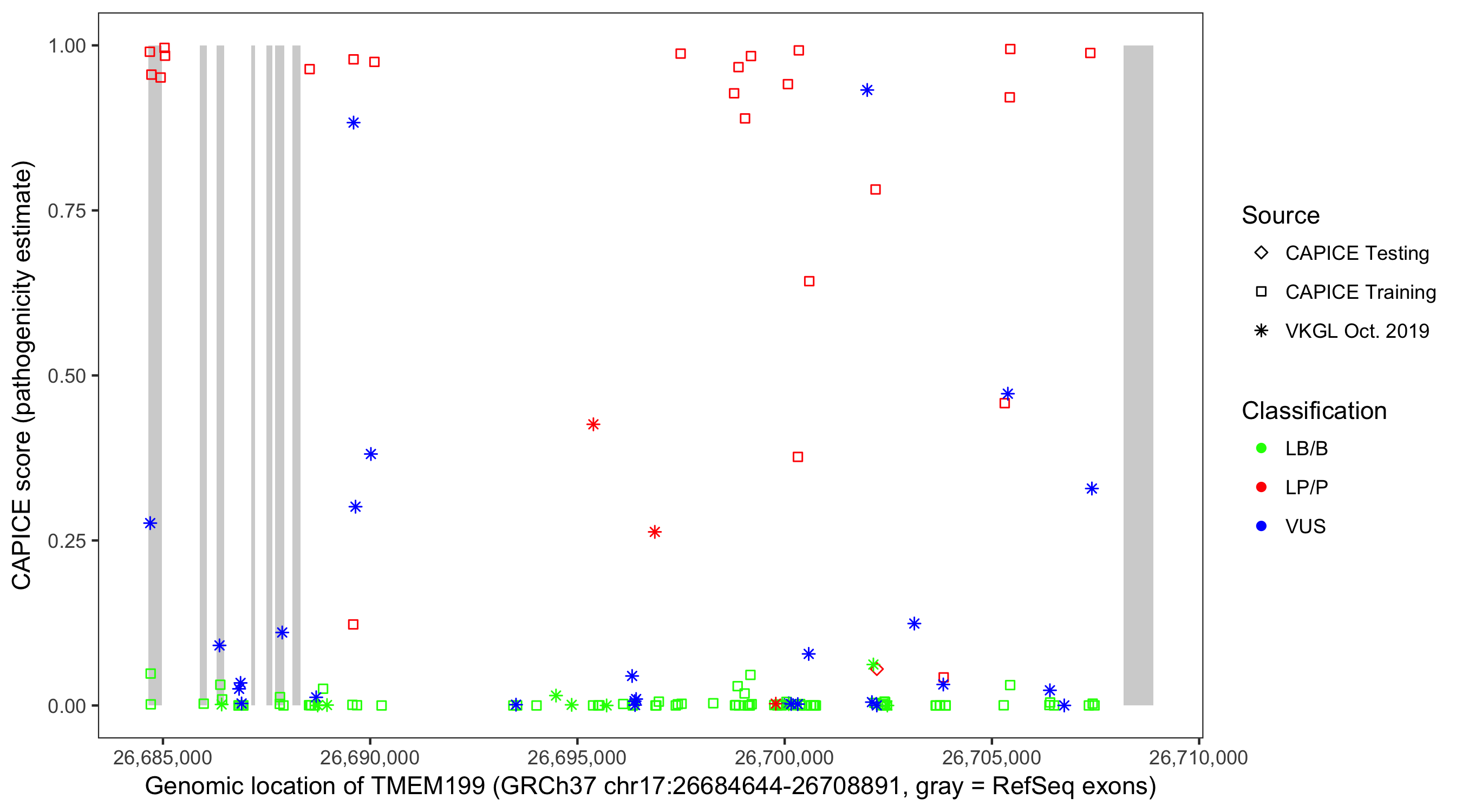 Shown are CAPICE train/test variants plus VKGL Oct 2019.