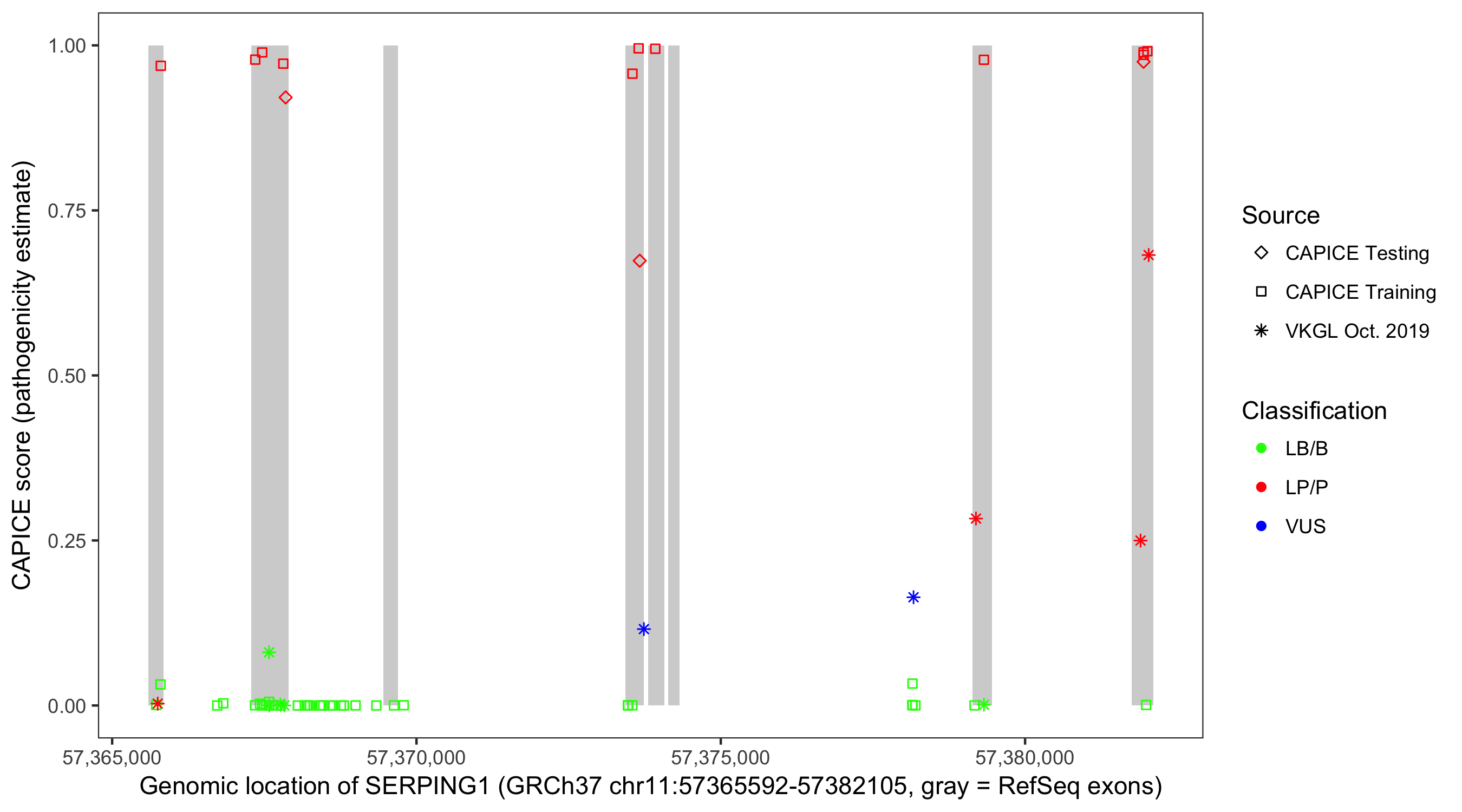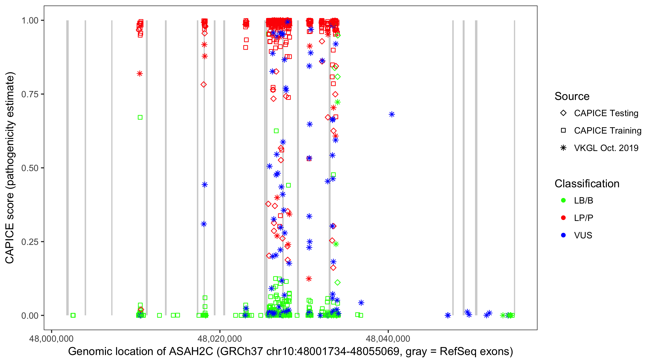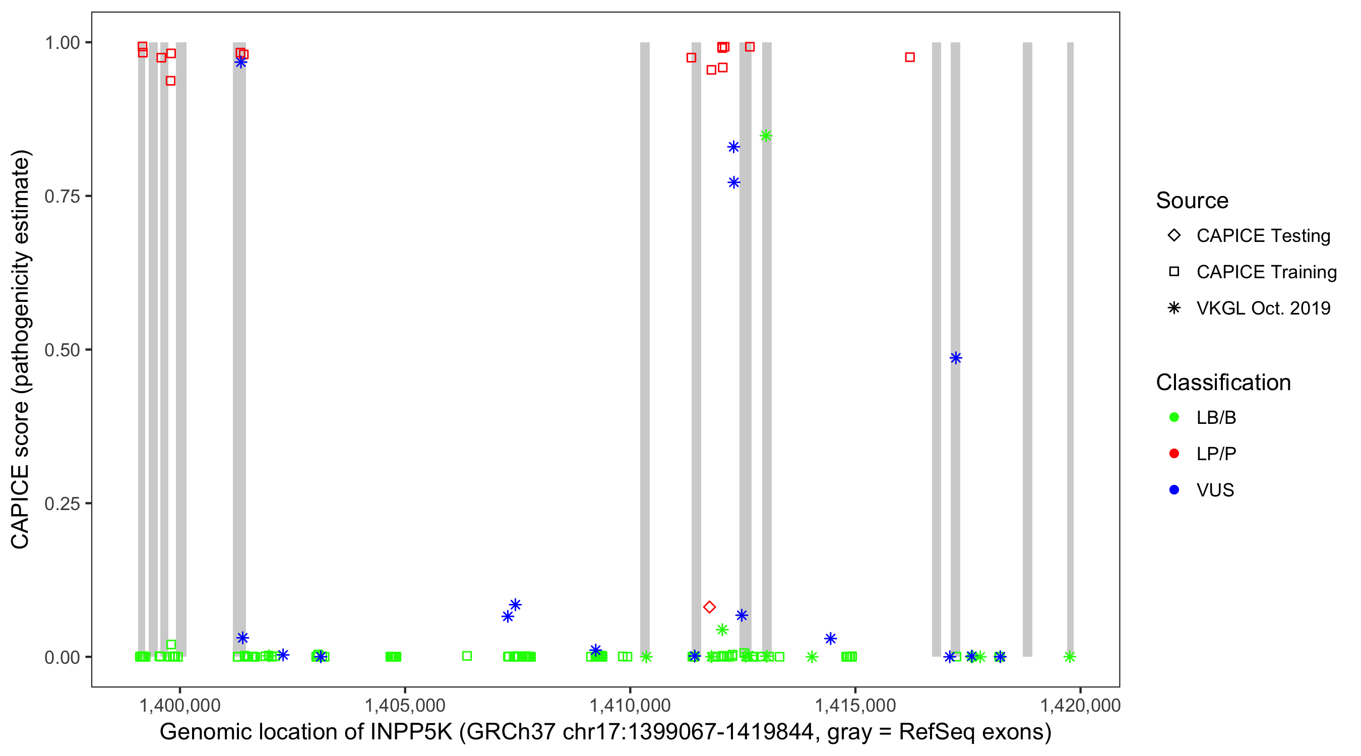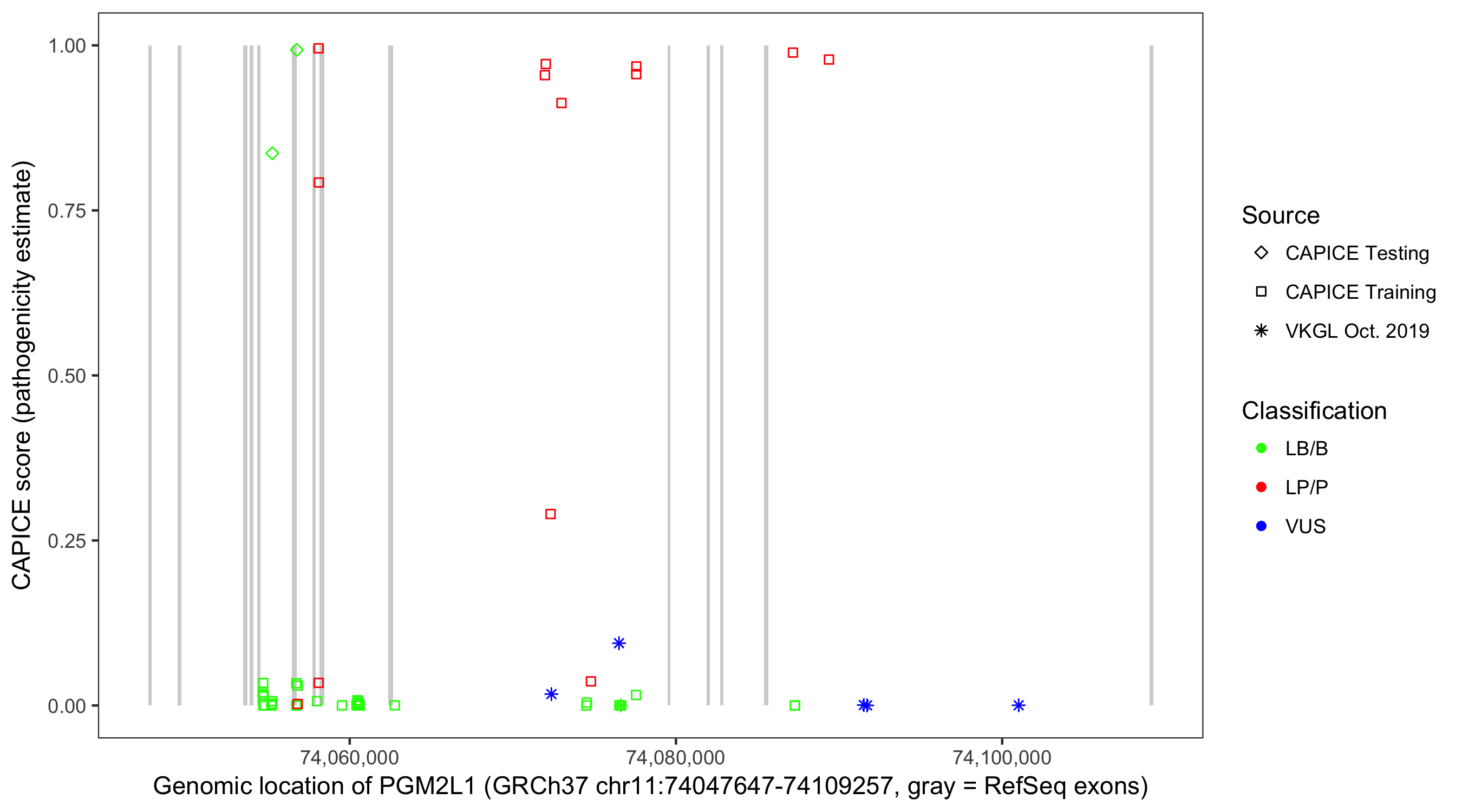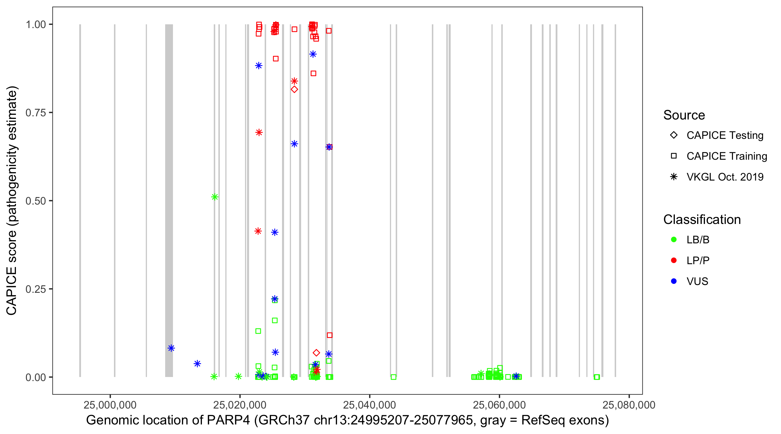Shown are CAPICE train/test variants plus VKGL Oct 2019.