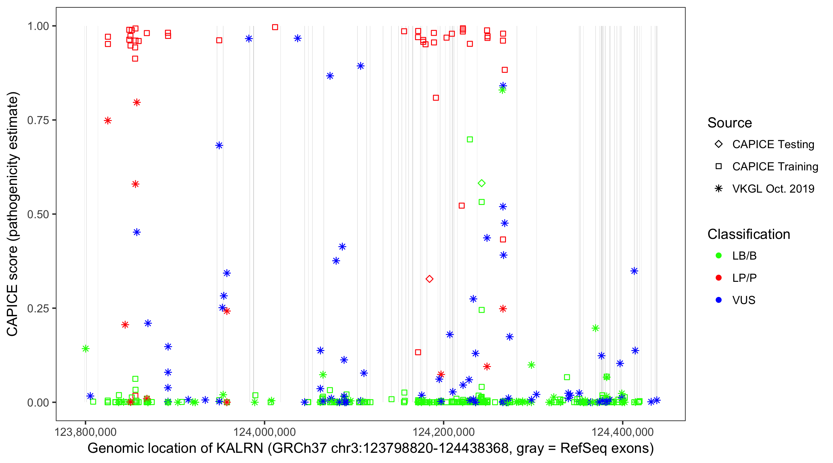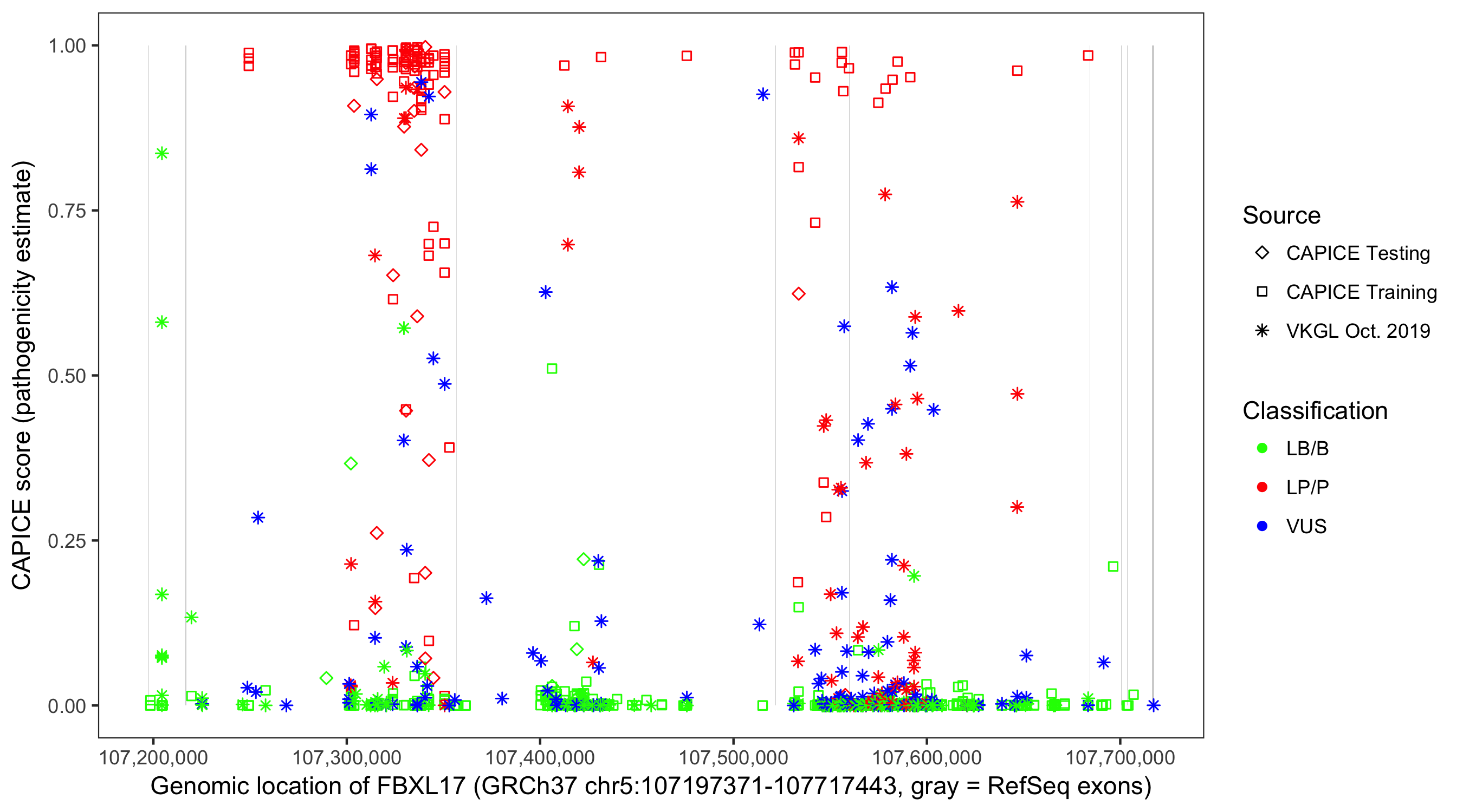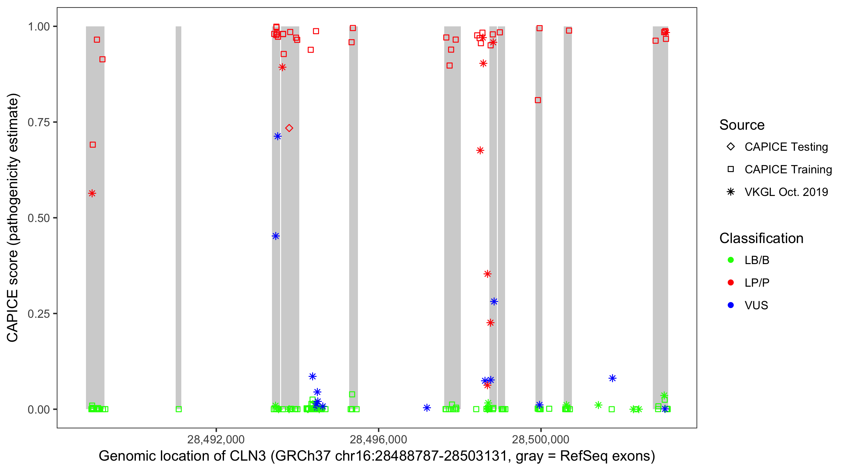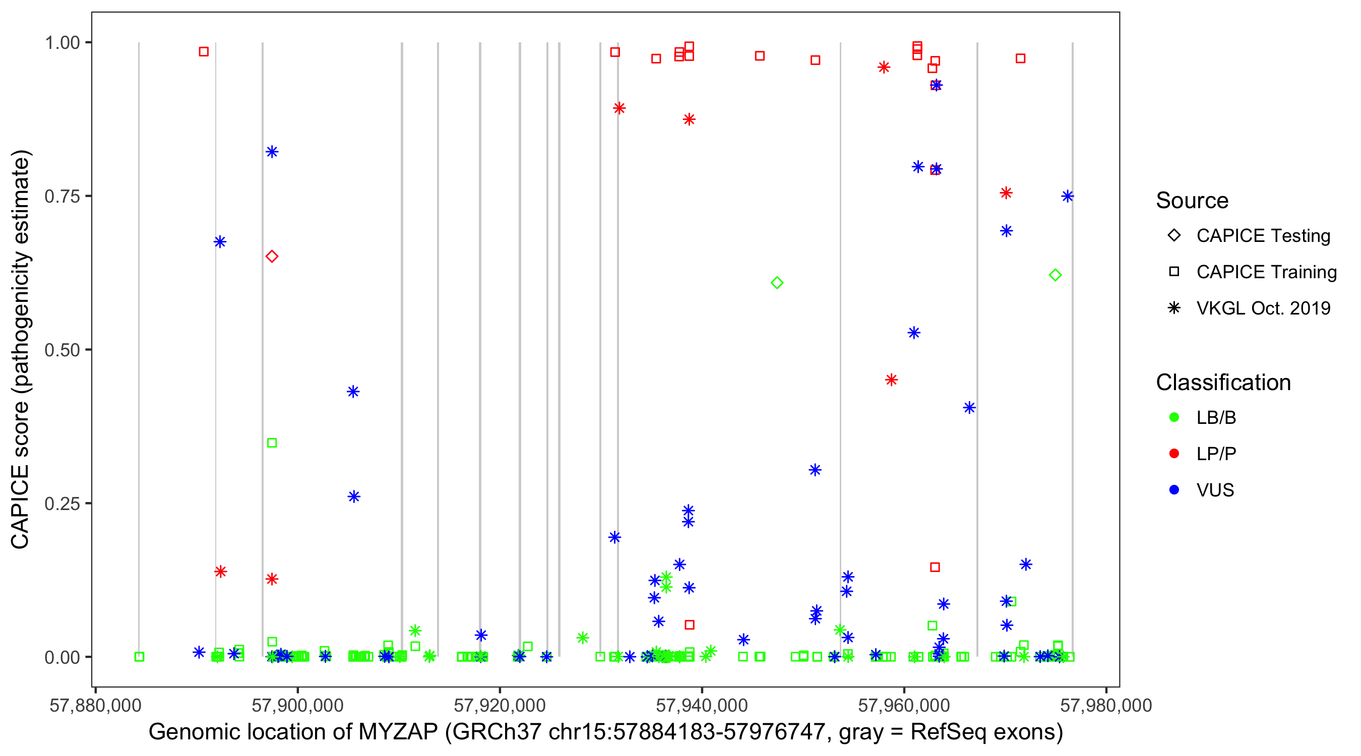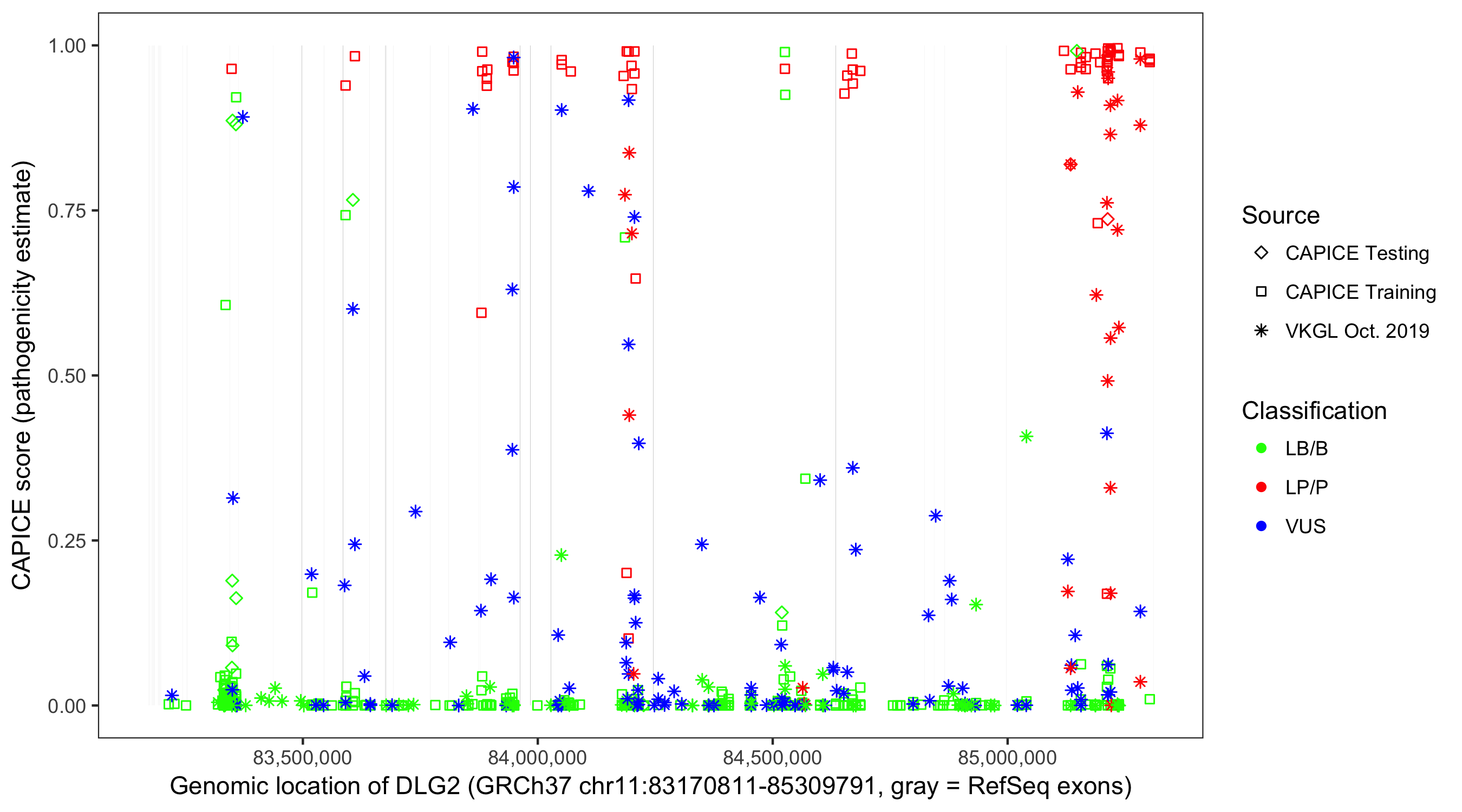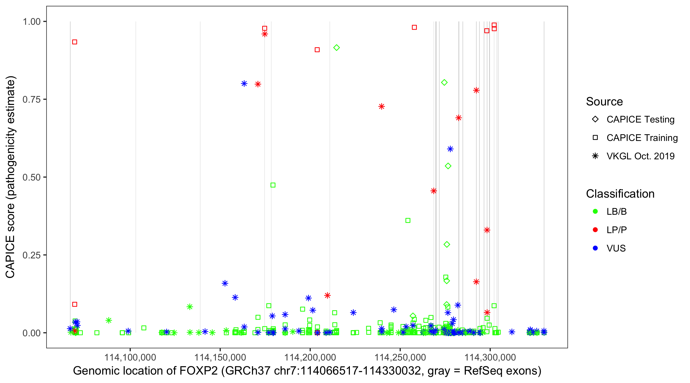 Shown are CAPICE train/test variants plus VKGL Oct 2019.
