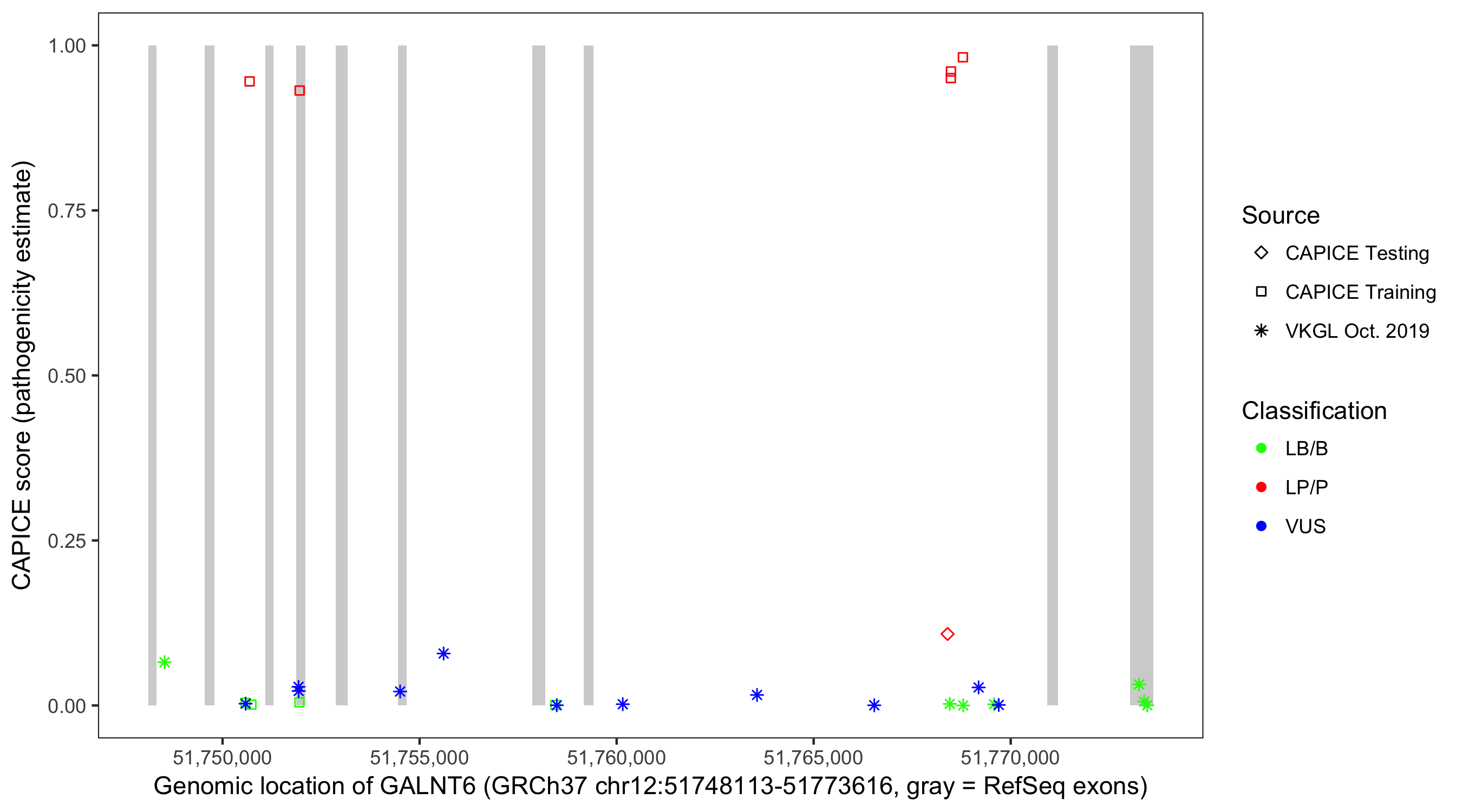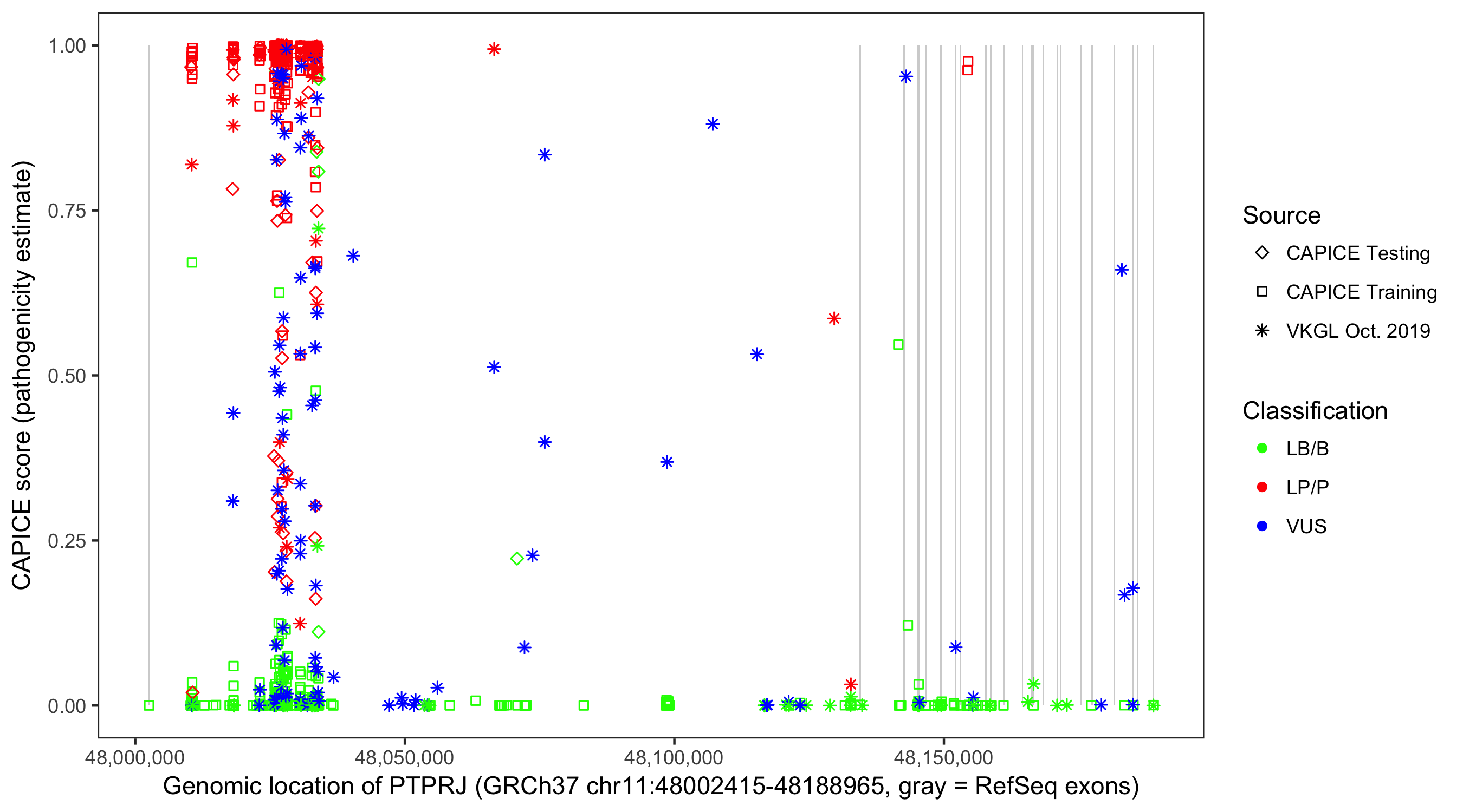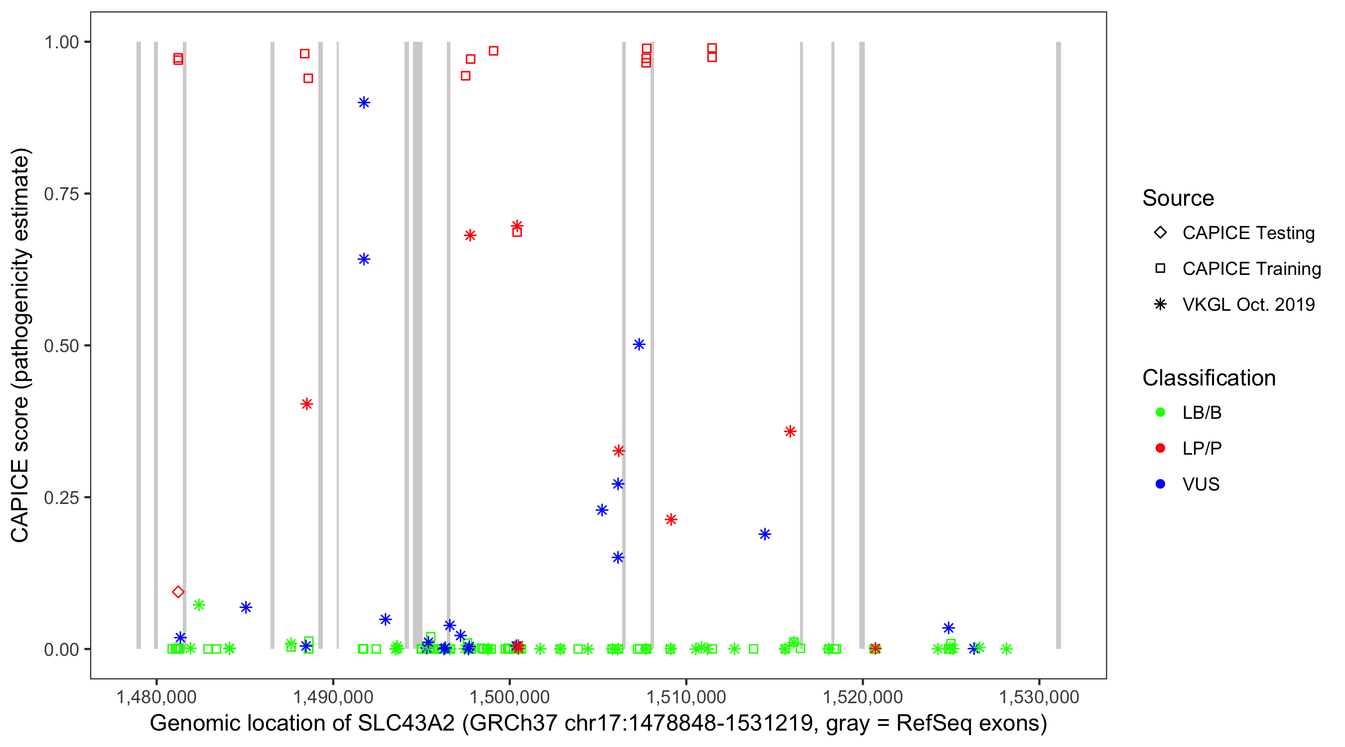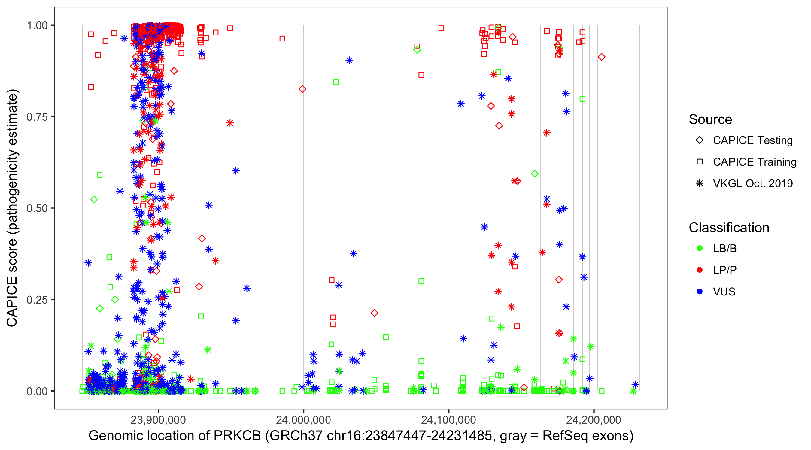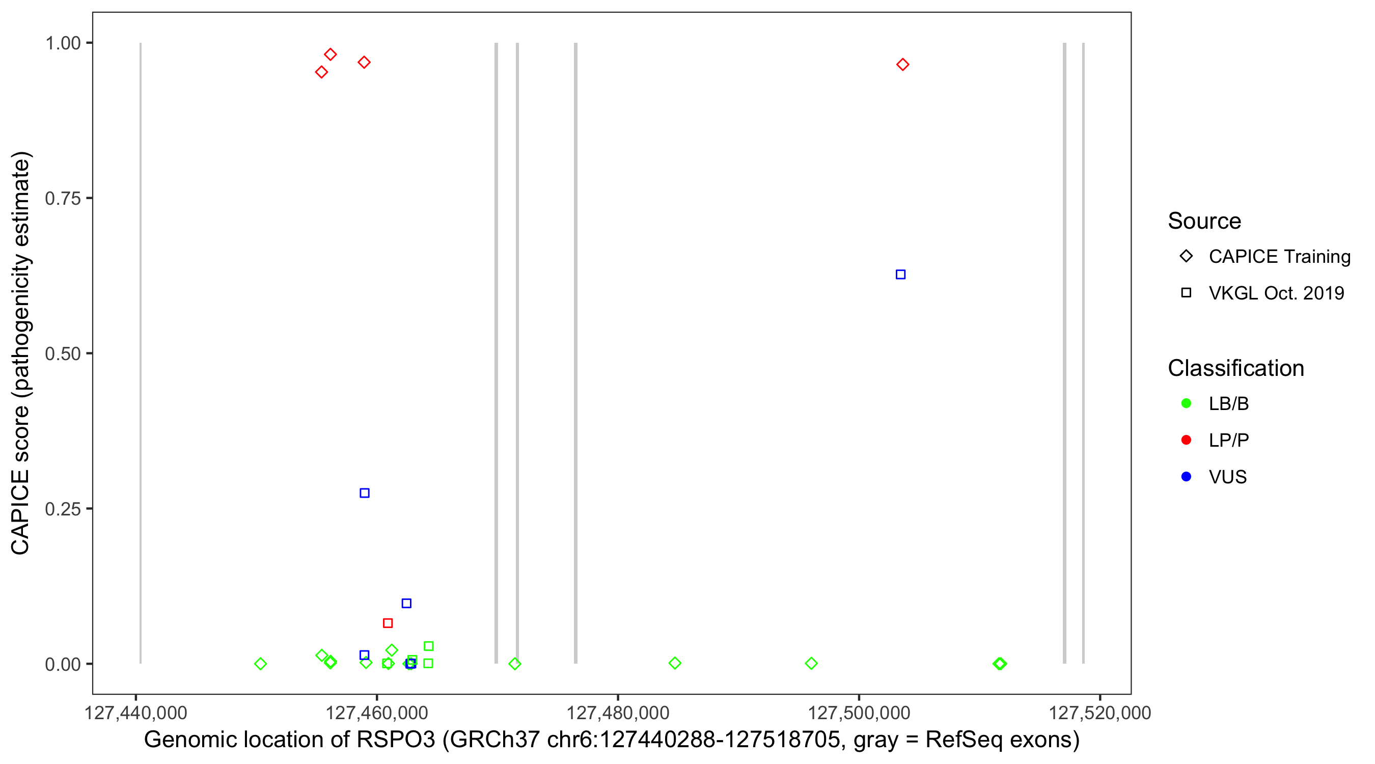 Shown are CAPICE train/test variants plus VKGL Oct 2019.