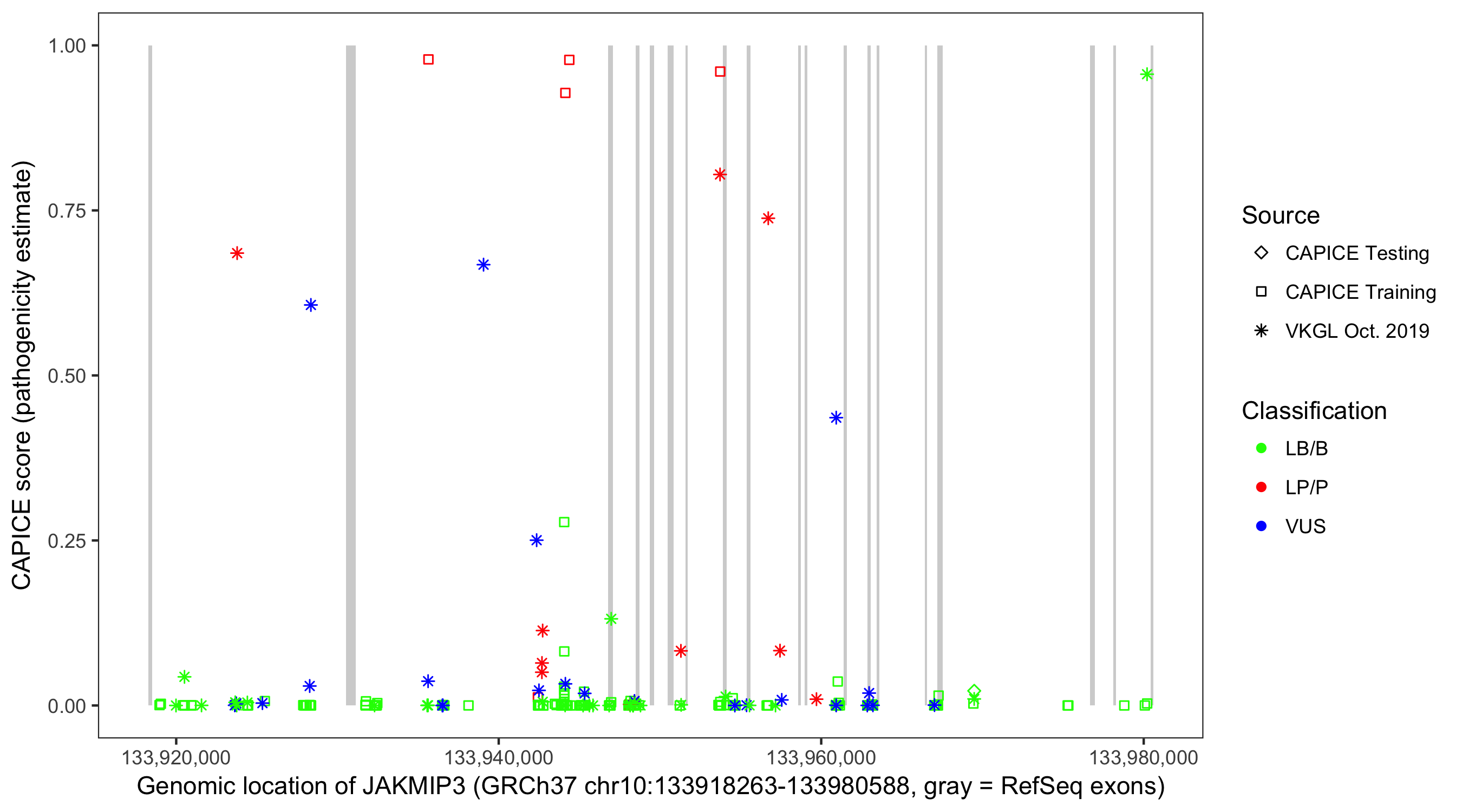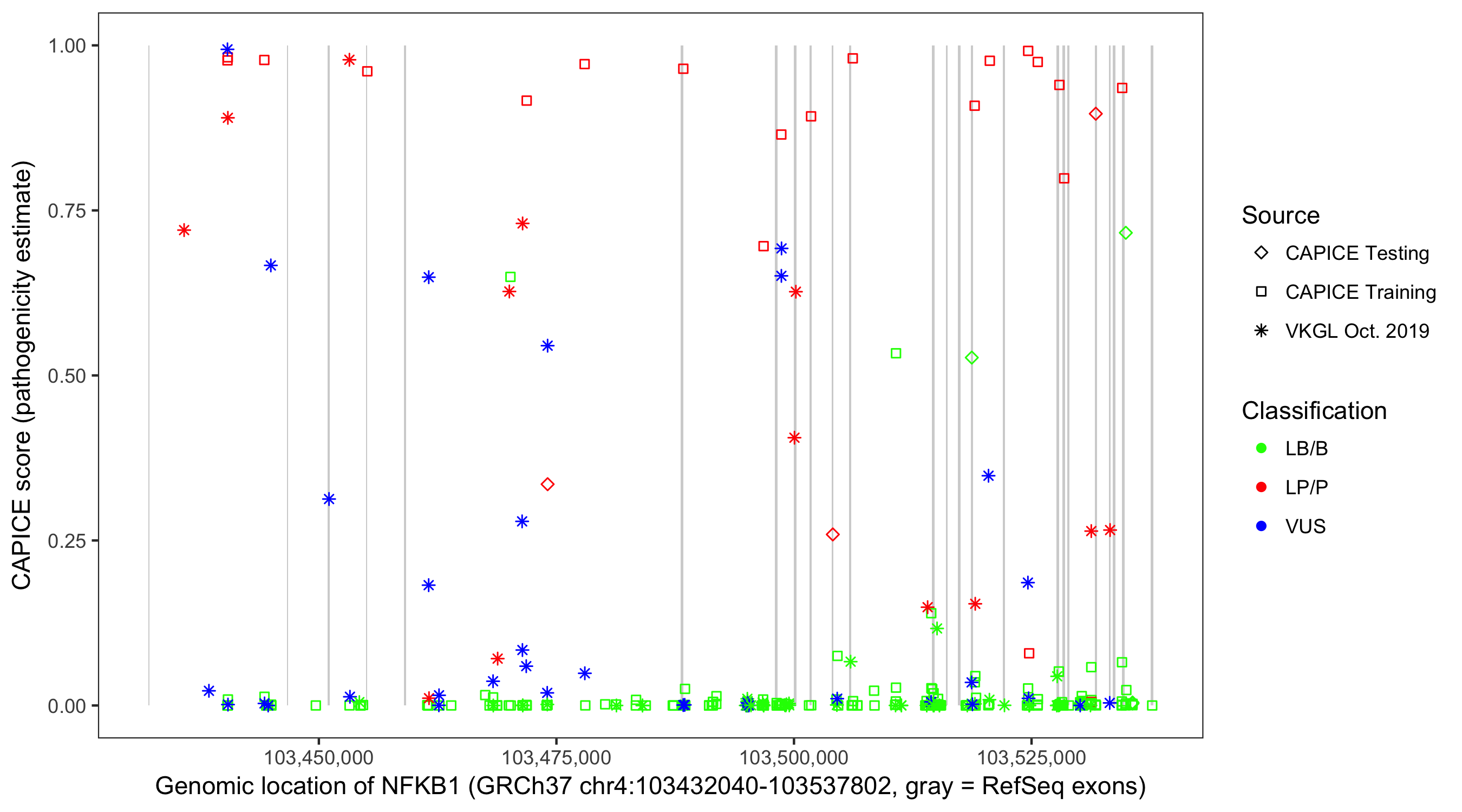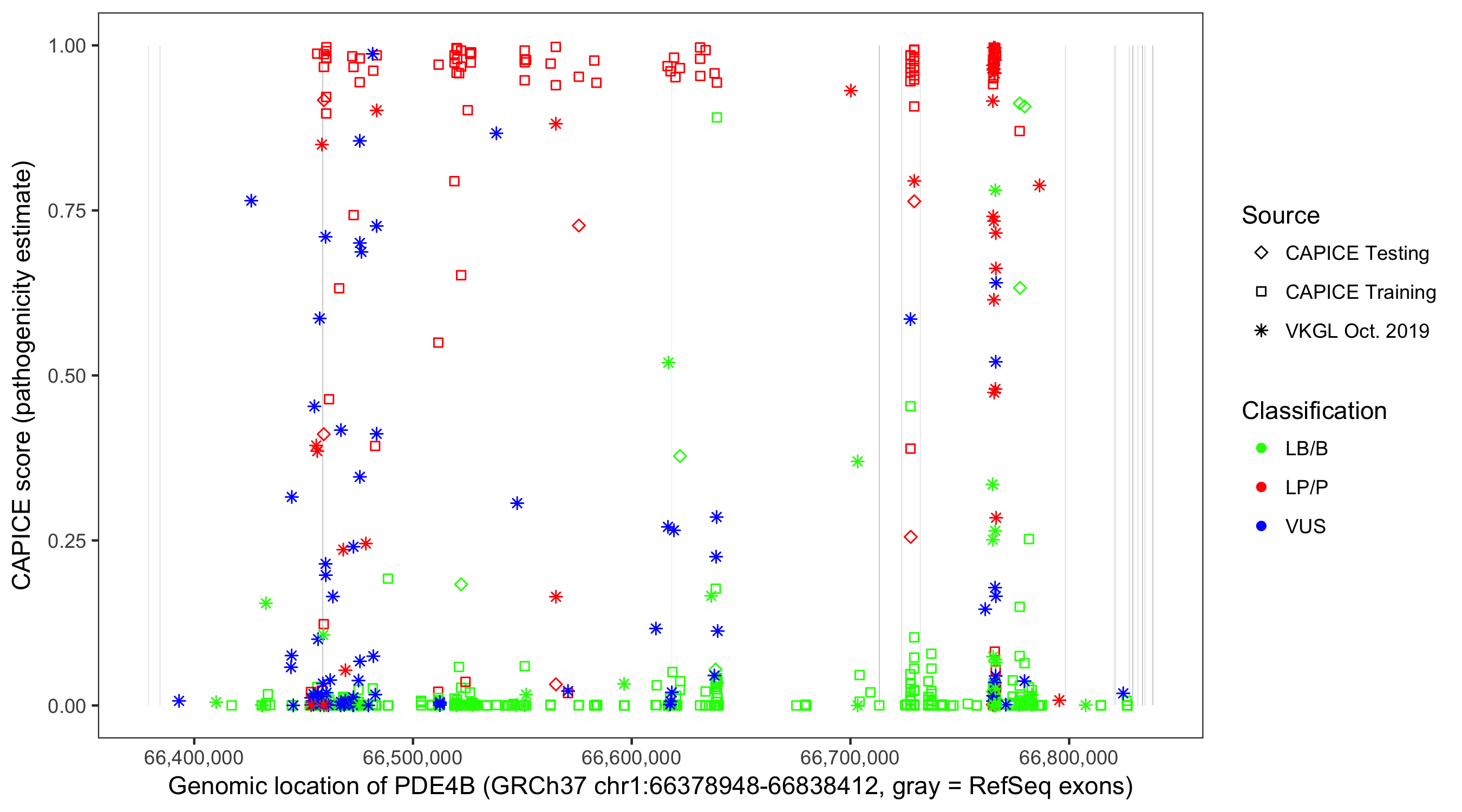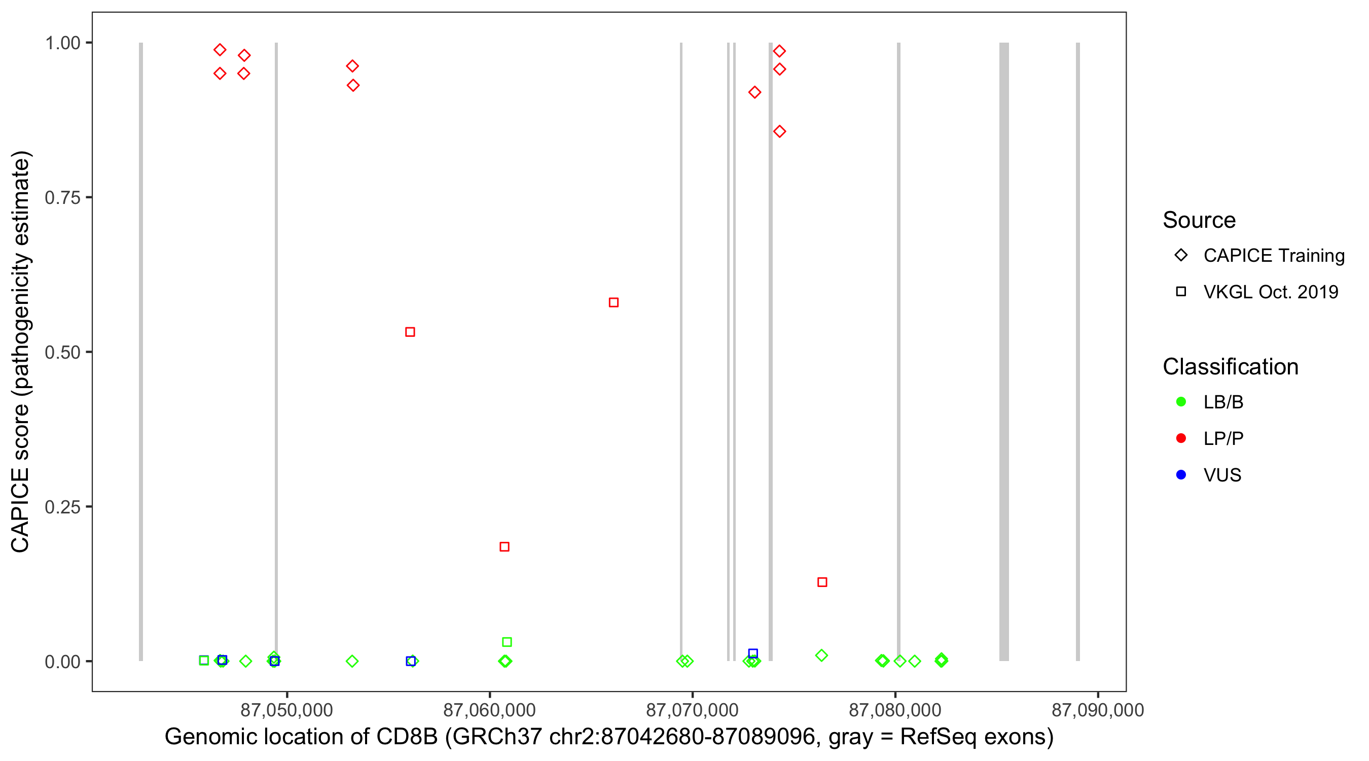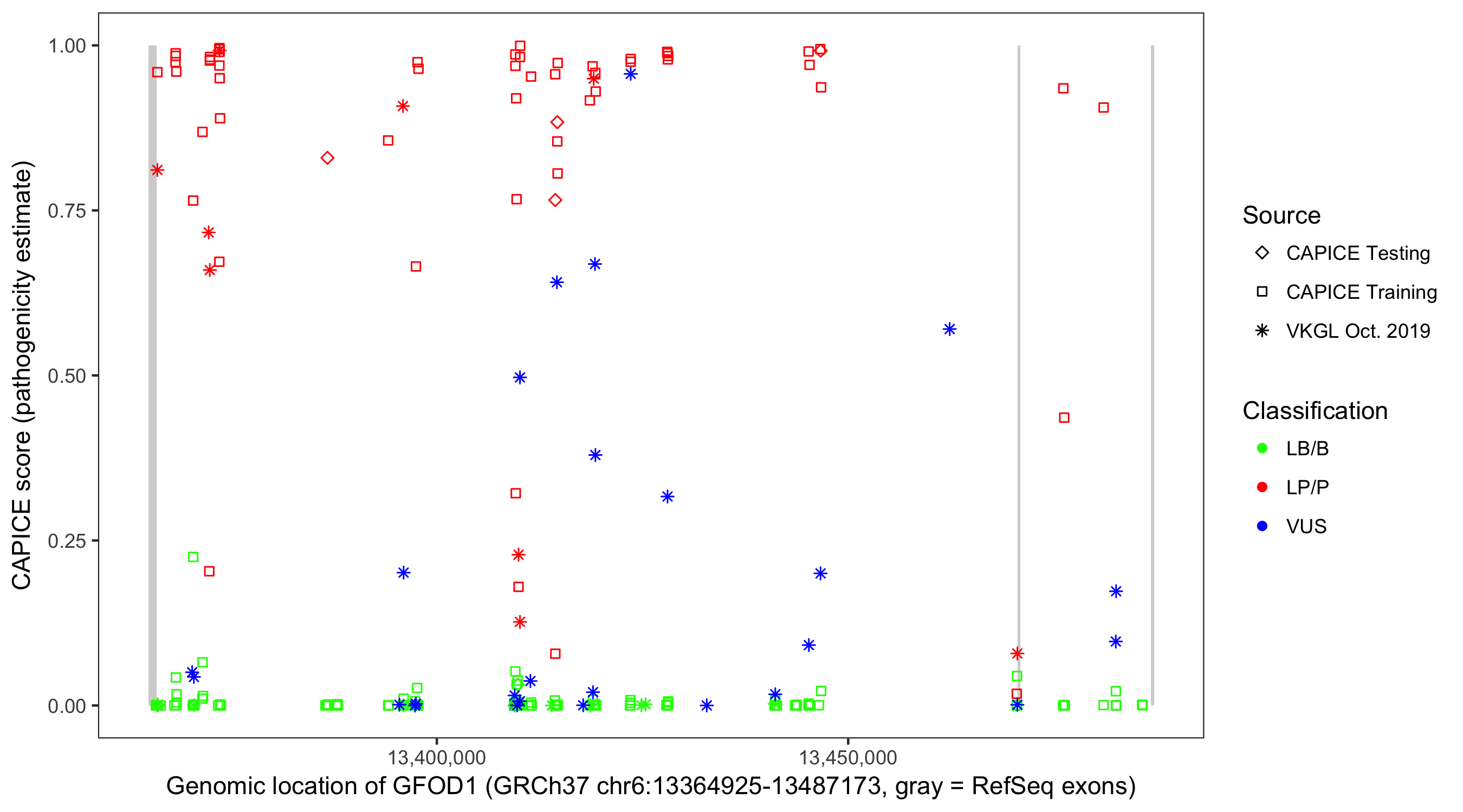 Shown are CAPICE train/test variants plus VKGL Oct 2019.