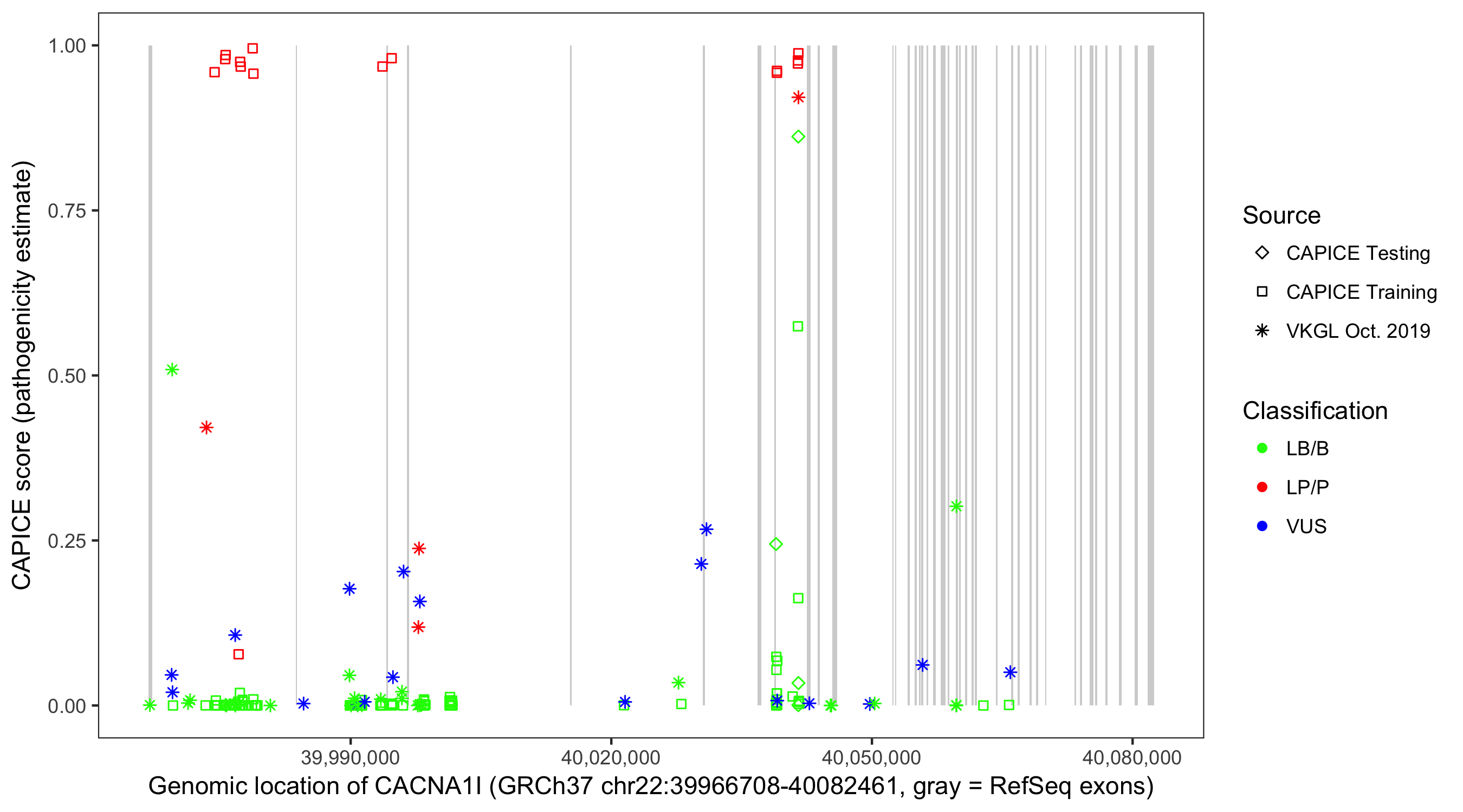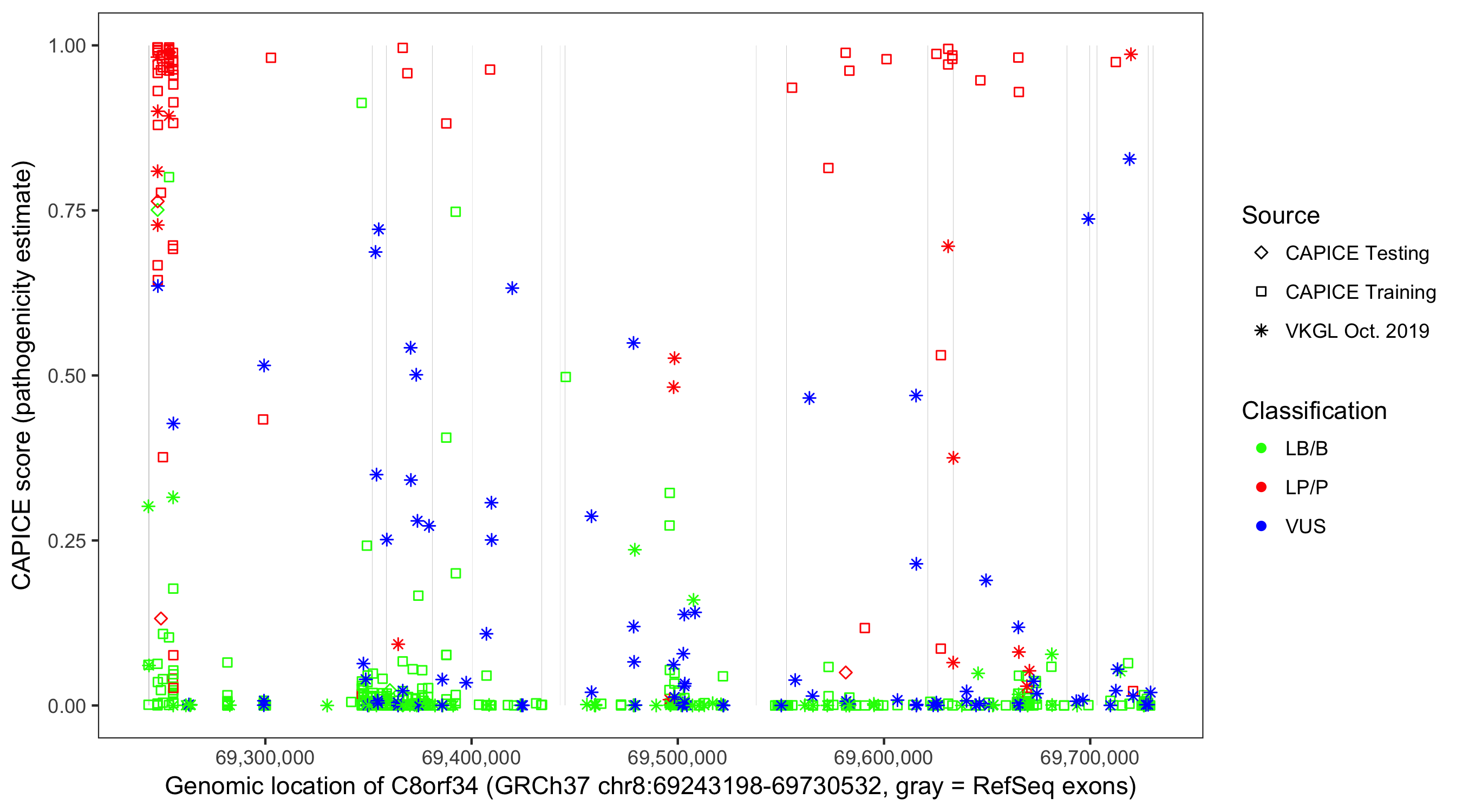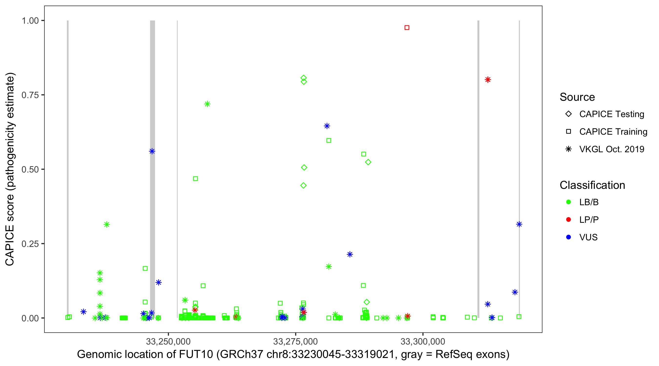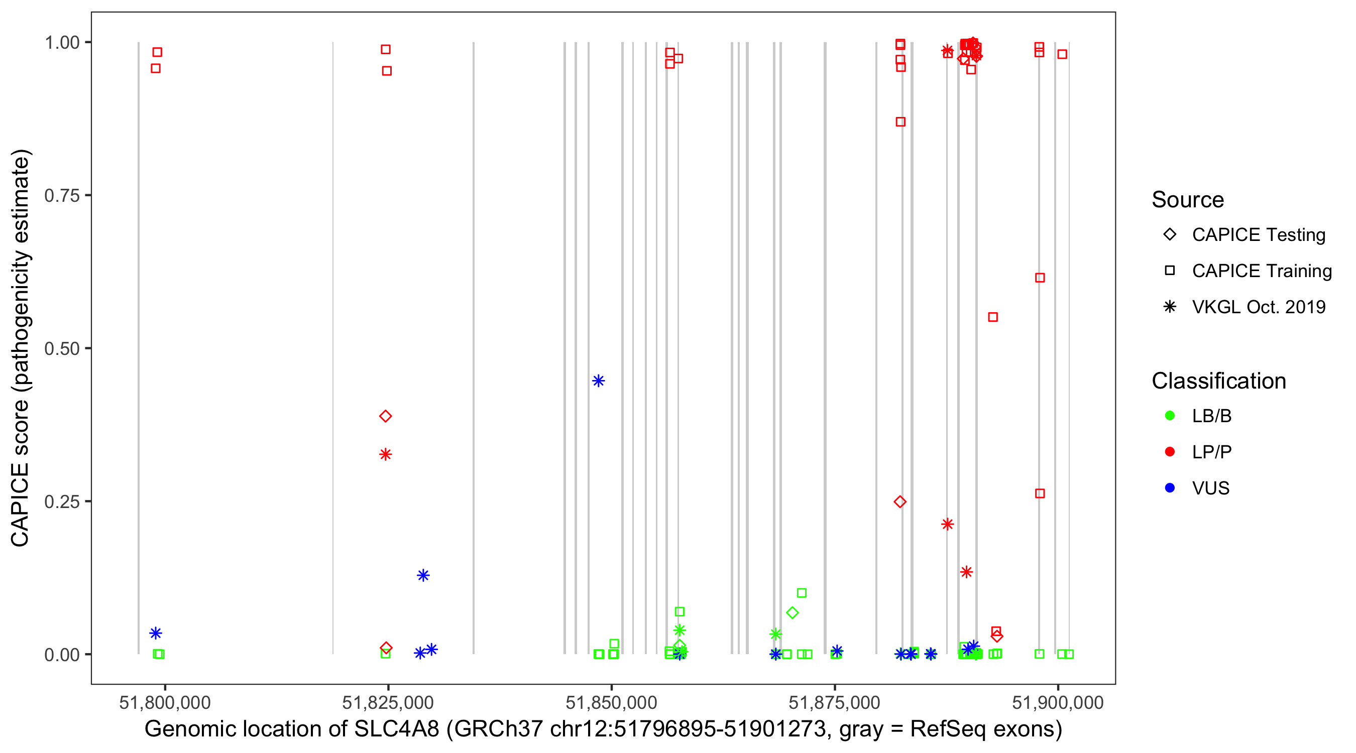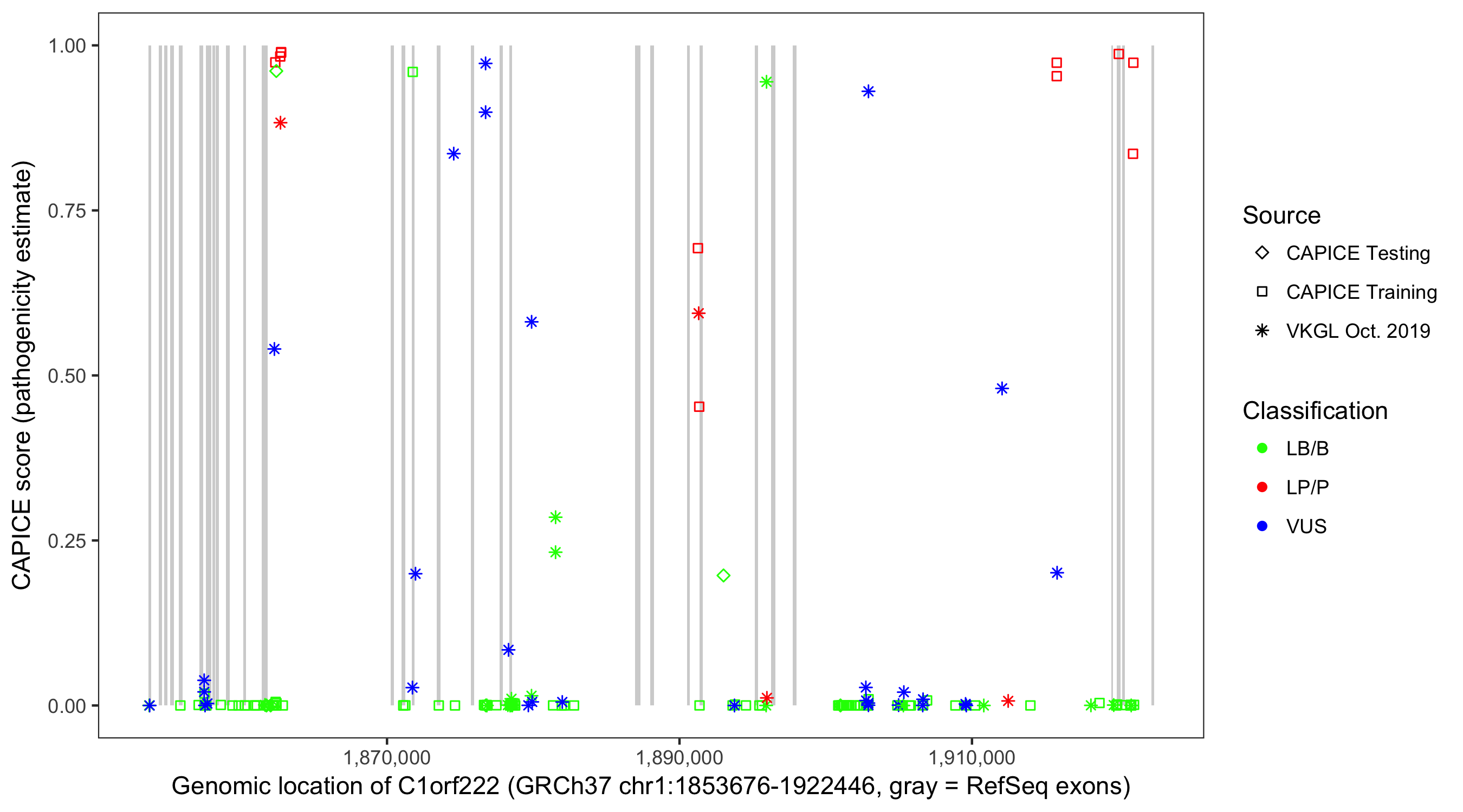 Shown are CAPICE train/test variants plus VKGL Oct 2019.