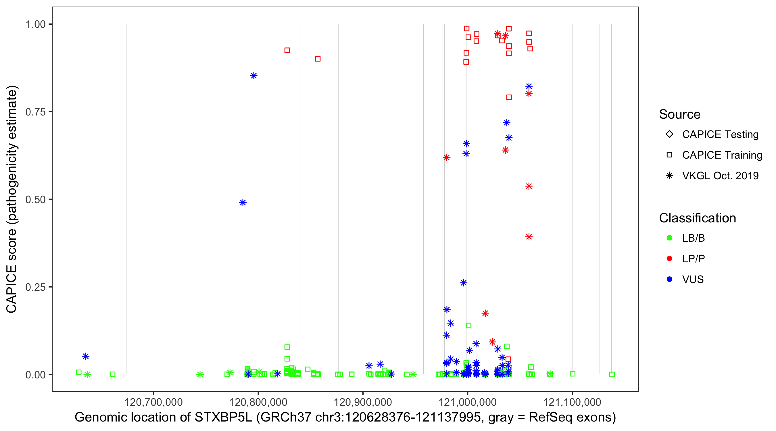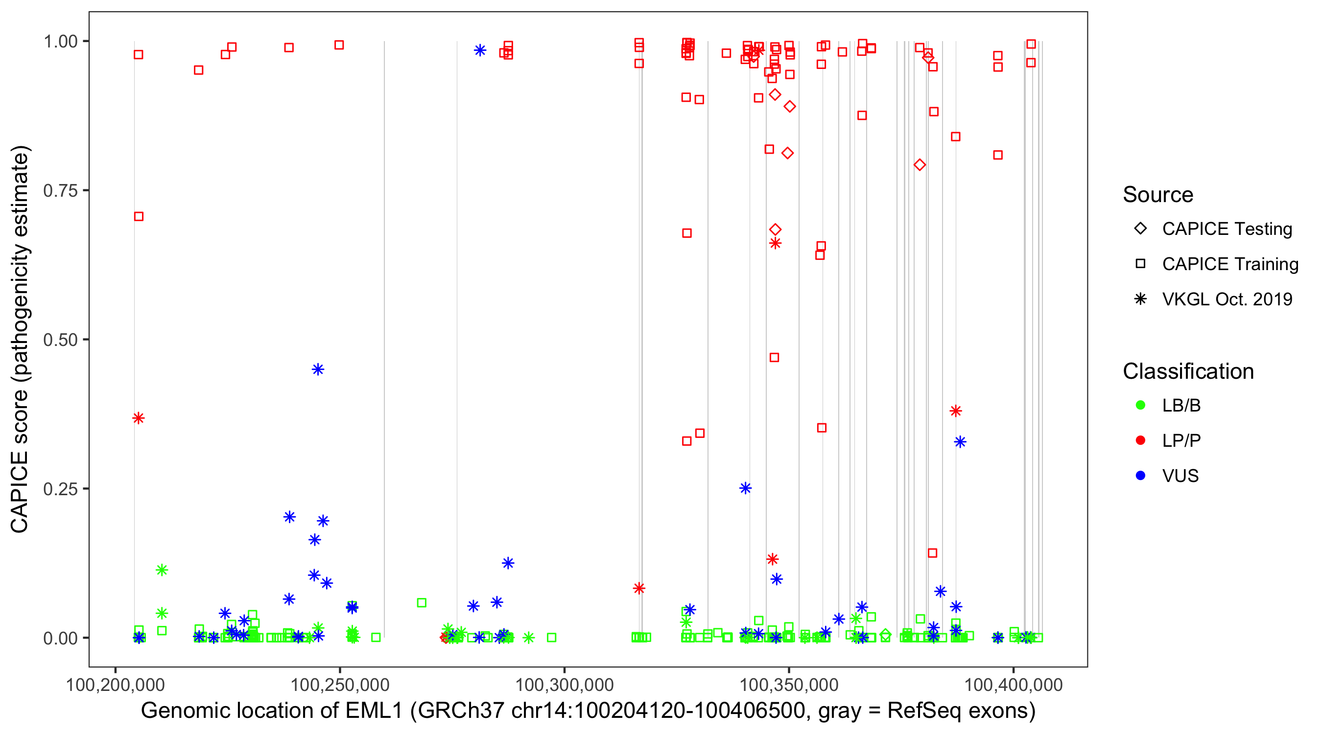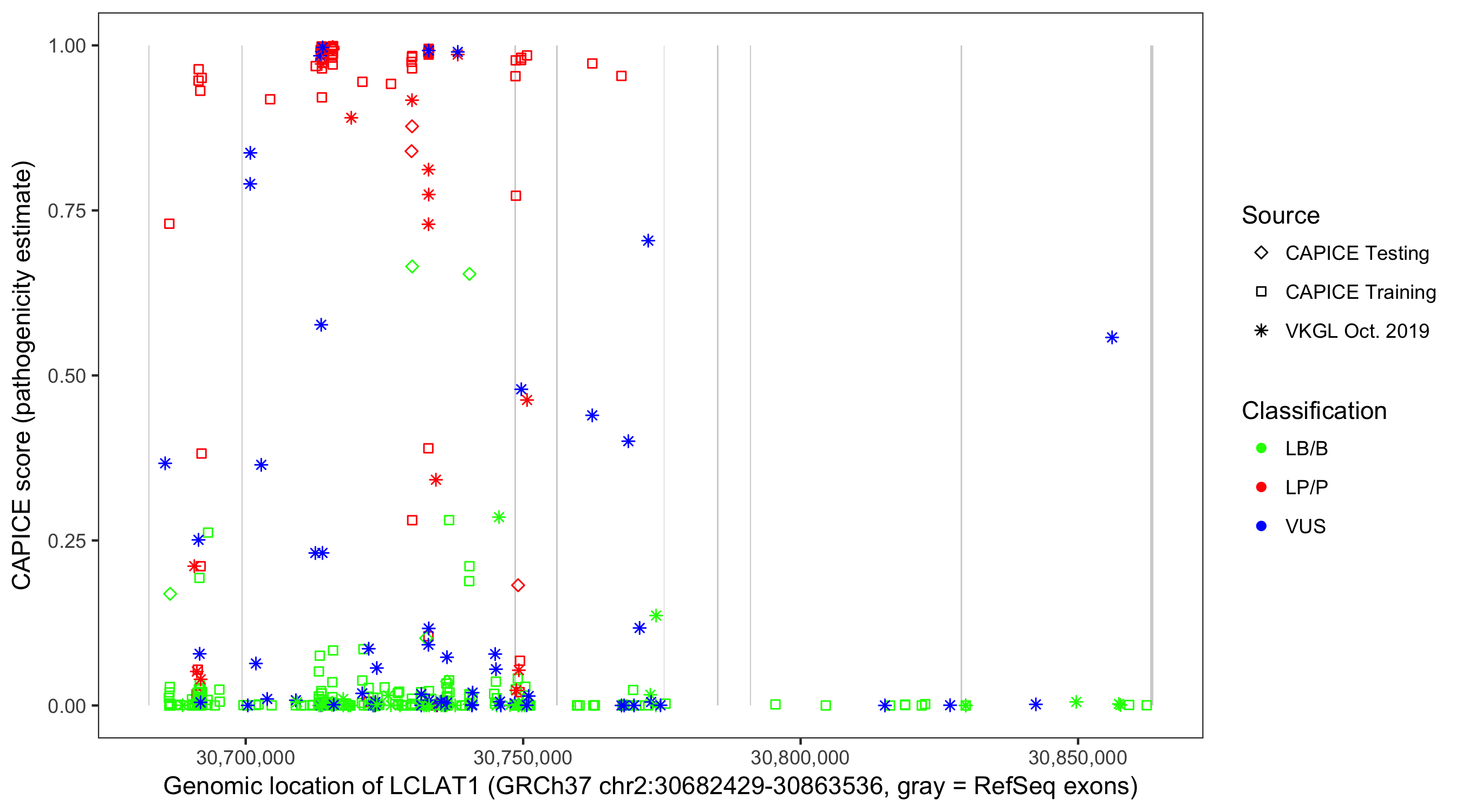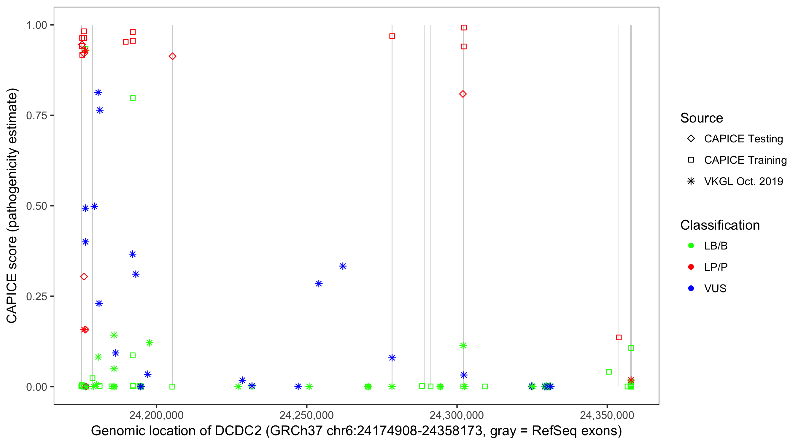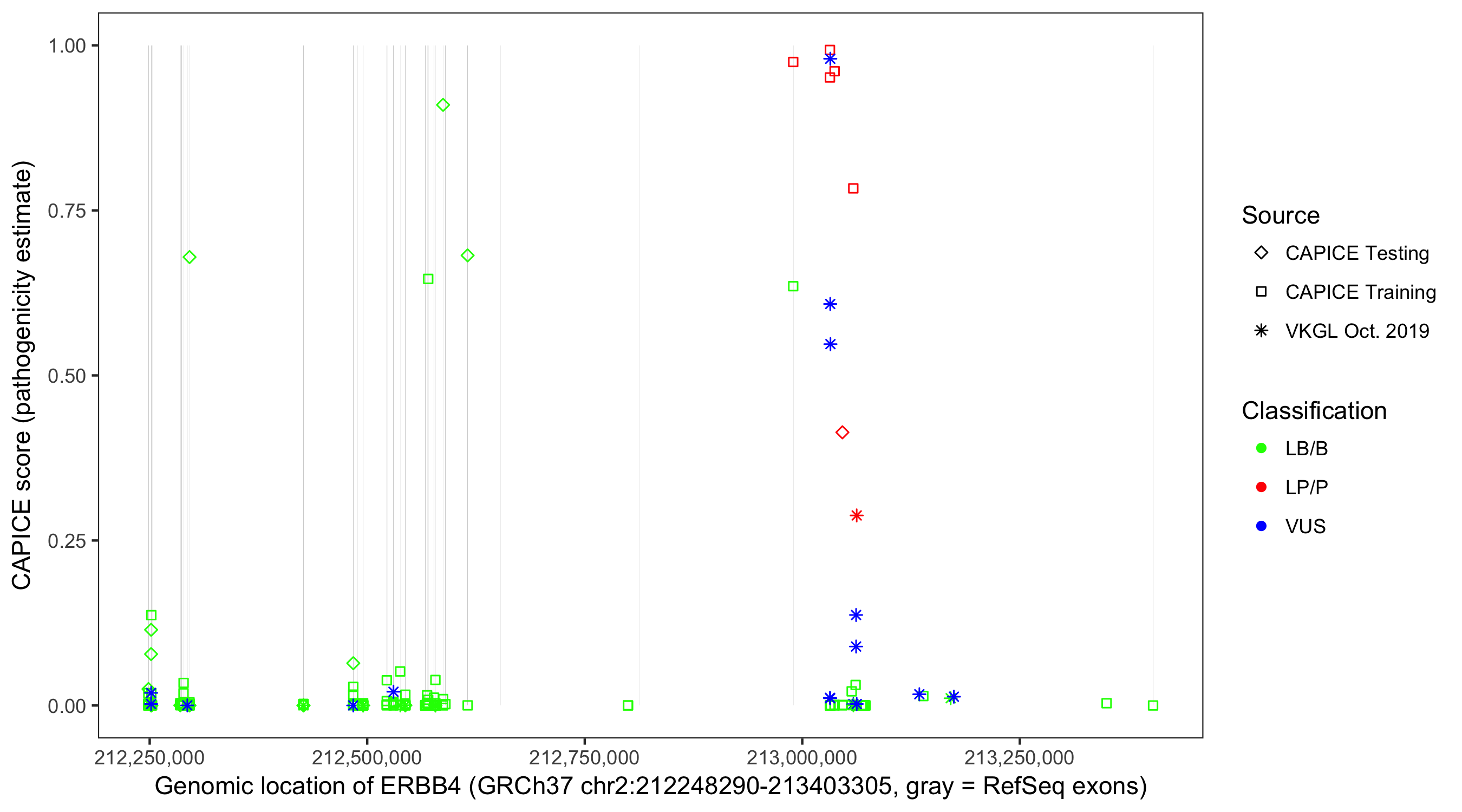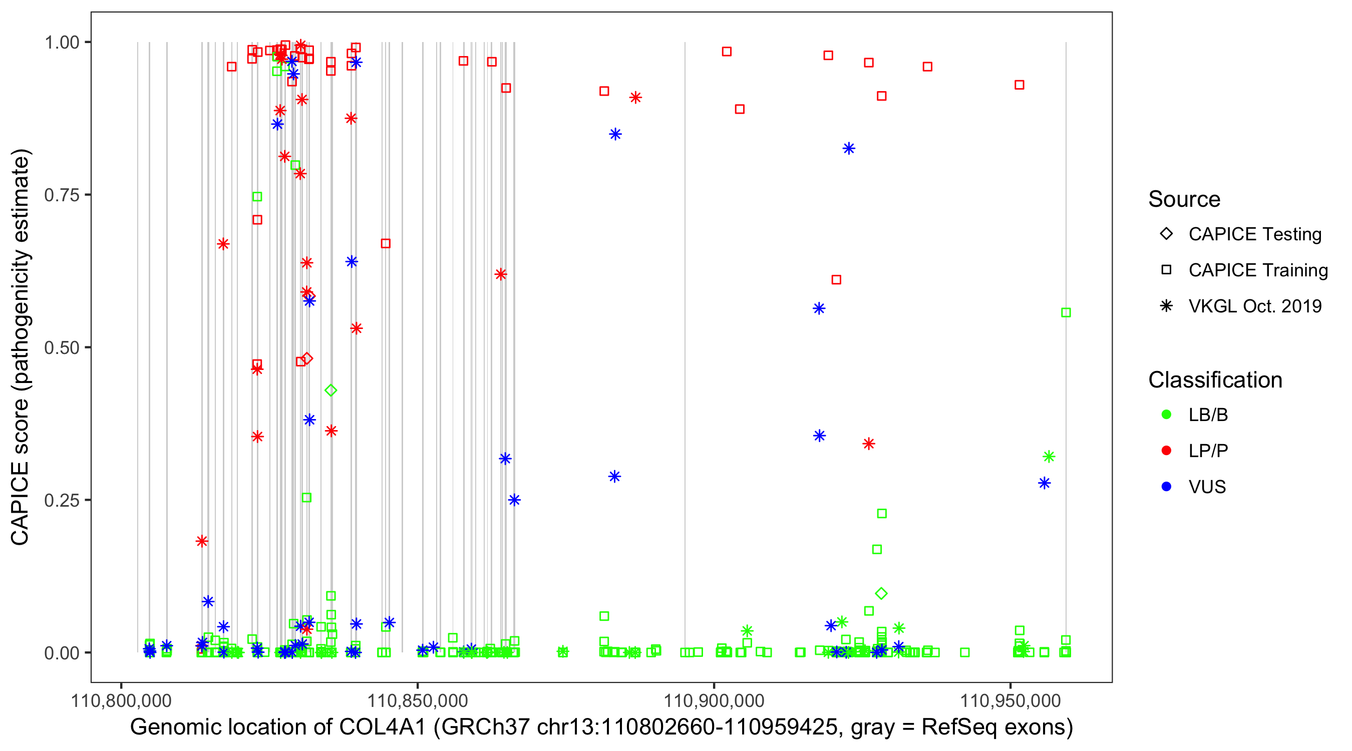 Shown are CAPICE train/test variants plus VKGL Oct 2019.