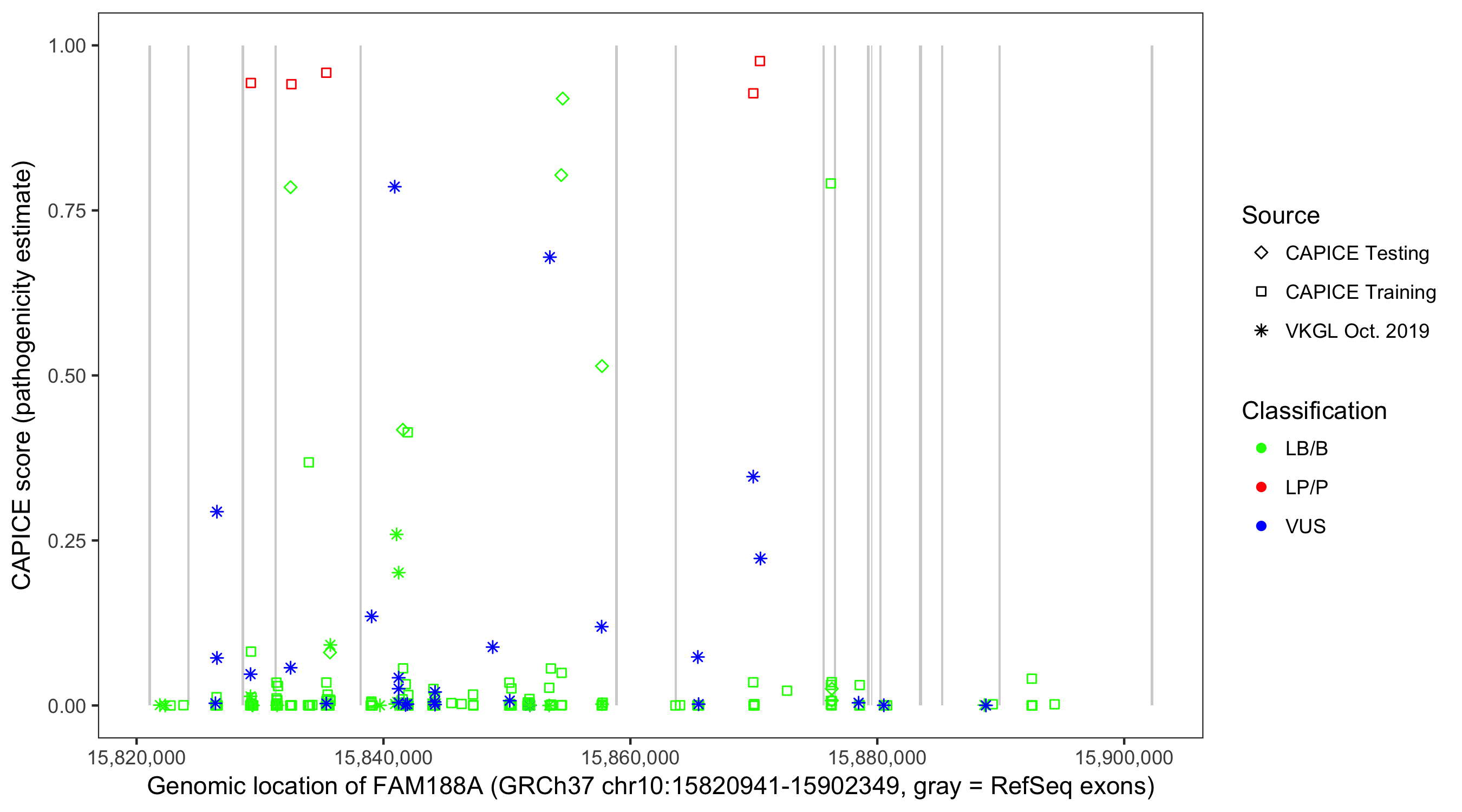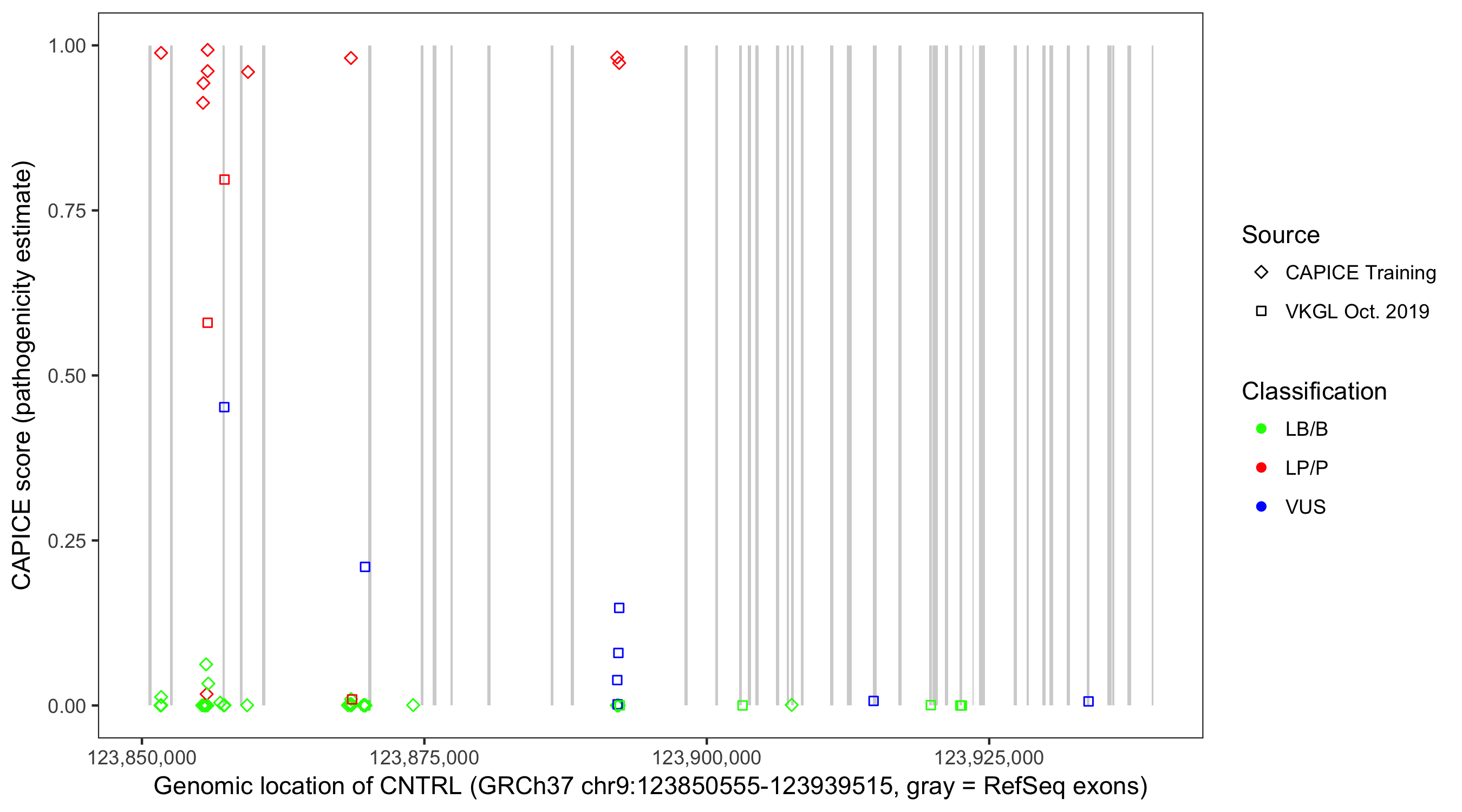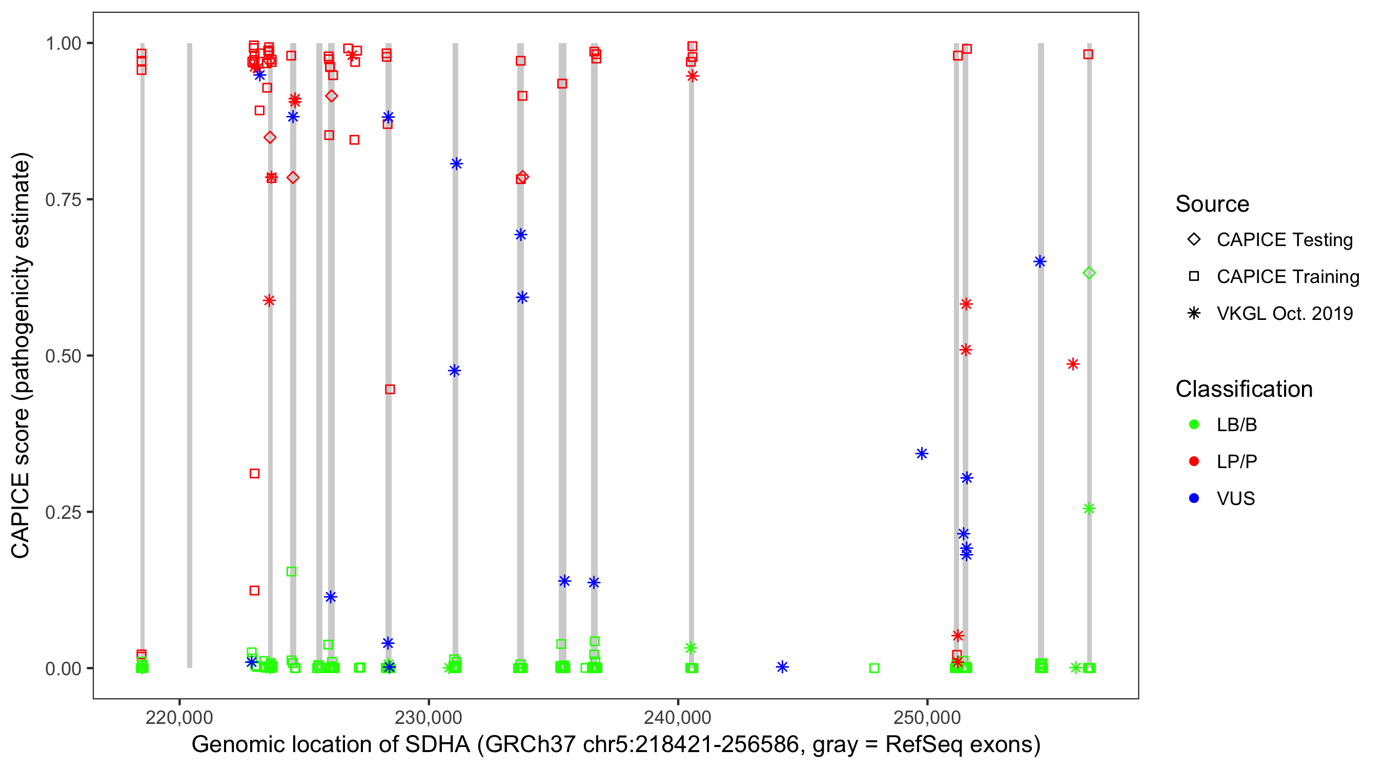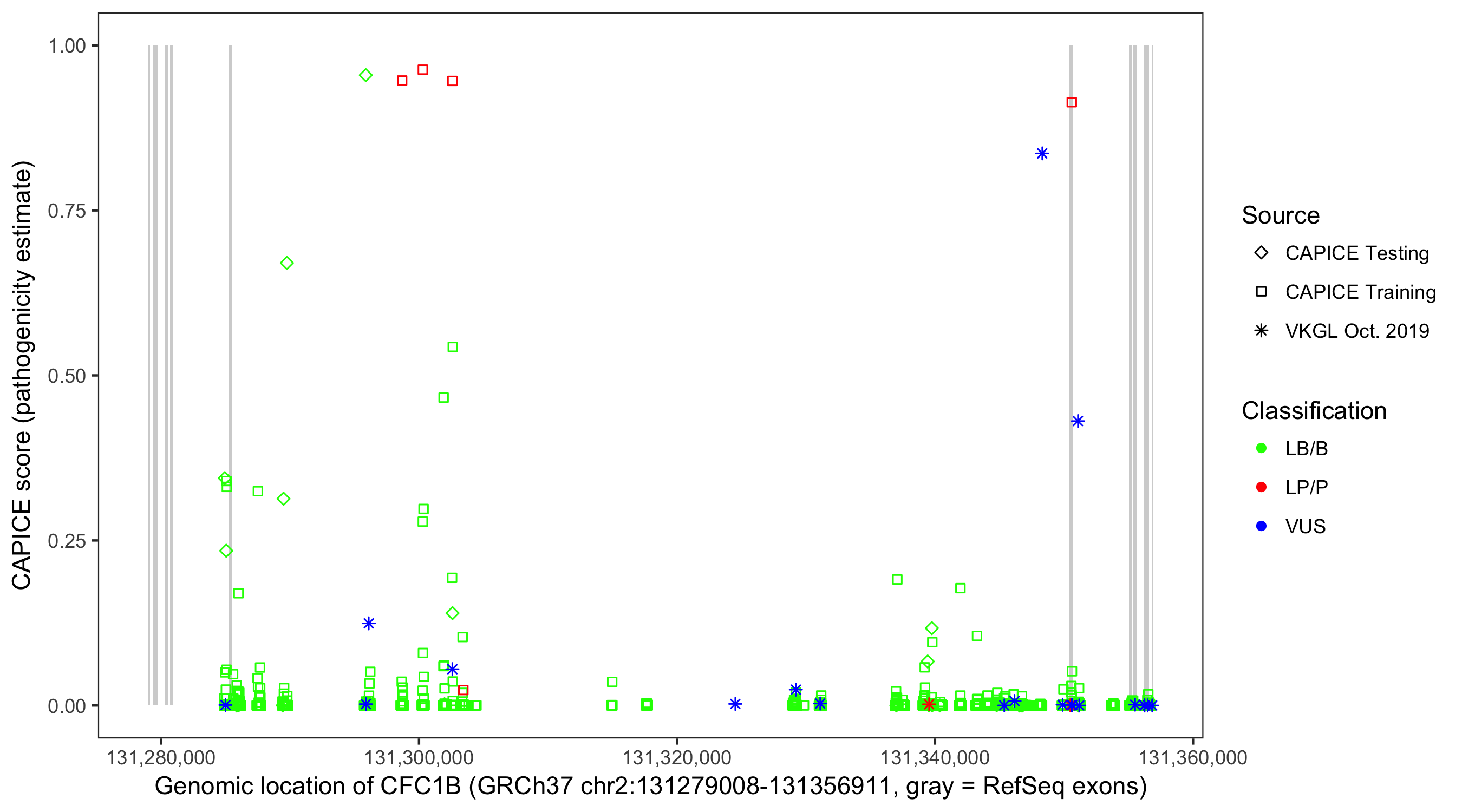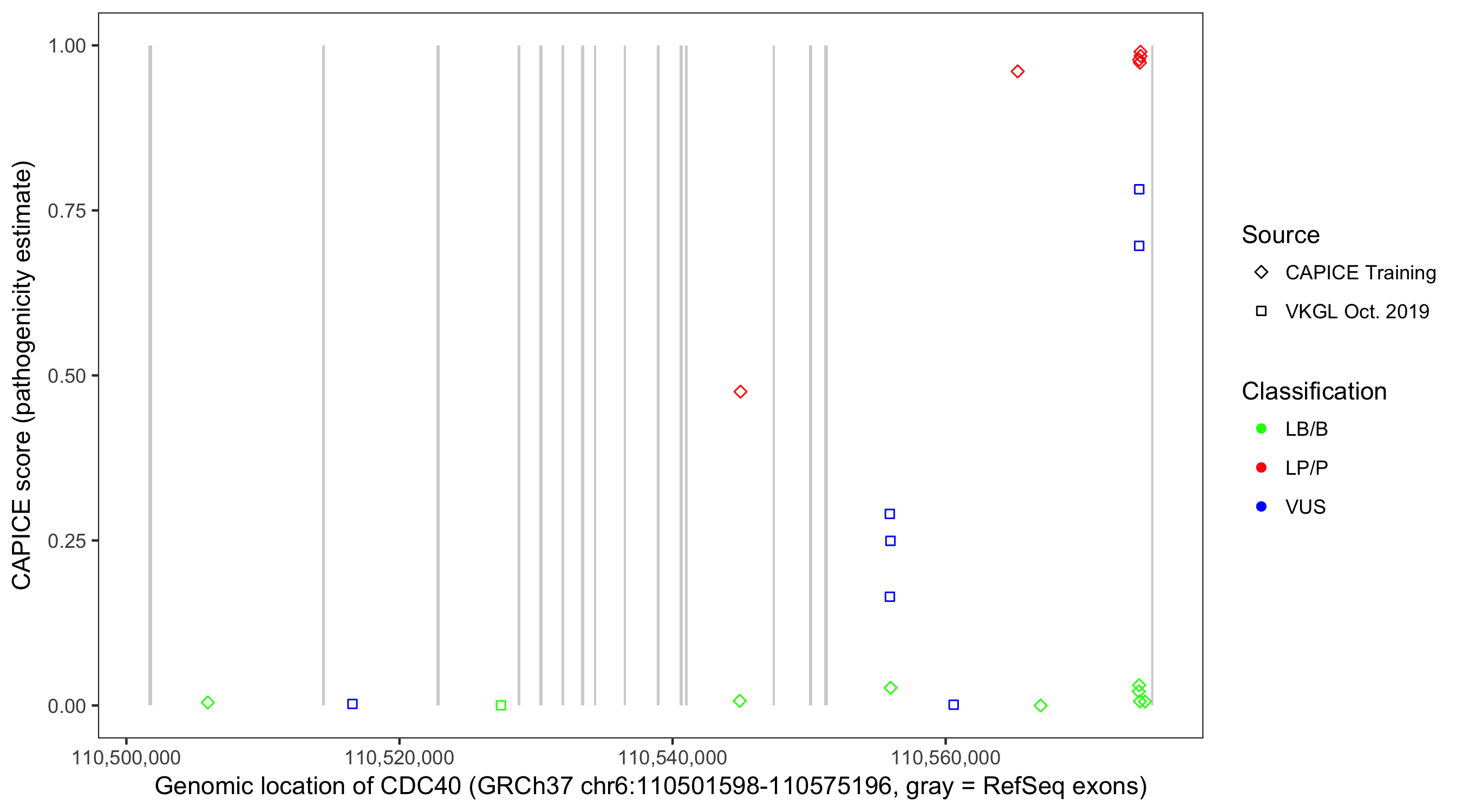 Shown are CAPICE train/test variants plus VKGL Oct 2019.