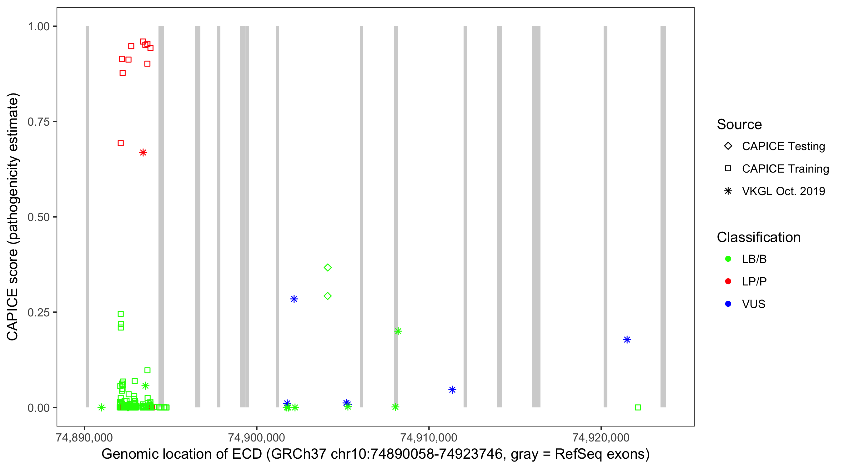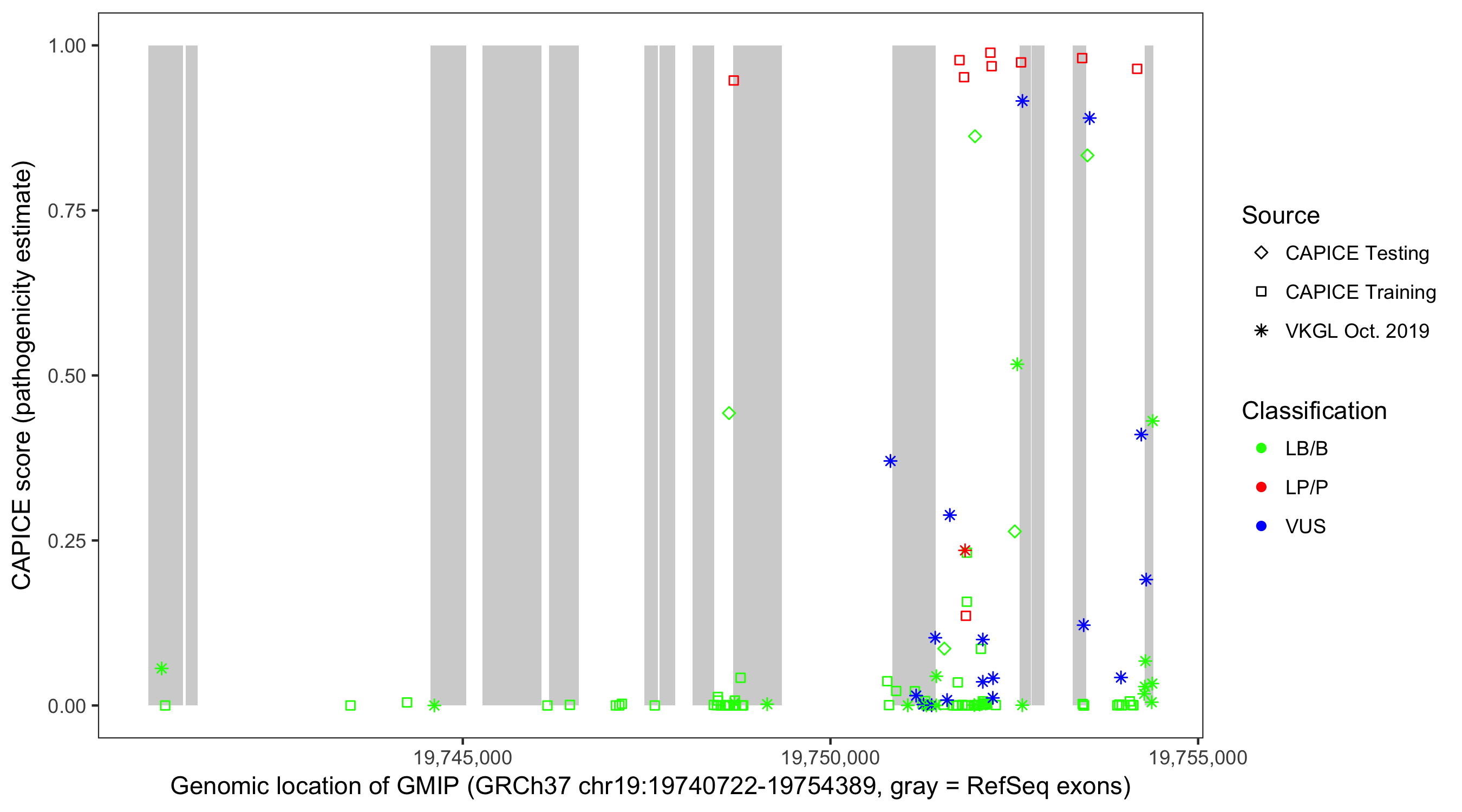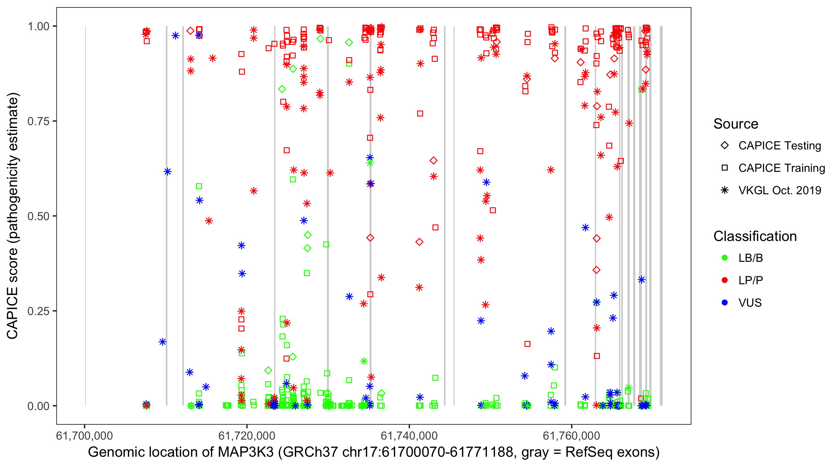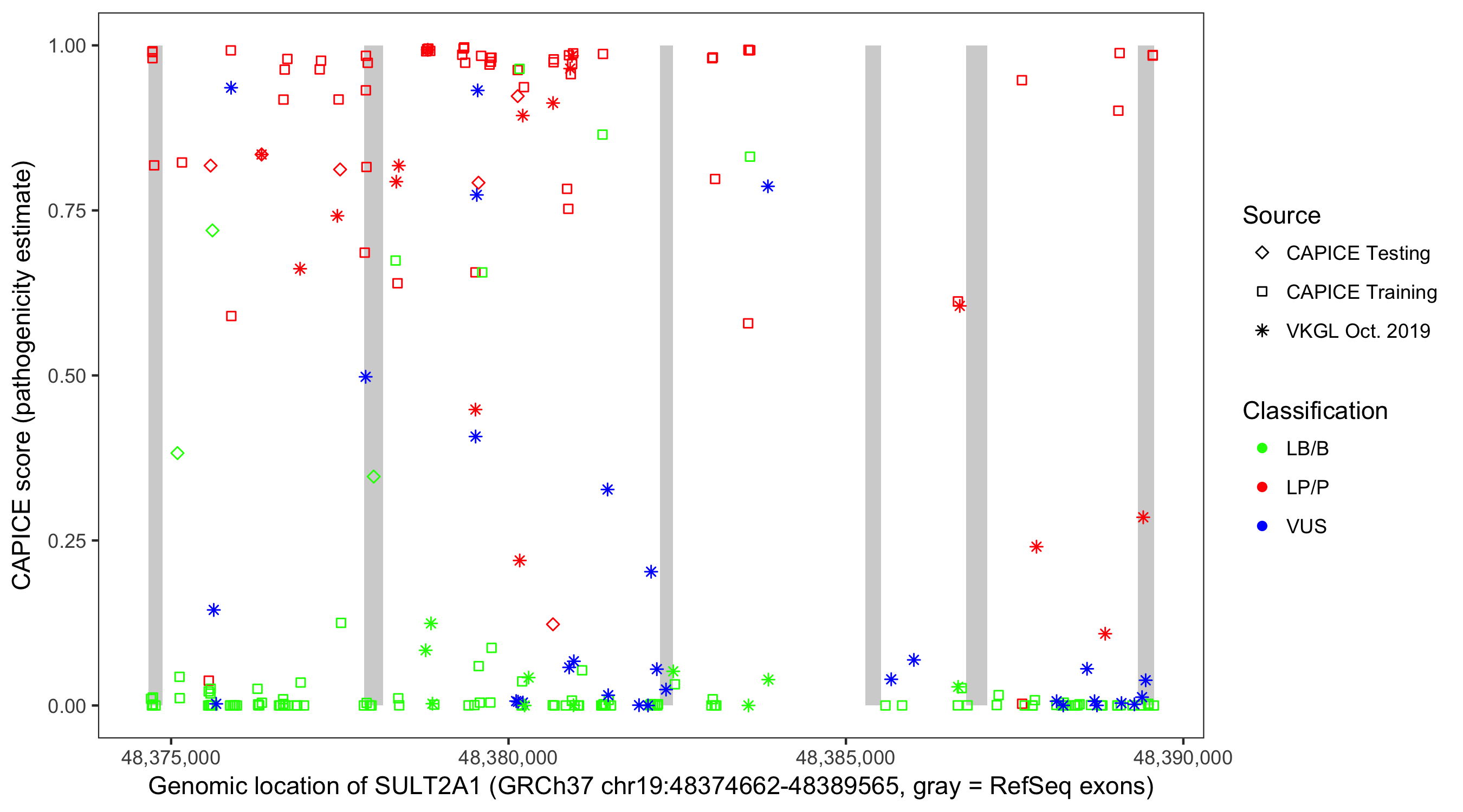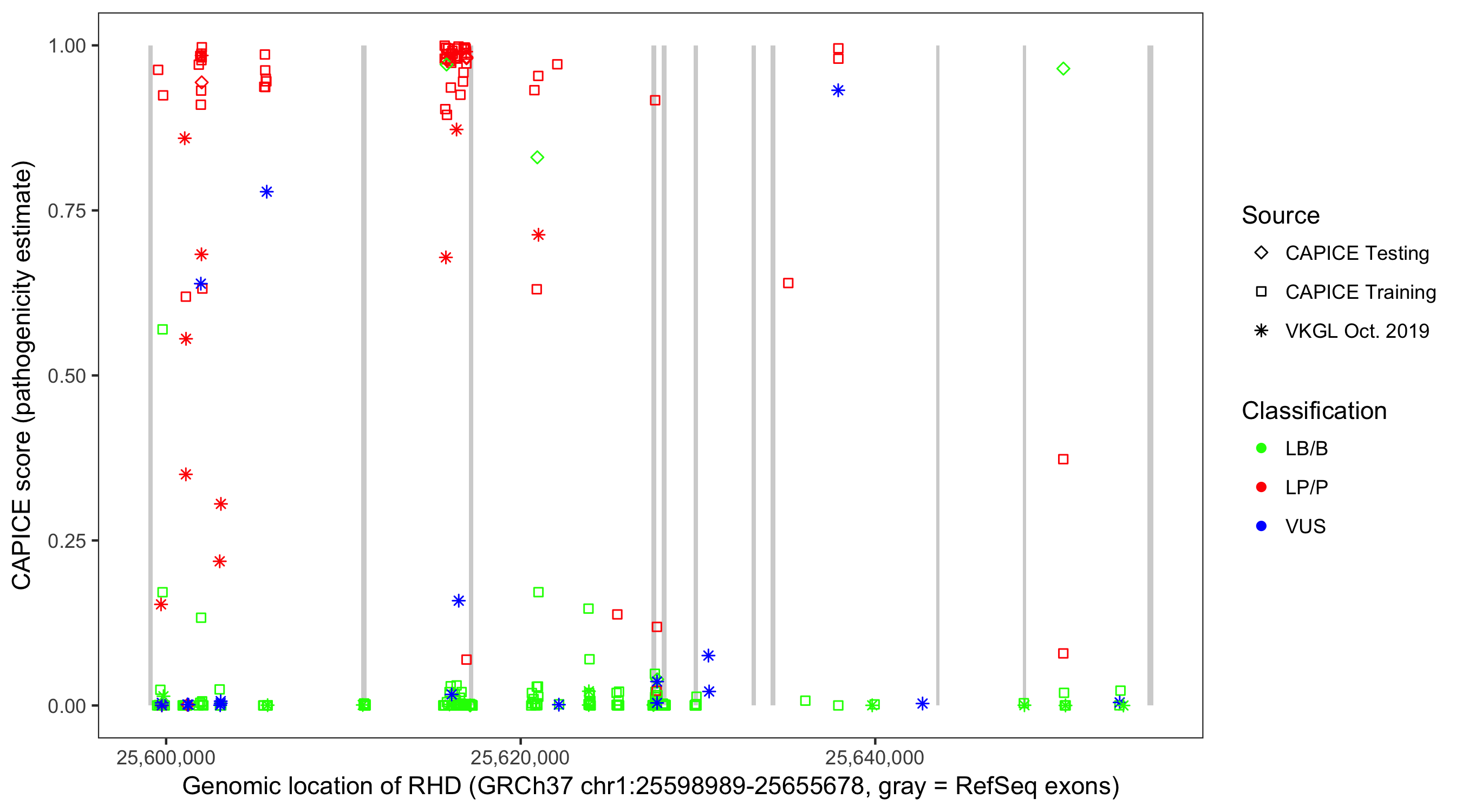 Shown are CAPICE train/test variants plus VKGL Oct 2019.