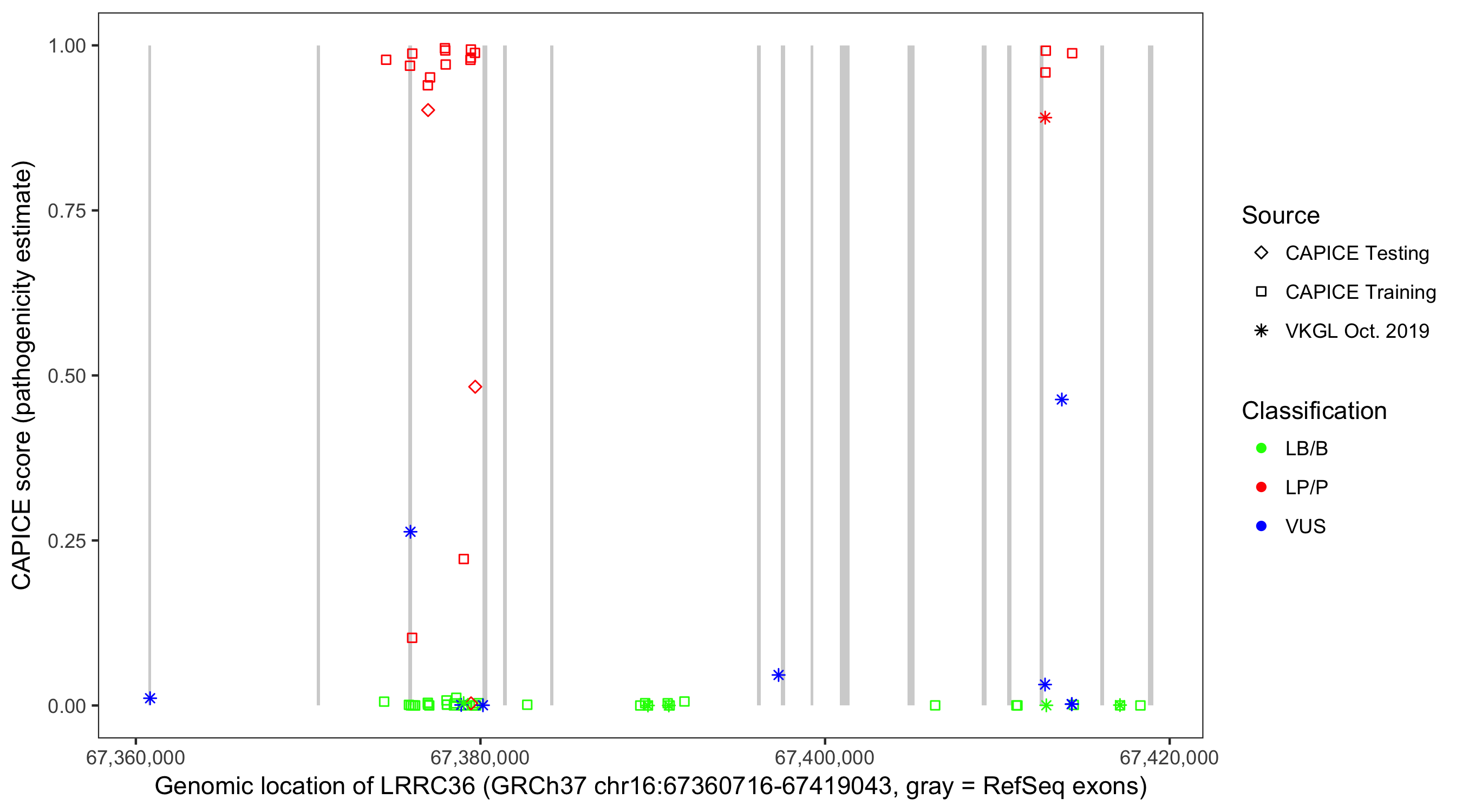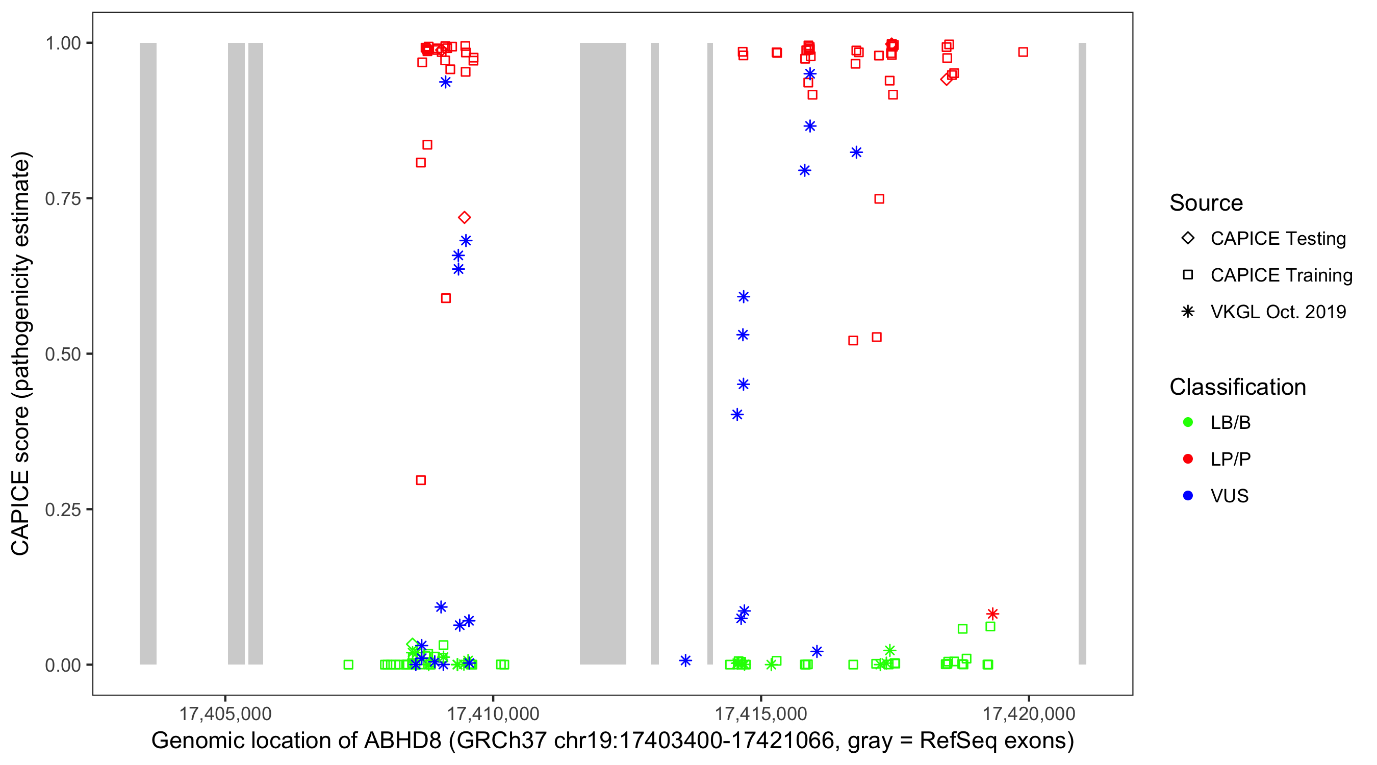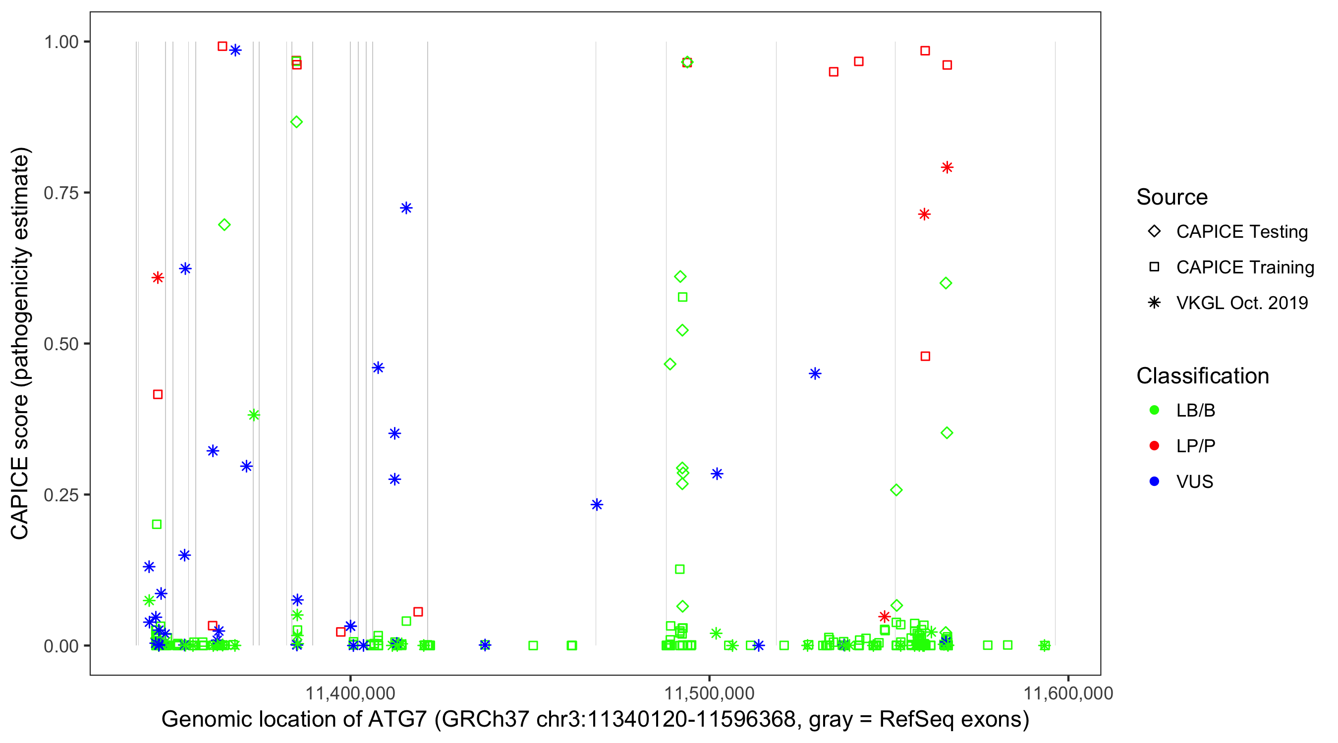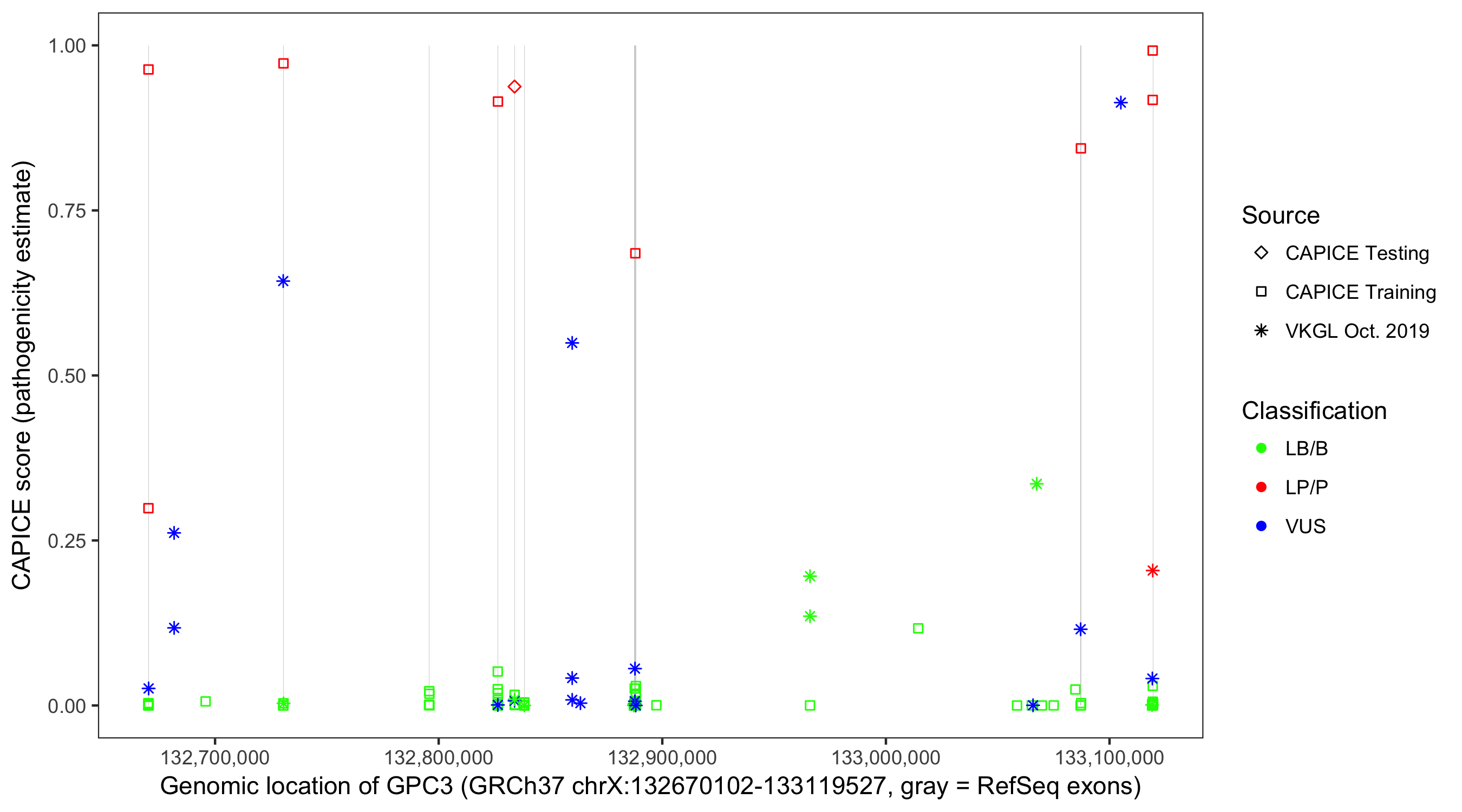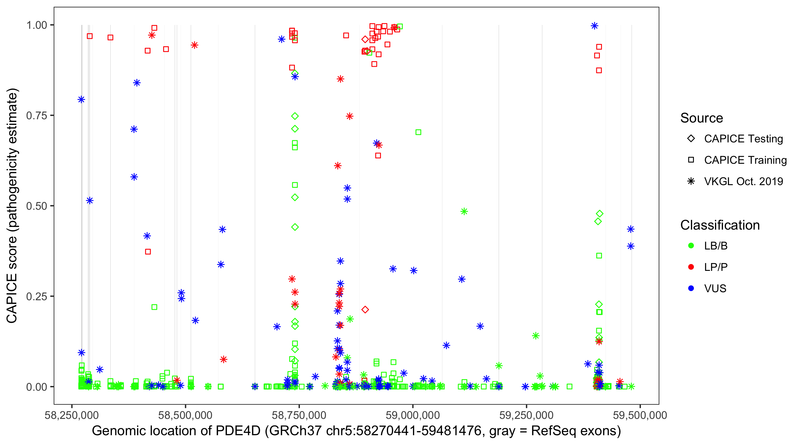 Shown are CAPICE train/test variants plus VKGL Oct 2019.