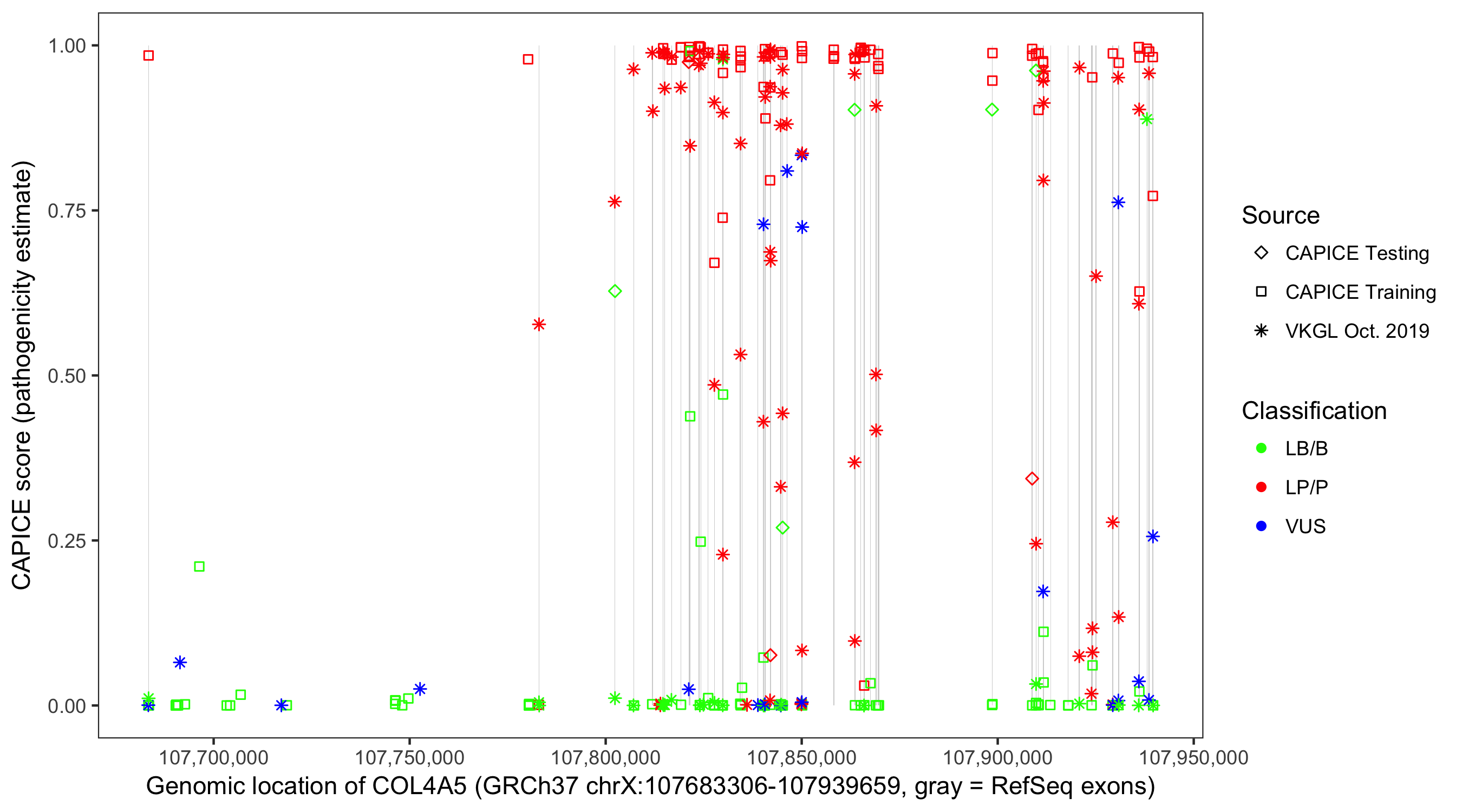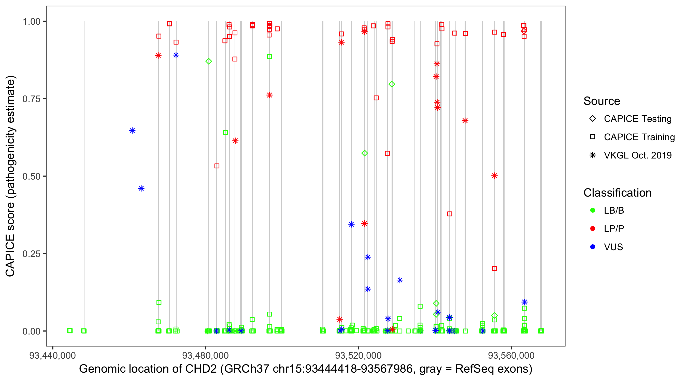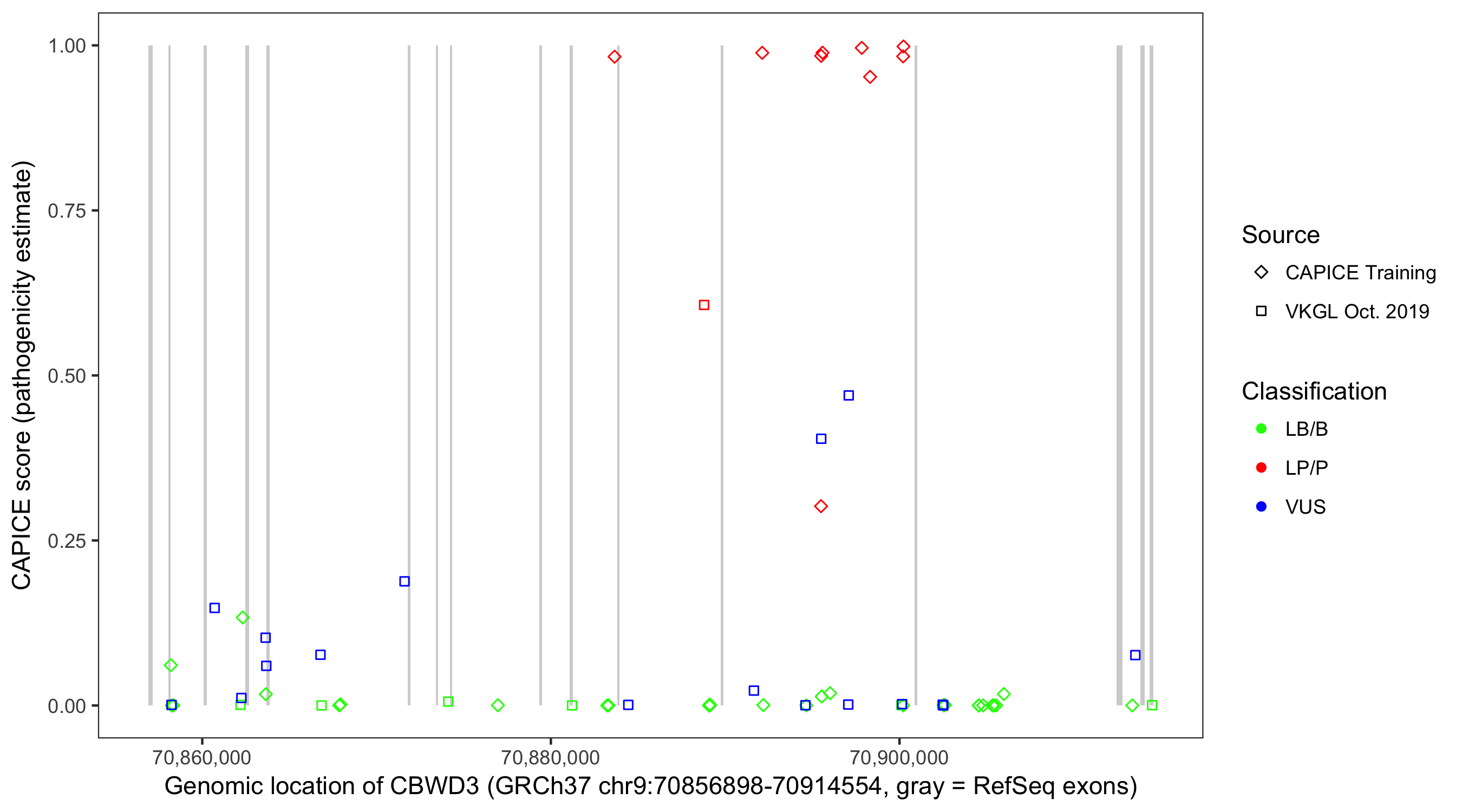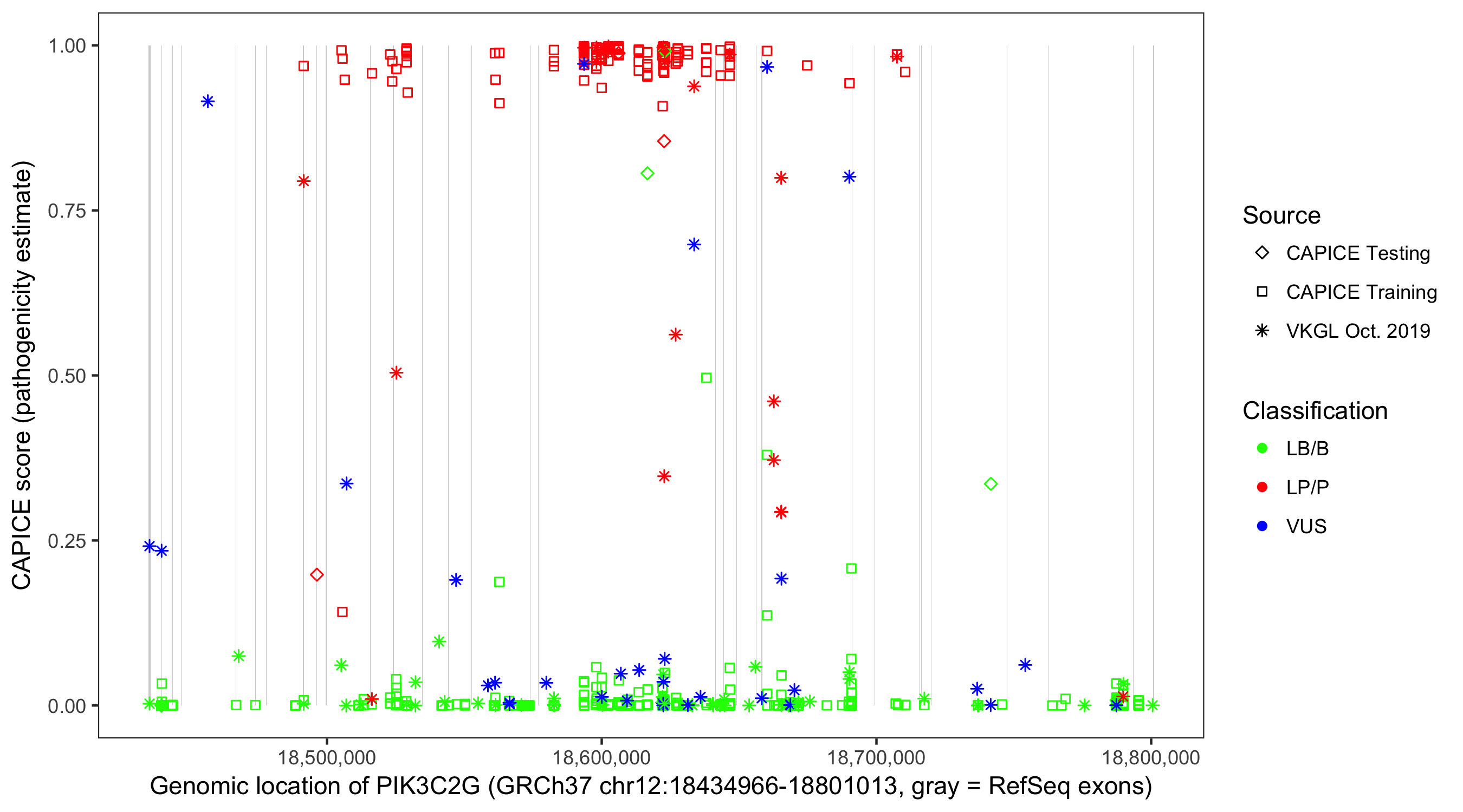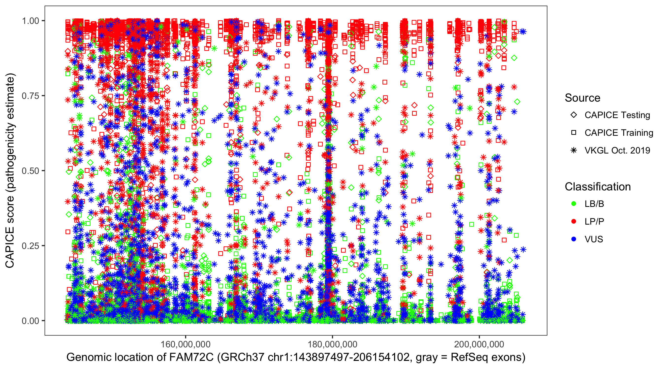 Shown are CAPICE train/test variants plus VKGL Oct 2019.