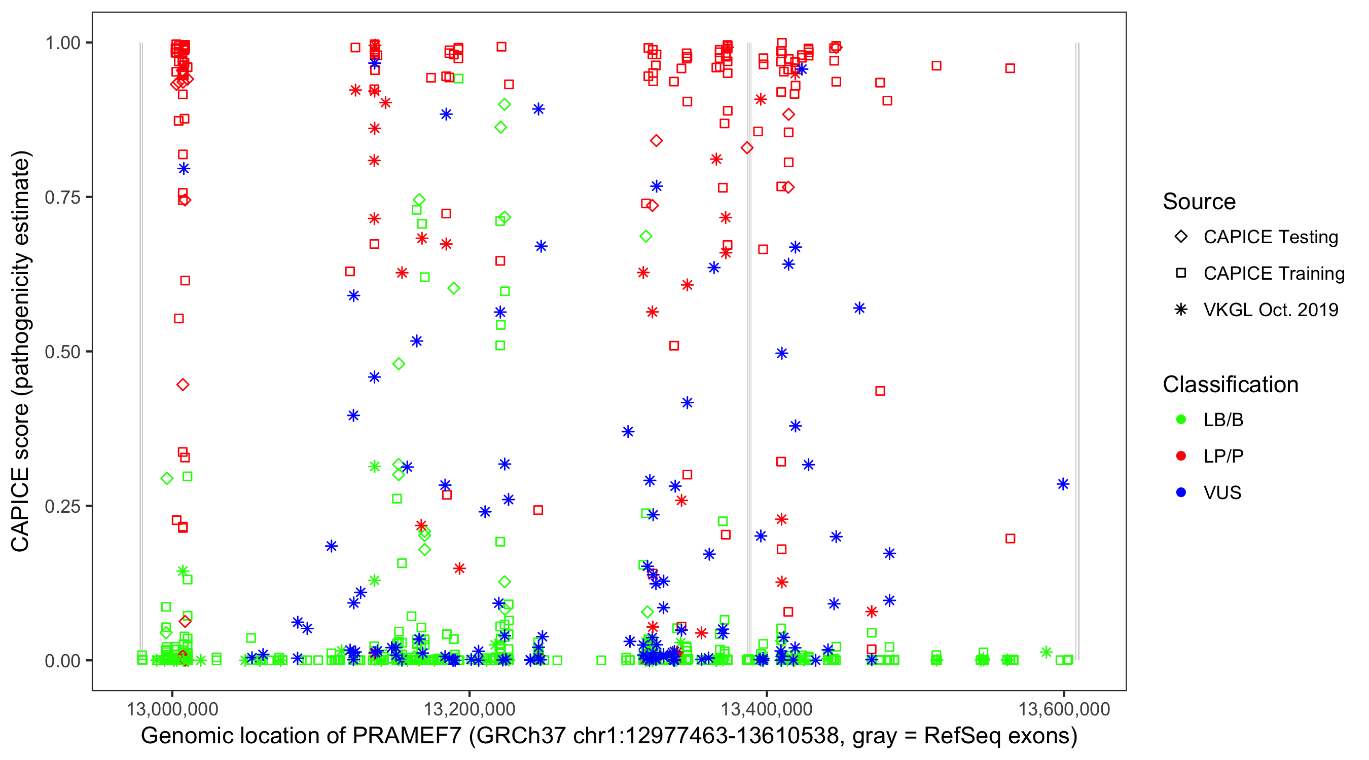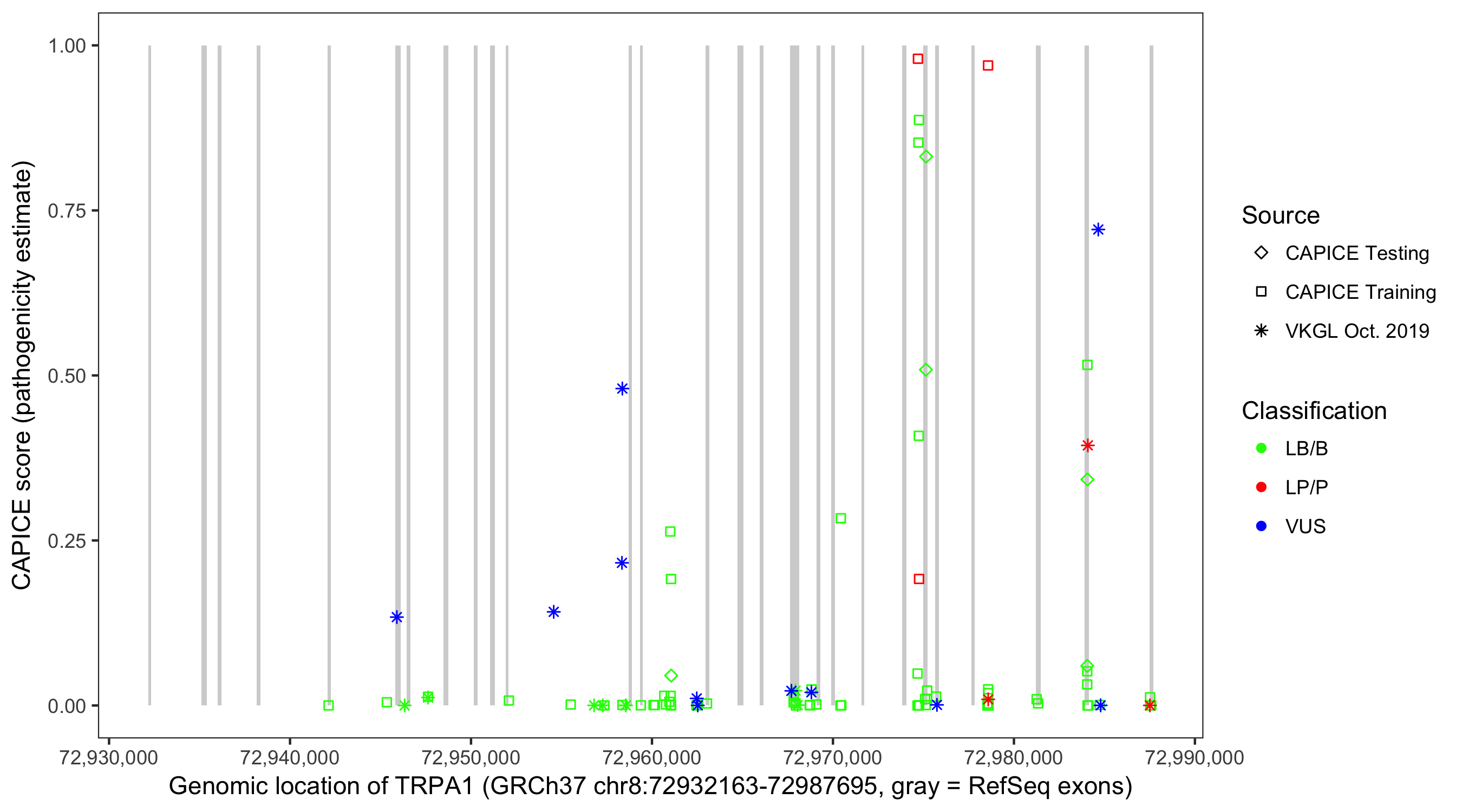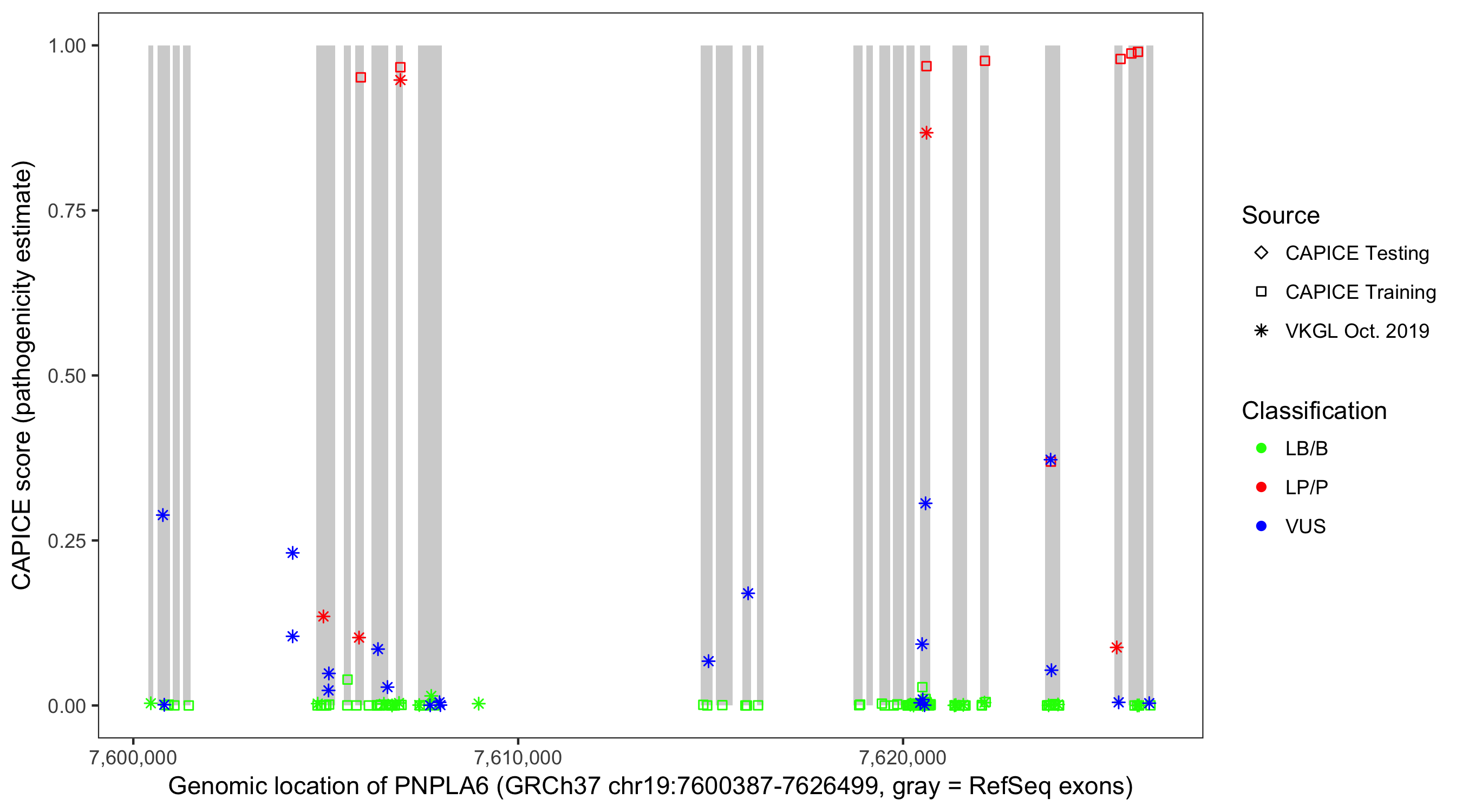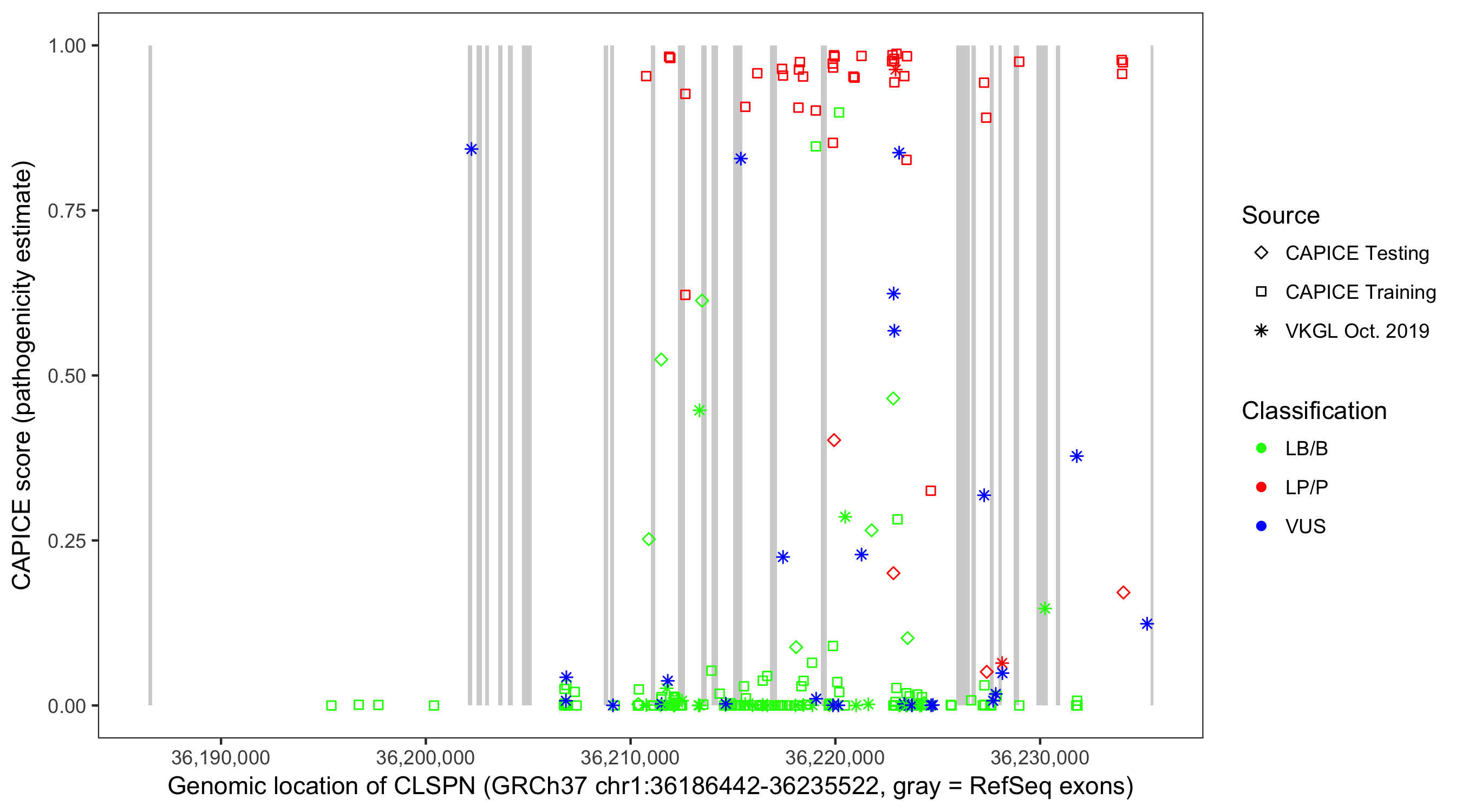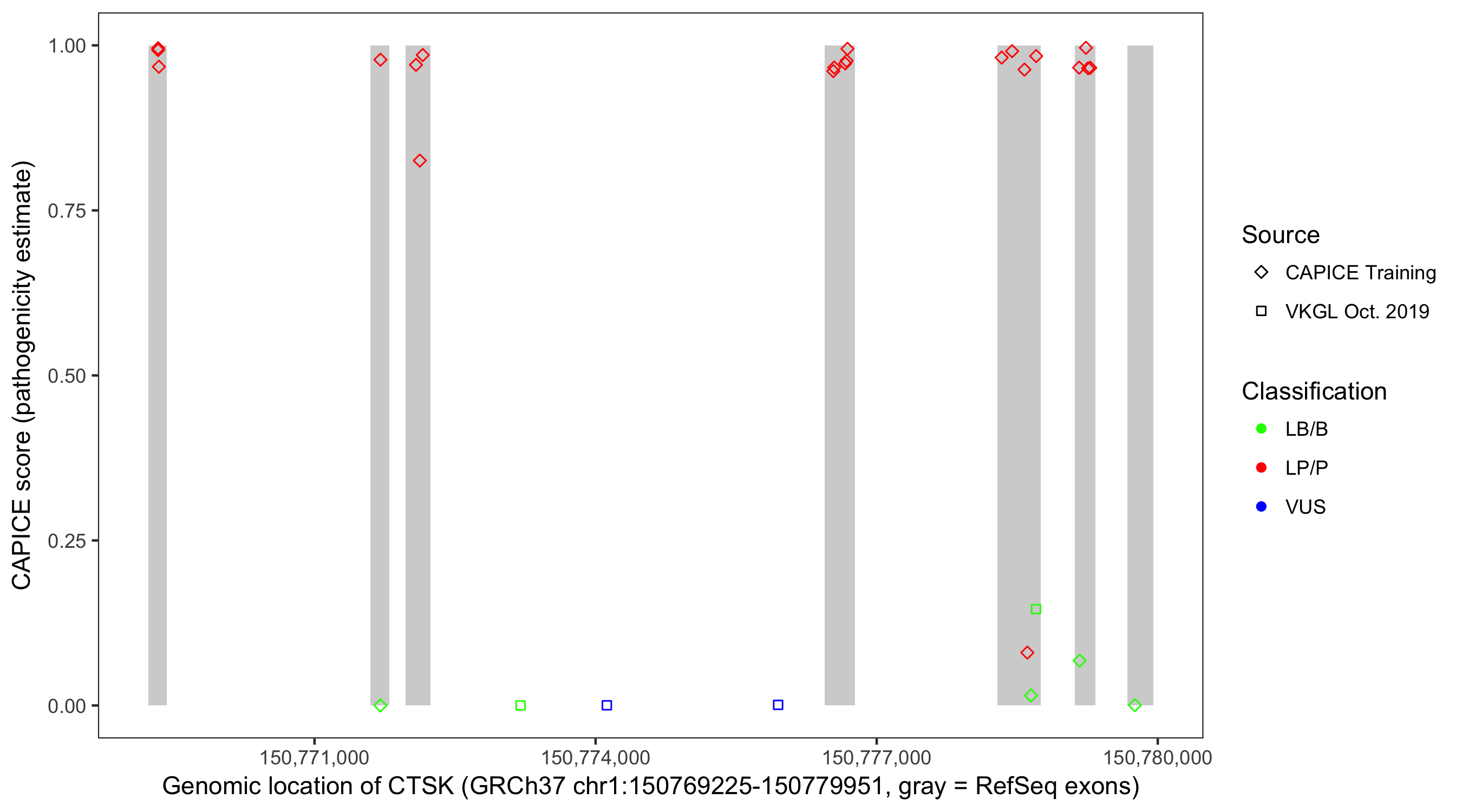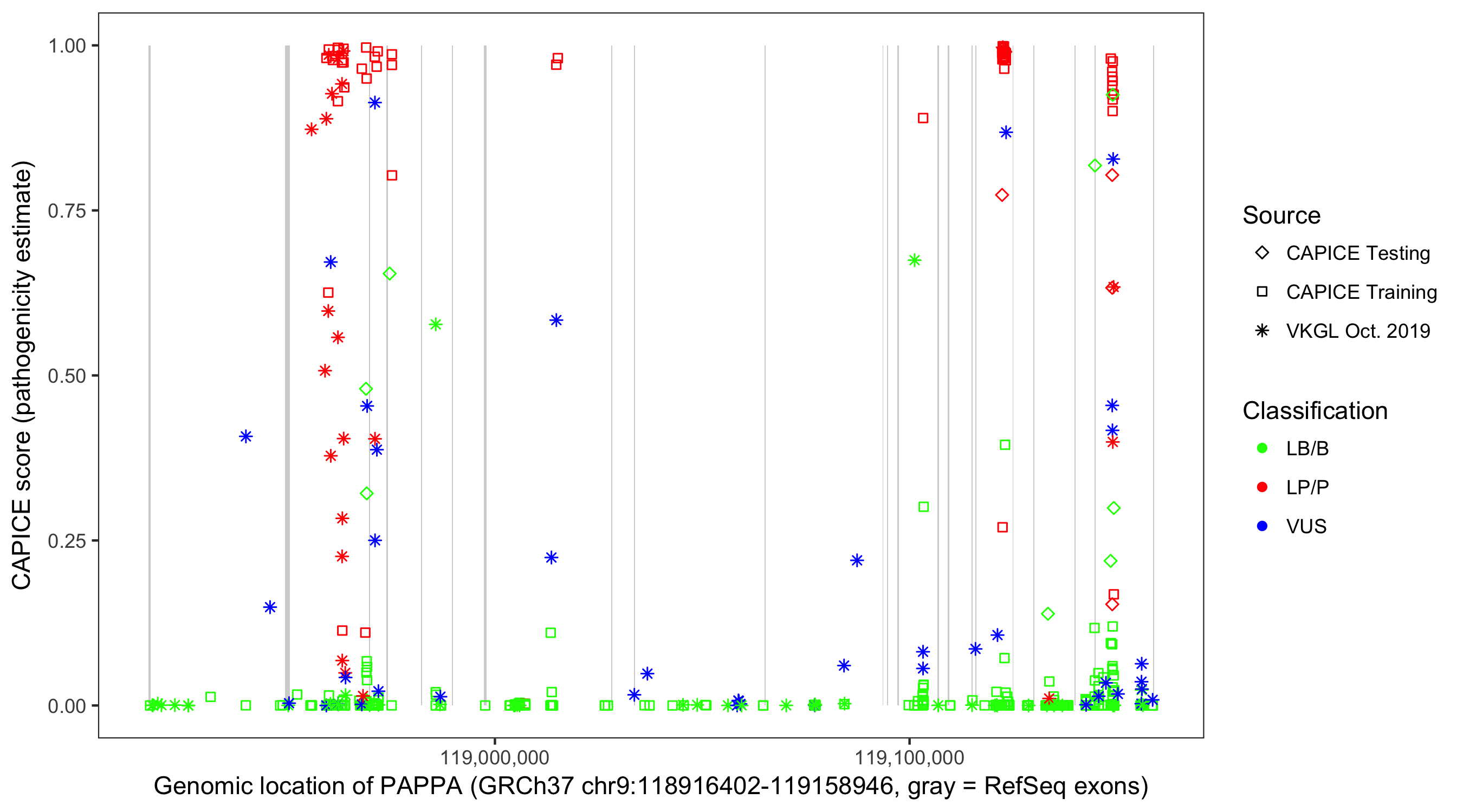 Shown are CAPICE train/test variants plus VKGL Oct 2019.