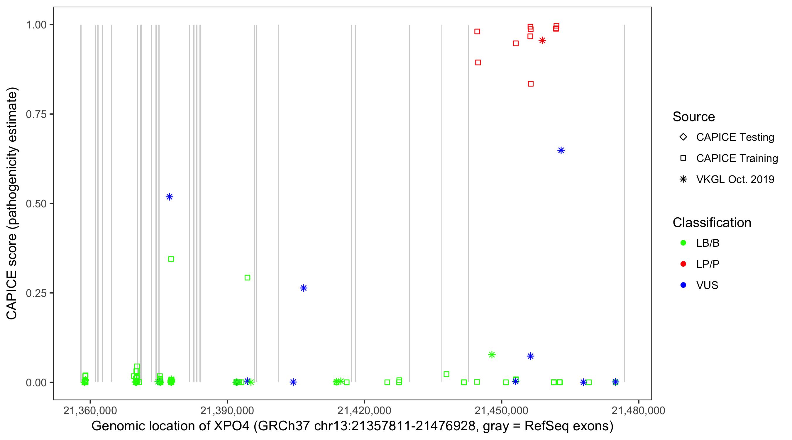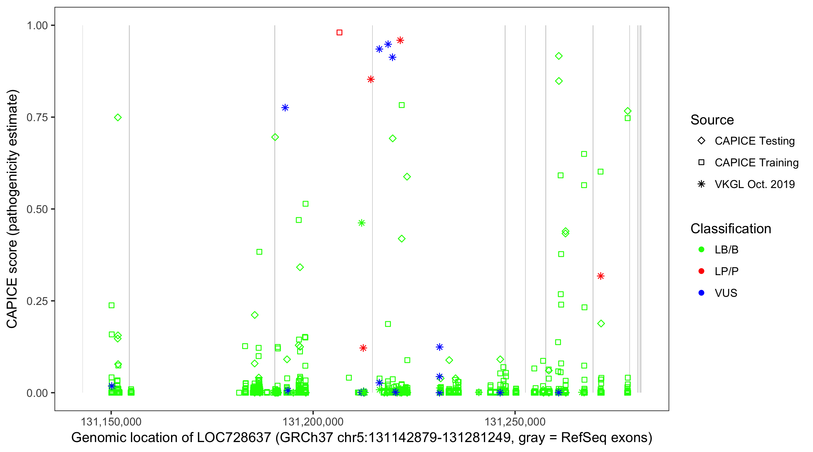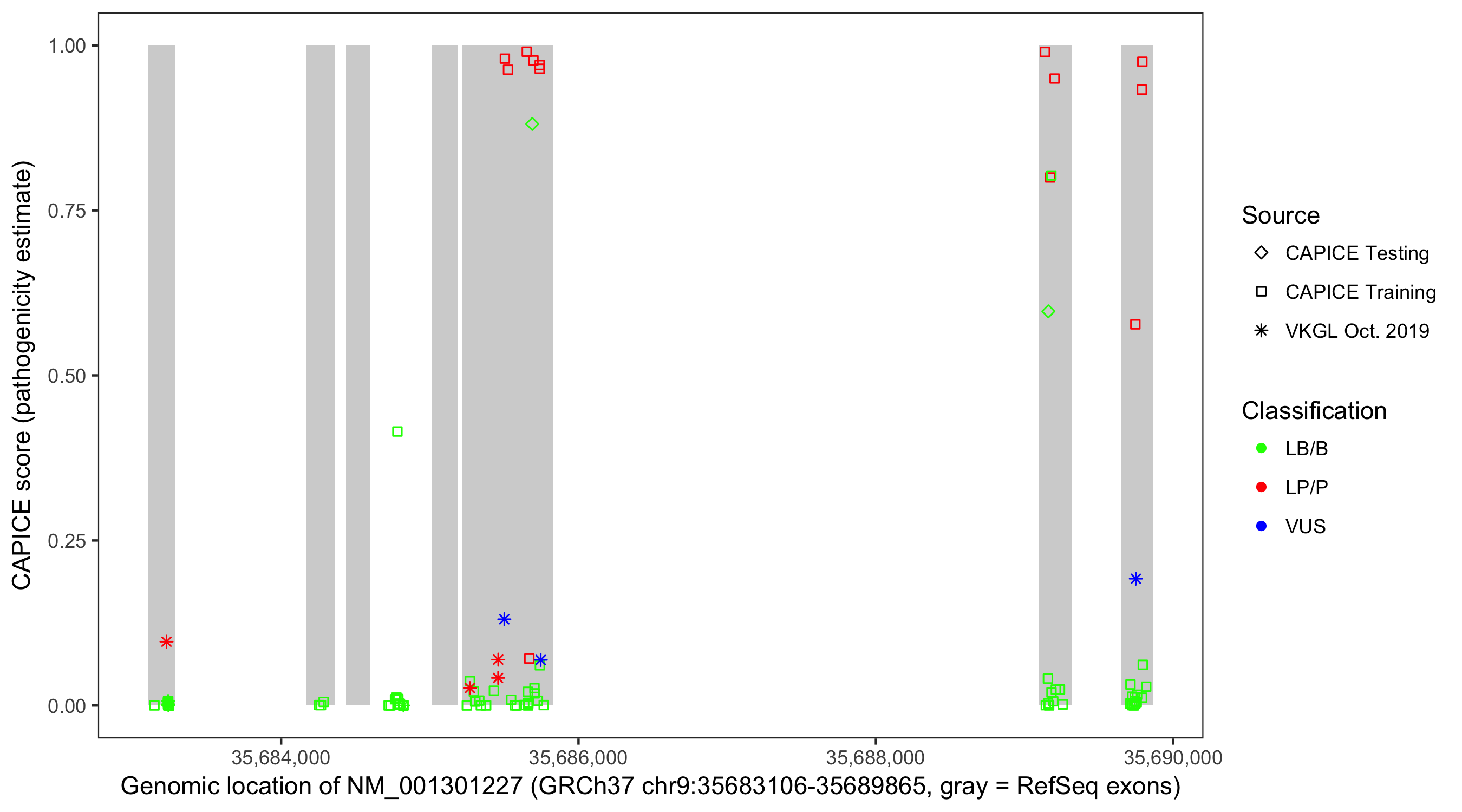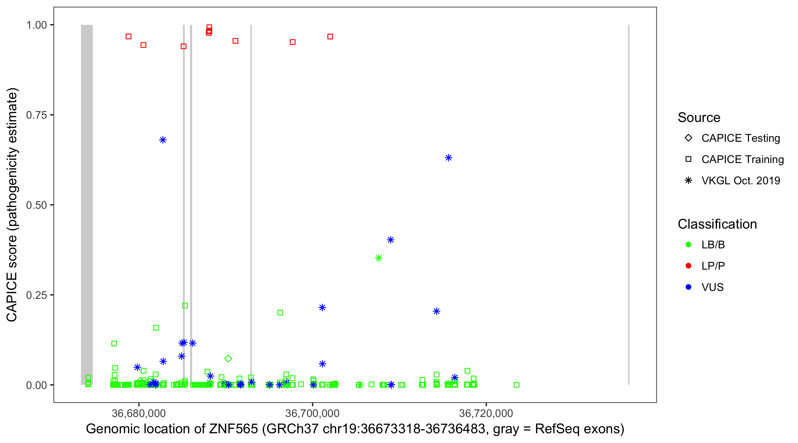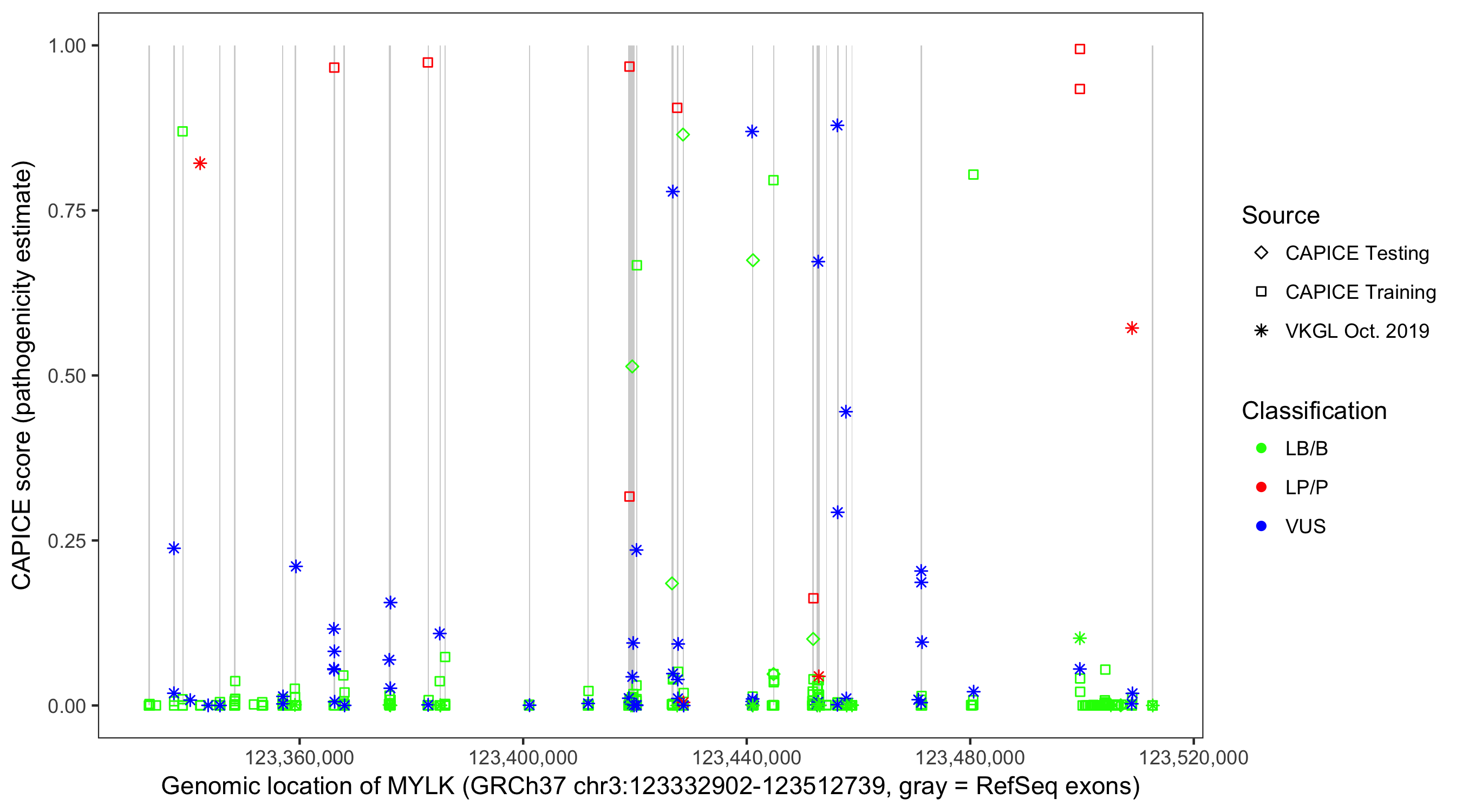 Shown are CAPICE train/test variants plus VKGL Oct 2019.