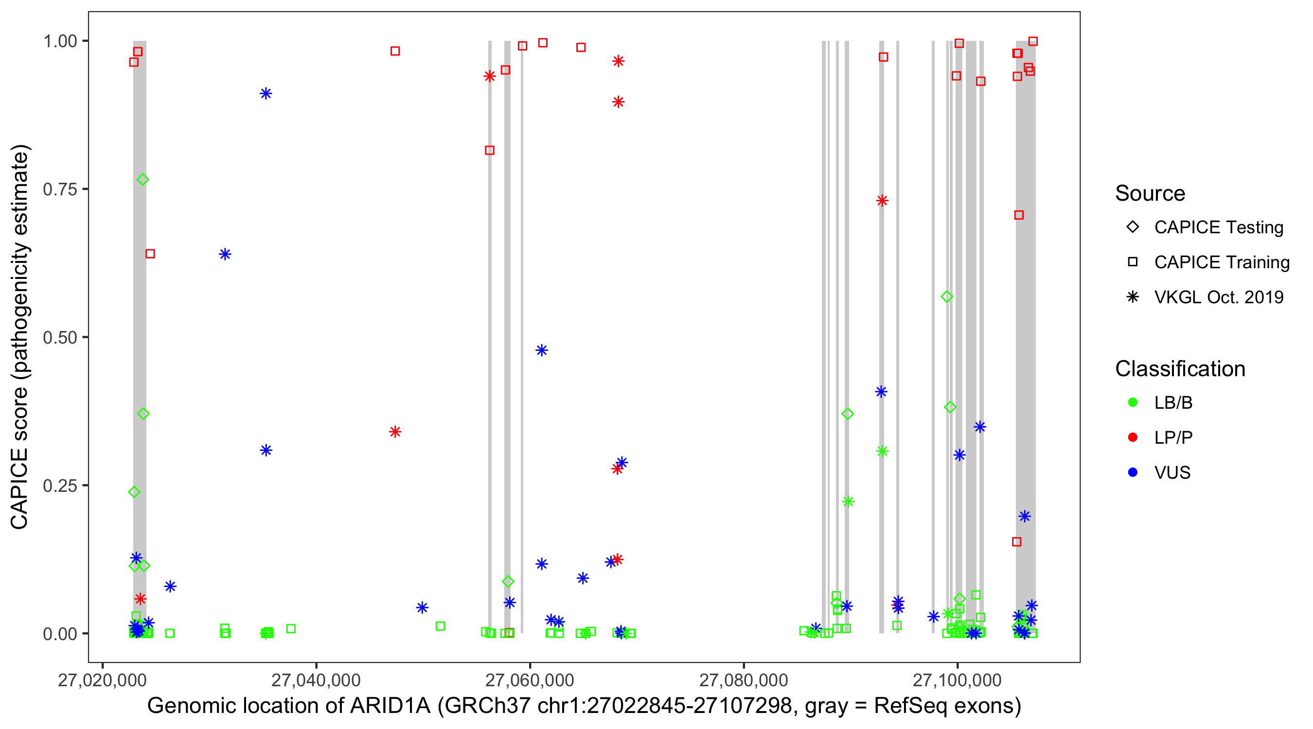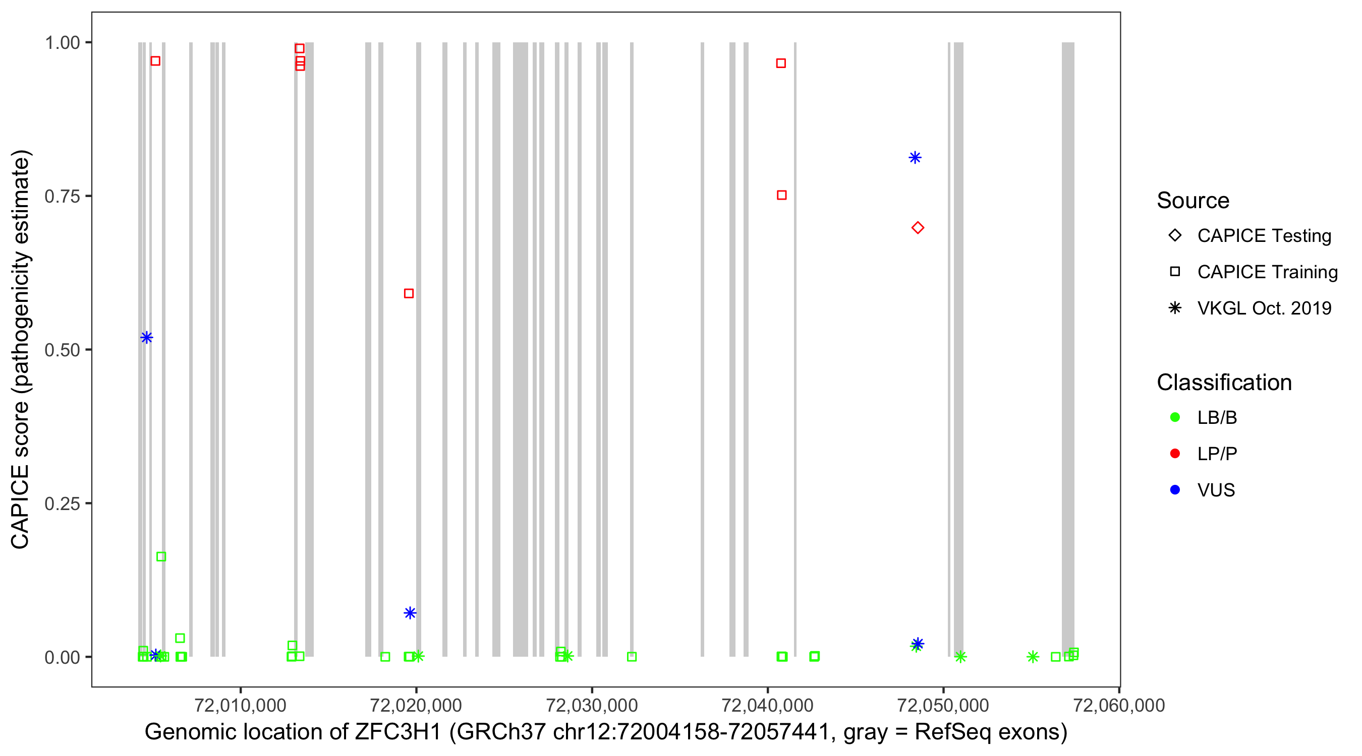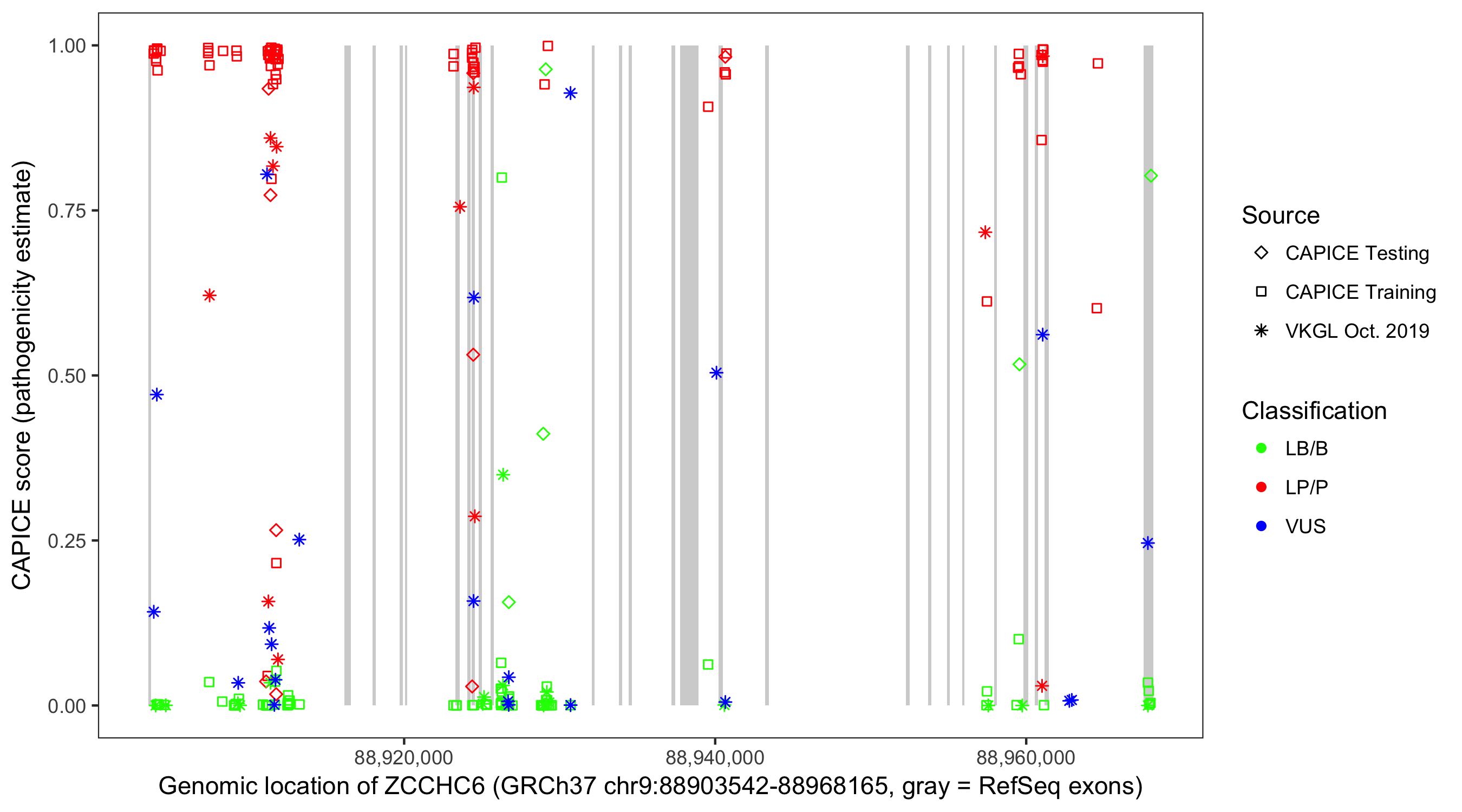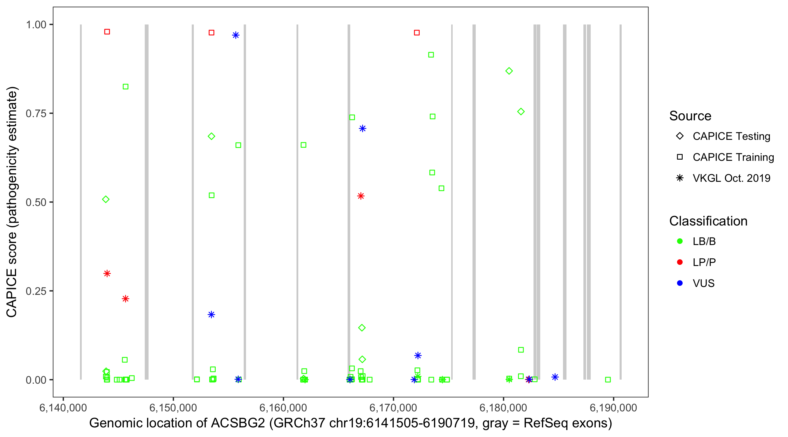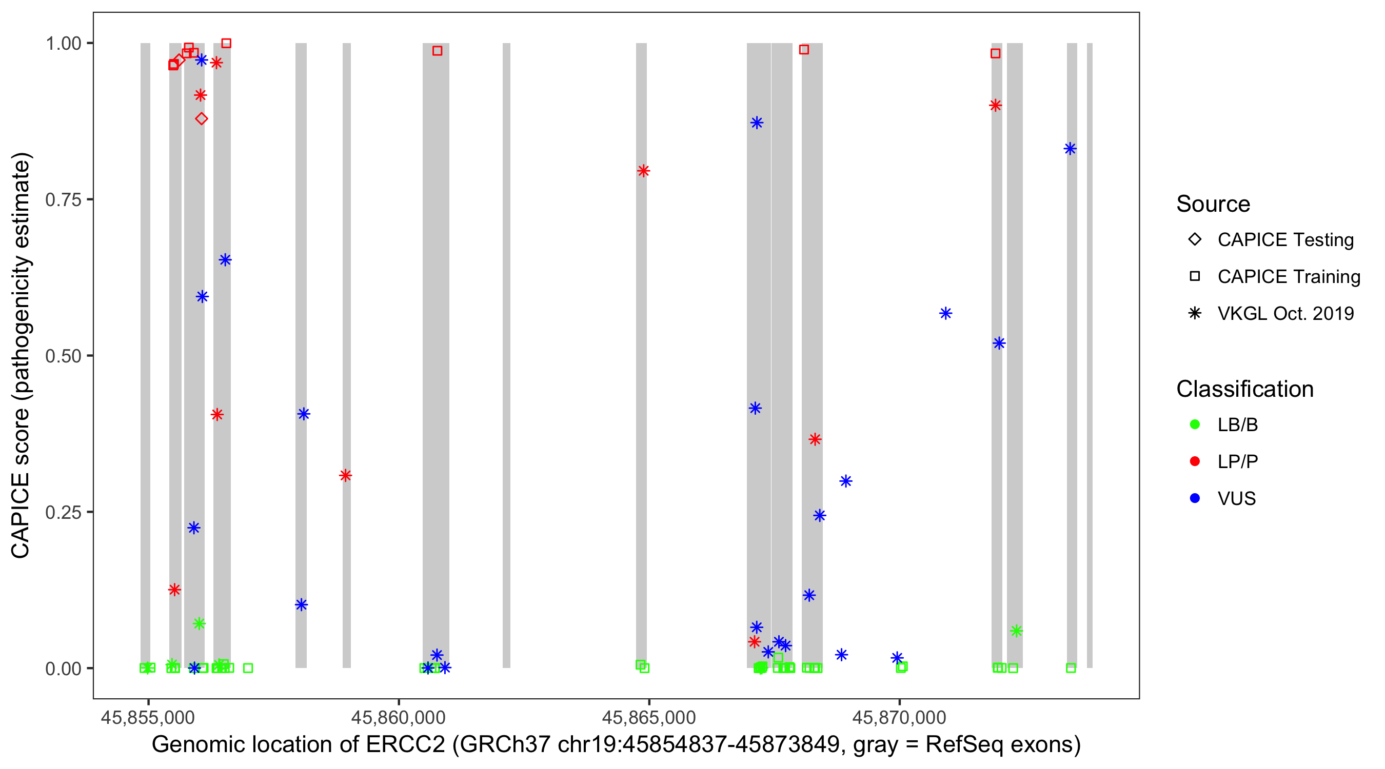 Shown are CAPICE train/test variants plus VKGL Oct 2019.