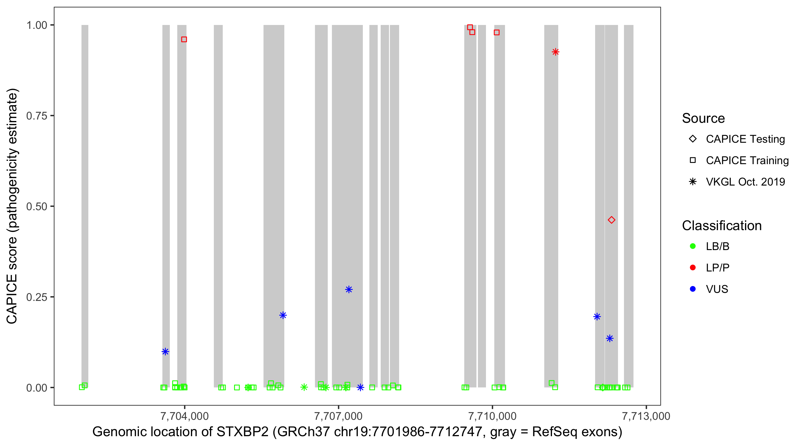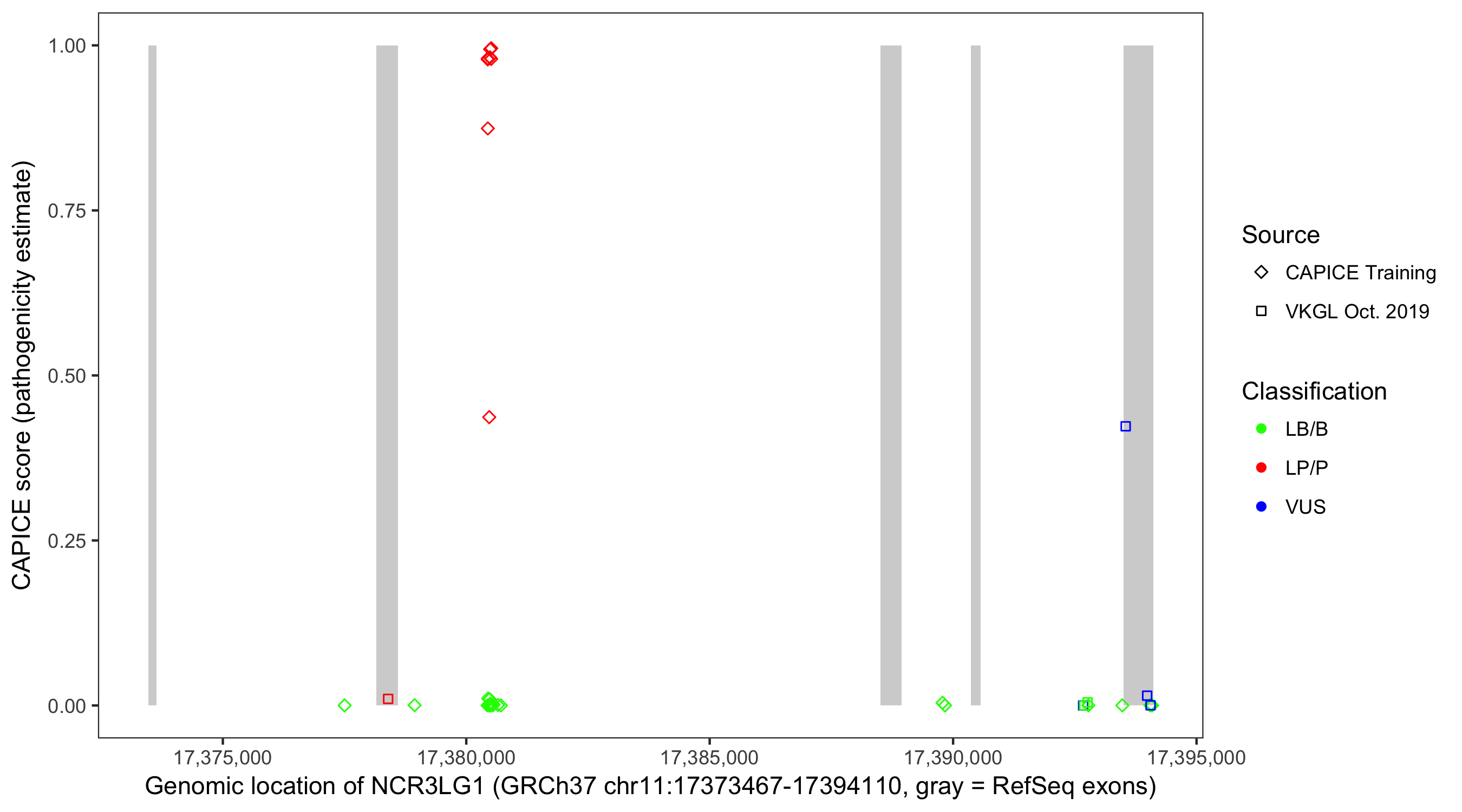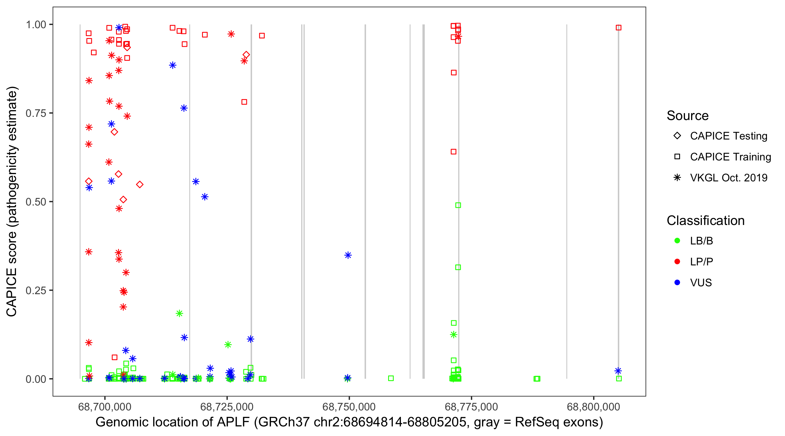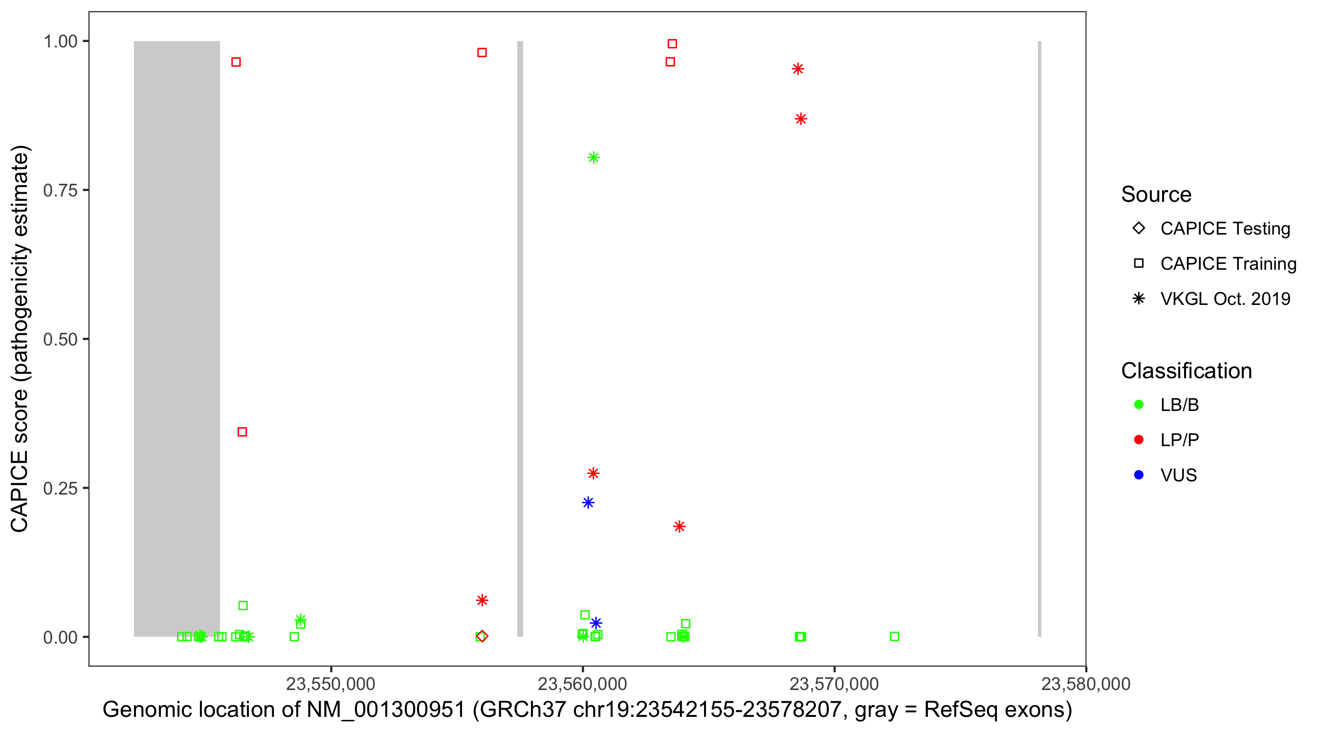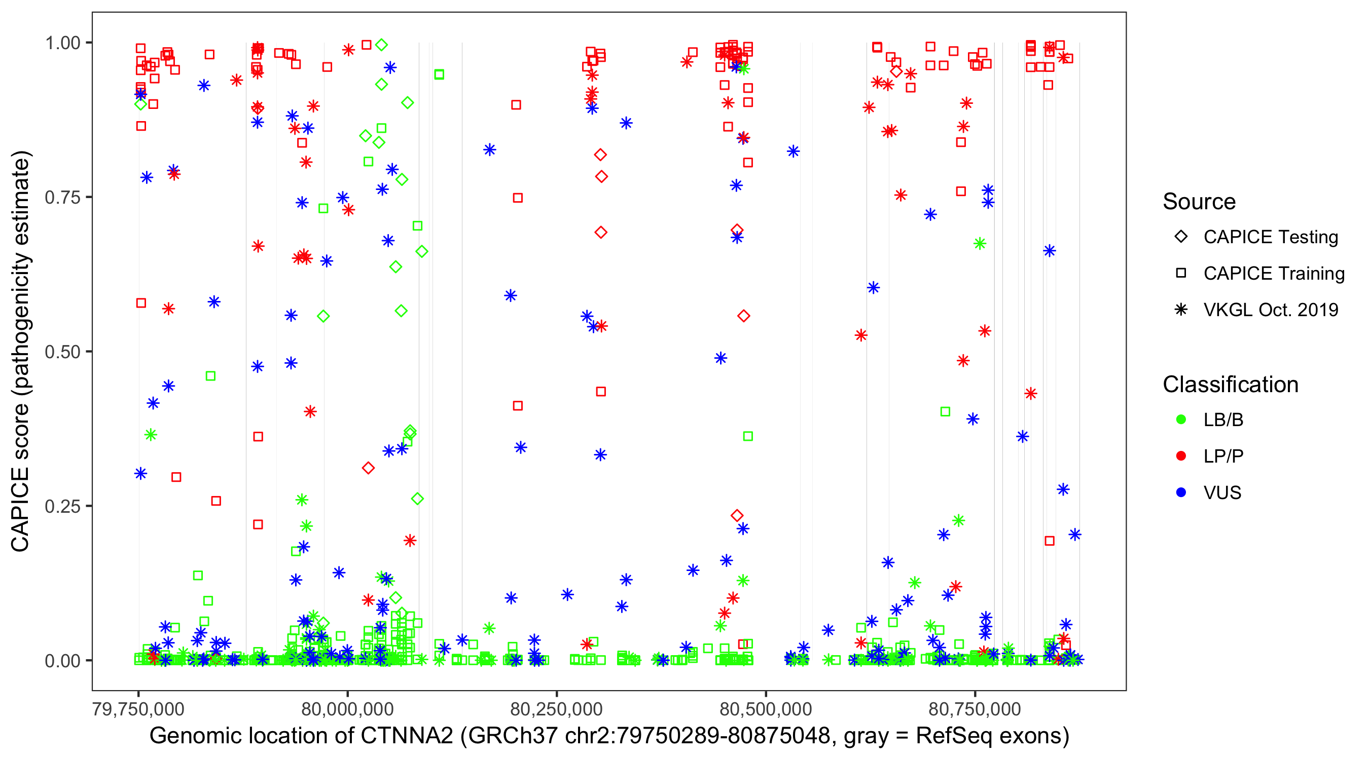 Shown are CAPICE train/test variants plus VKGL Oct 2019.