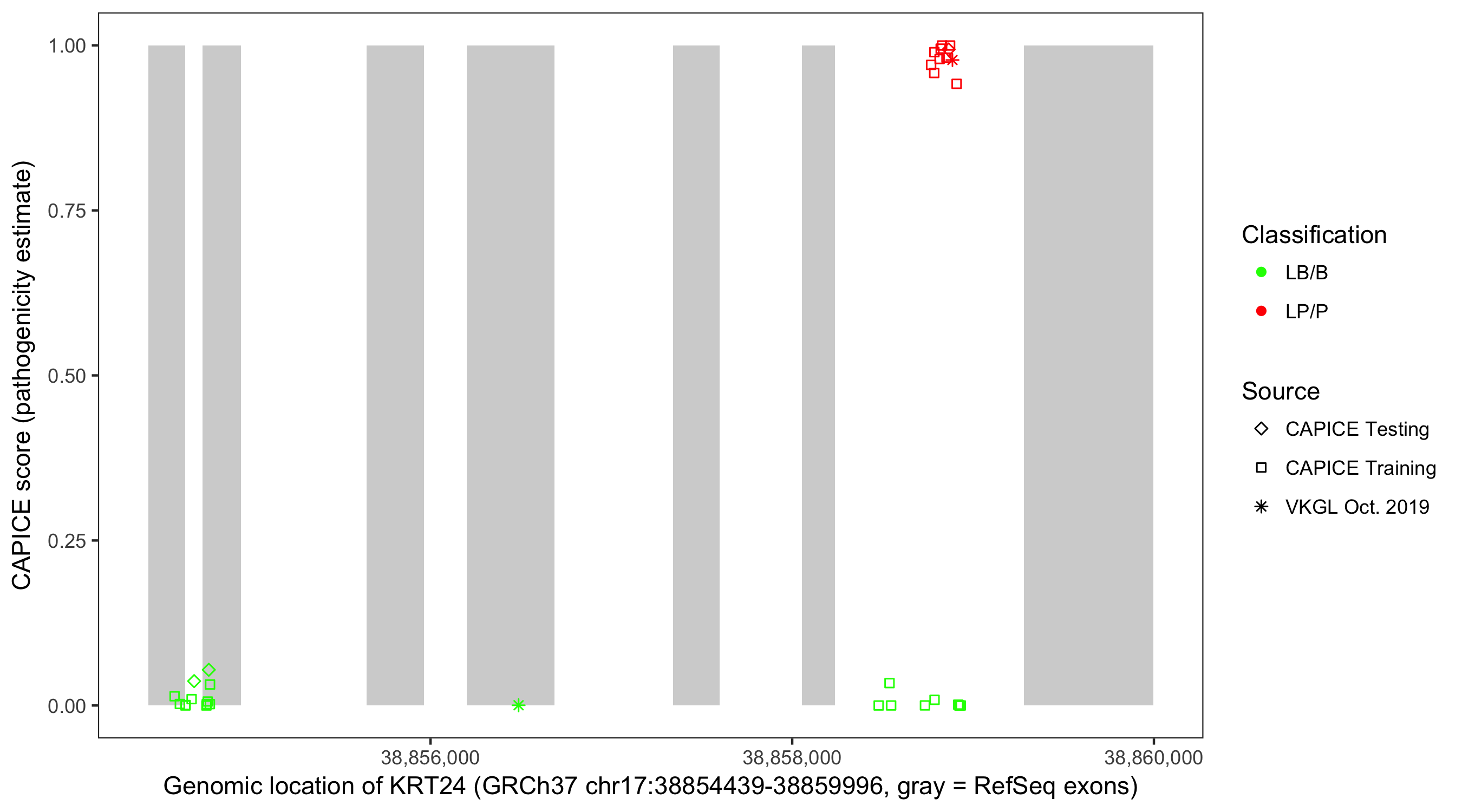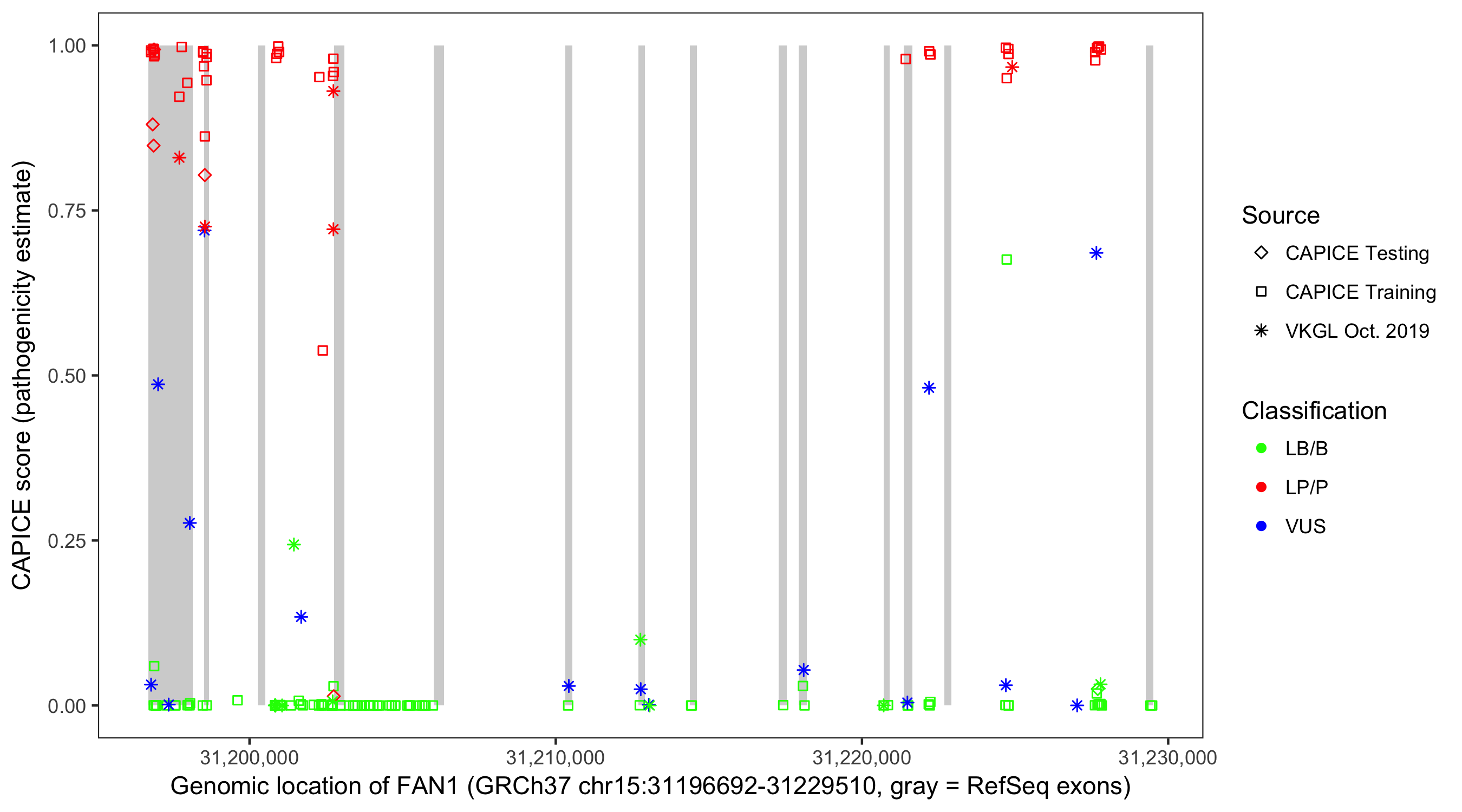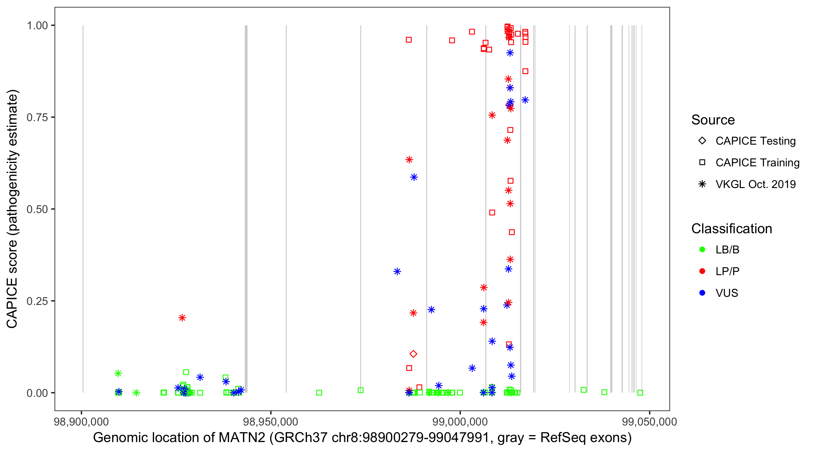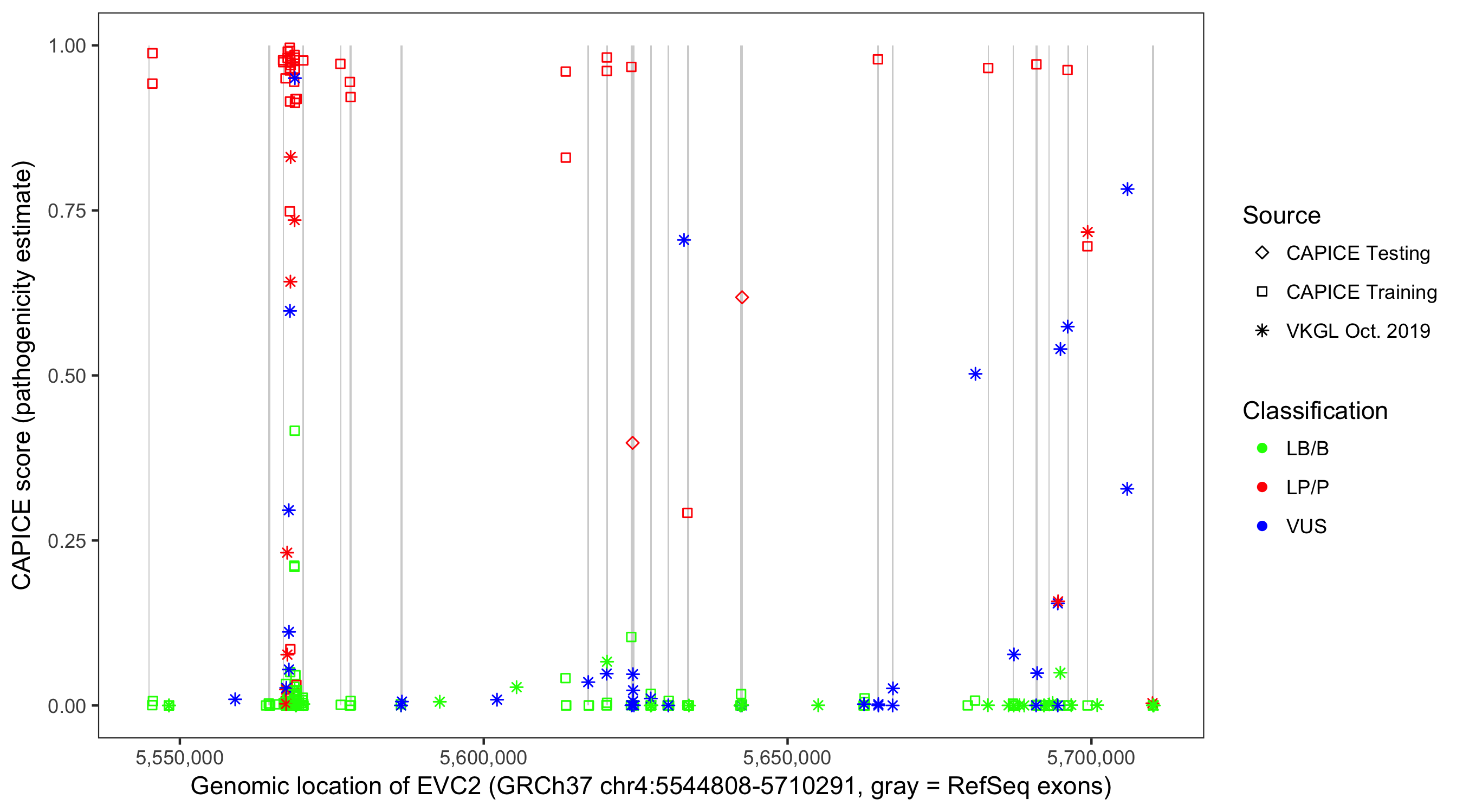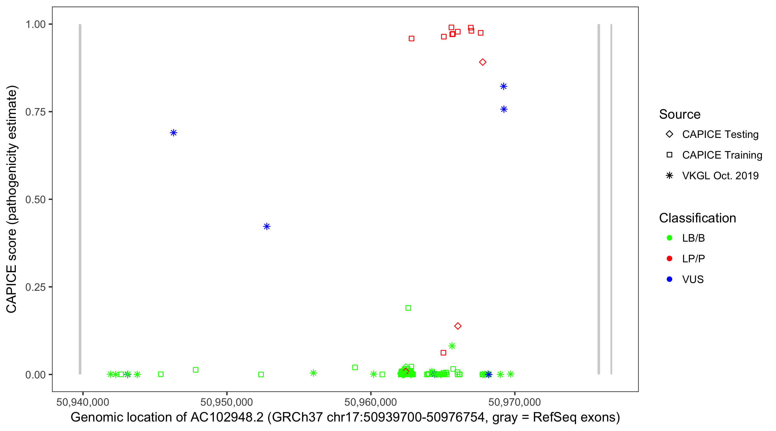 Shown are CAPICE train/test variants plus VKGL Oct 2019.
