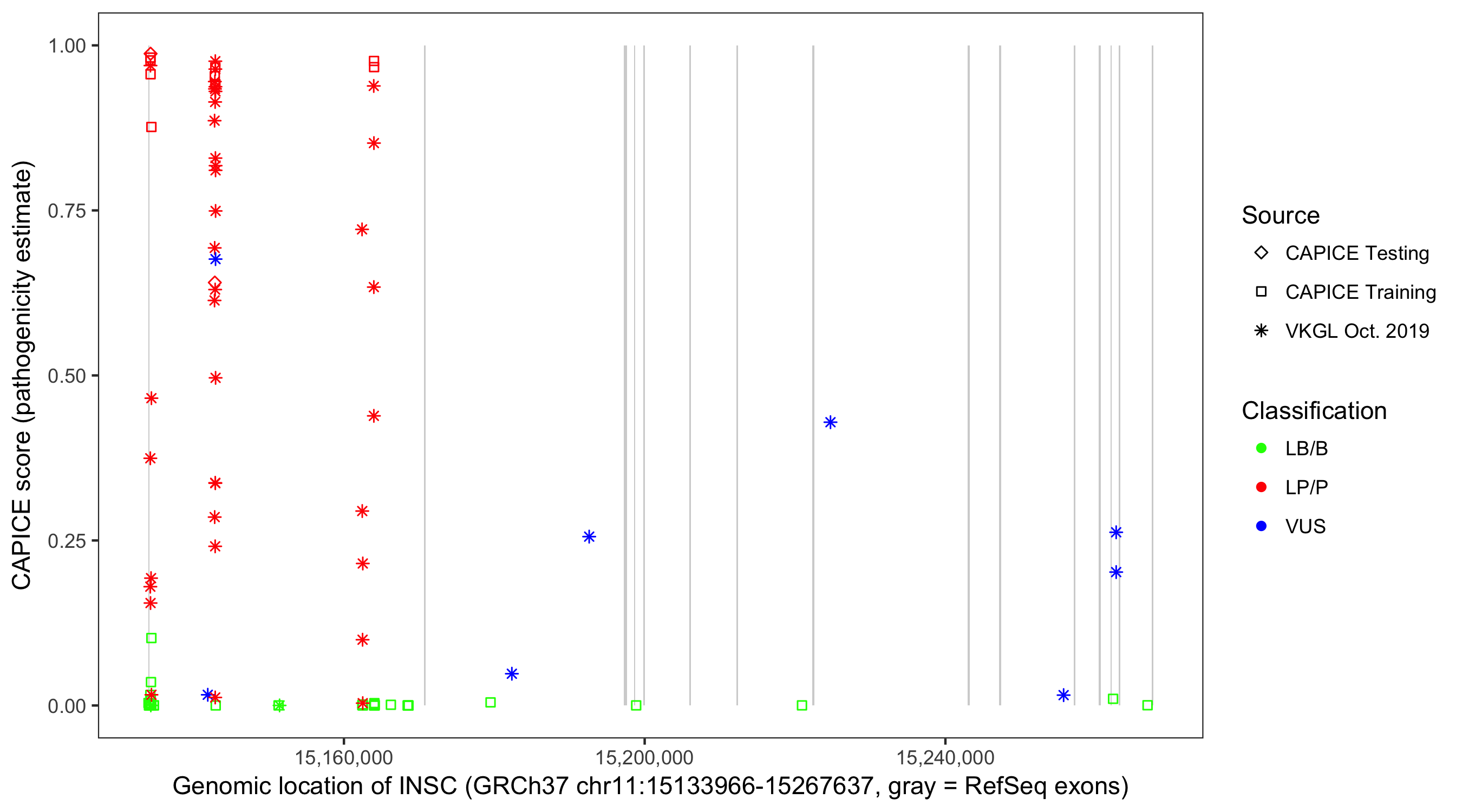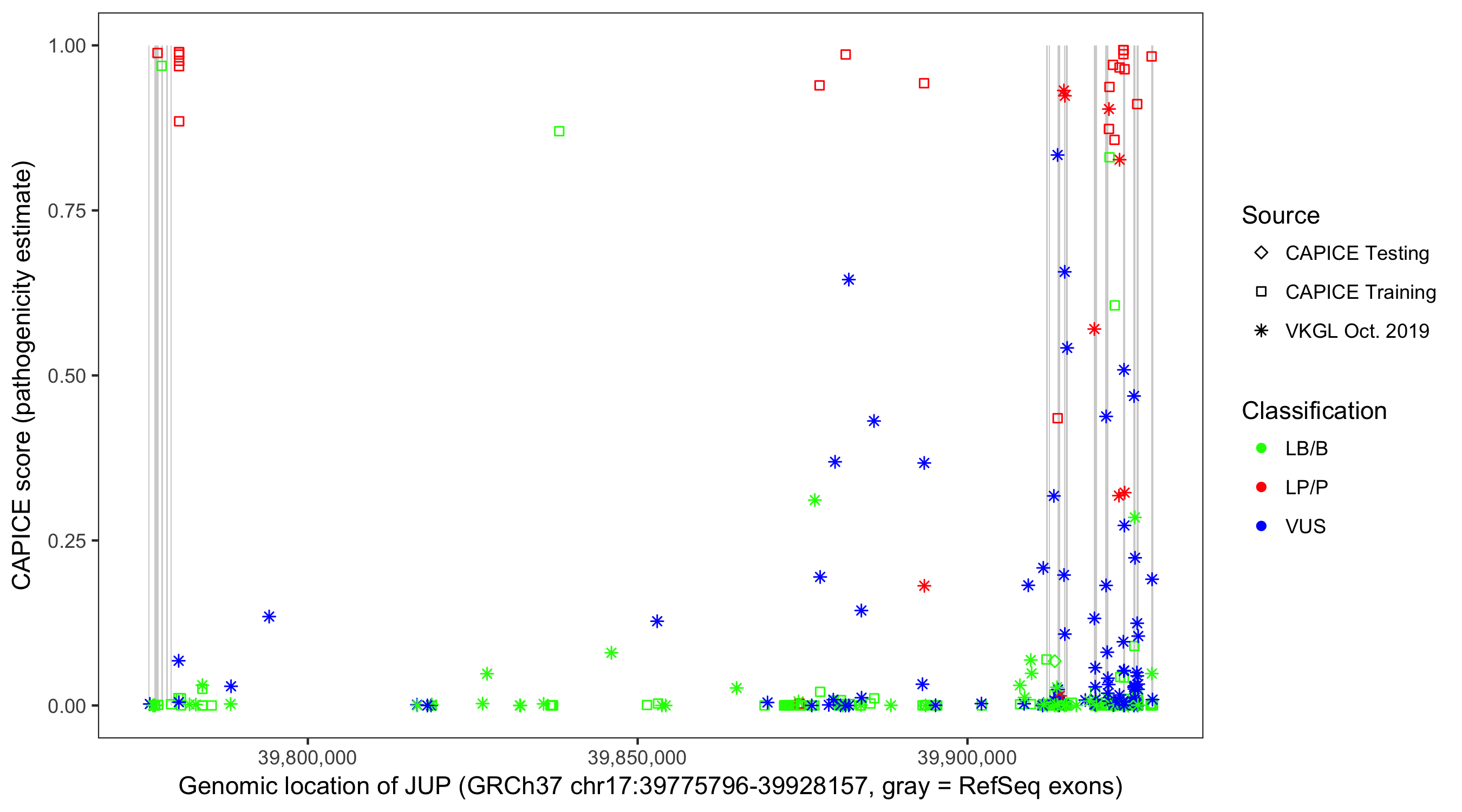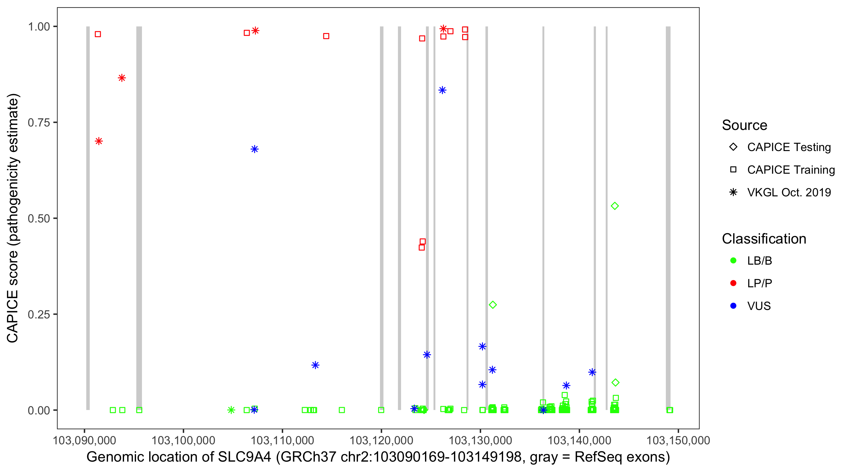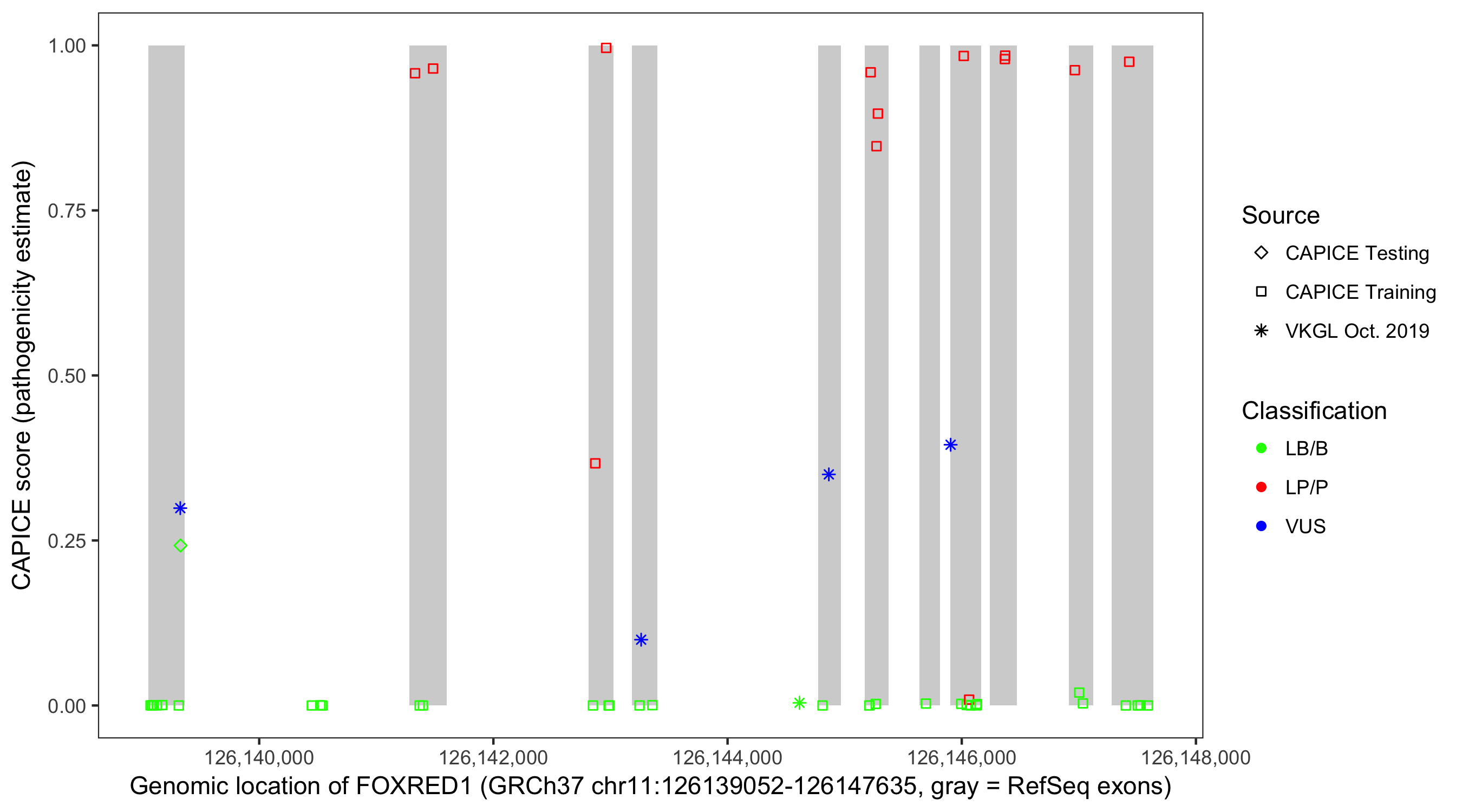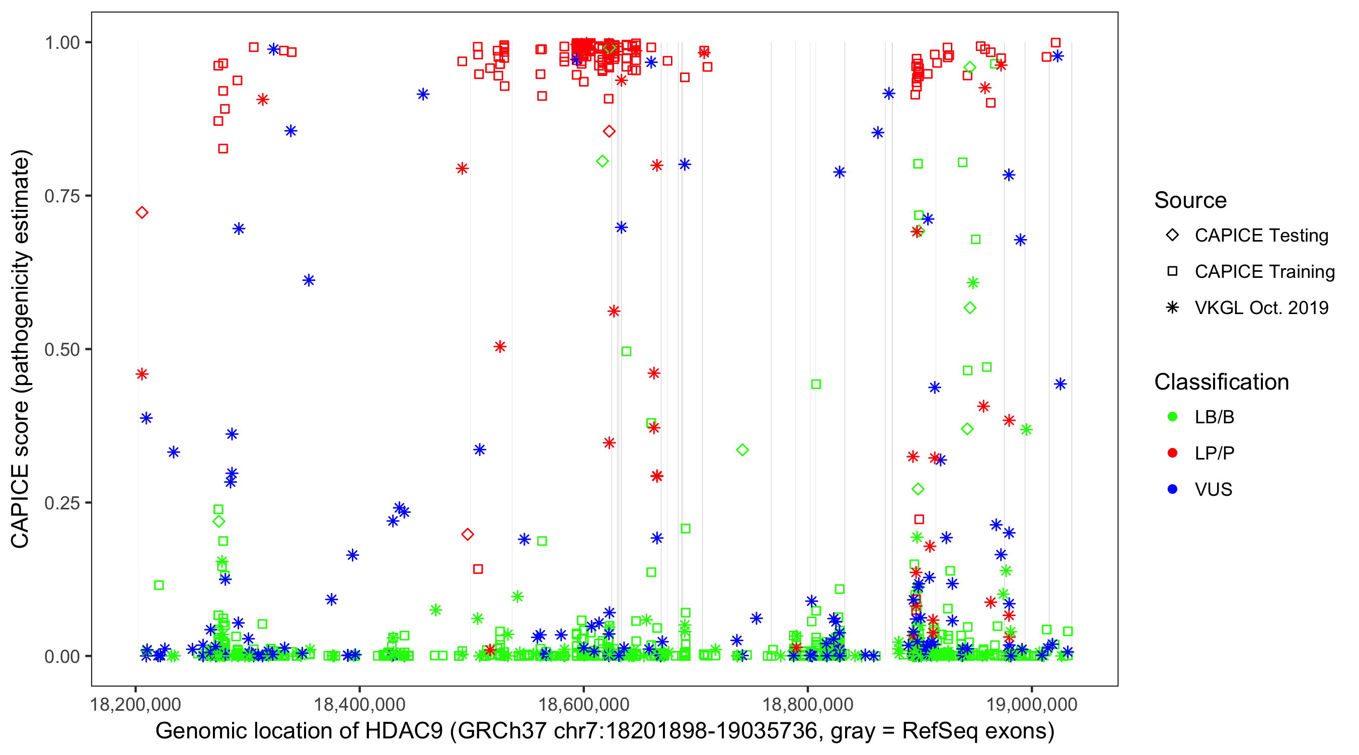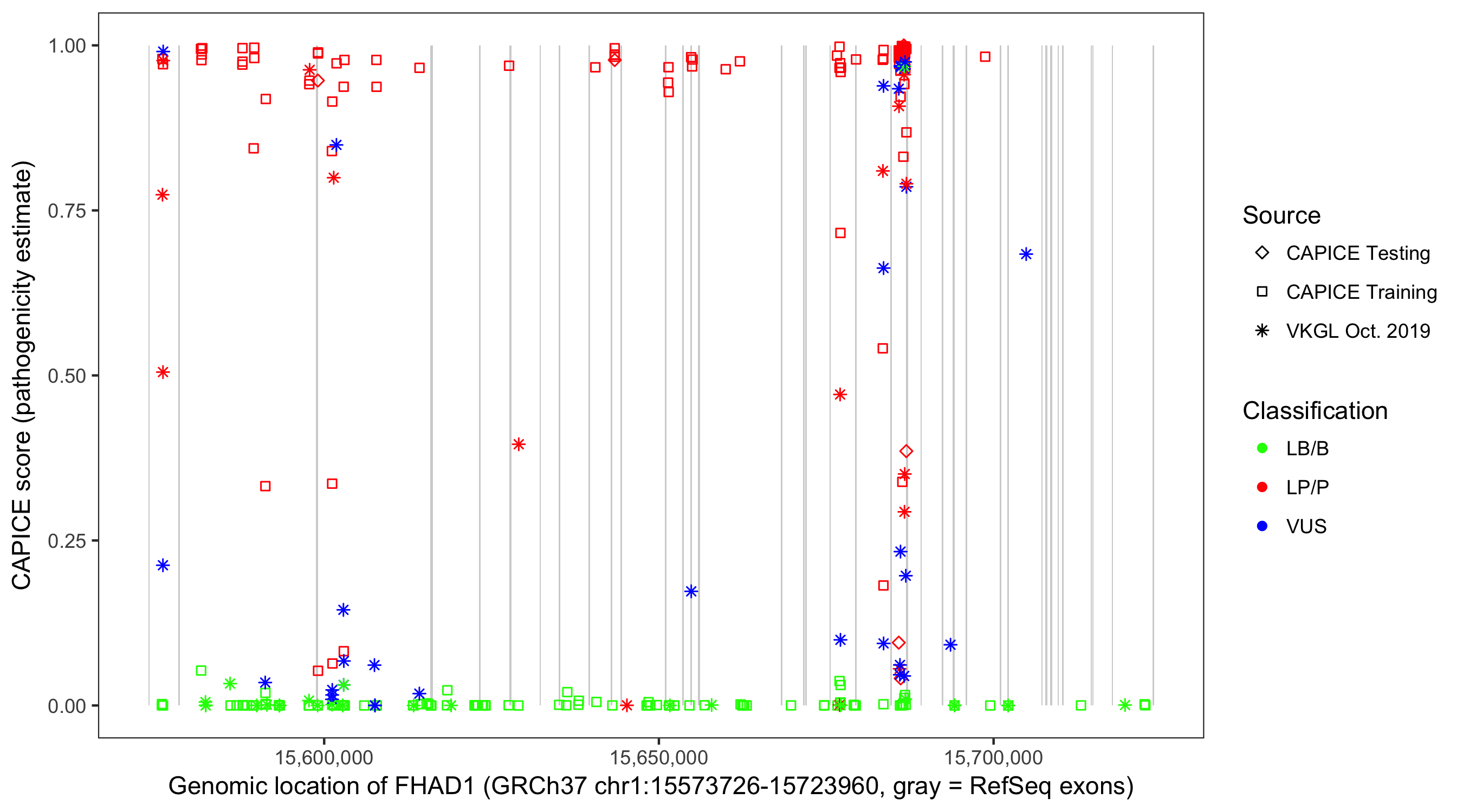 Shown are CAPICE train/test variants plus VKGL Oct 2019.