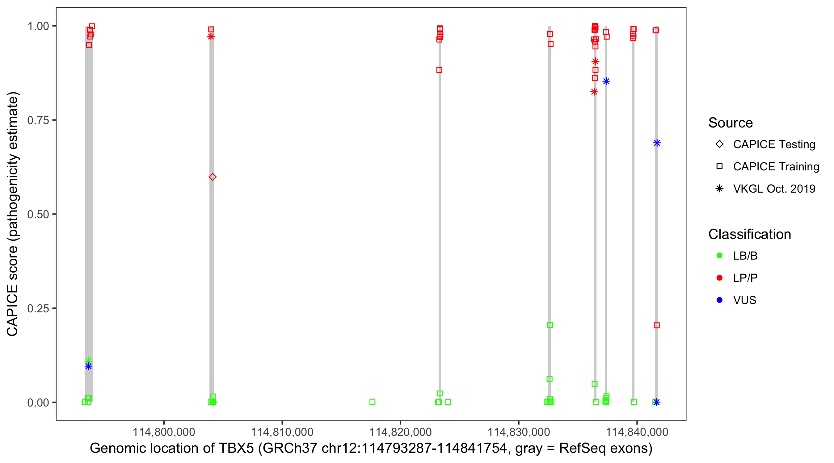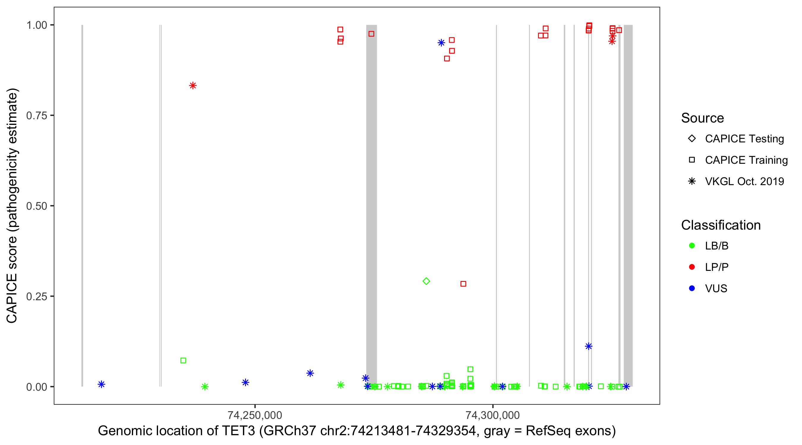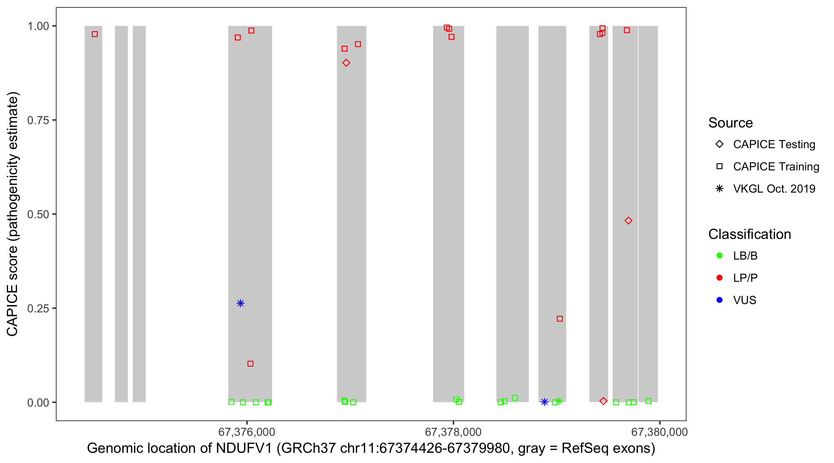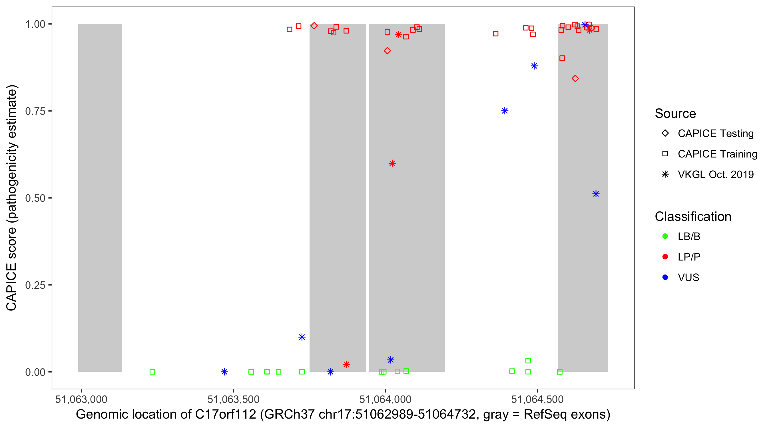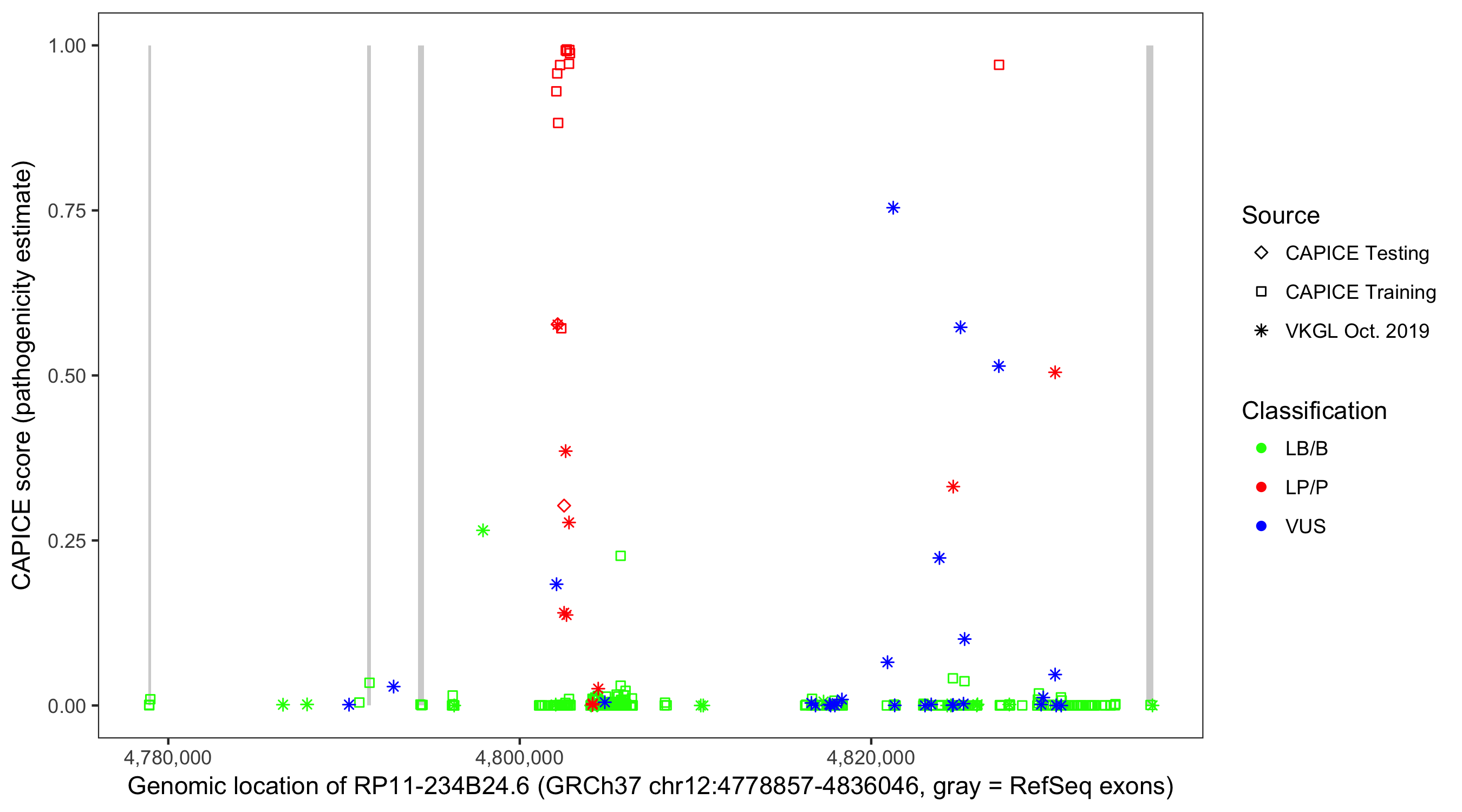Shown are CAPICE train/test variants plus VKGL Oct 2019.