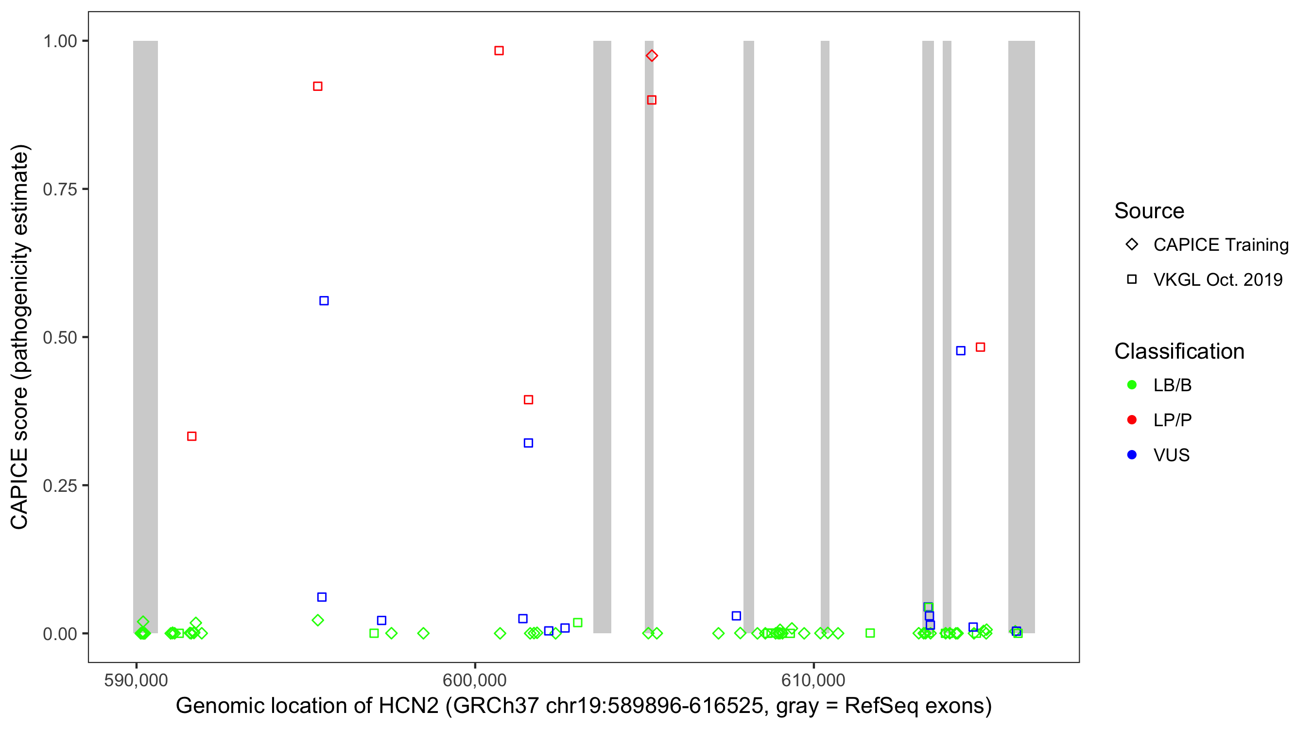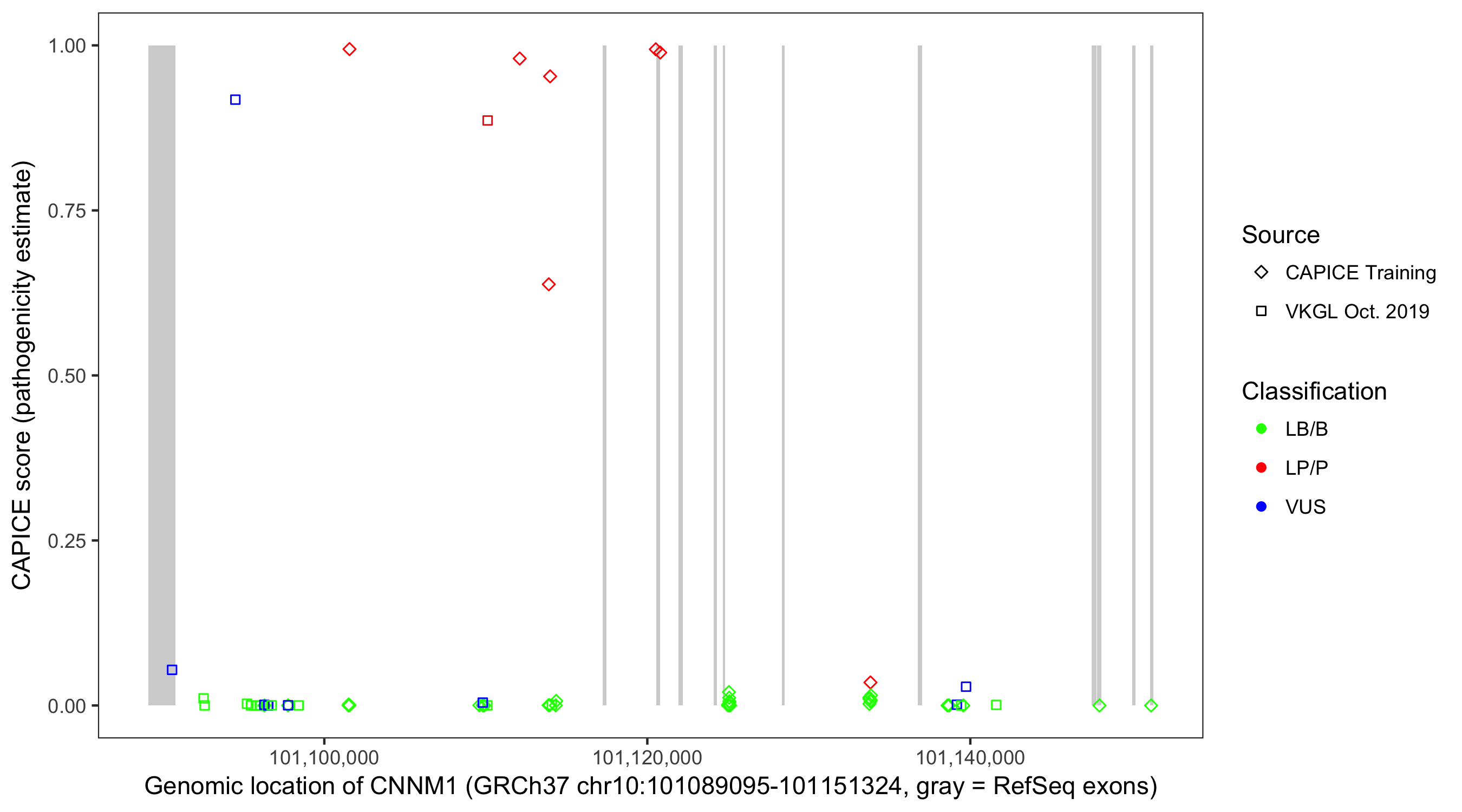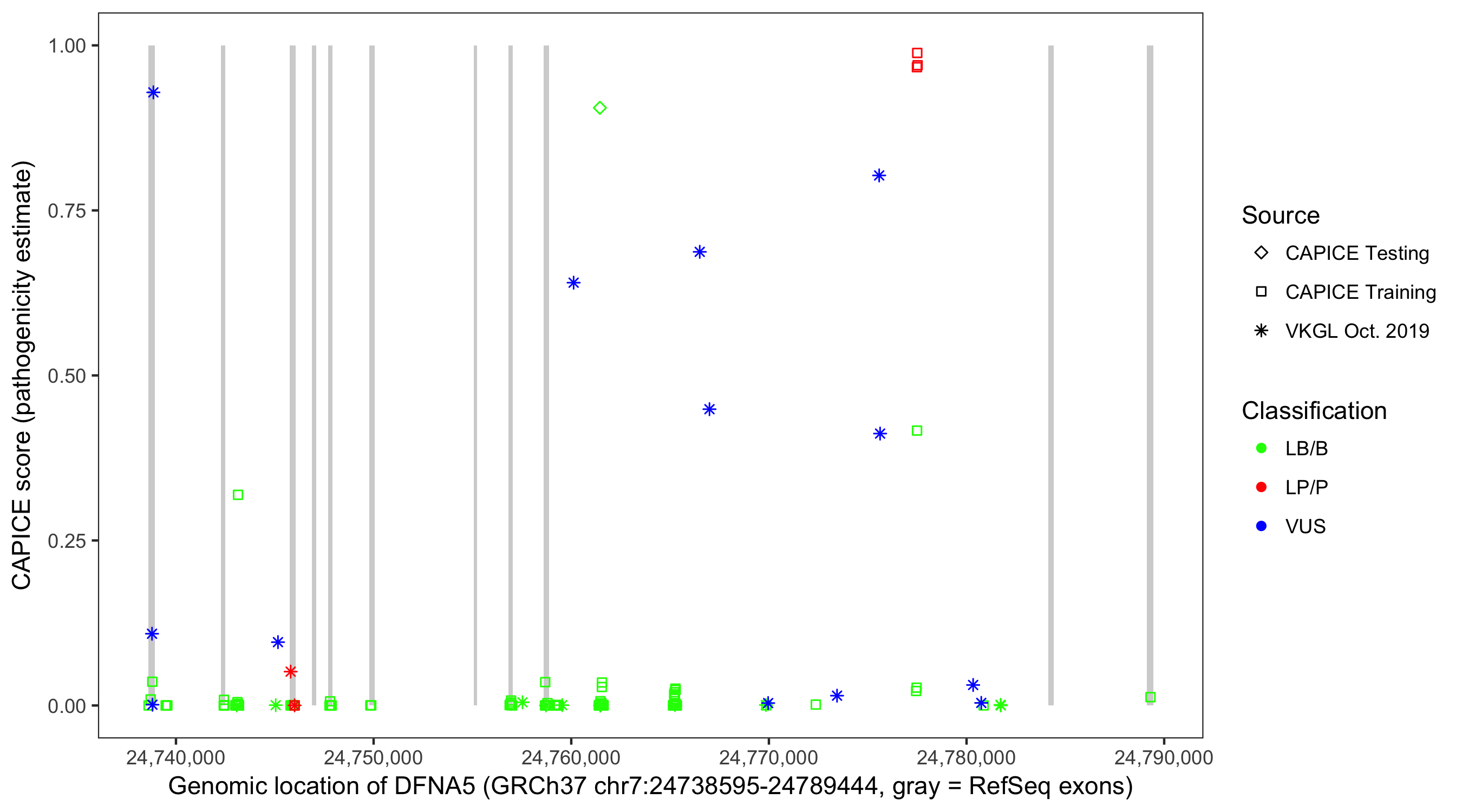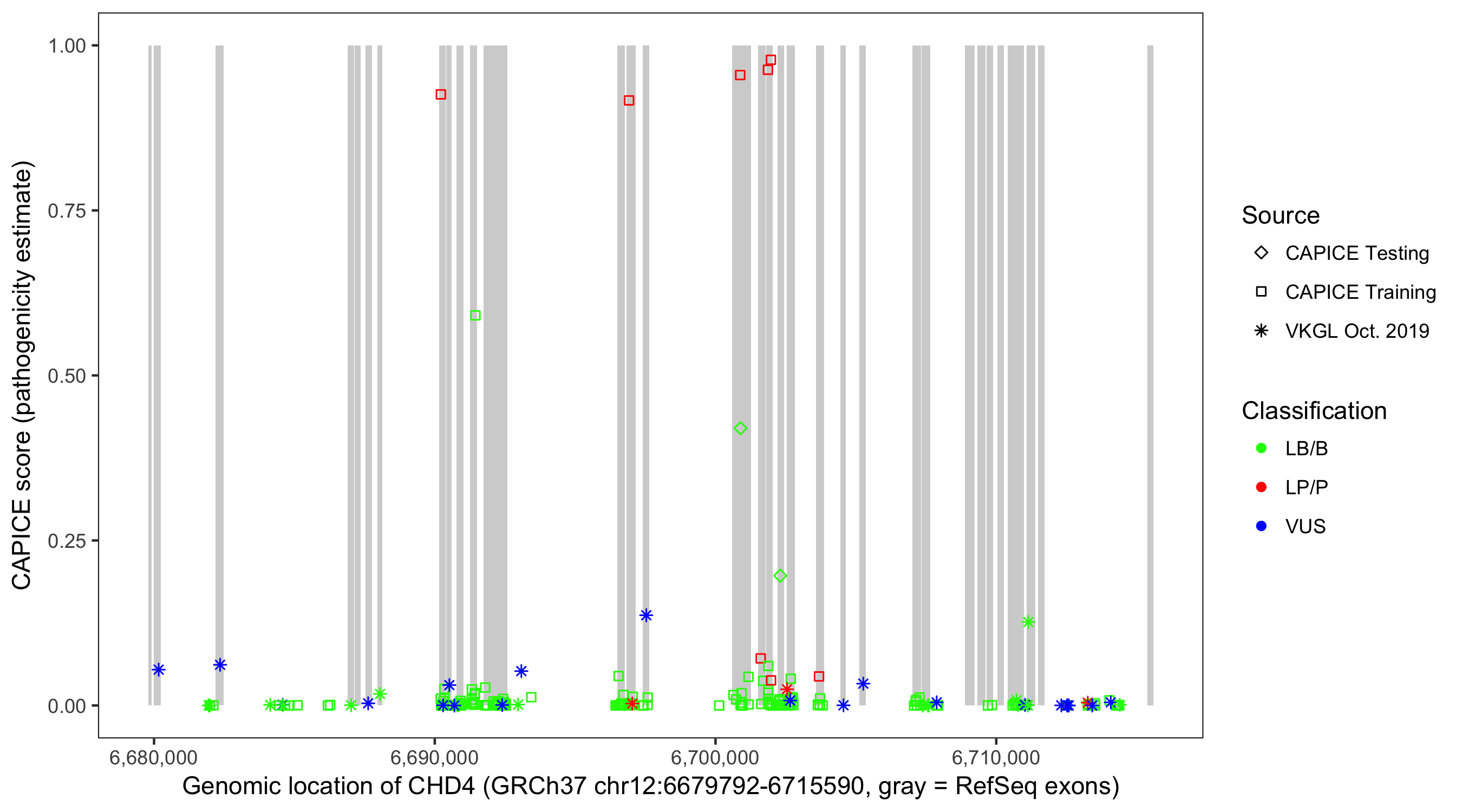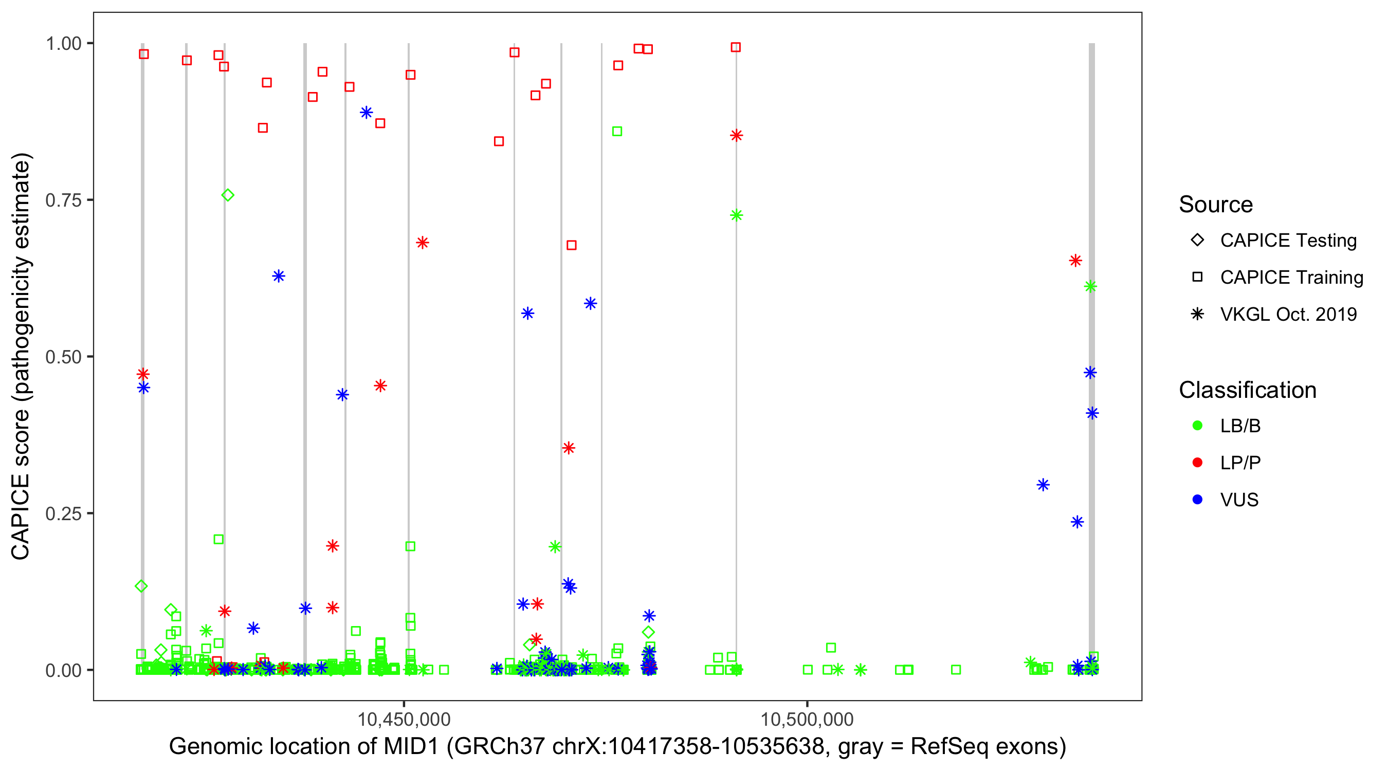 Shown are CAPICE train/test variants plus VKGL Oct 2019.
