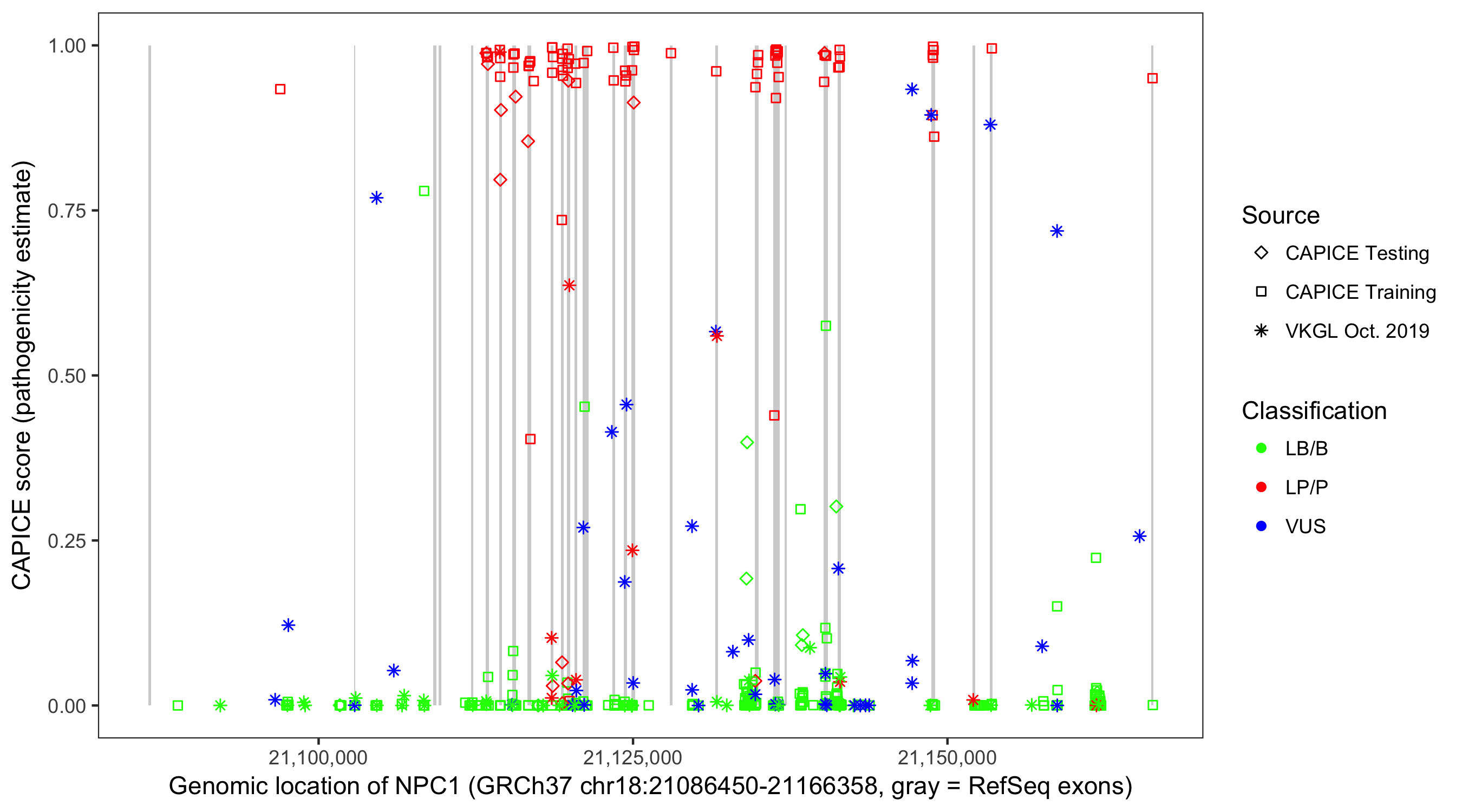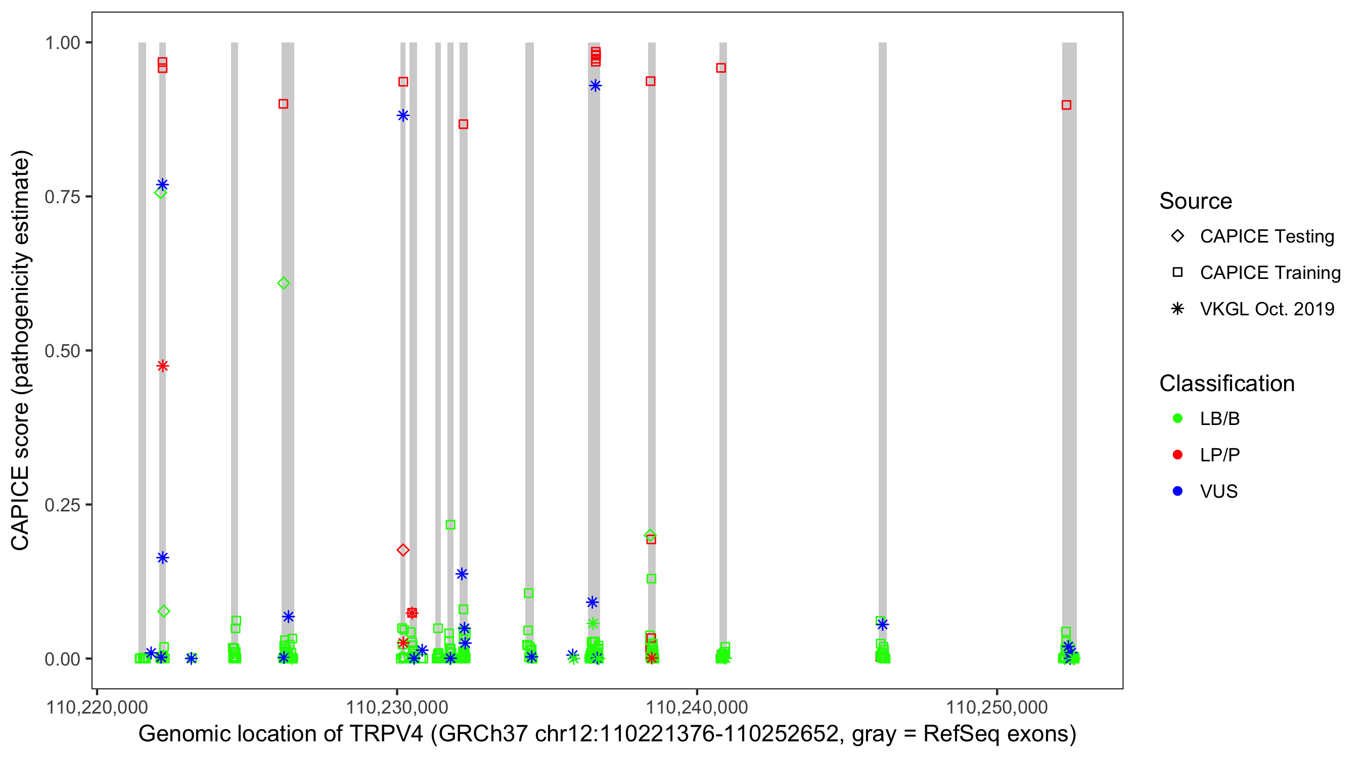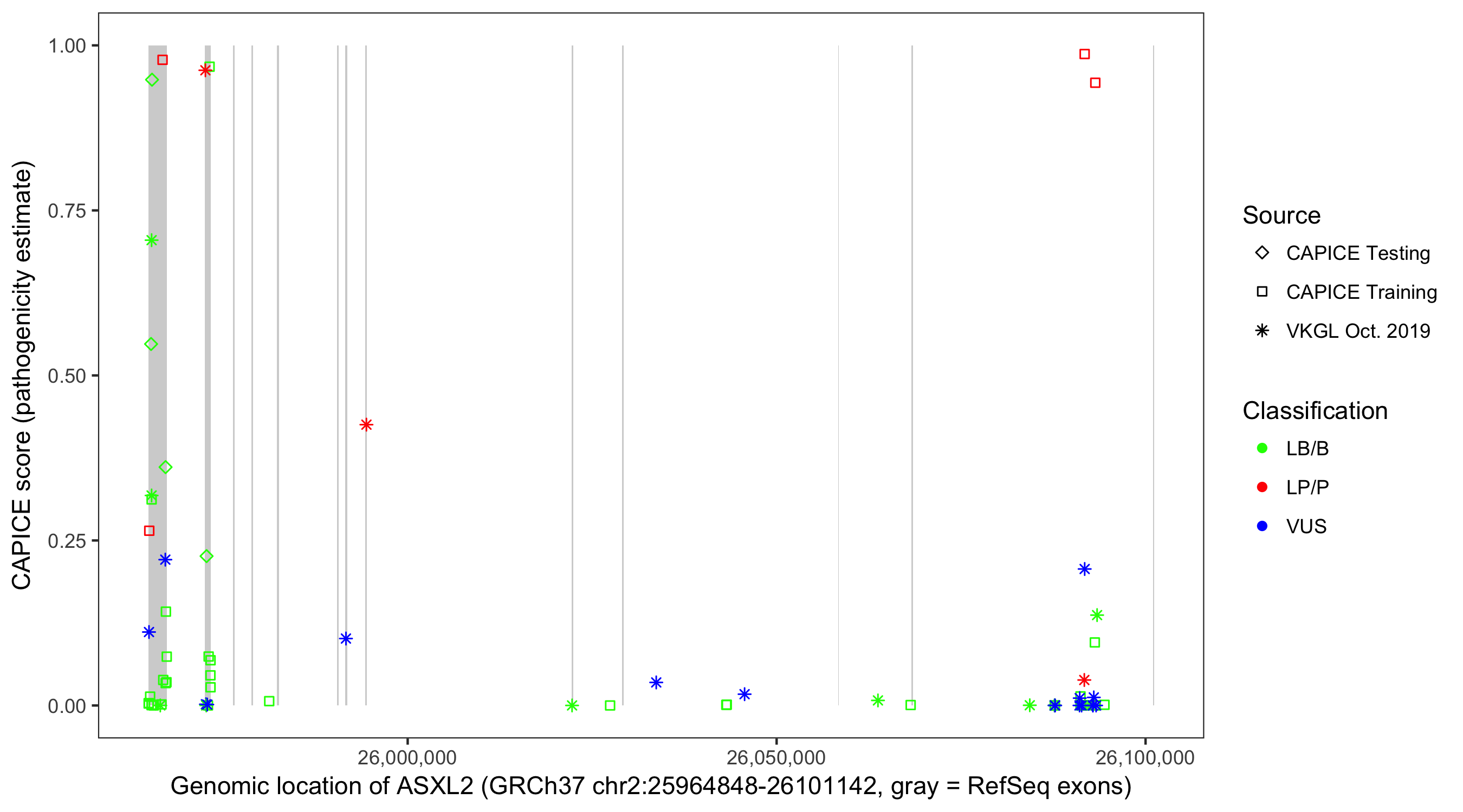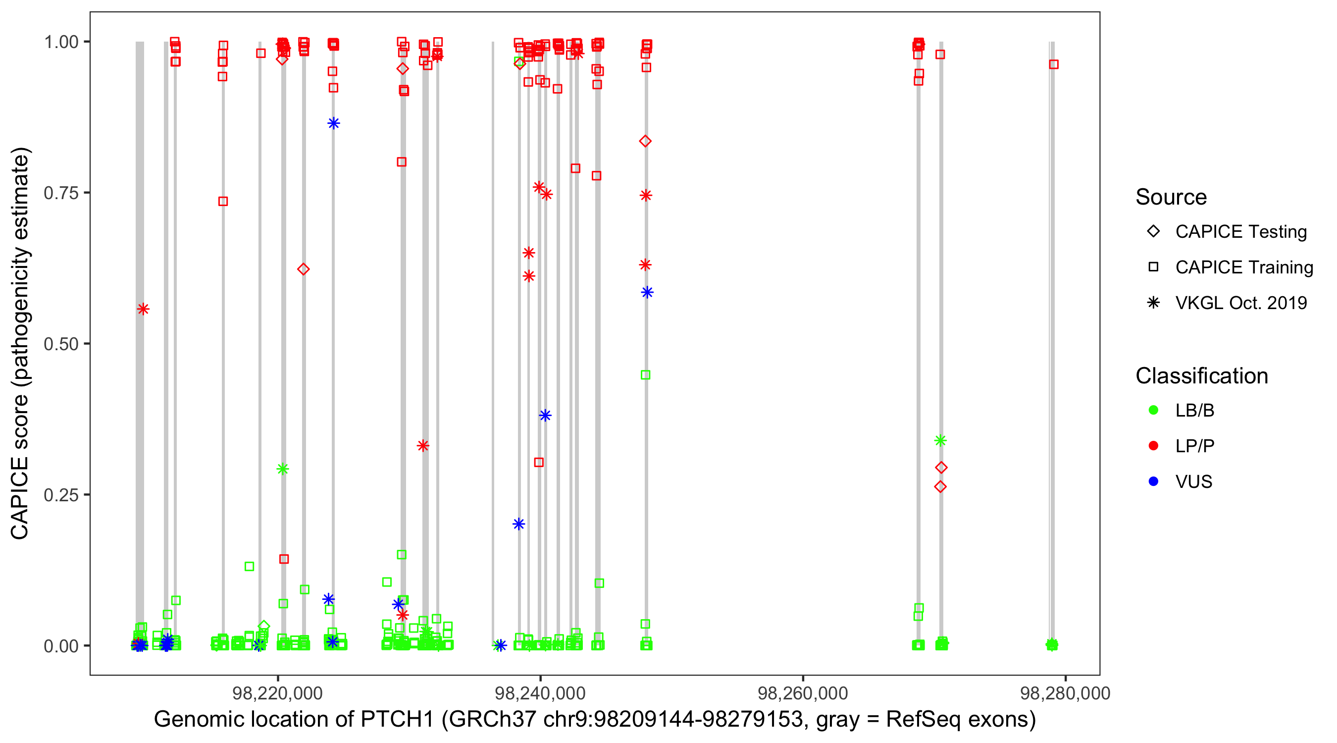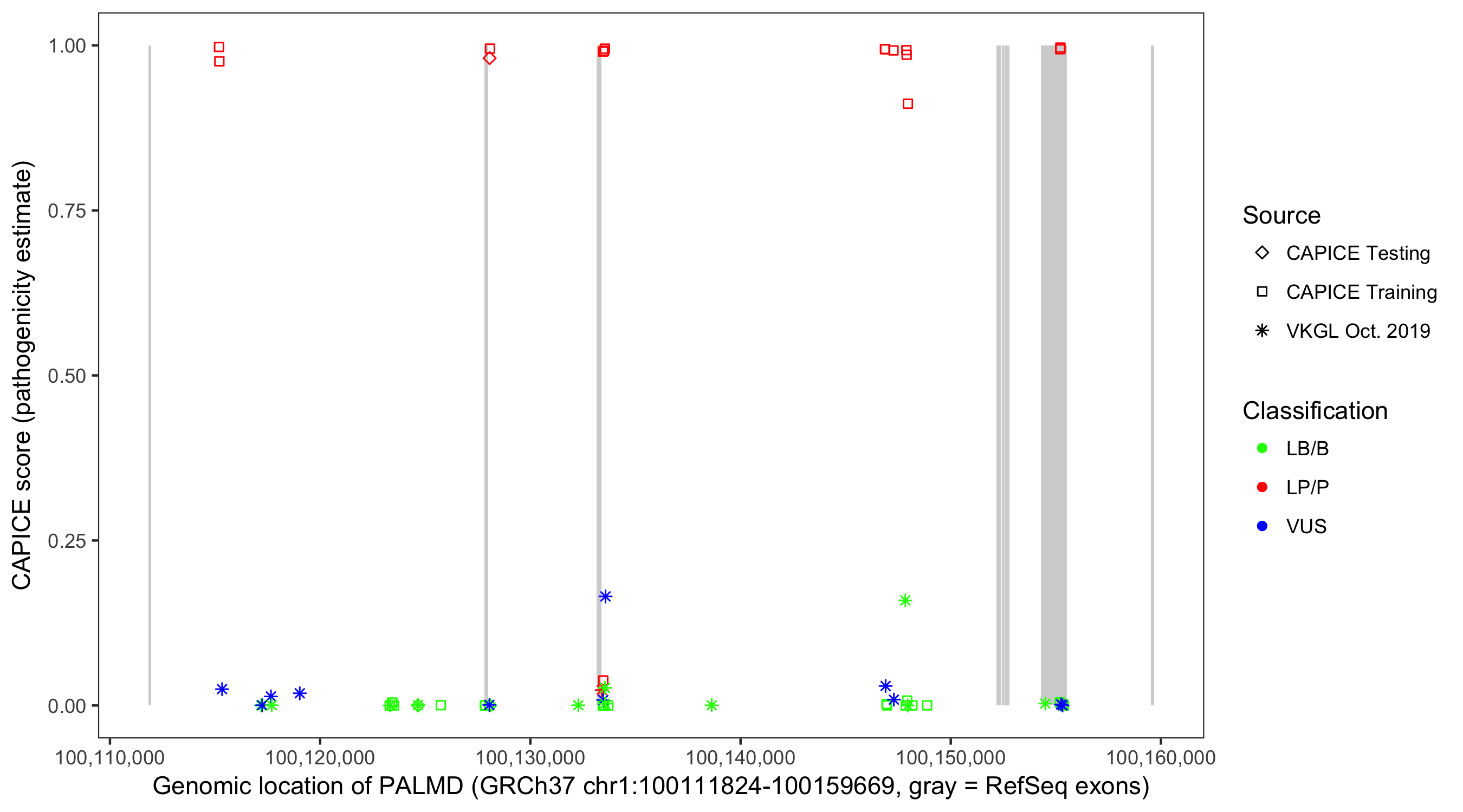 Shown are CAPICE train/test variants plus VKGL Oct 2019.