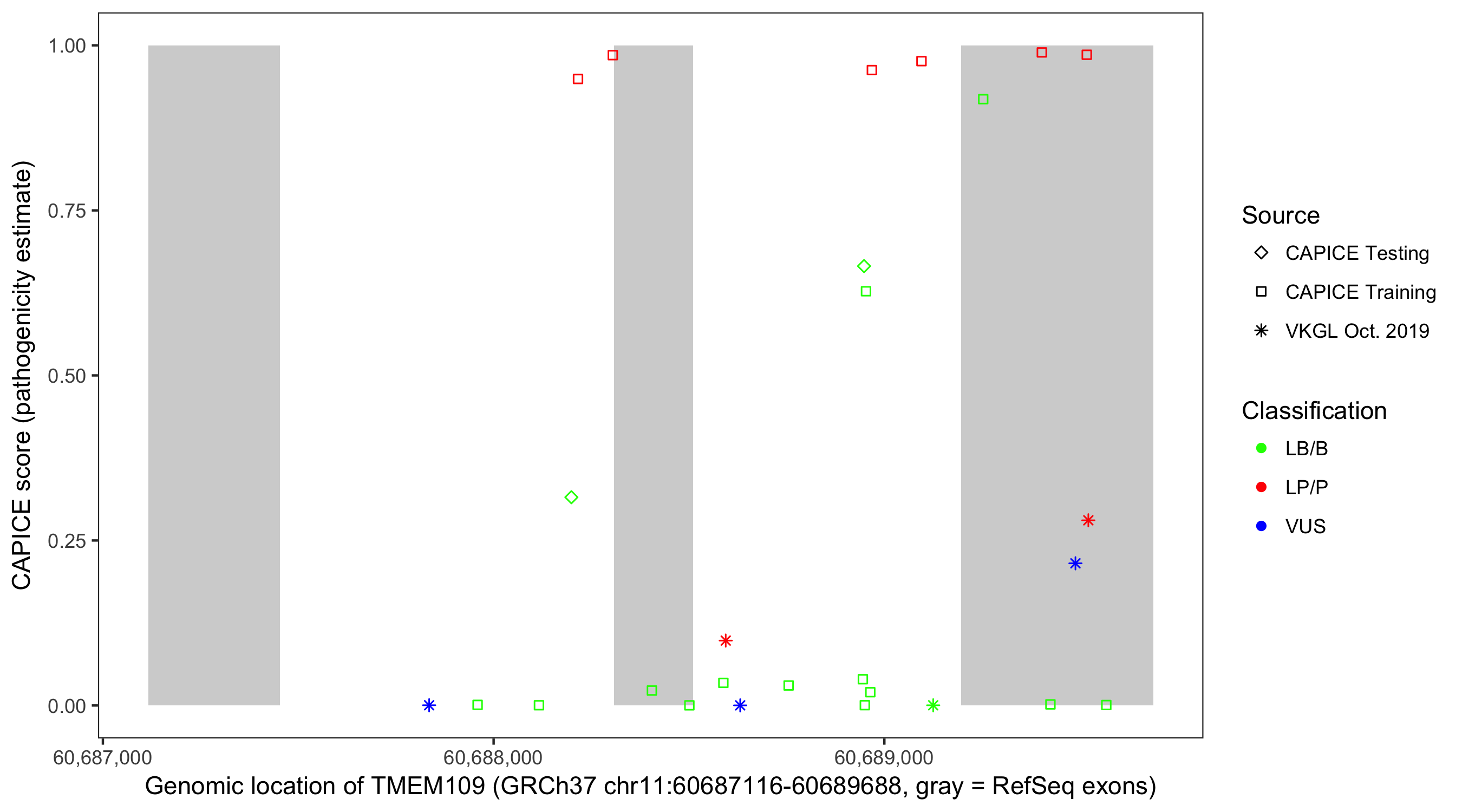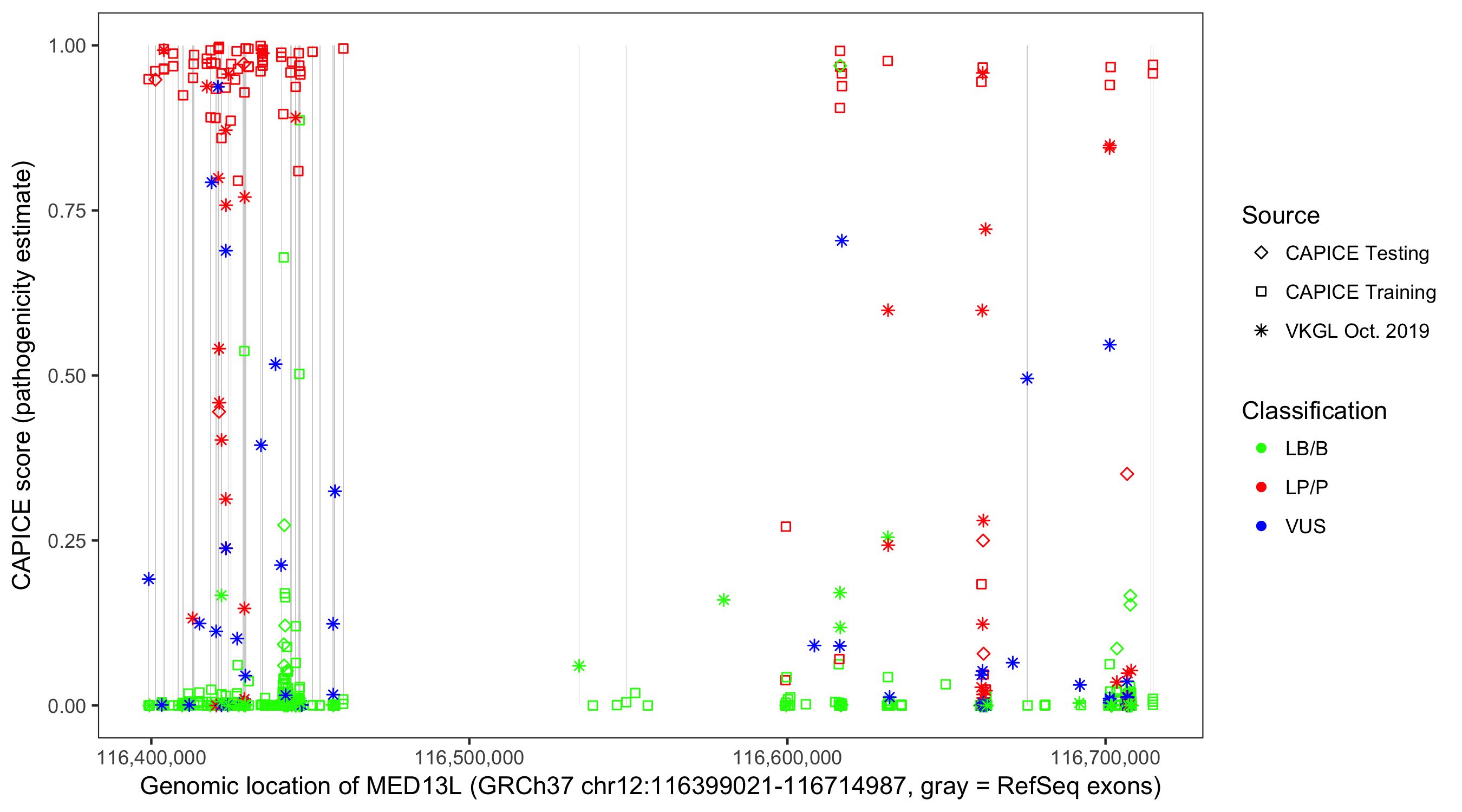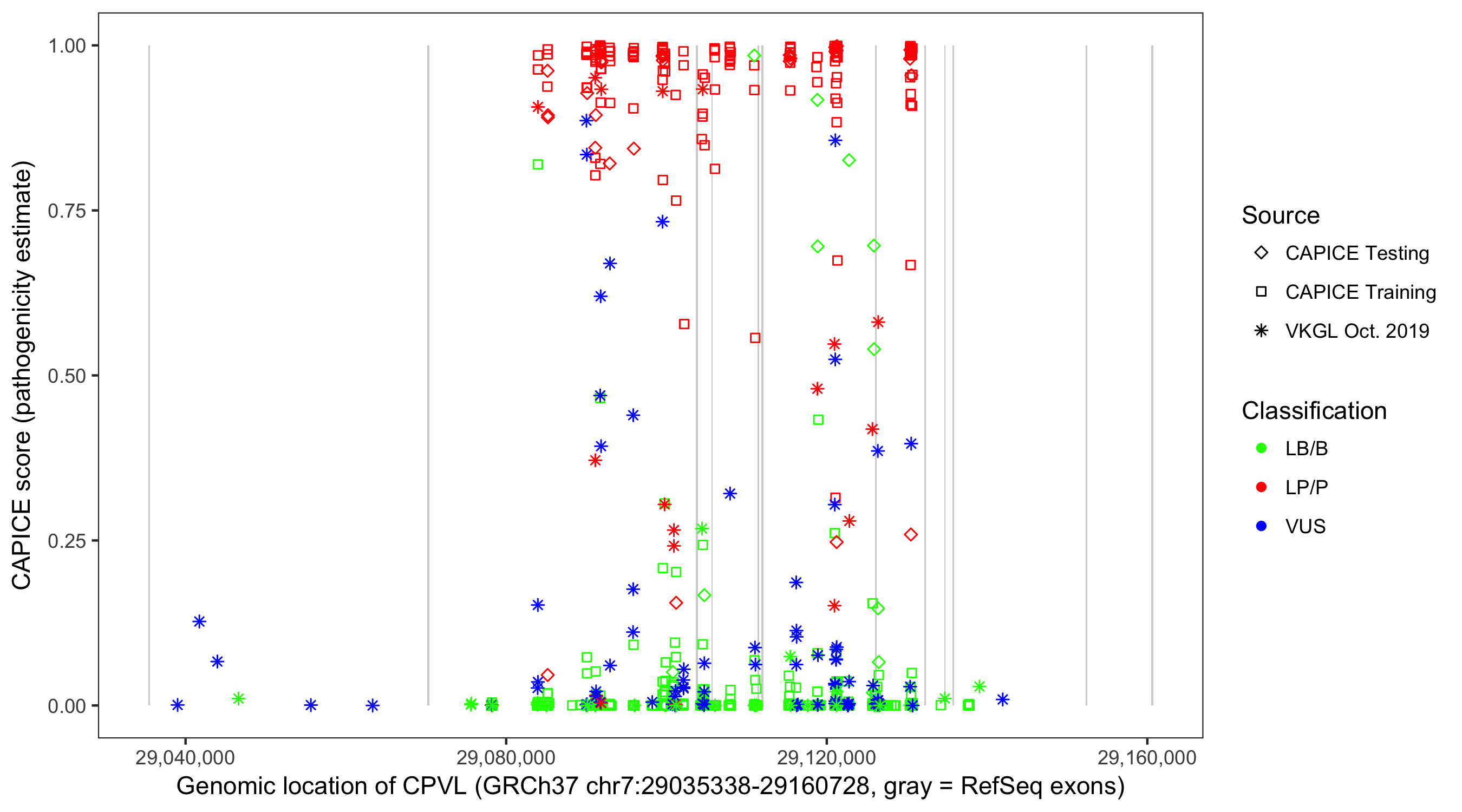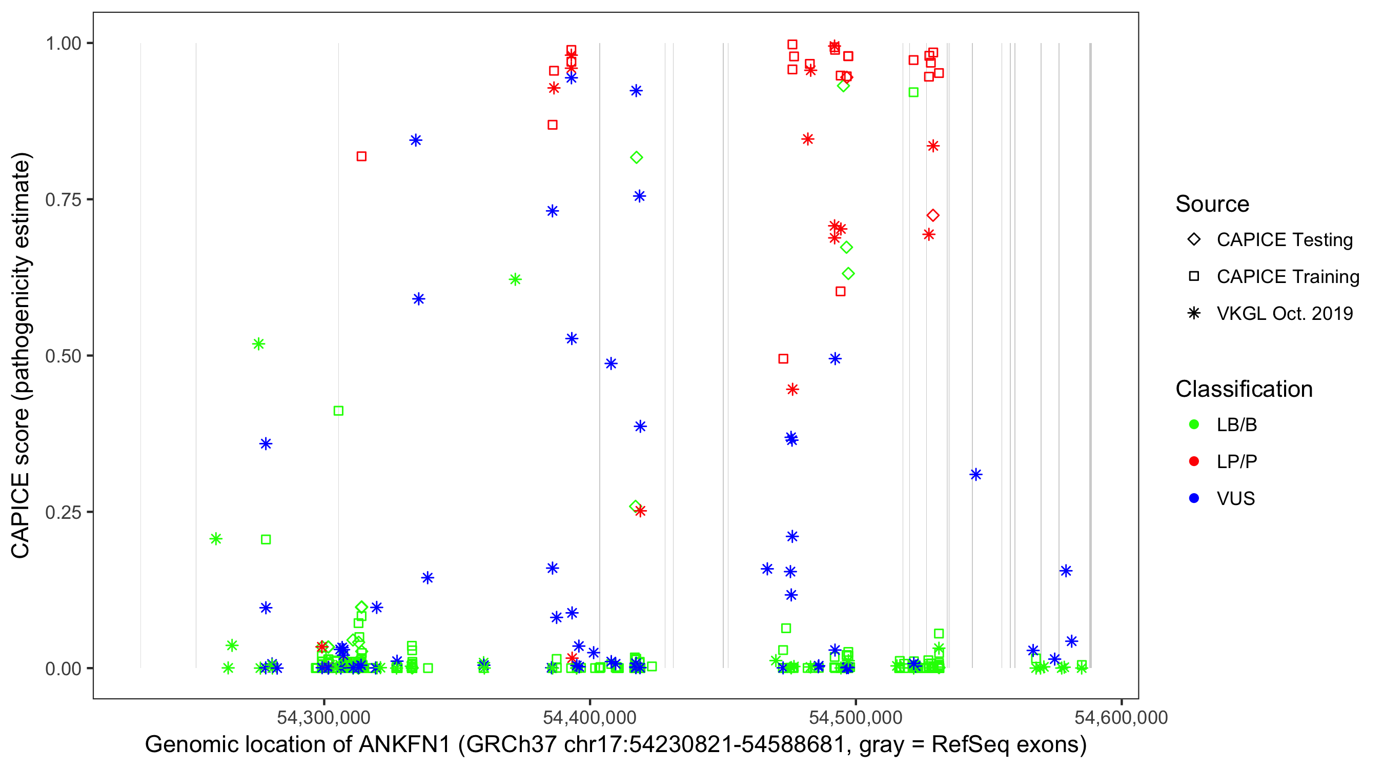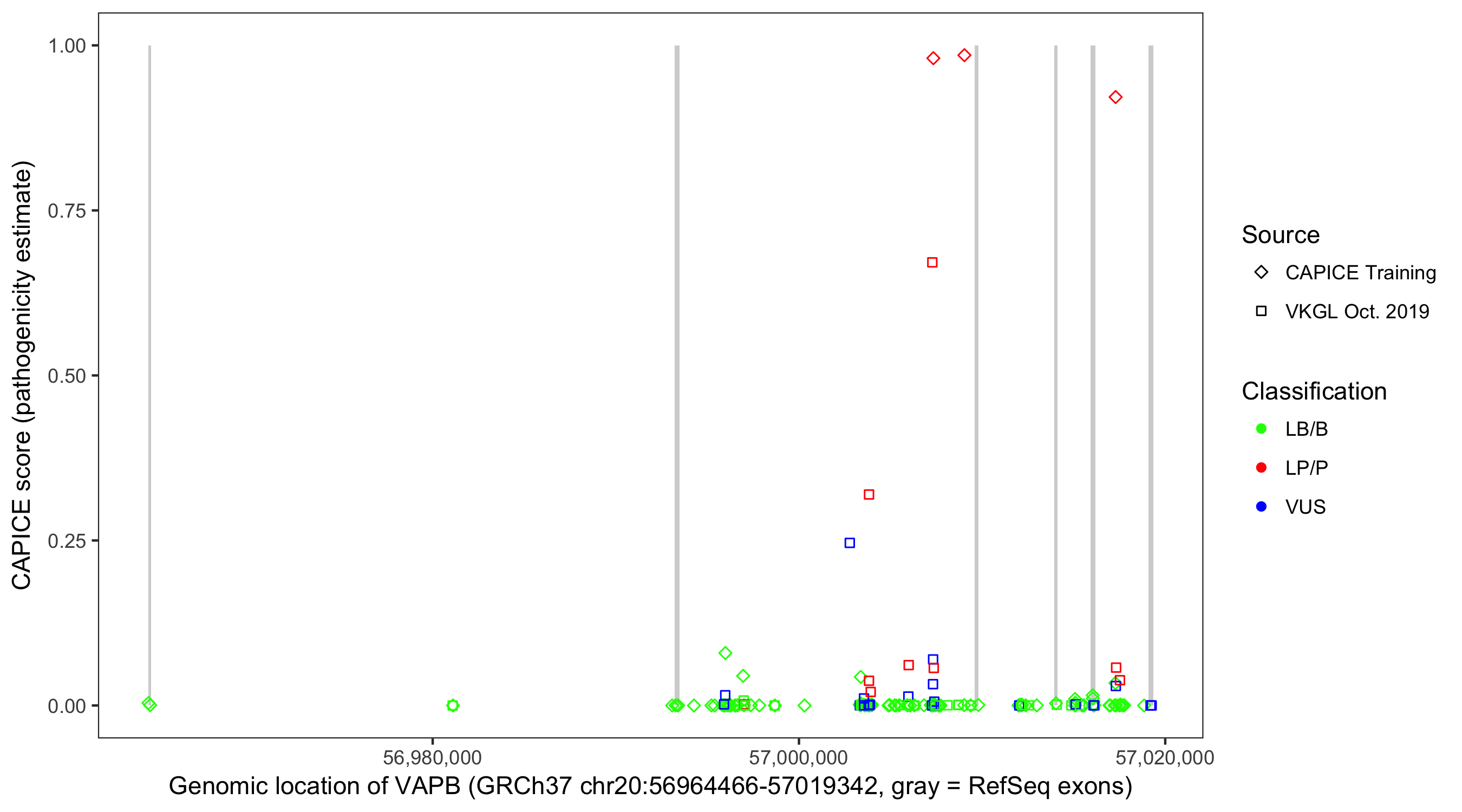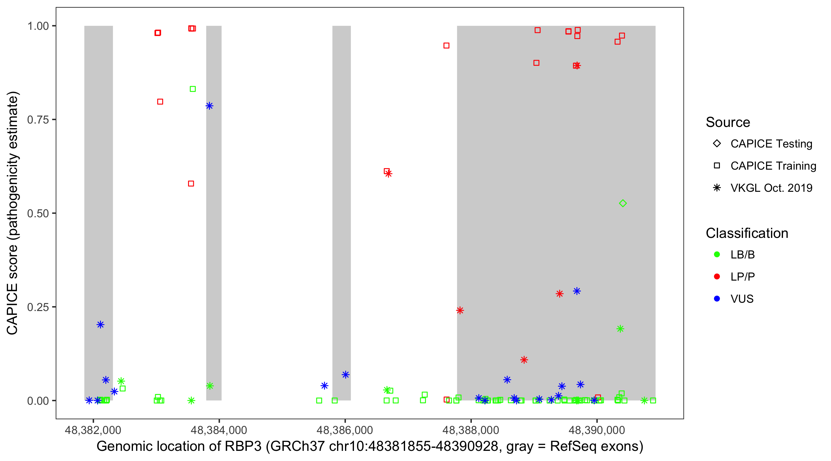 Shown are CAPICE train/test variants plus VKGL Oct 2019.