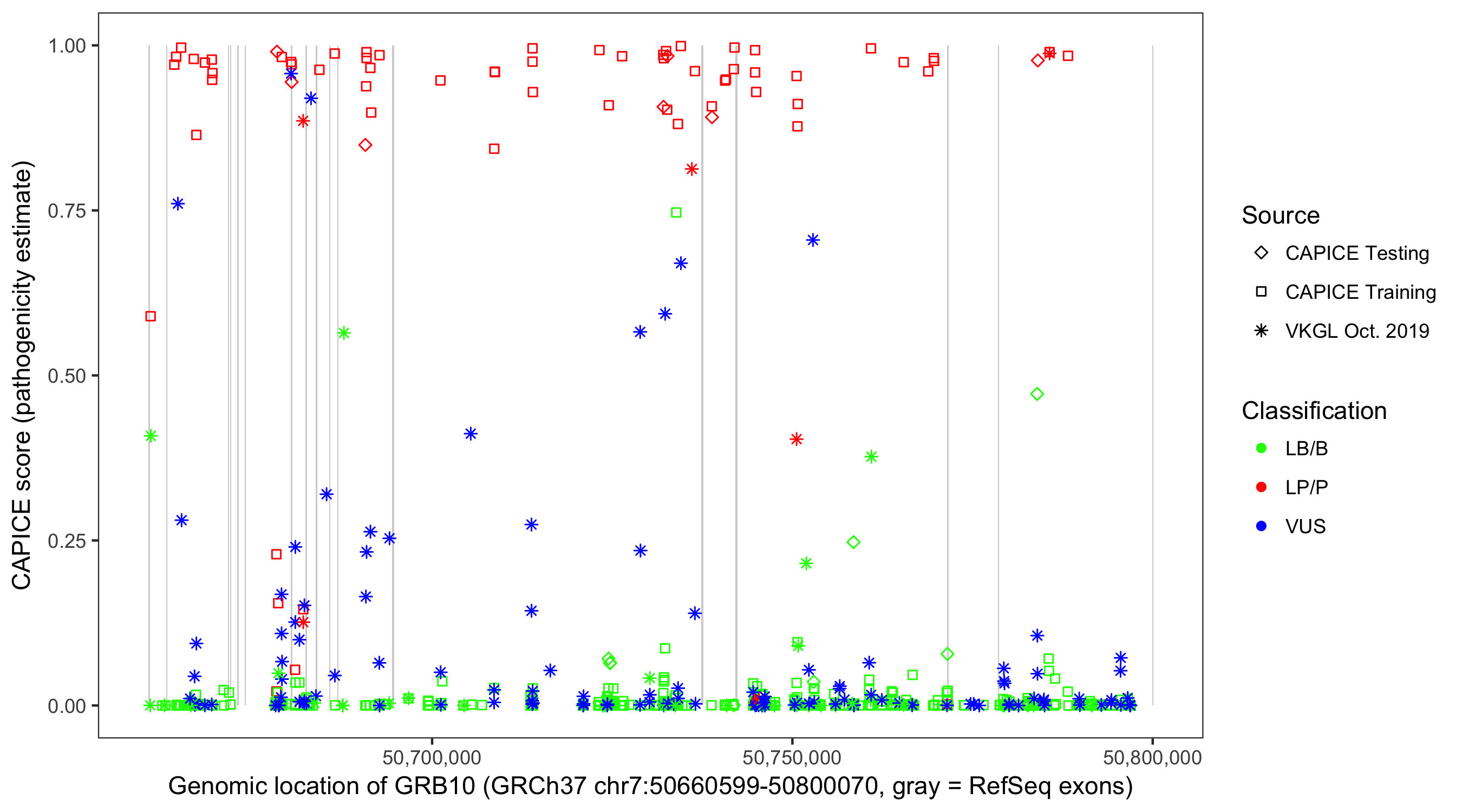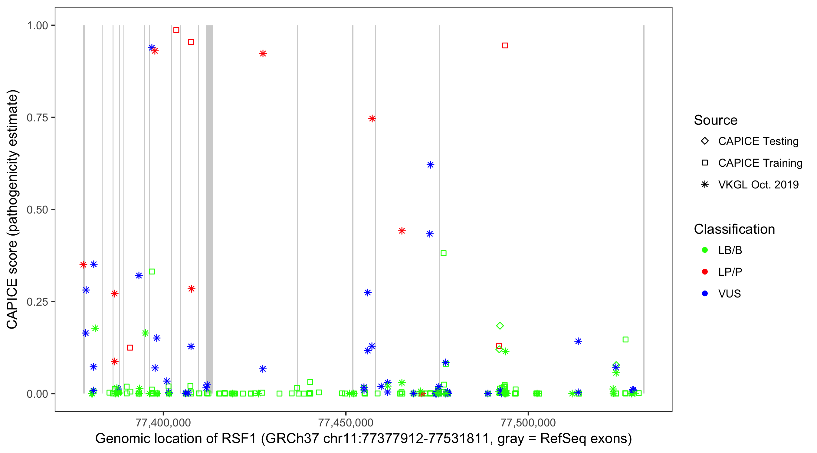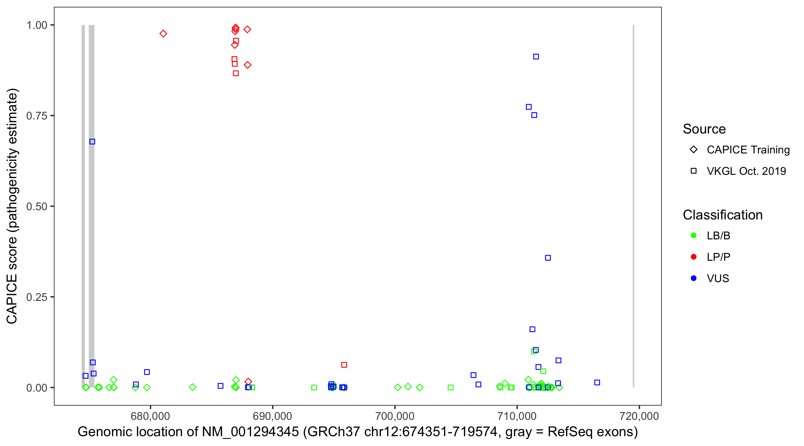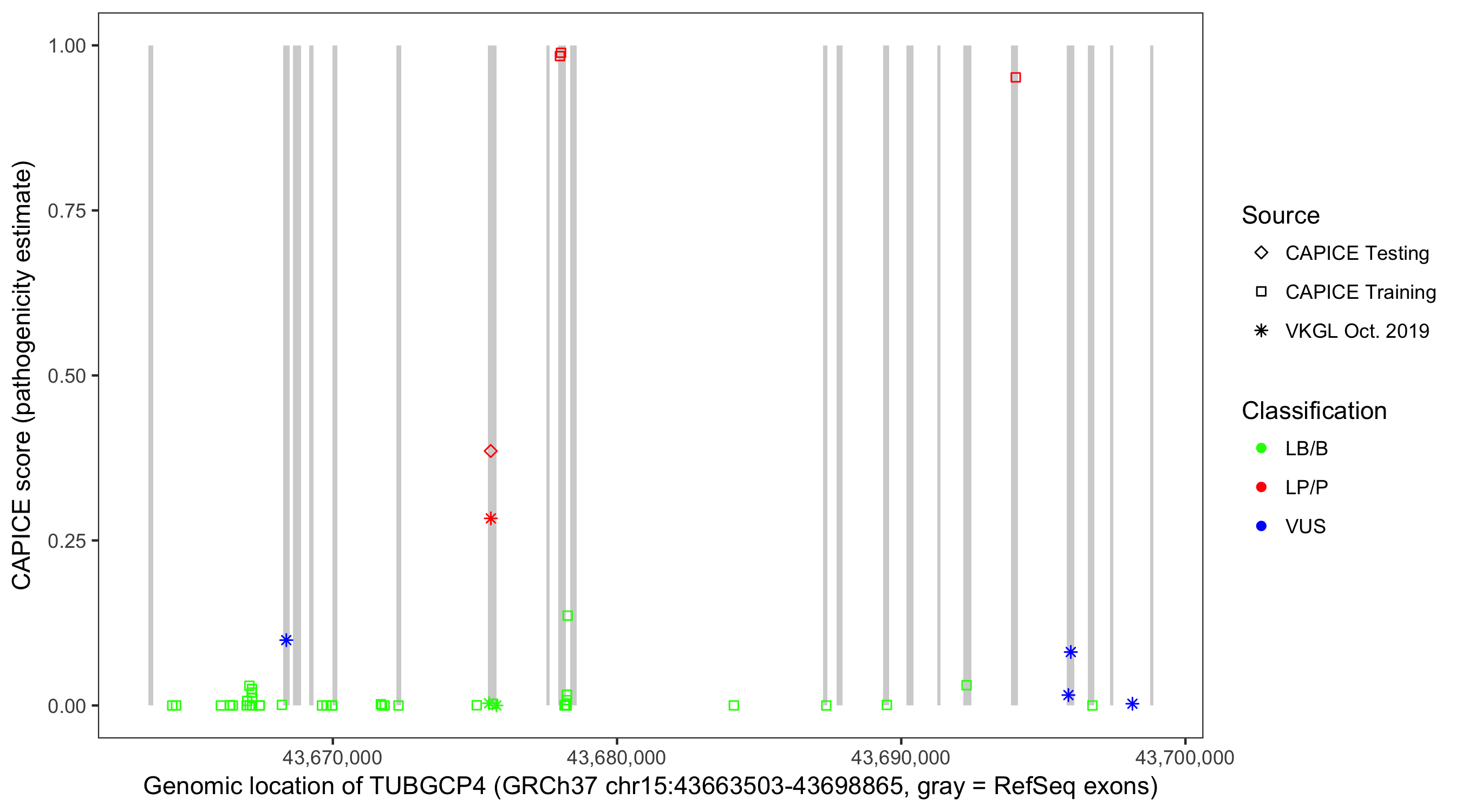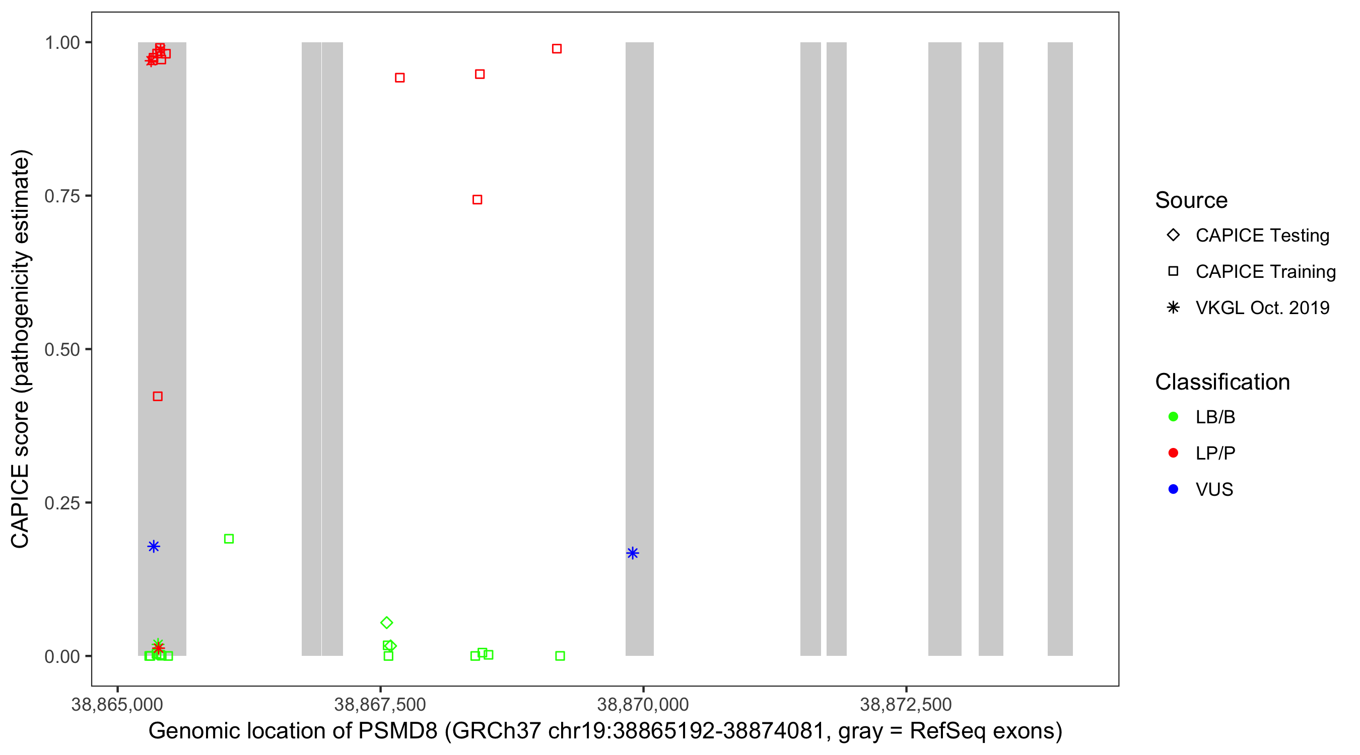 Shown are CAPICE train/test variants plus VKGL Oct 2019.