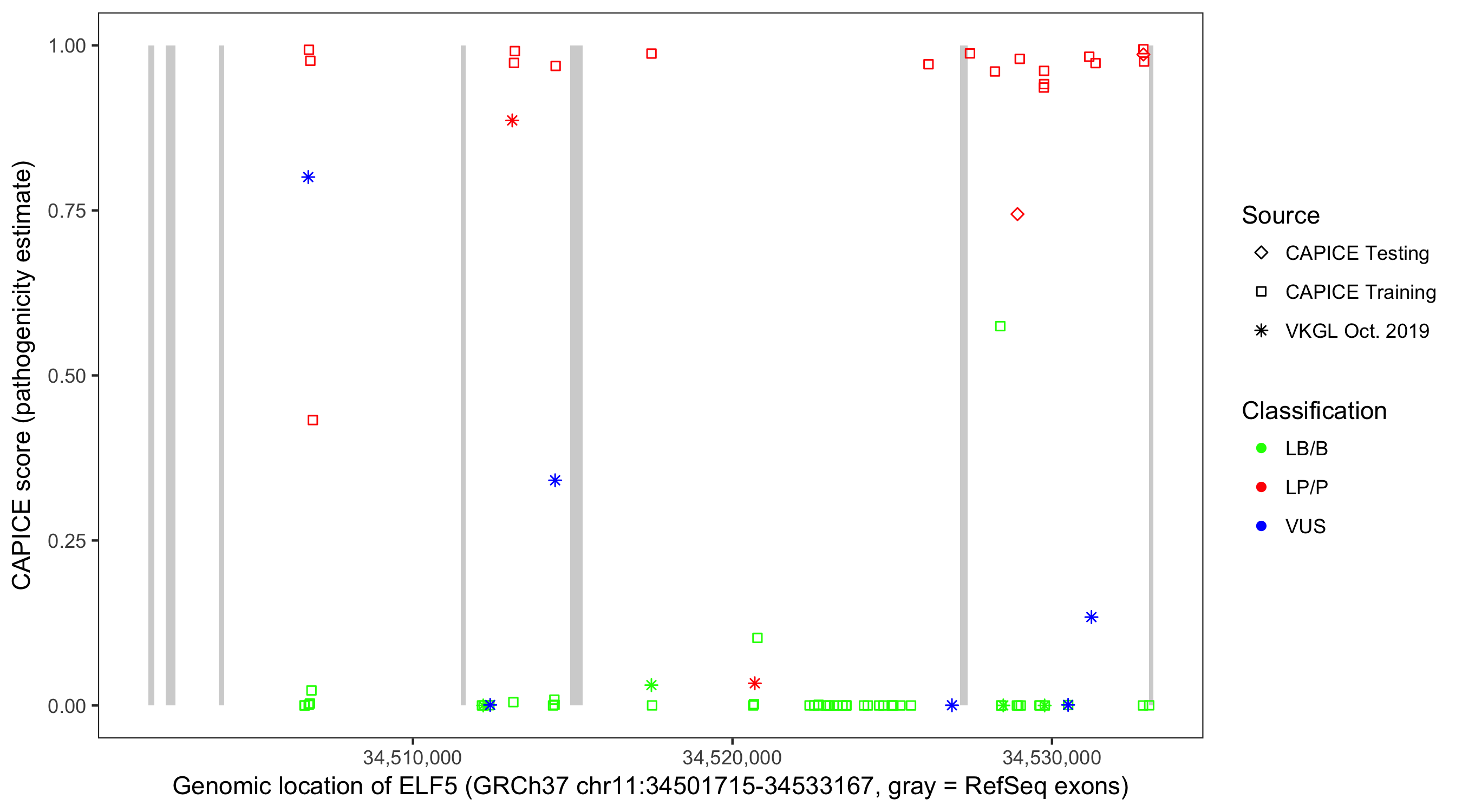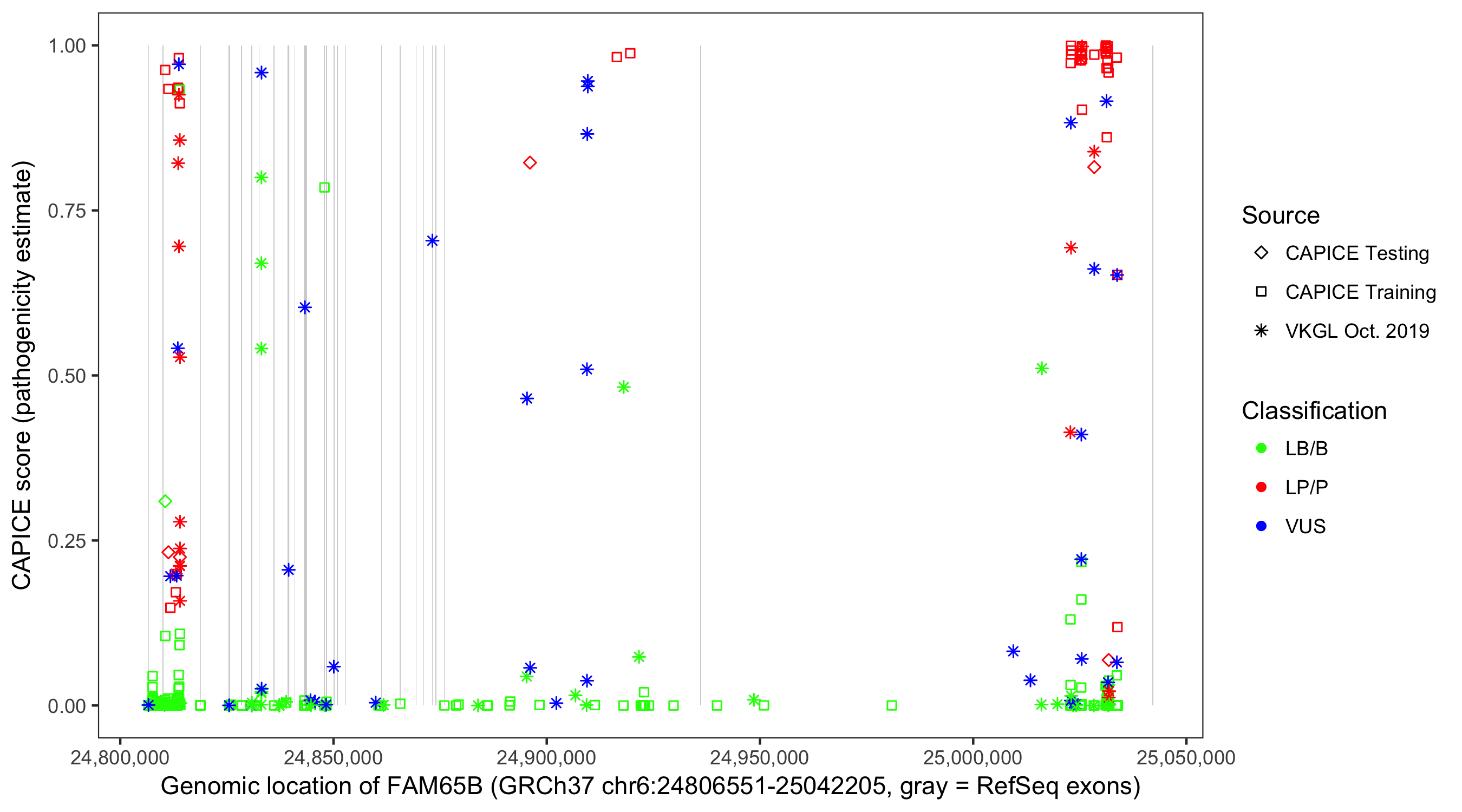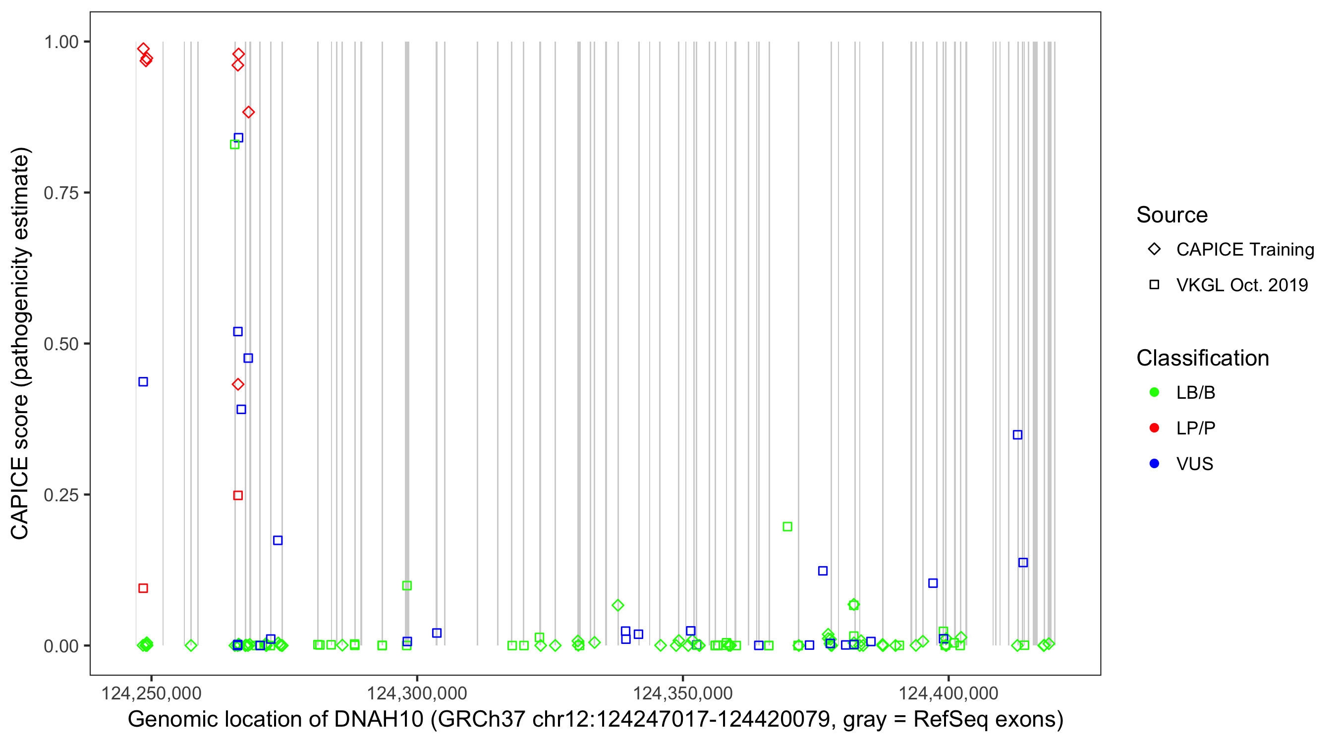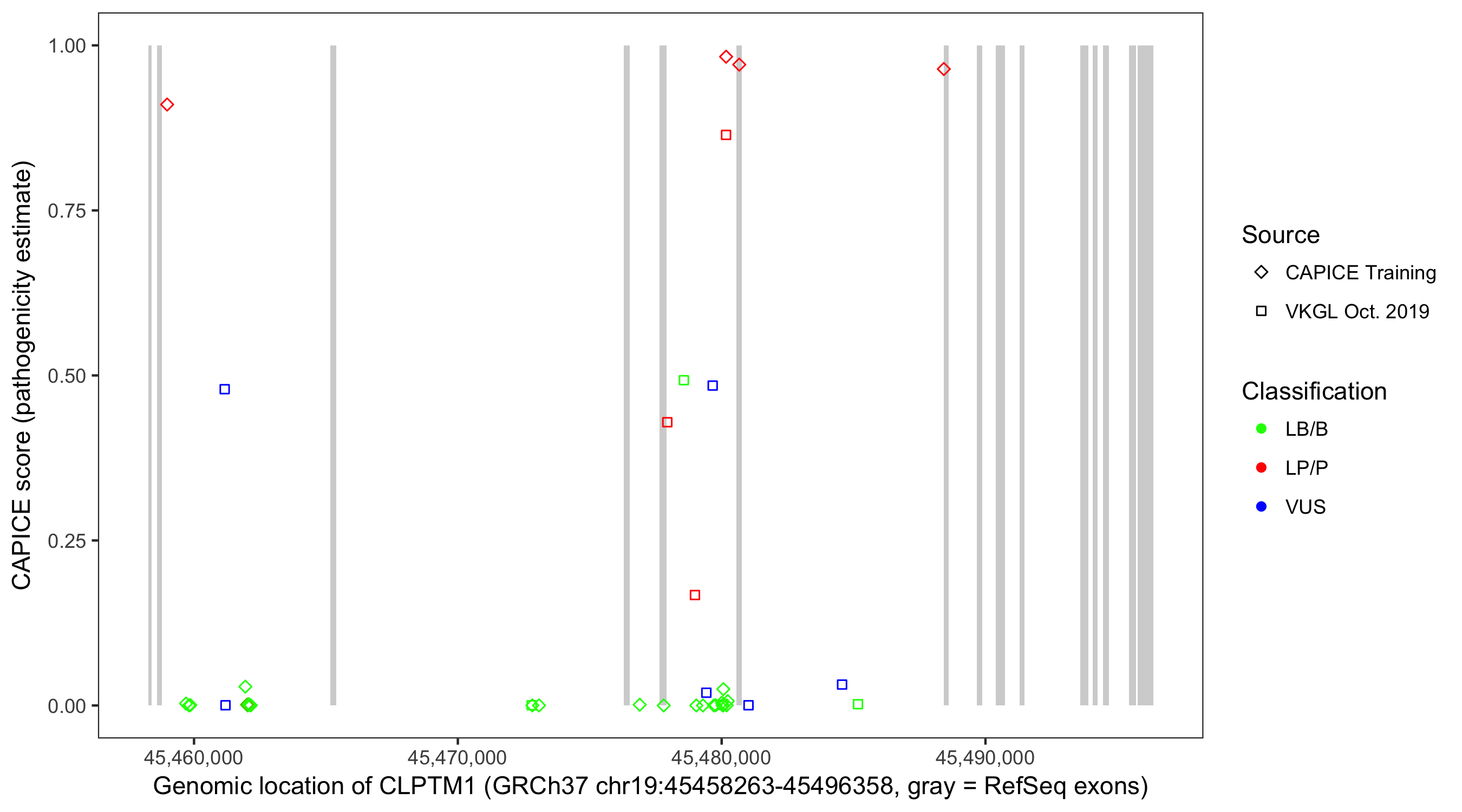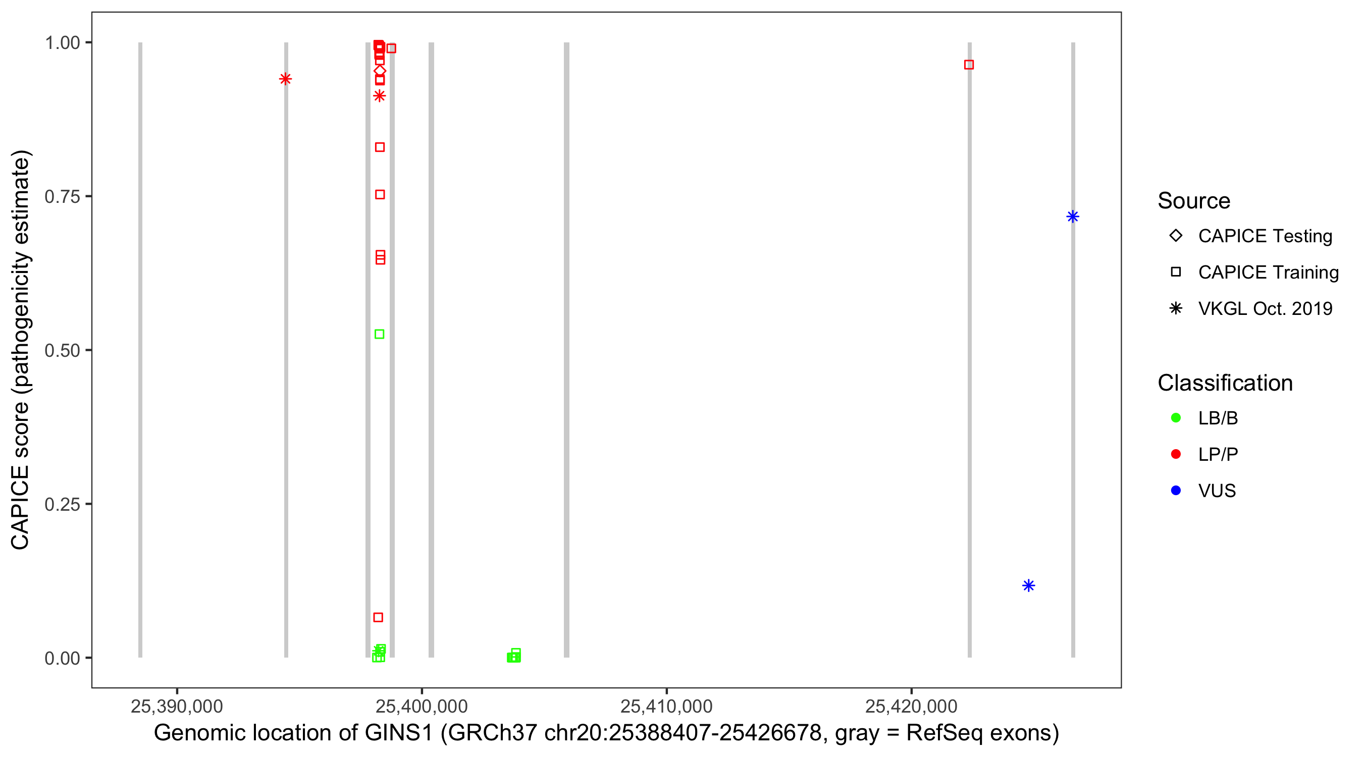 Shown are CAPICE train/test variants plus VKGL Oct 2019.