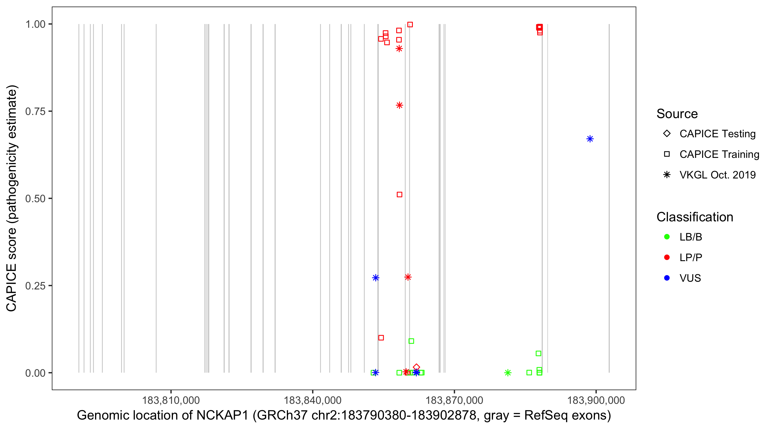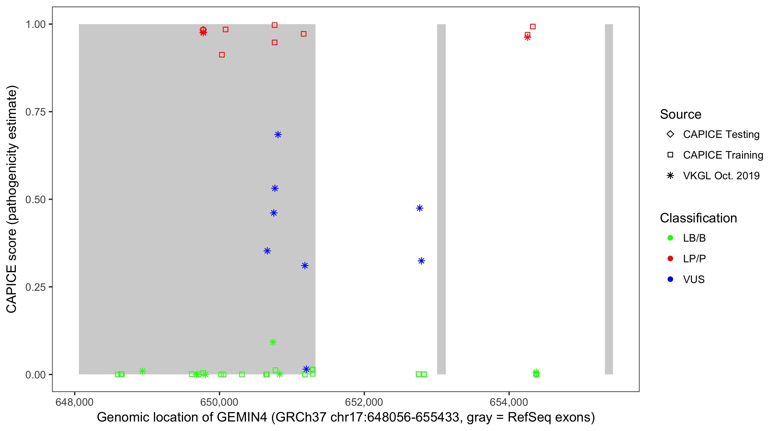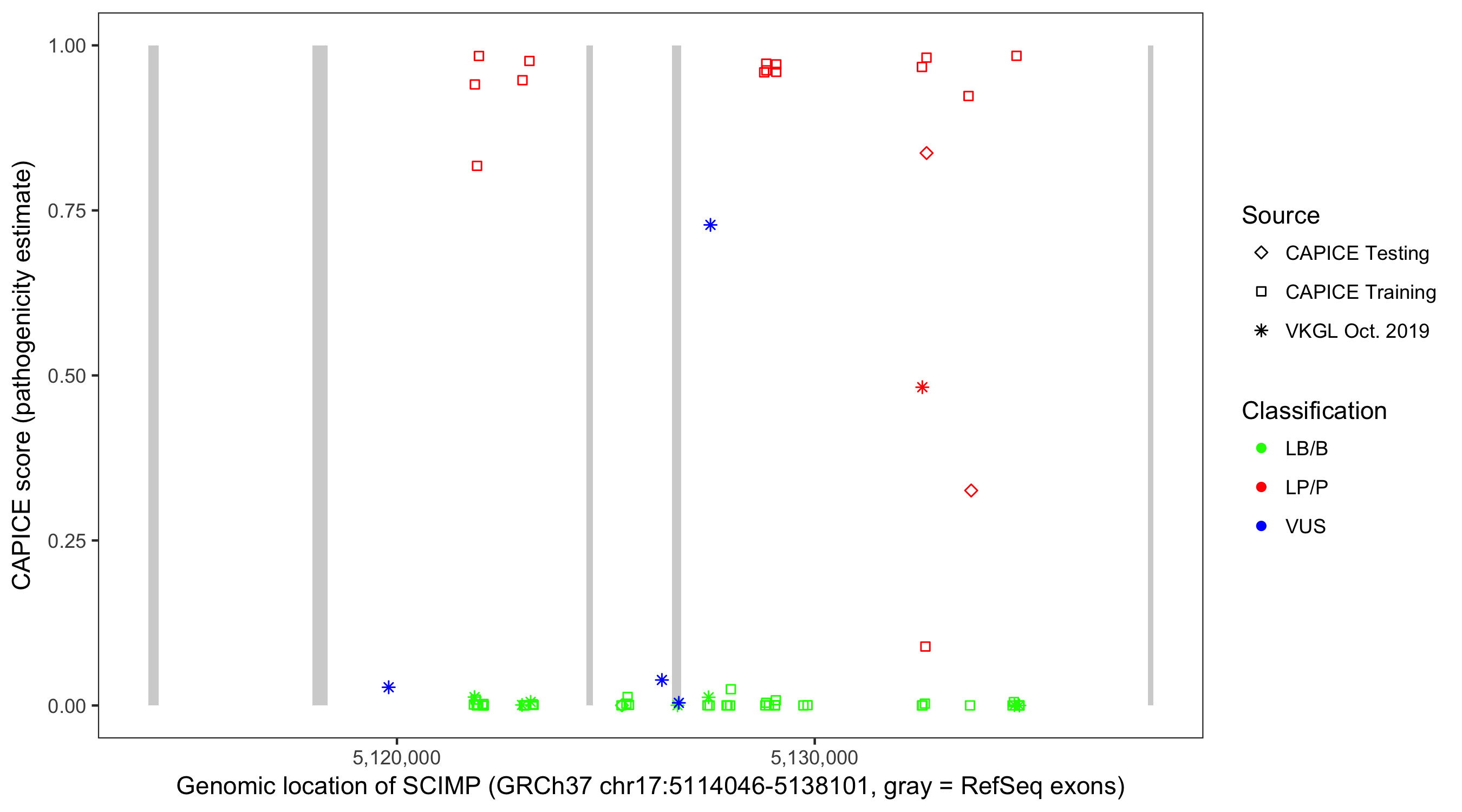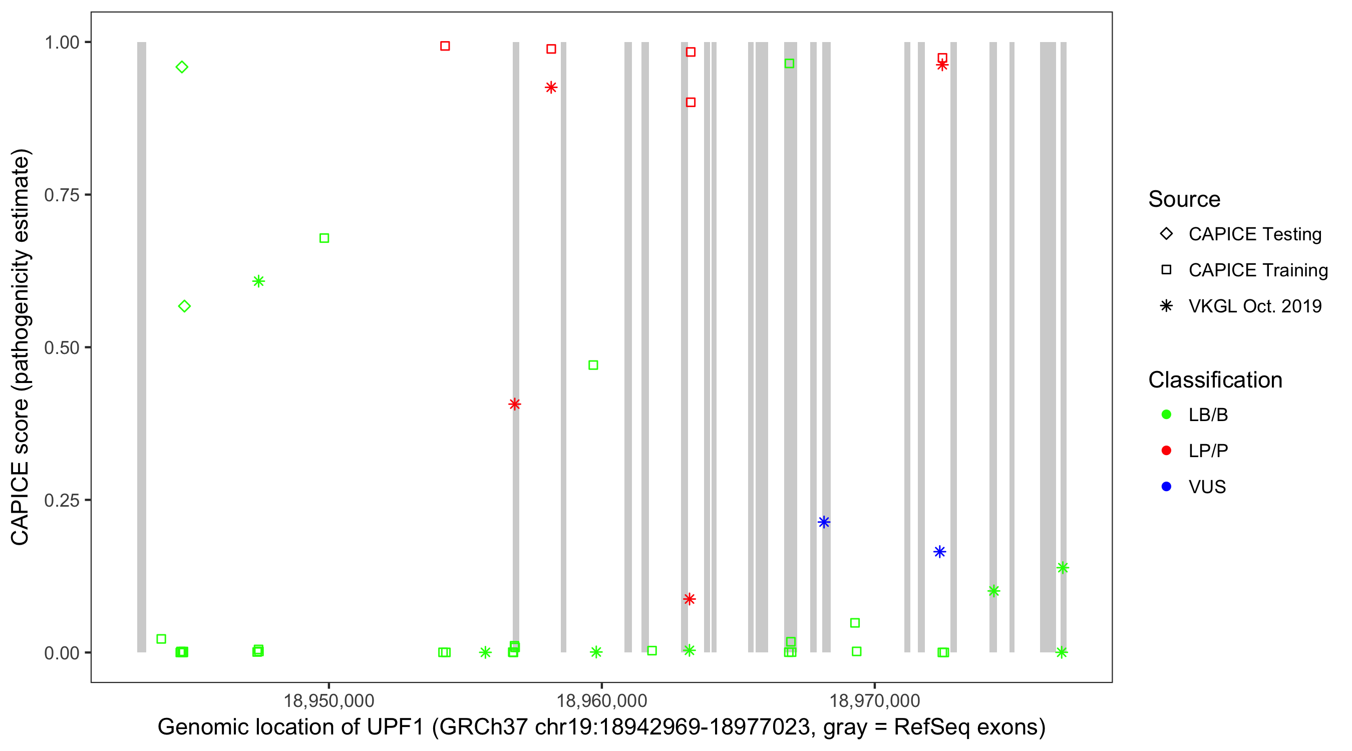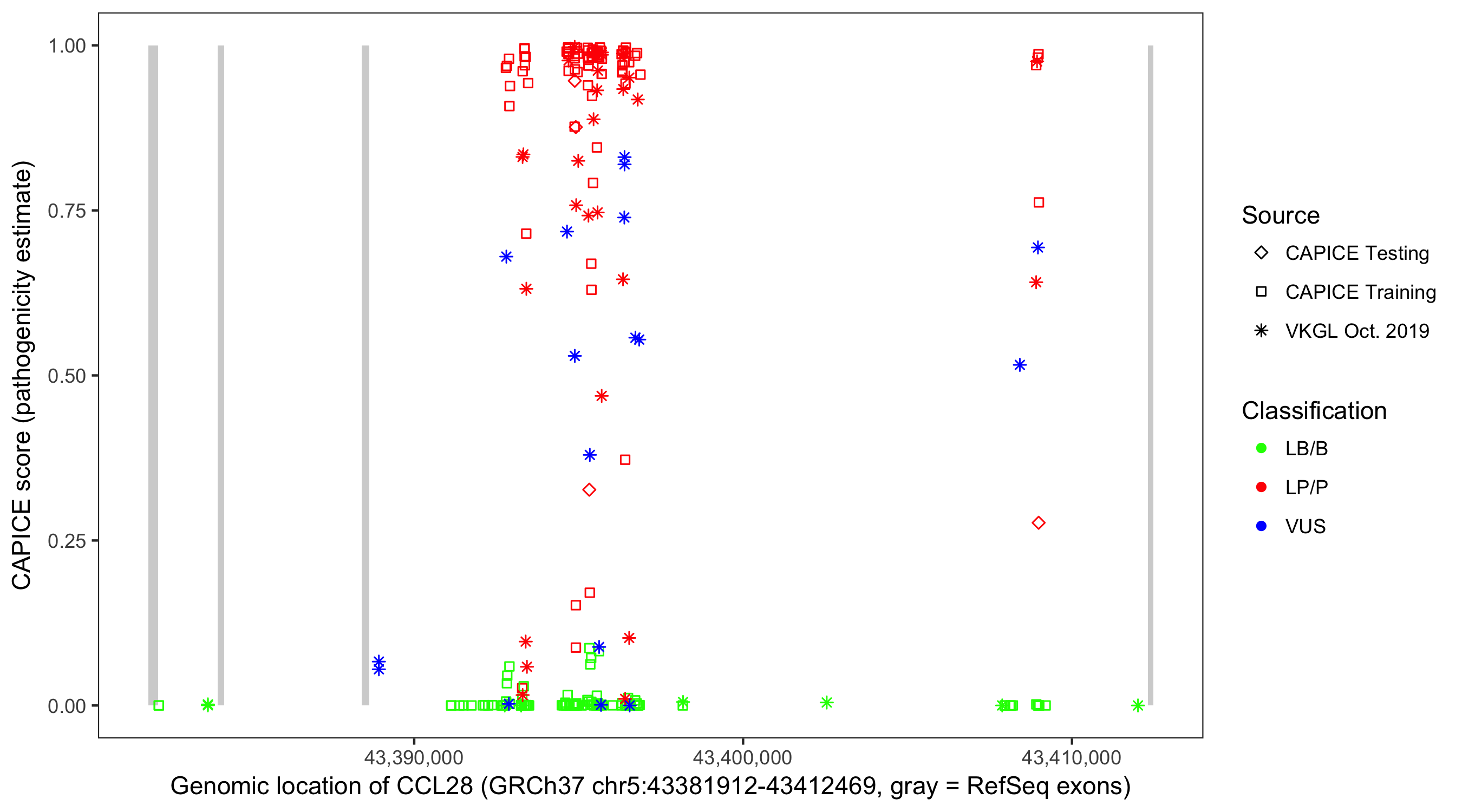 Shown are CAPICE train/test variants plus VKGL Oct 2019.