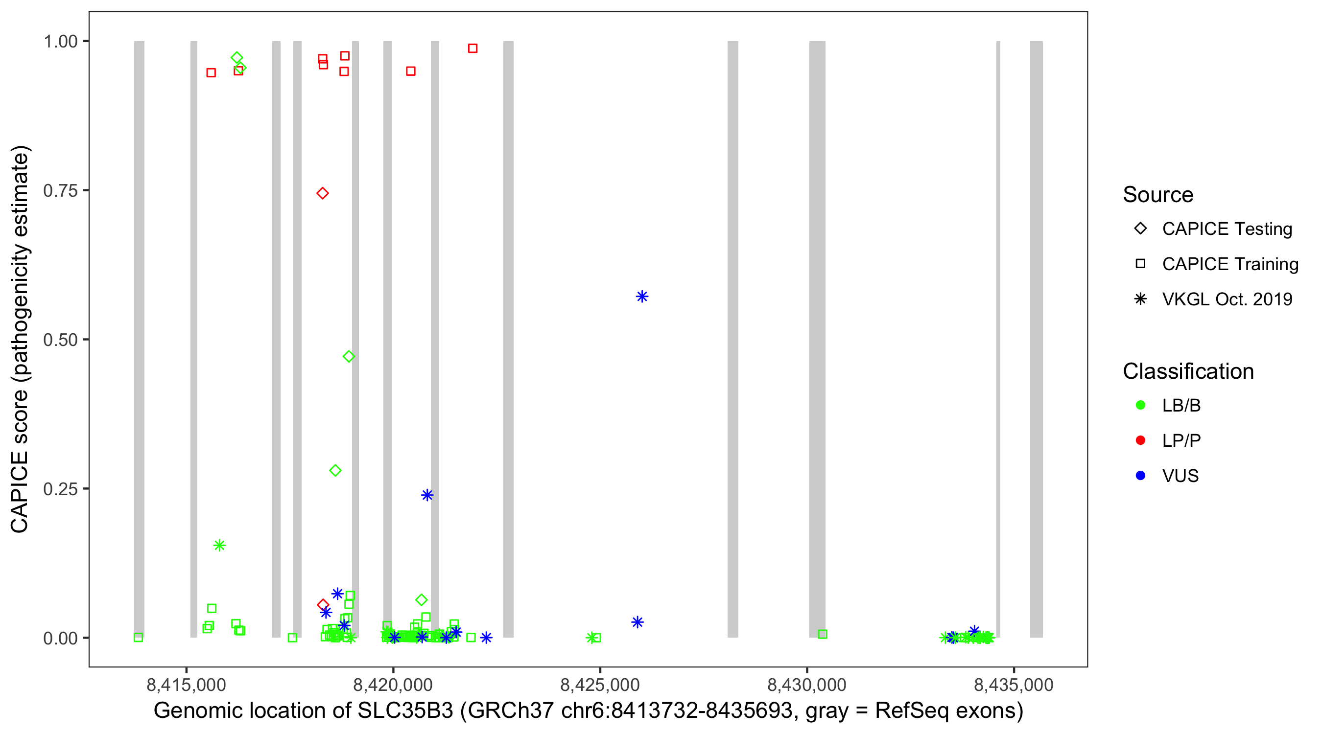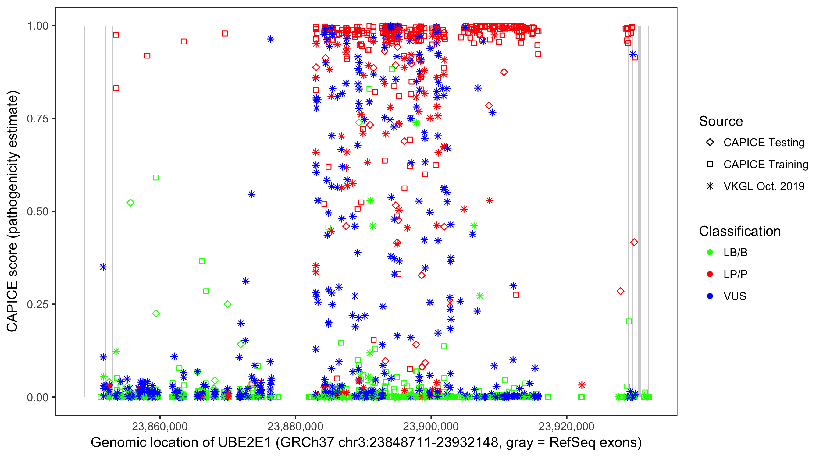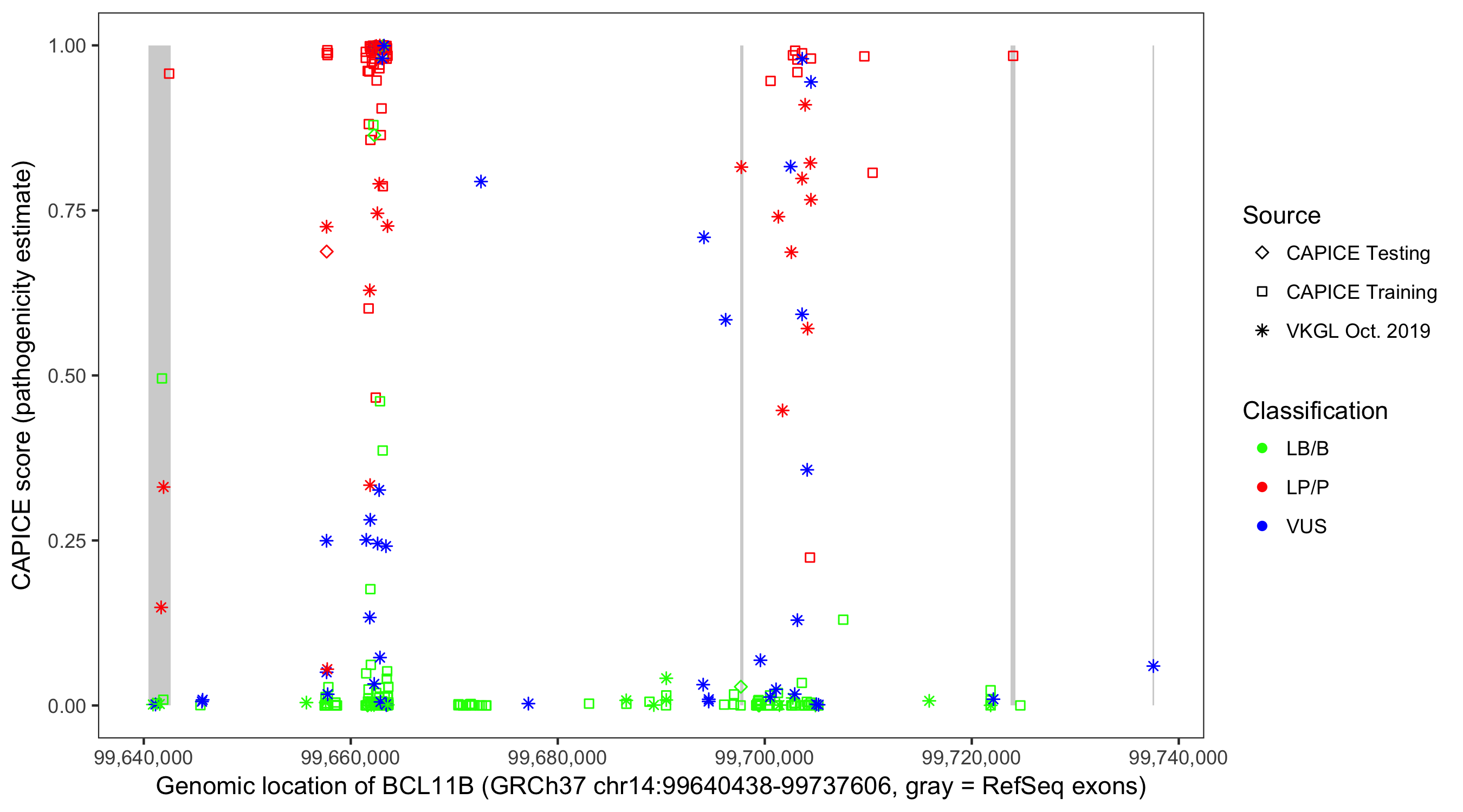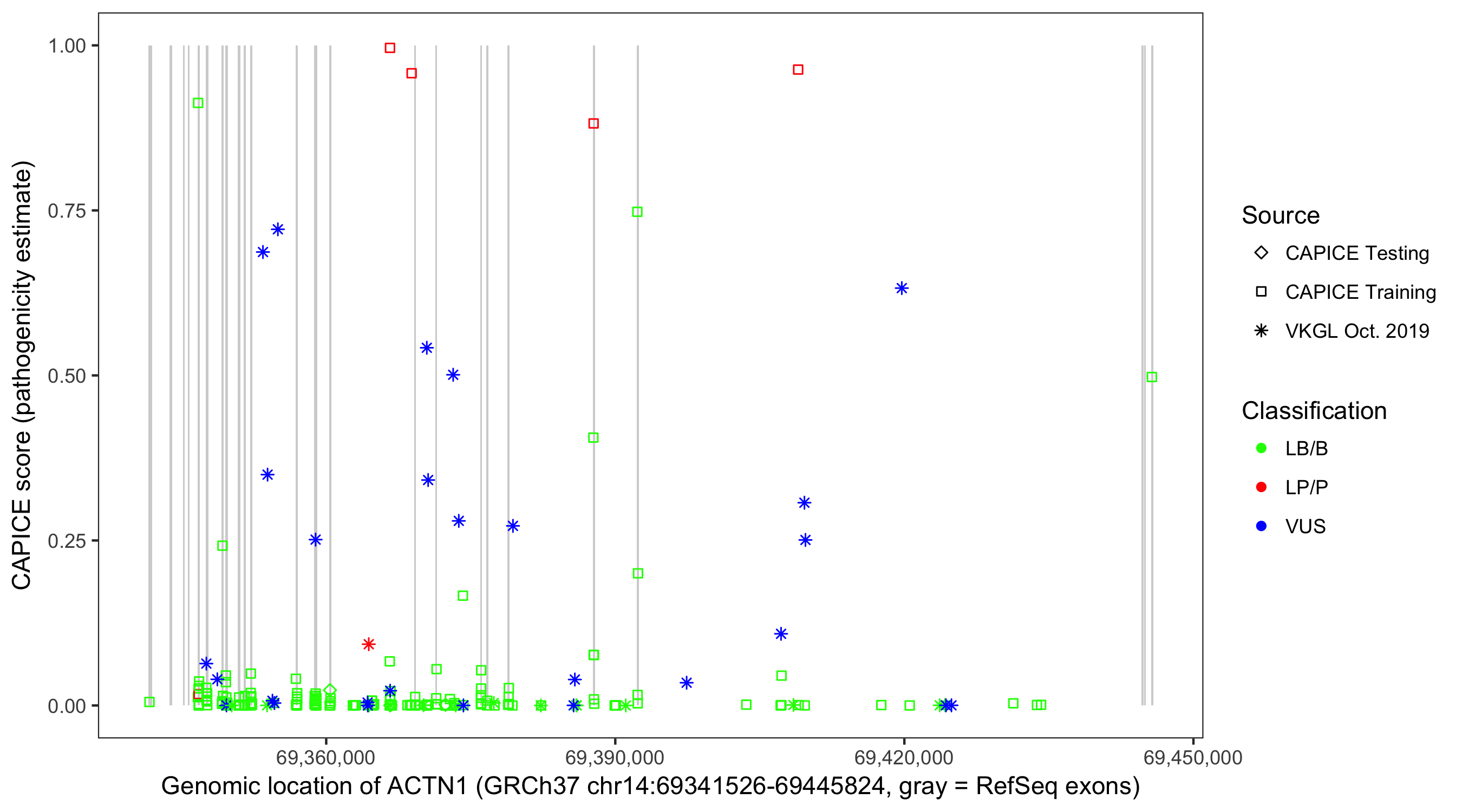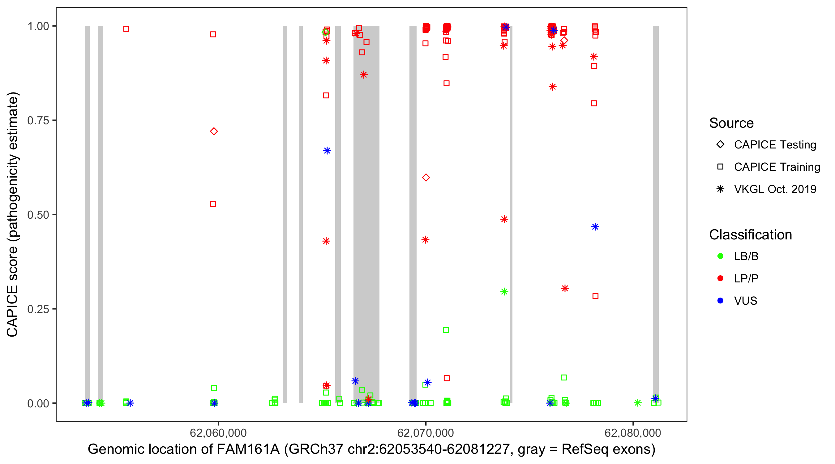 Shown are CAPICE train/test variants plus VKGL Oct 2019.