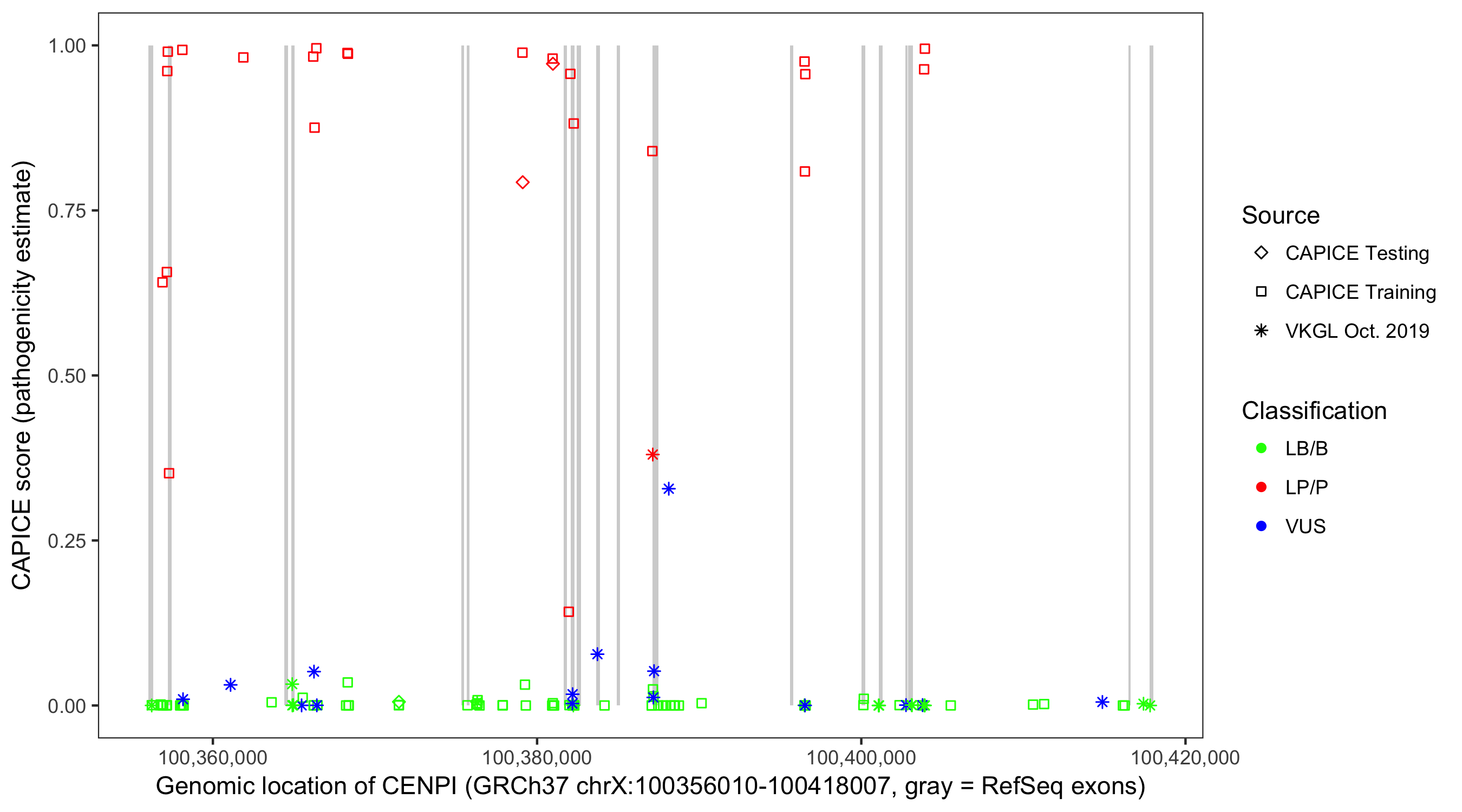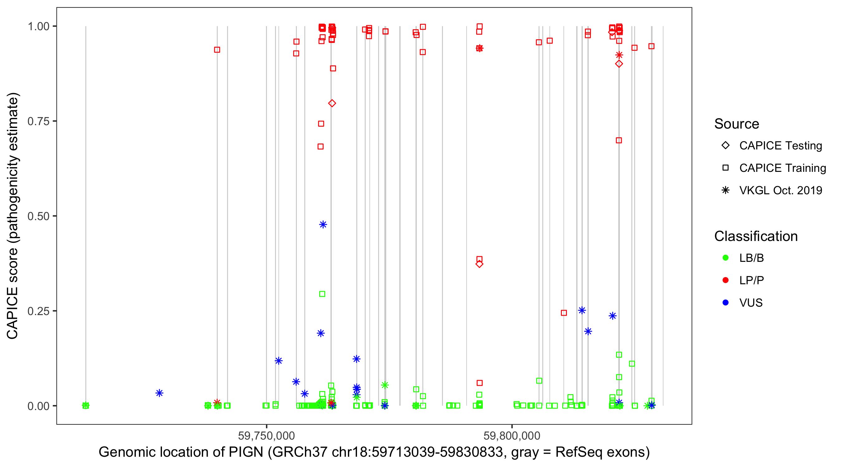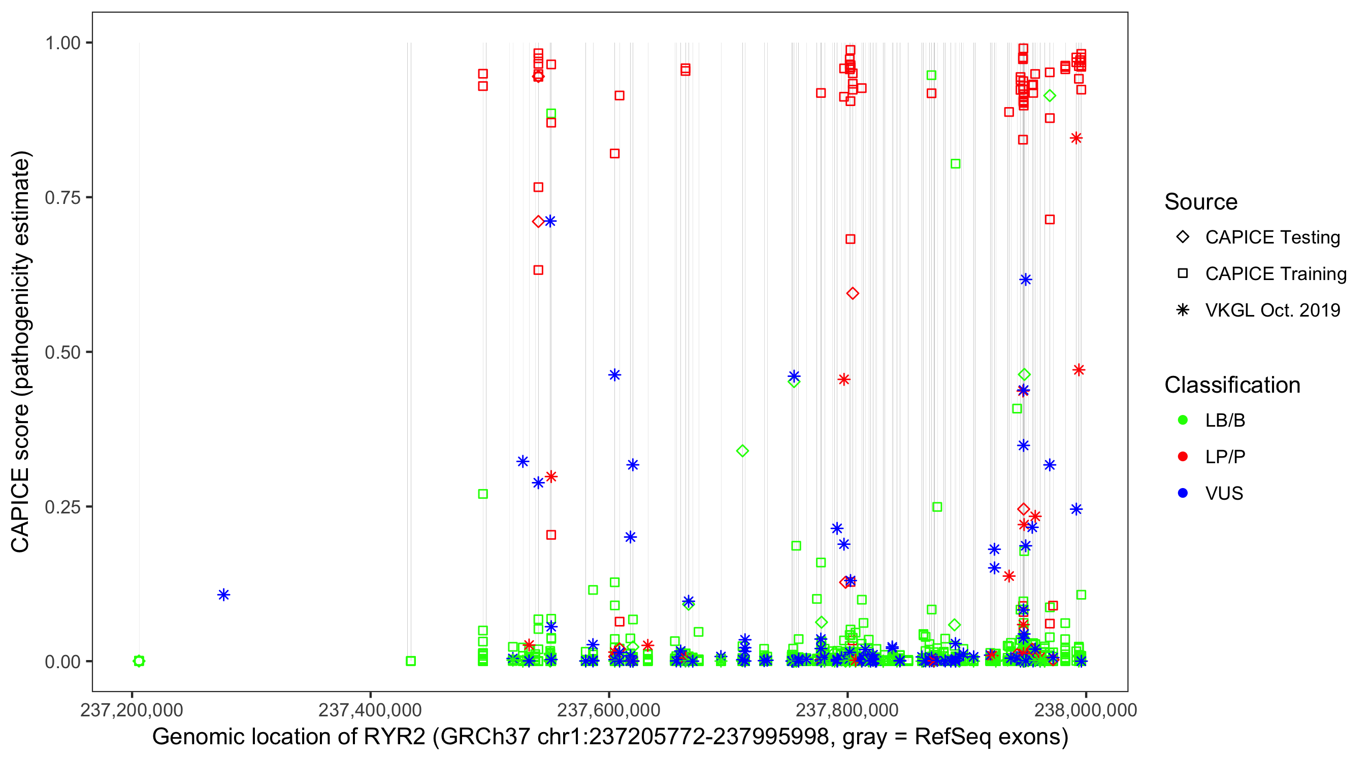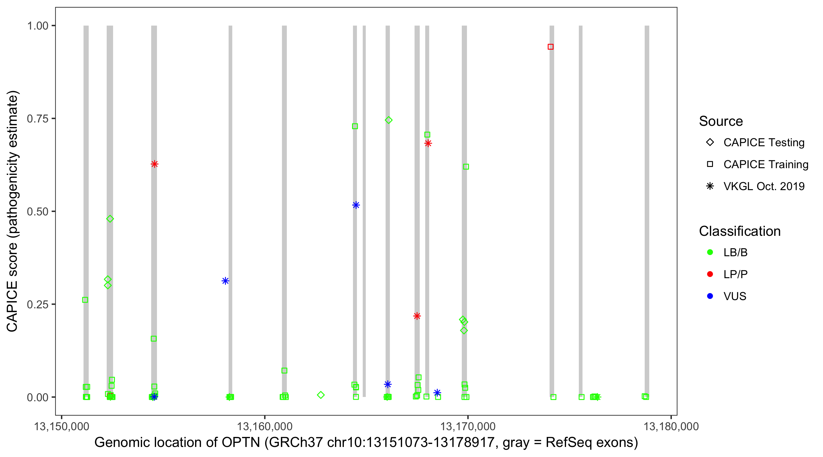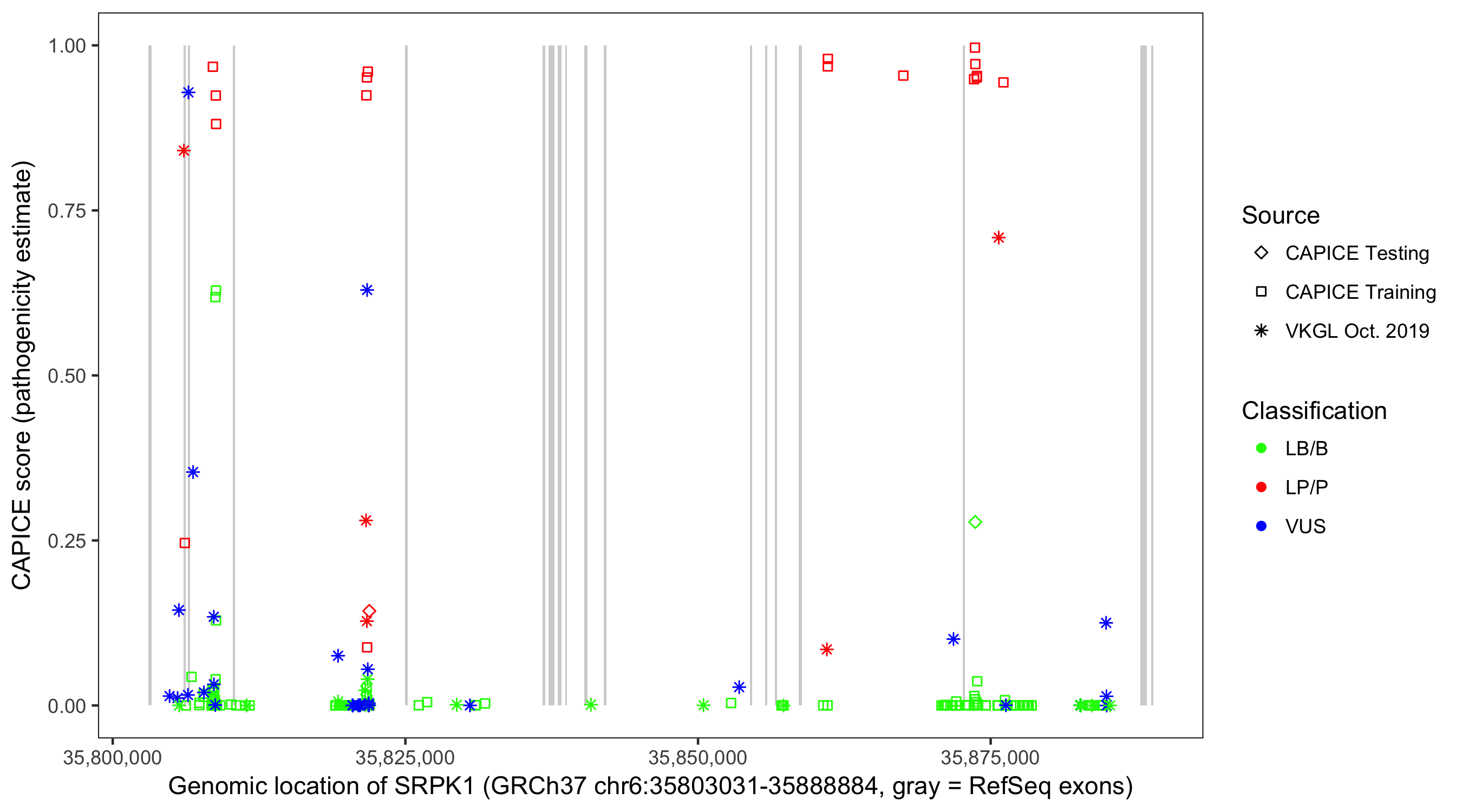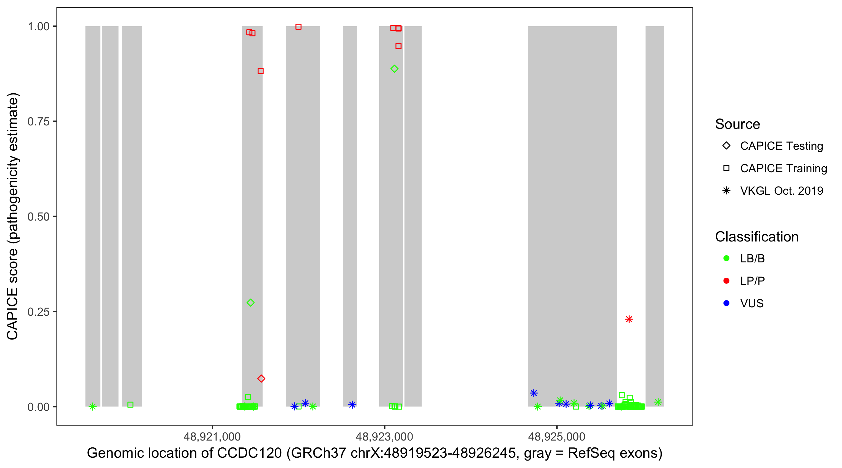 Shown are CAPICE train/test variants plus VKGL Oct 2019.