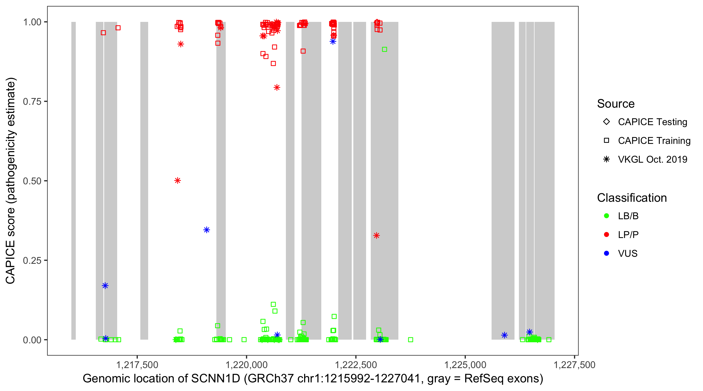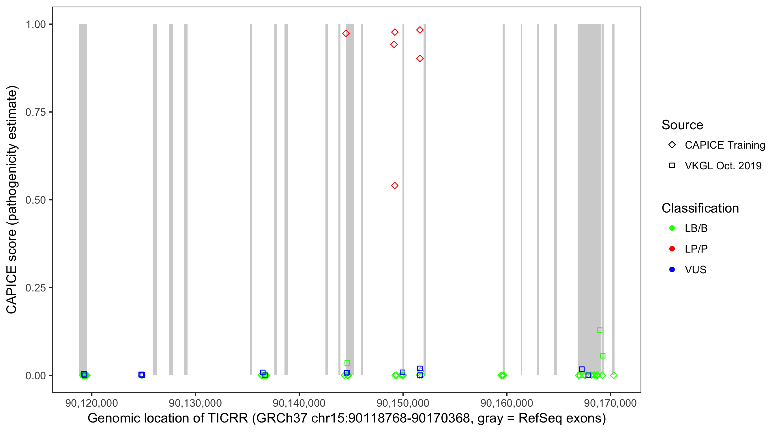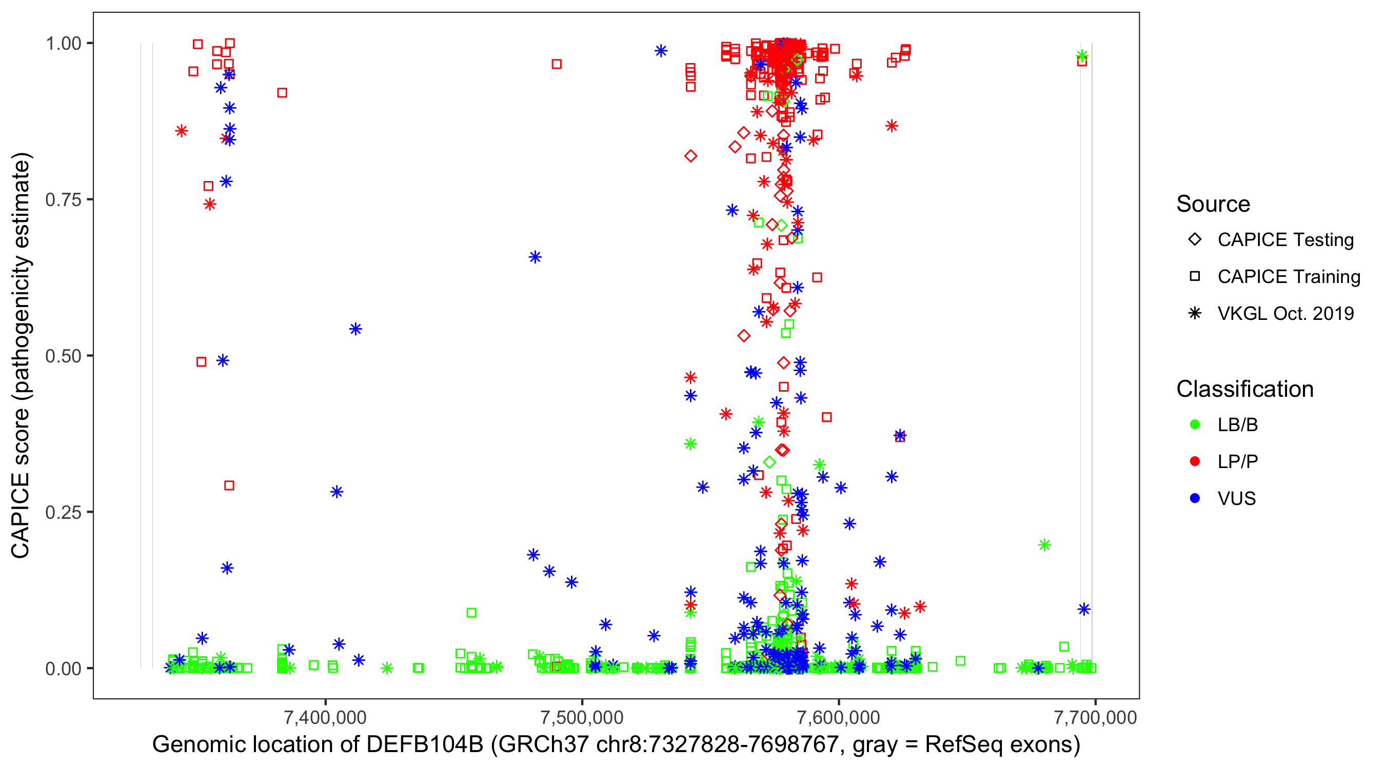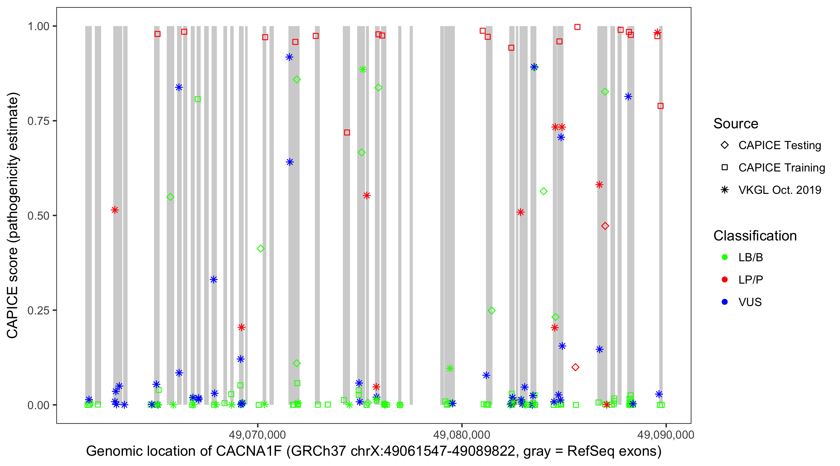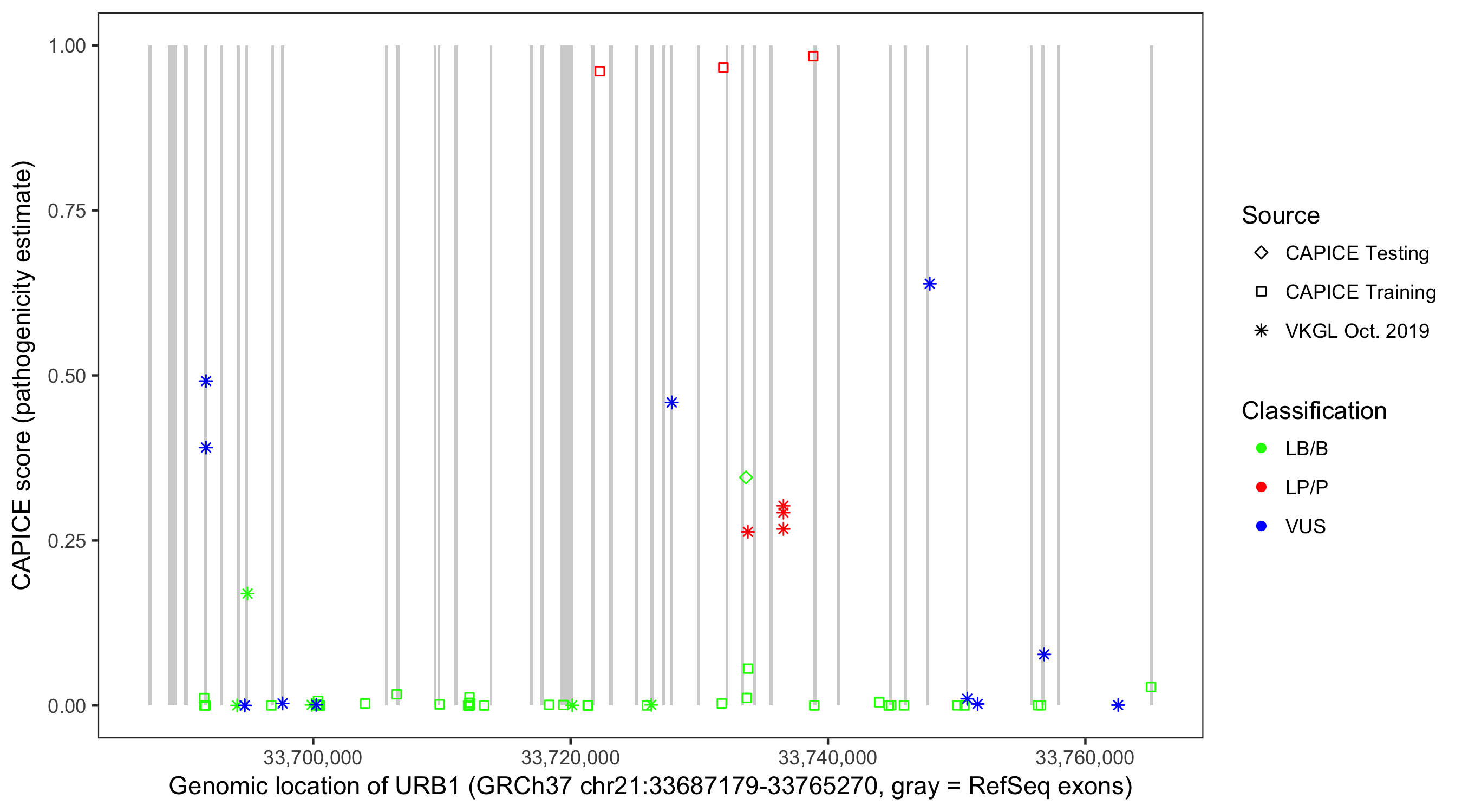 Shown are CAPICE train/test variants plus VKGL Oct 2019.