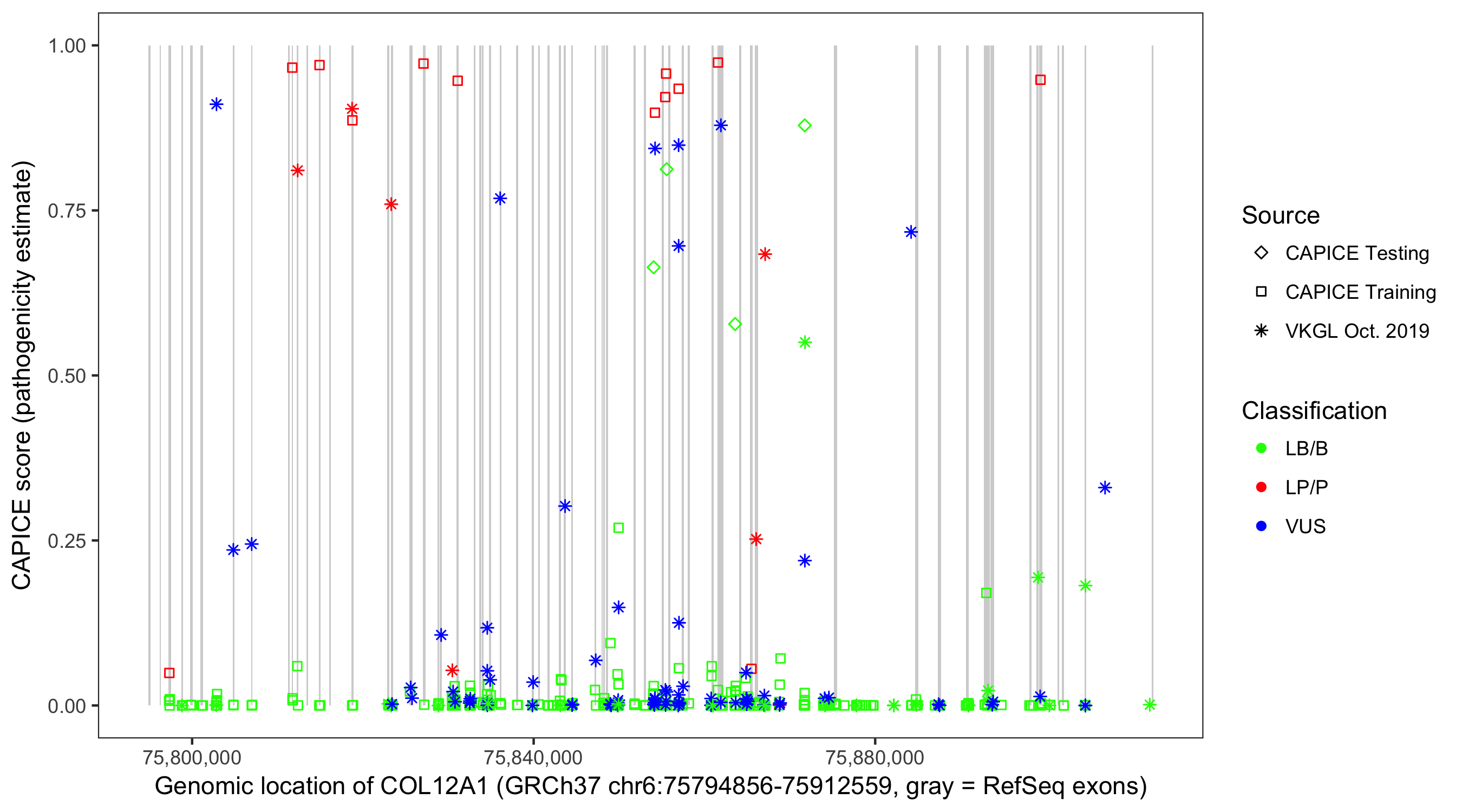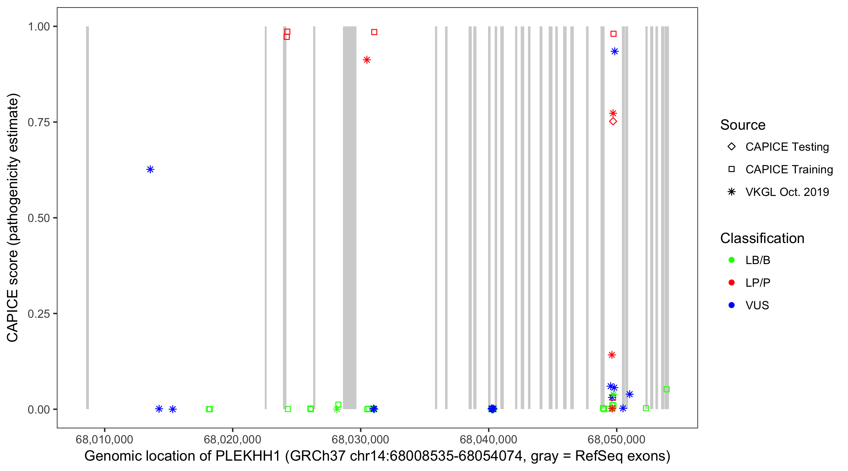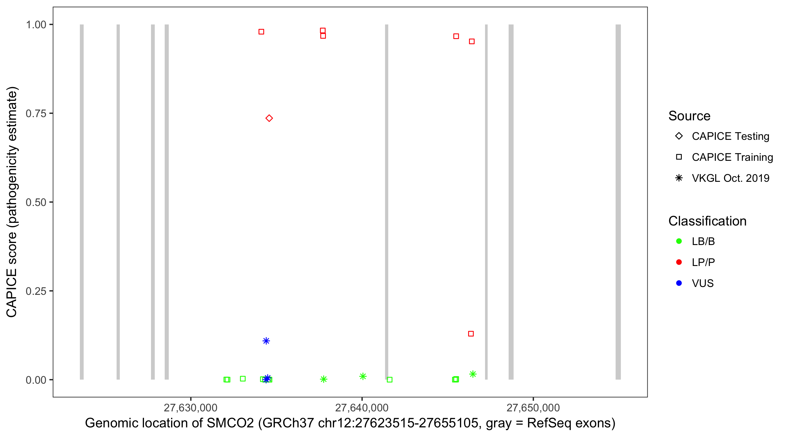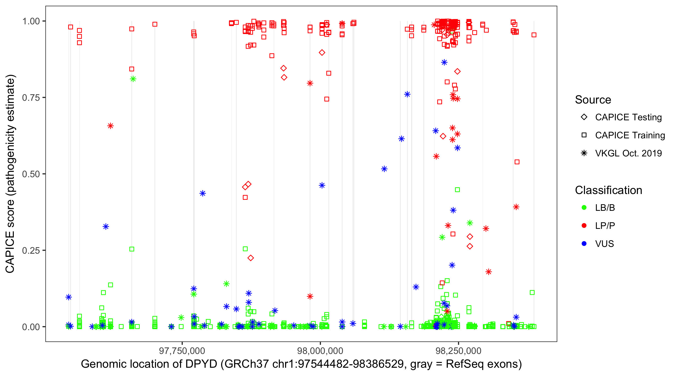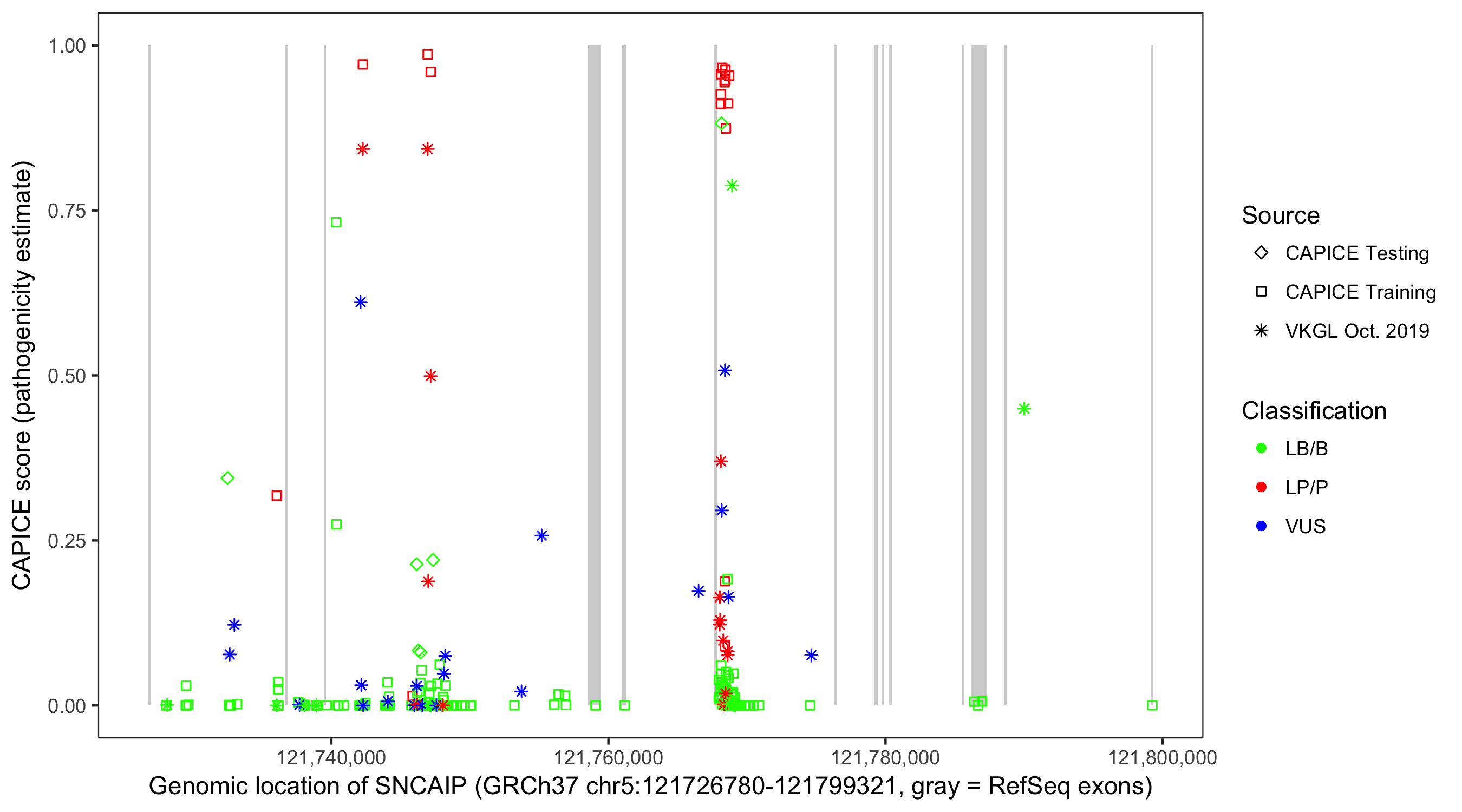 Shown are CAPICE train/test variants plus VKGL Oct 2019.