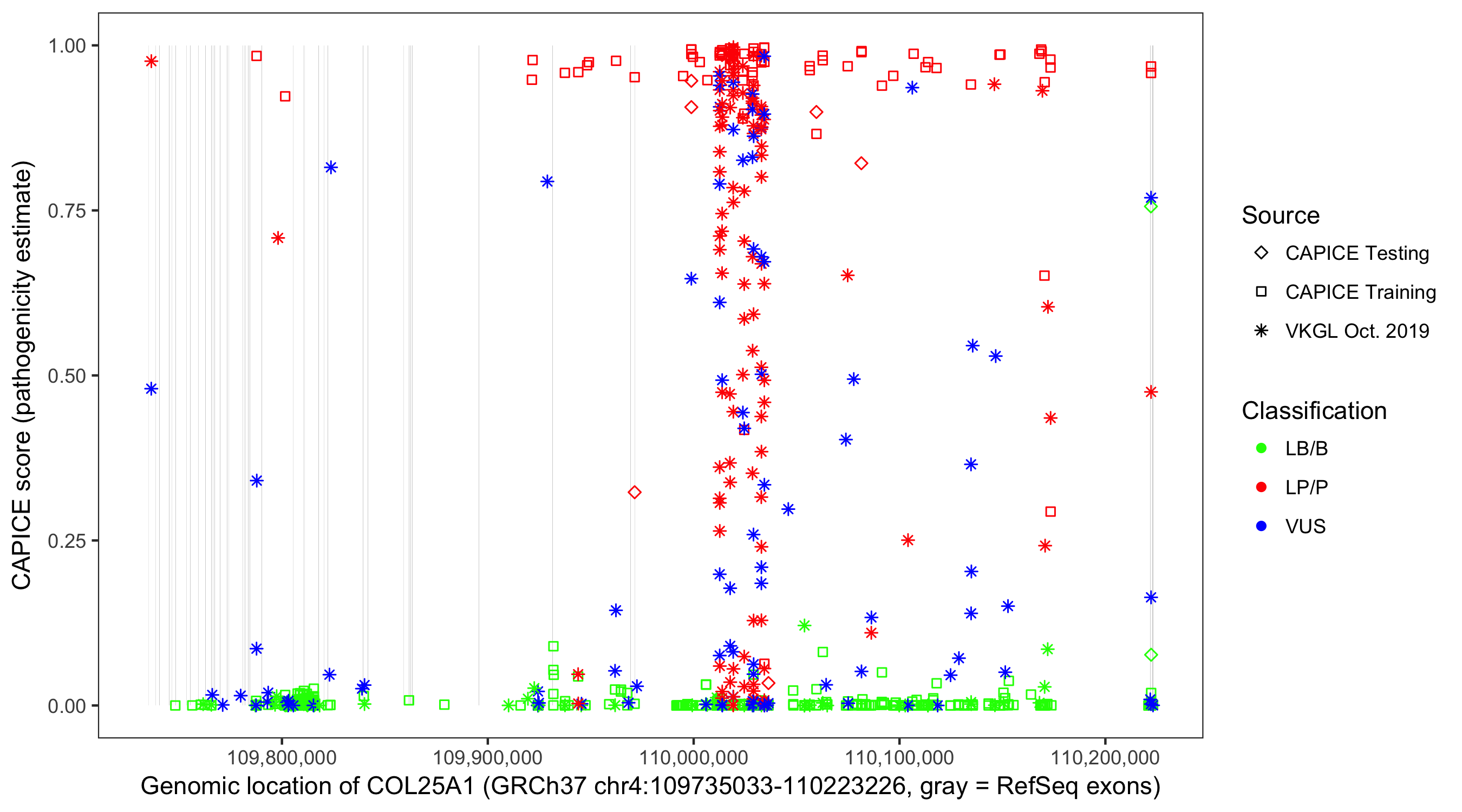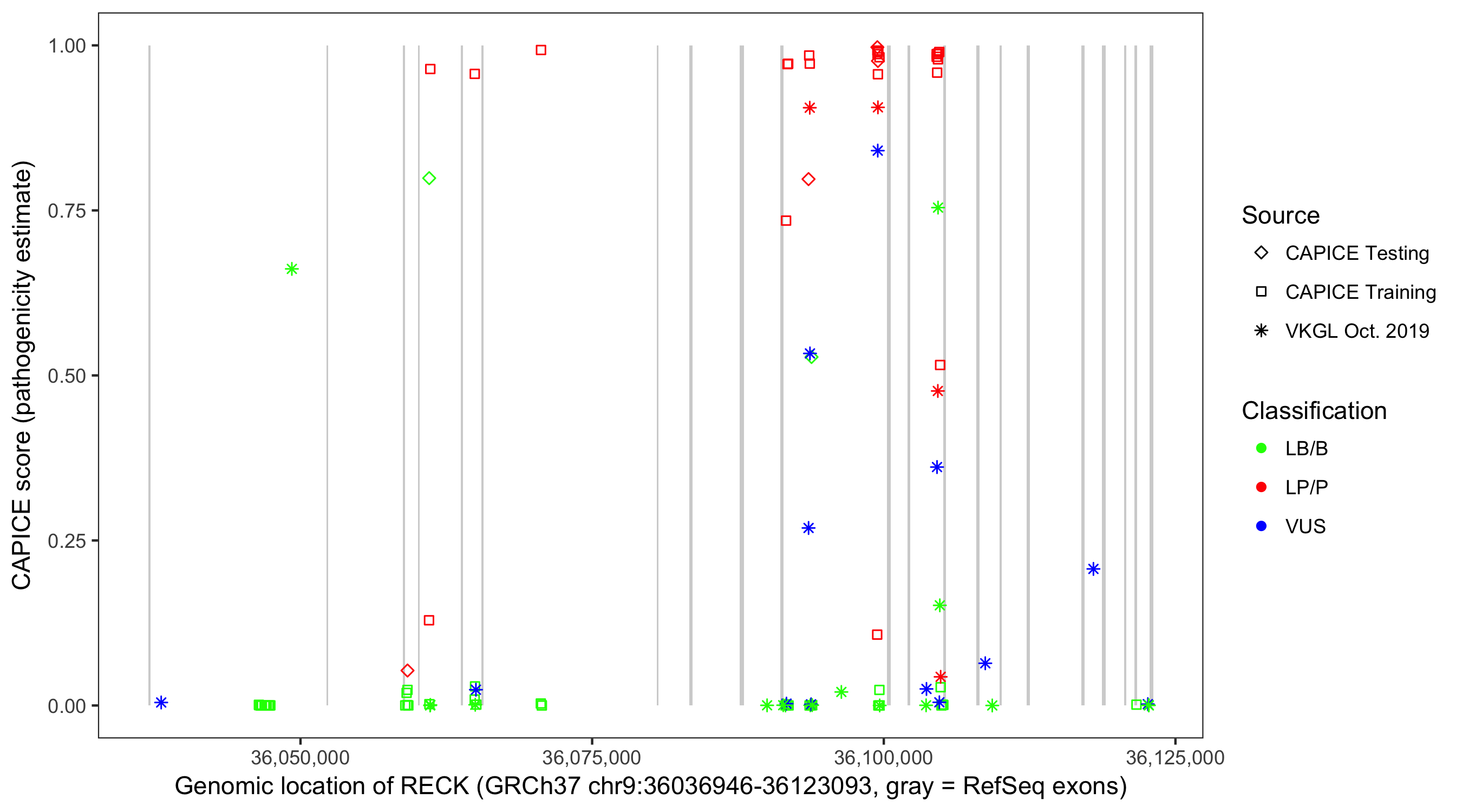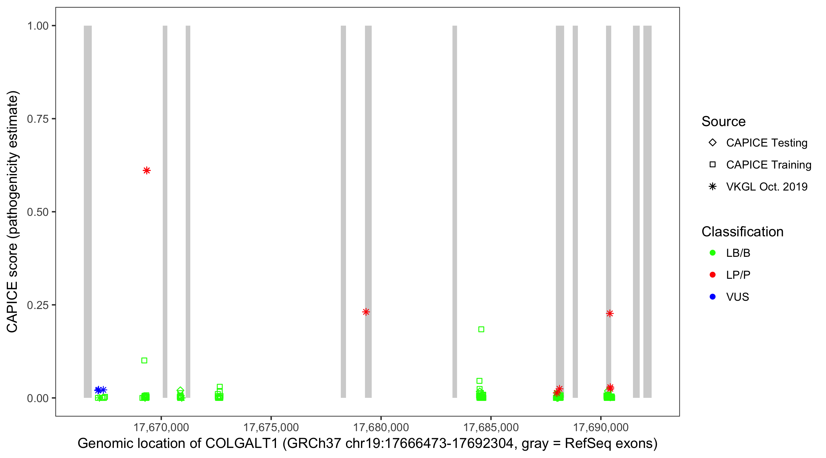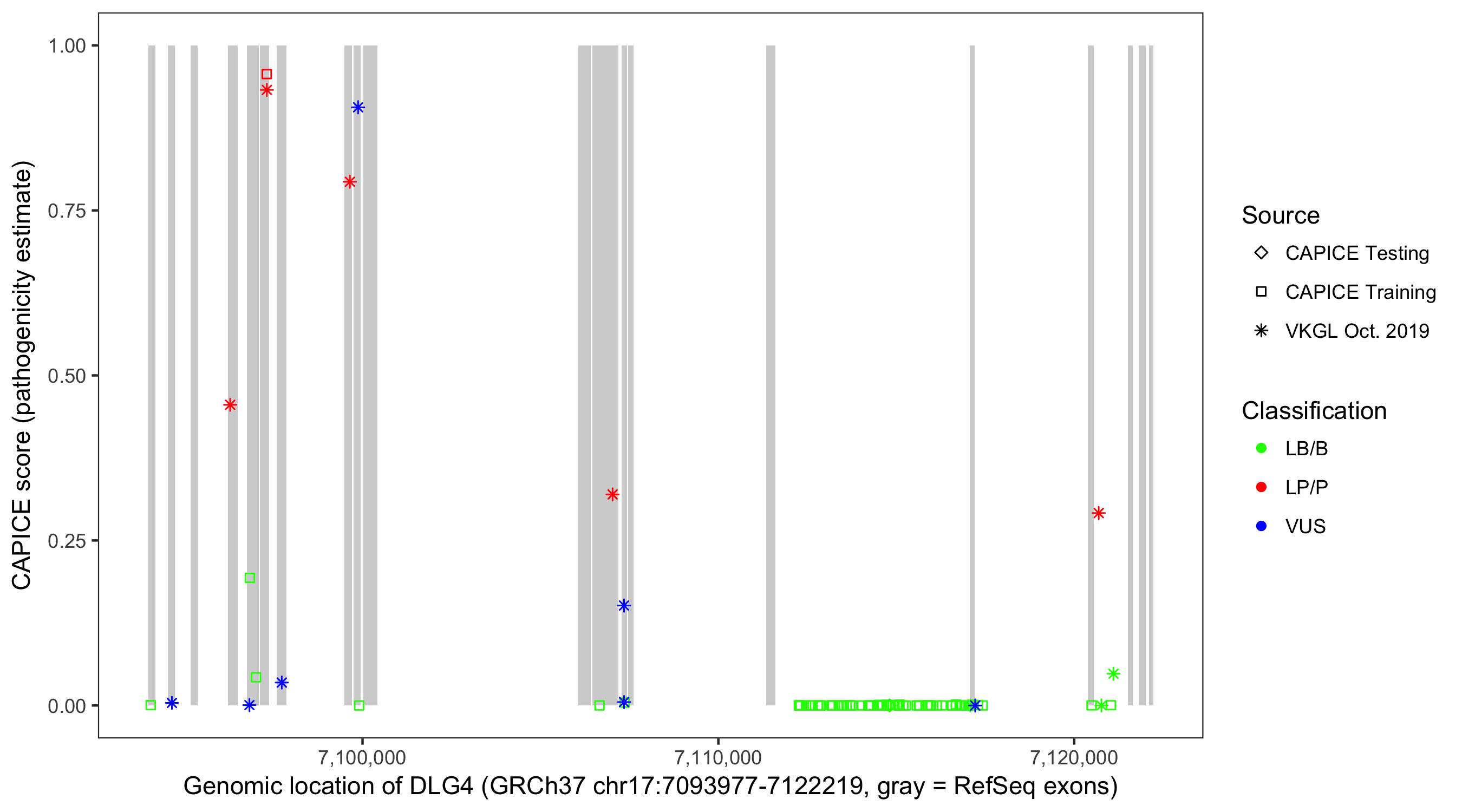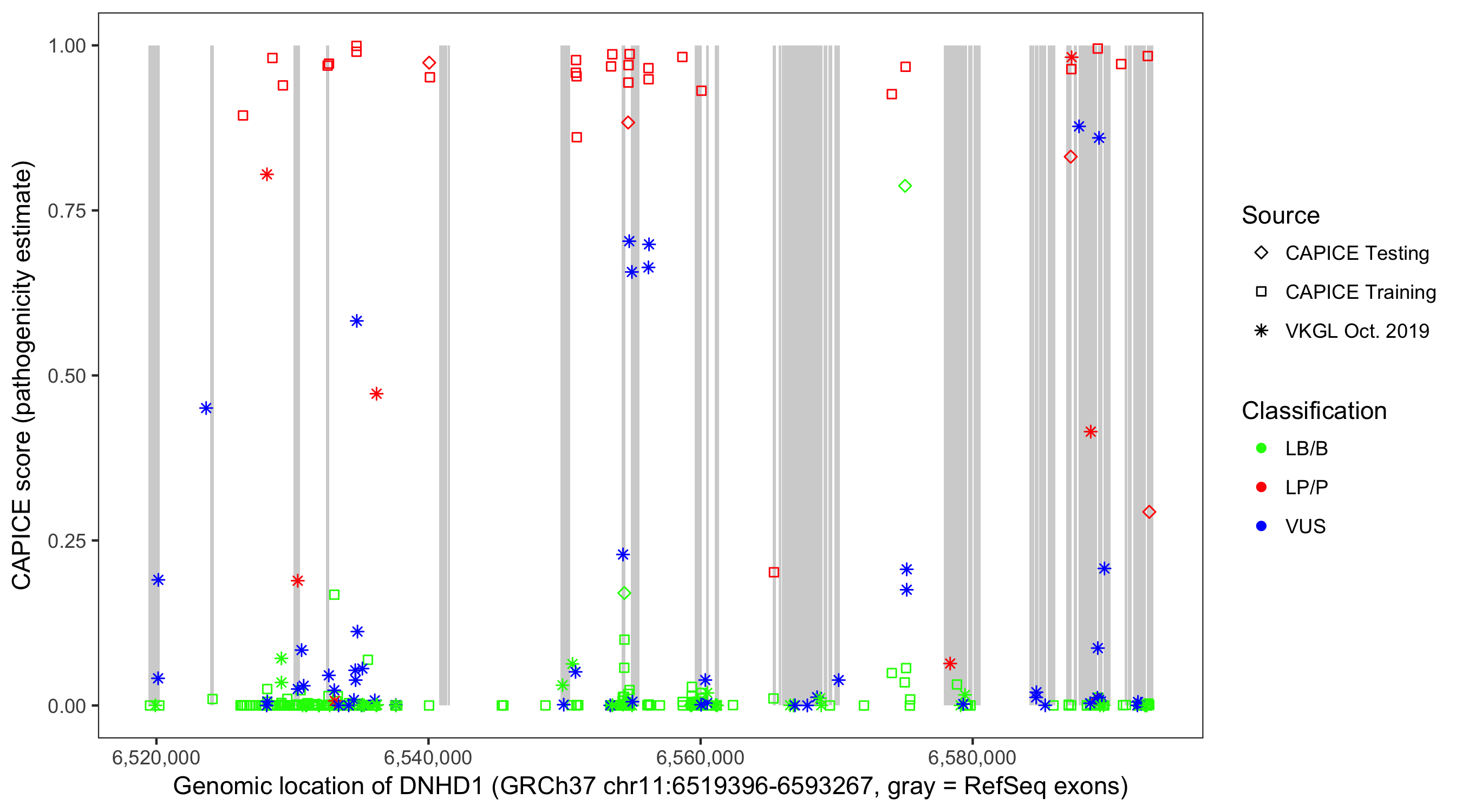 Shown are CAPICE train/test variants plus VKGL Oct 2019.