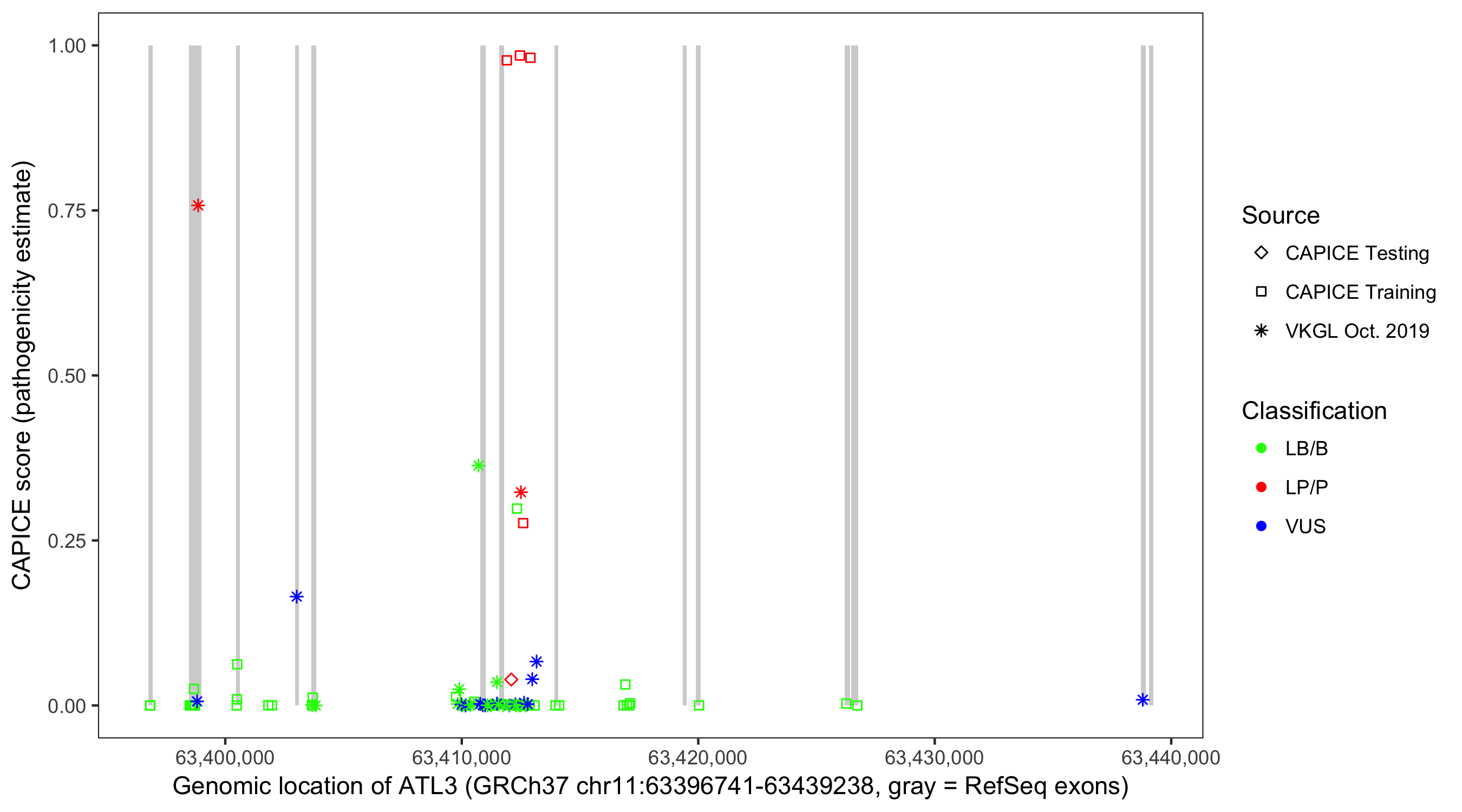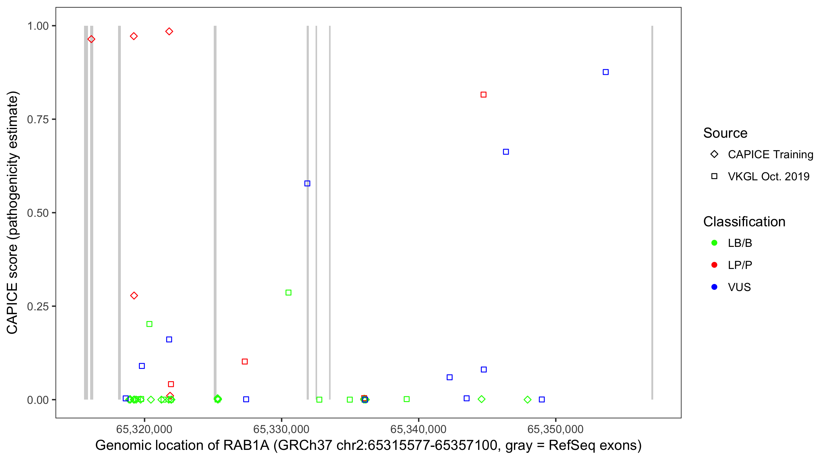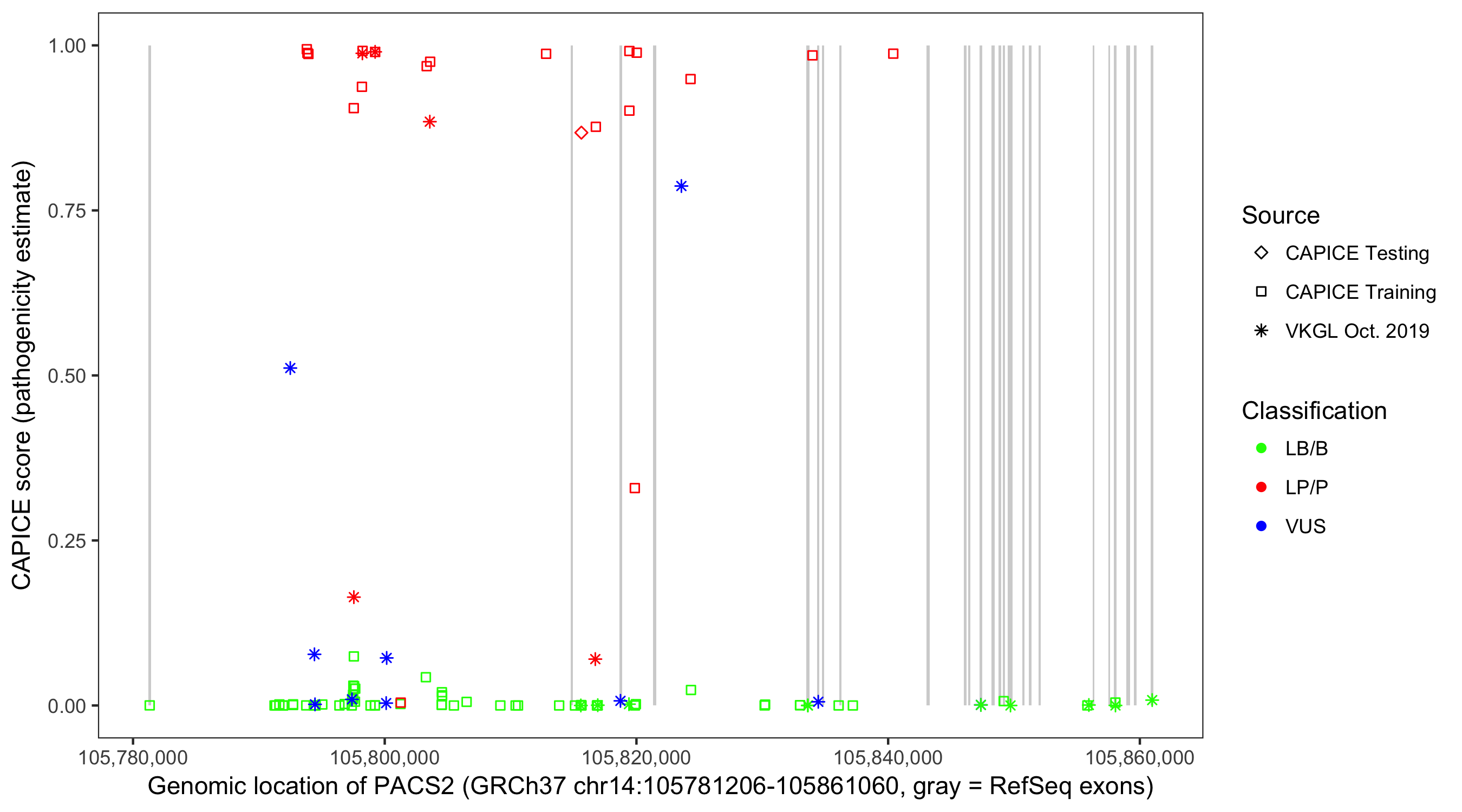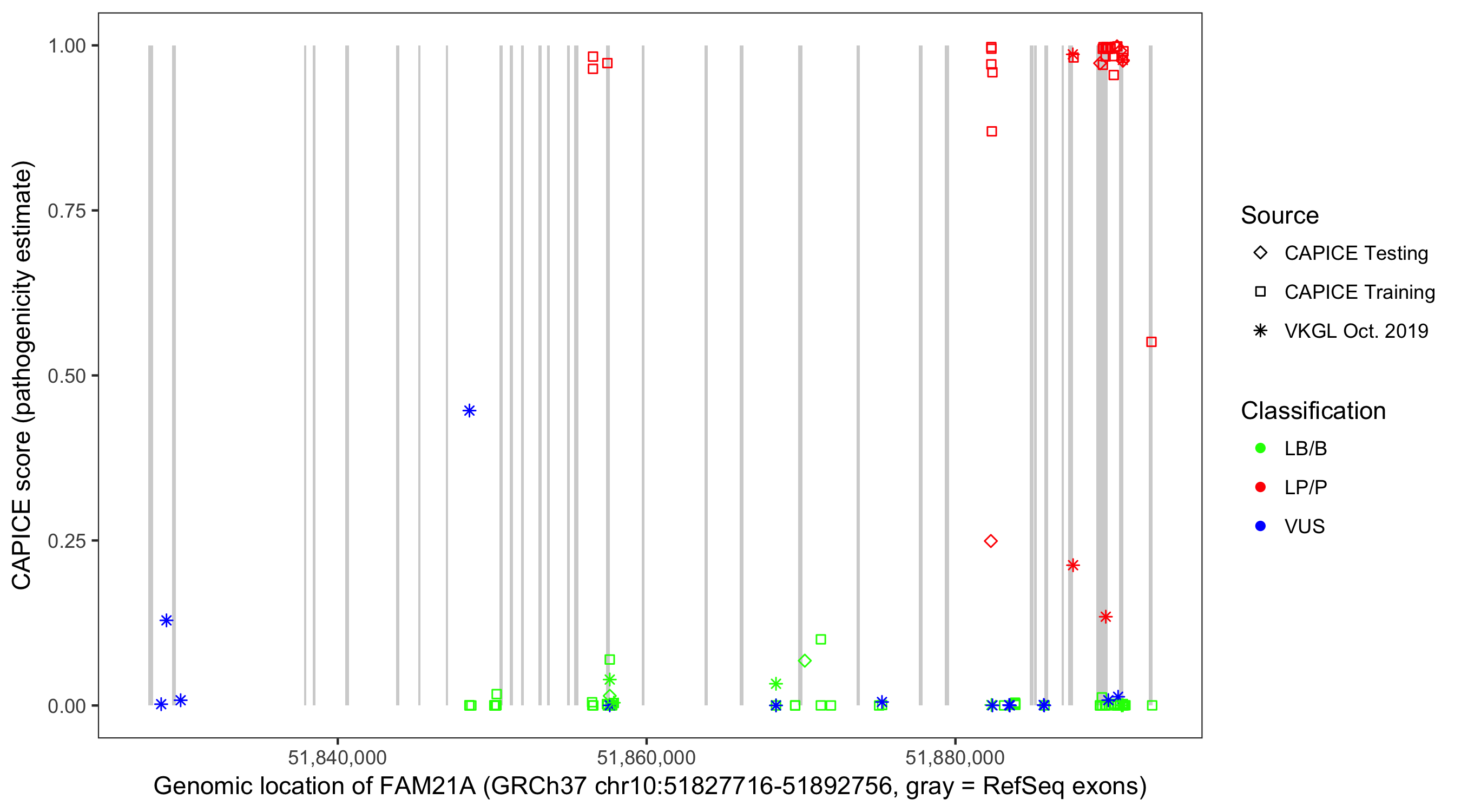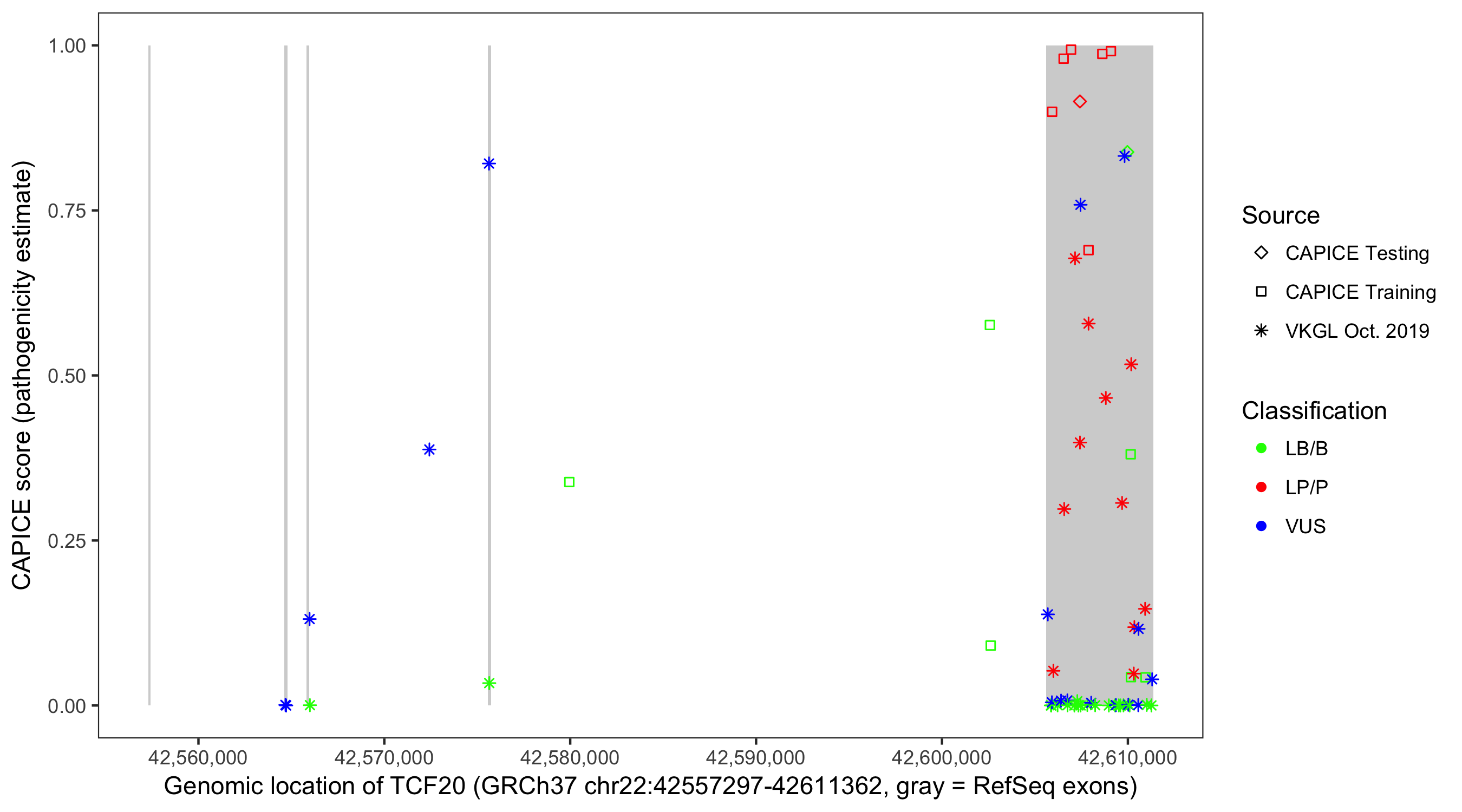 Shown are CAPICE train/test variants plus VKGL Oct 2019.