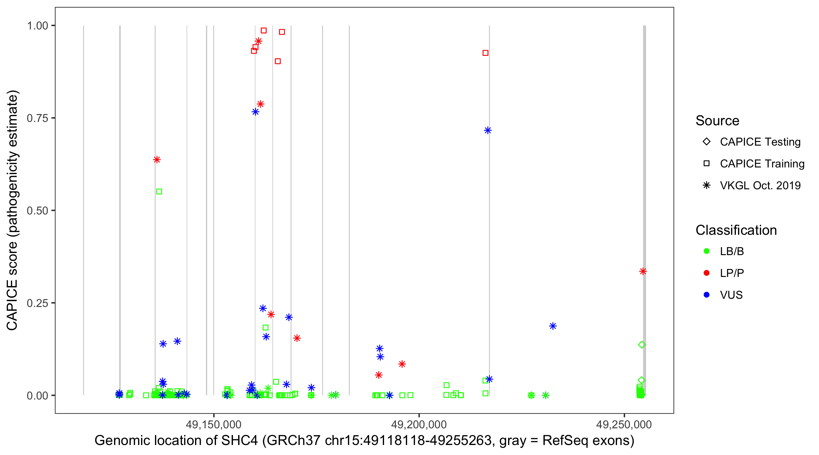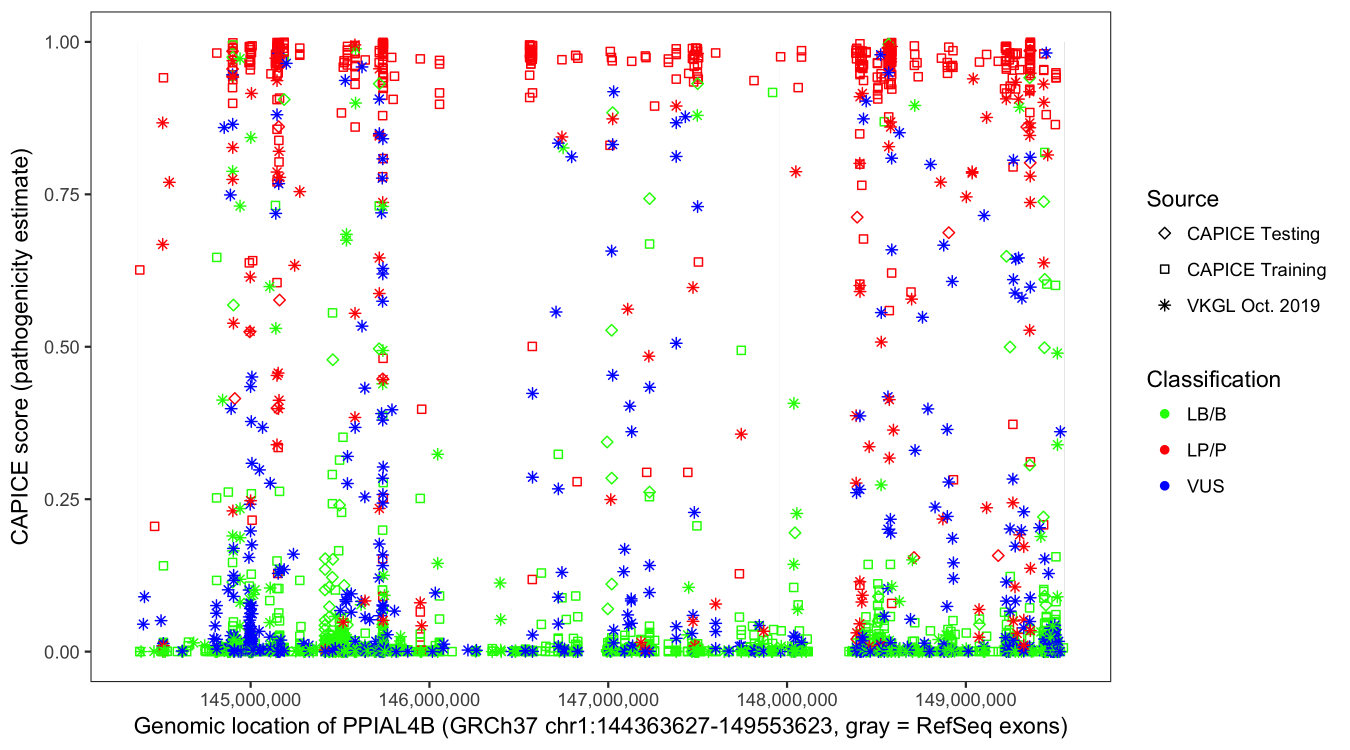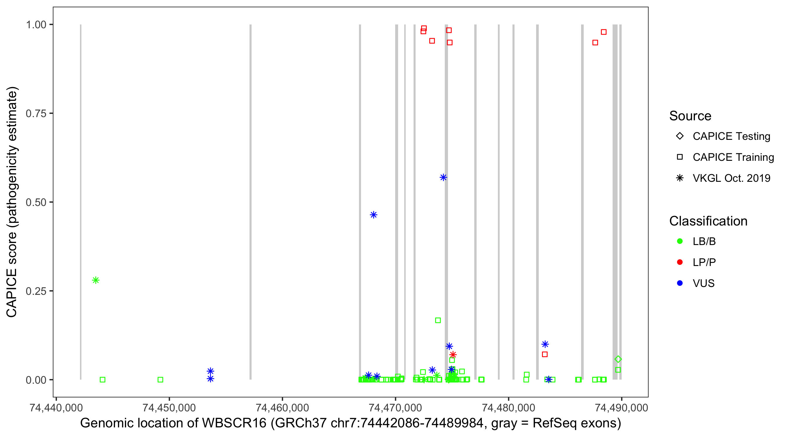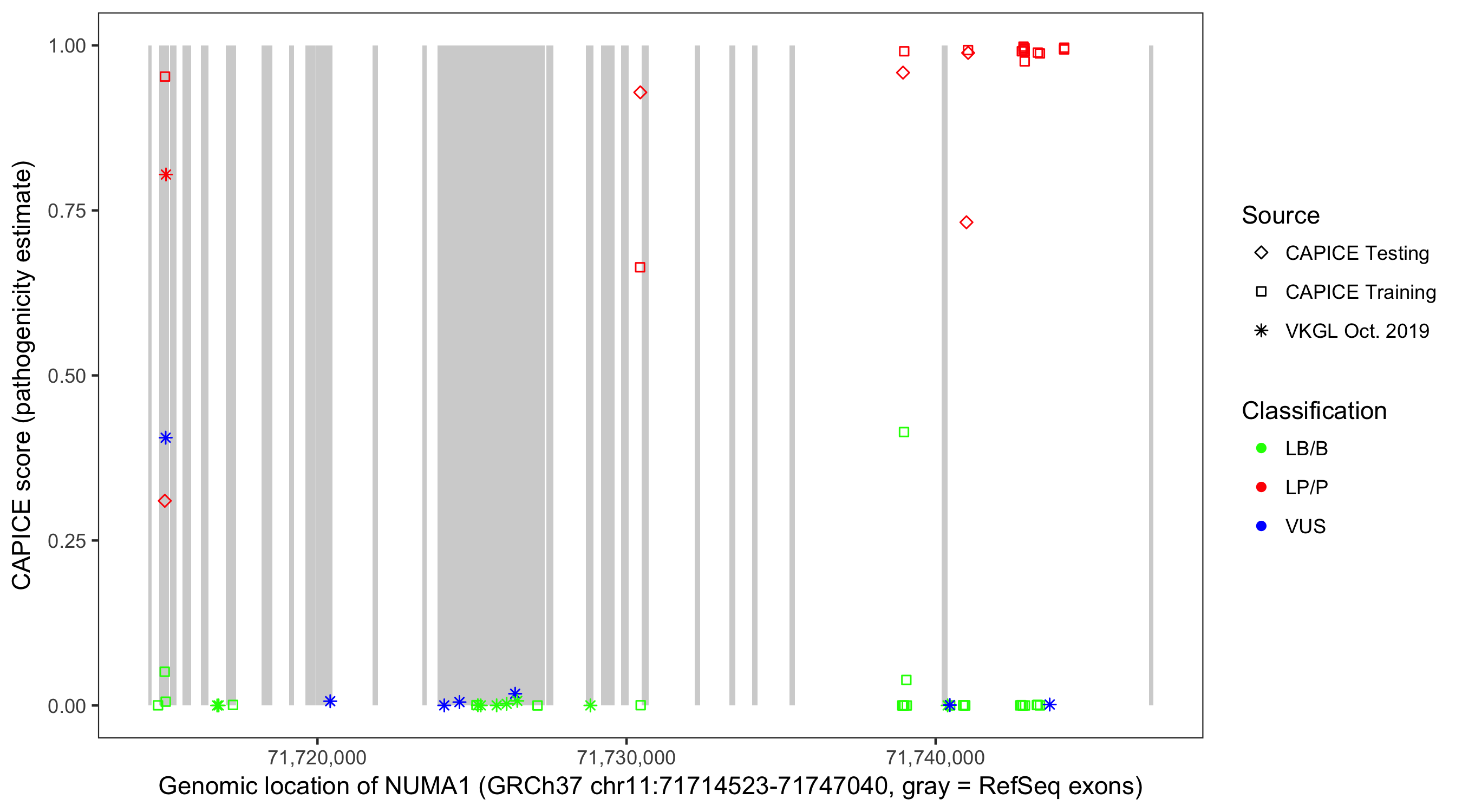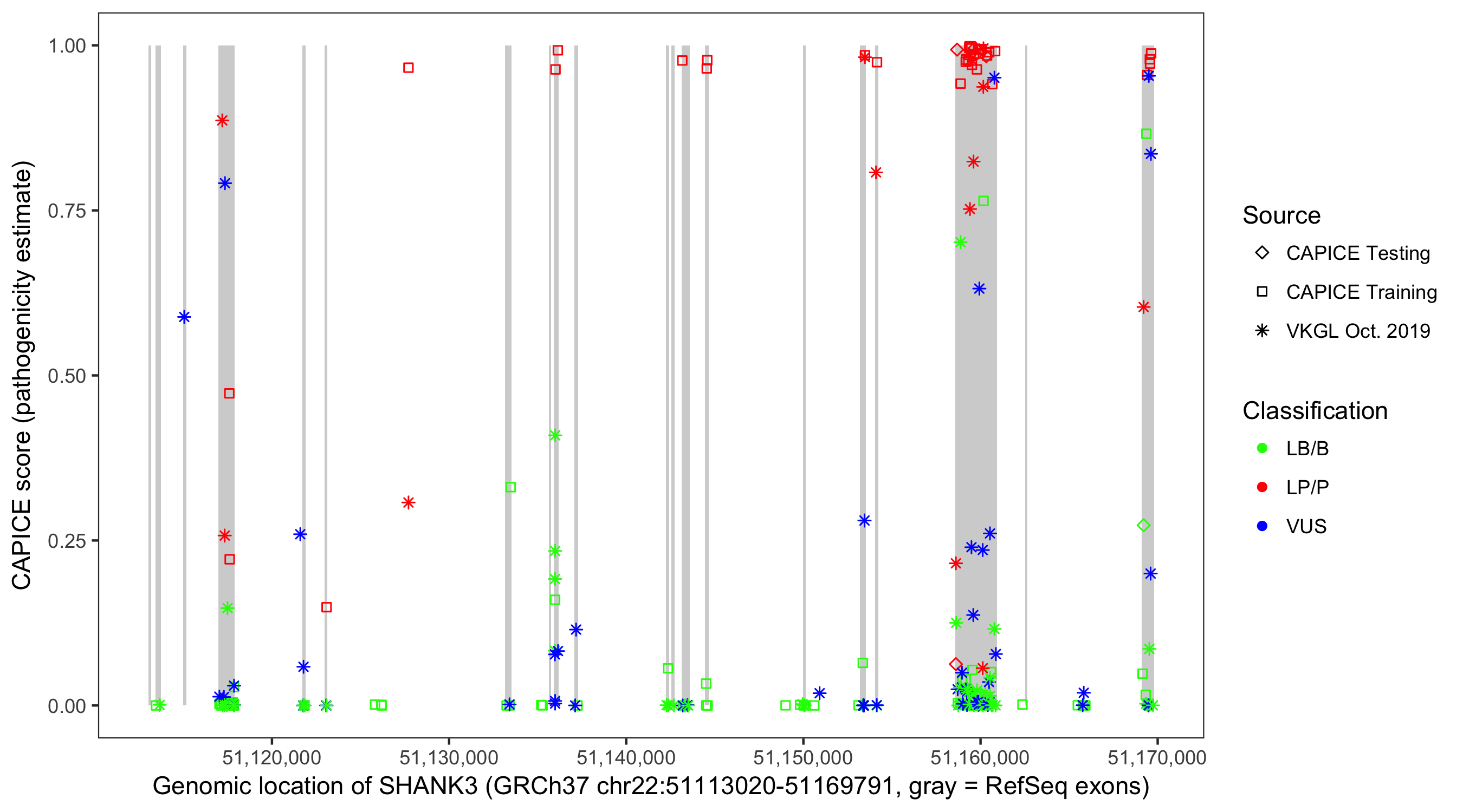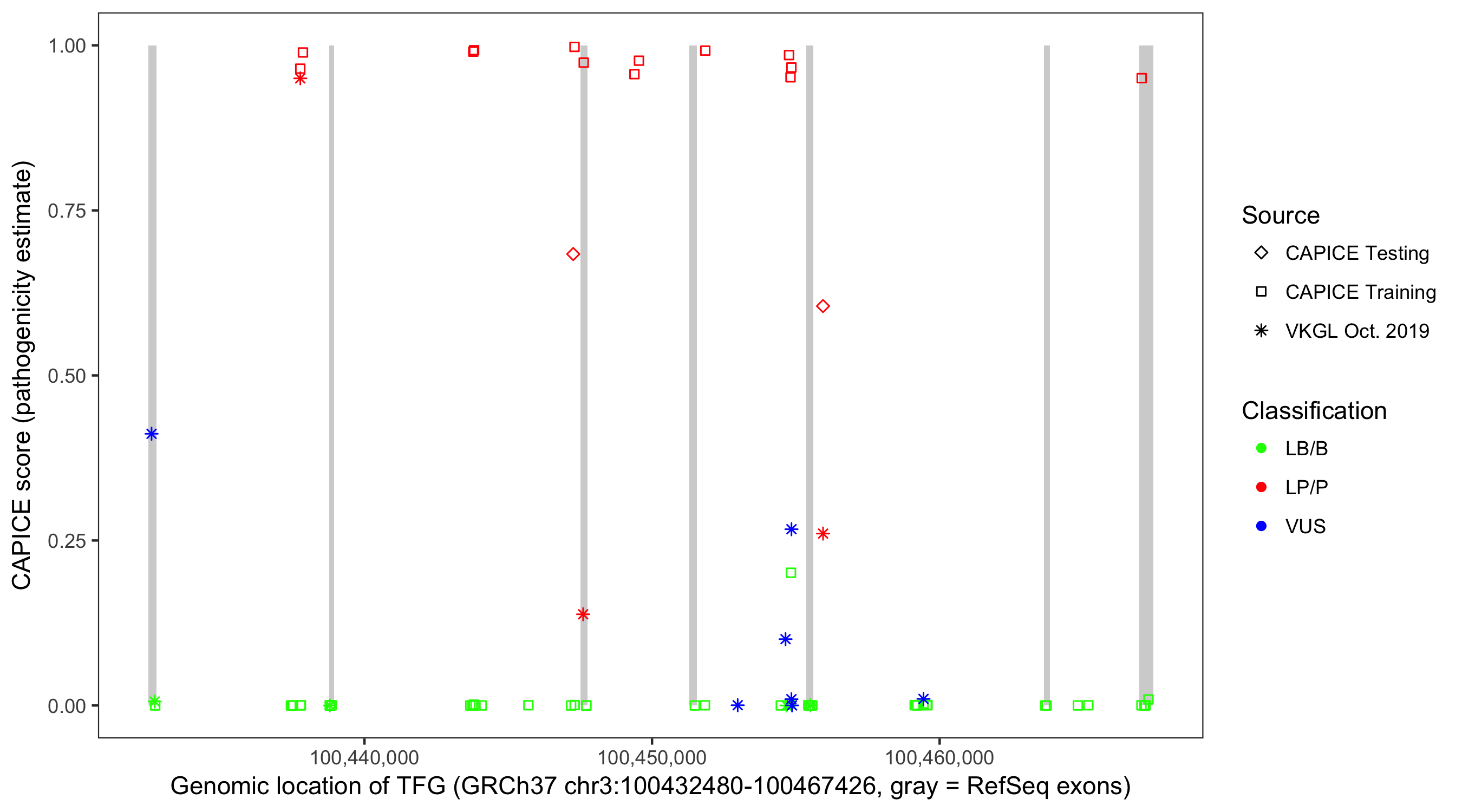 Shown are CAPICE train/test variants plus VKGL Oct 2019.