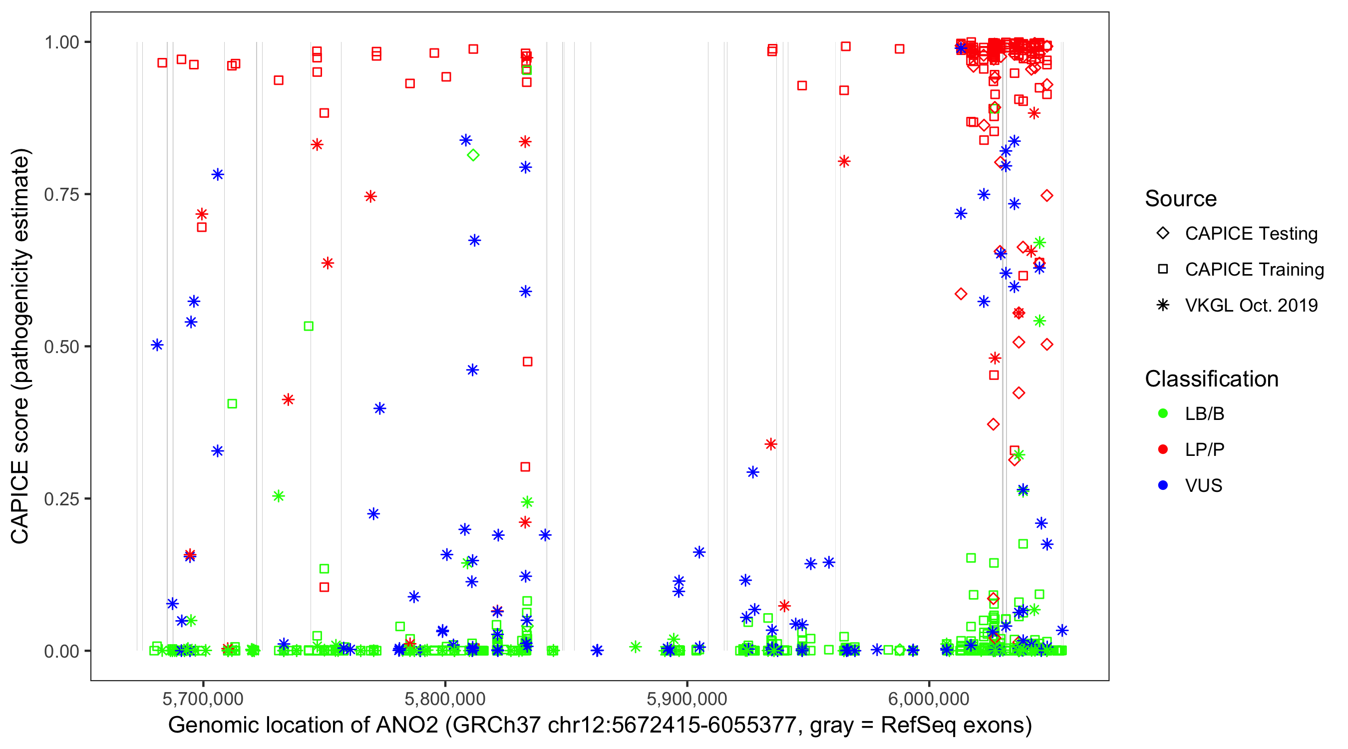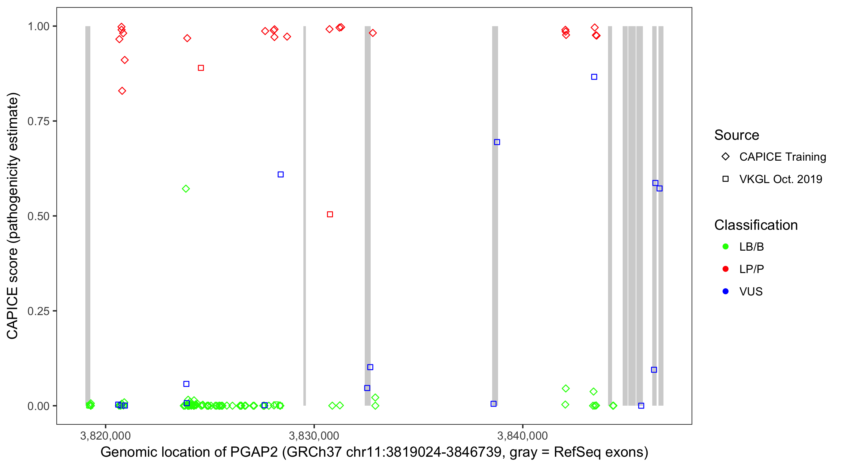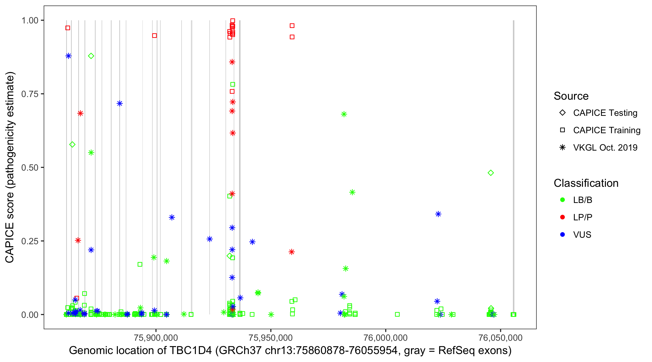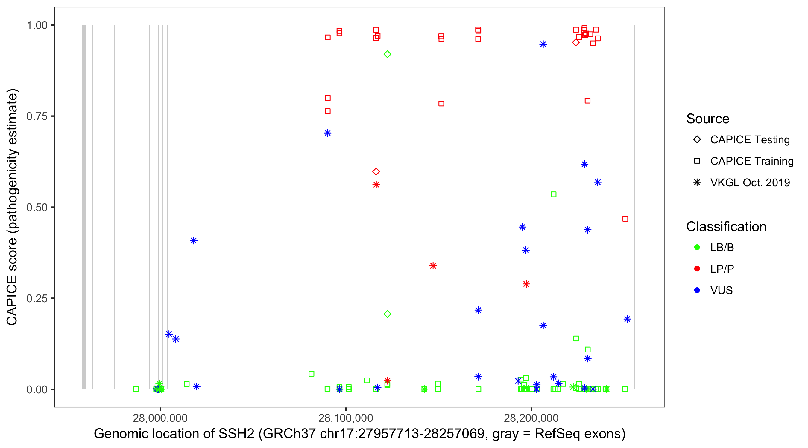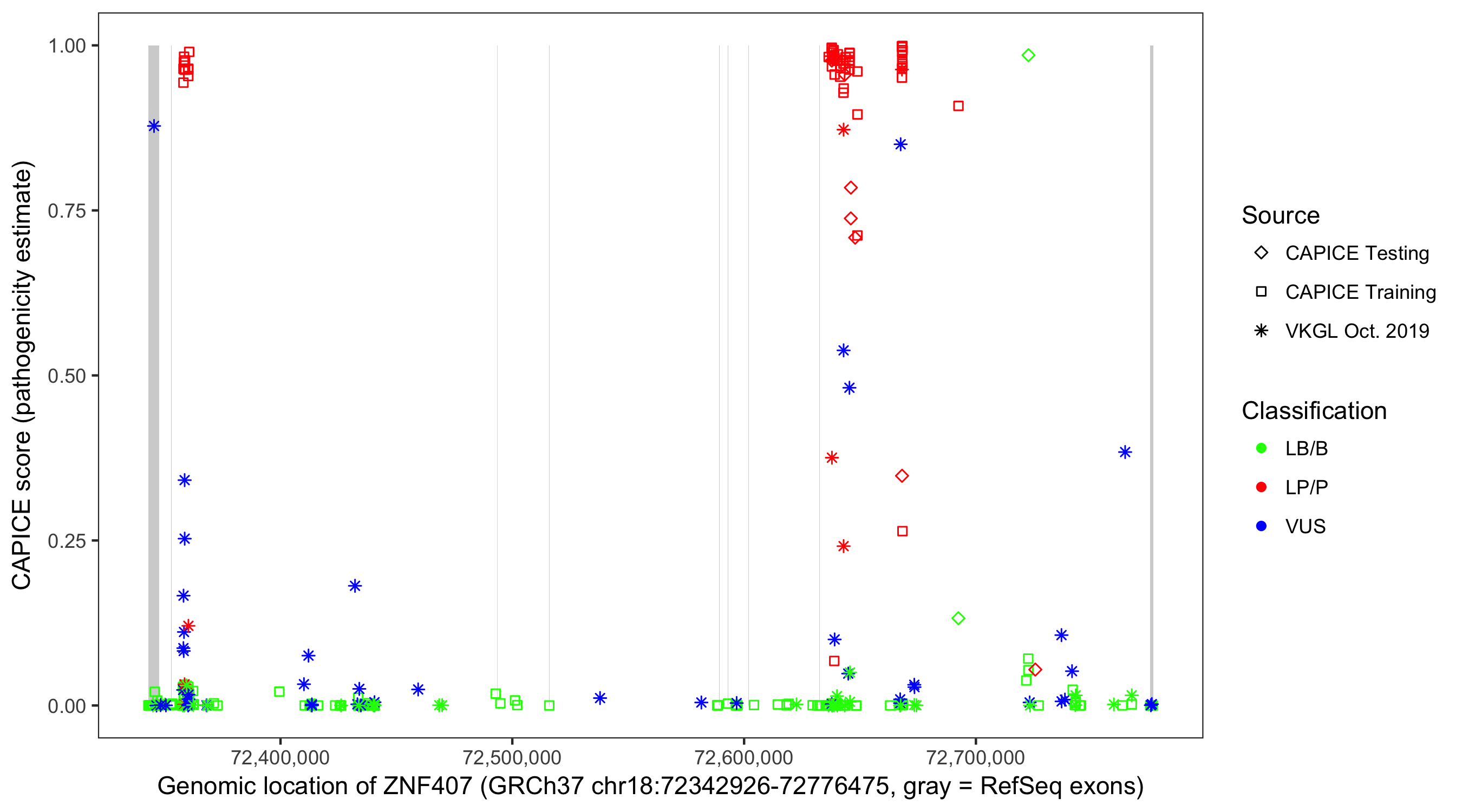 Shown are CAPICE train/test variants plus VKGL Oct 2019.
