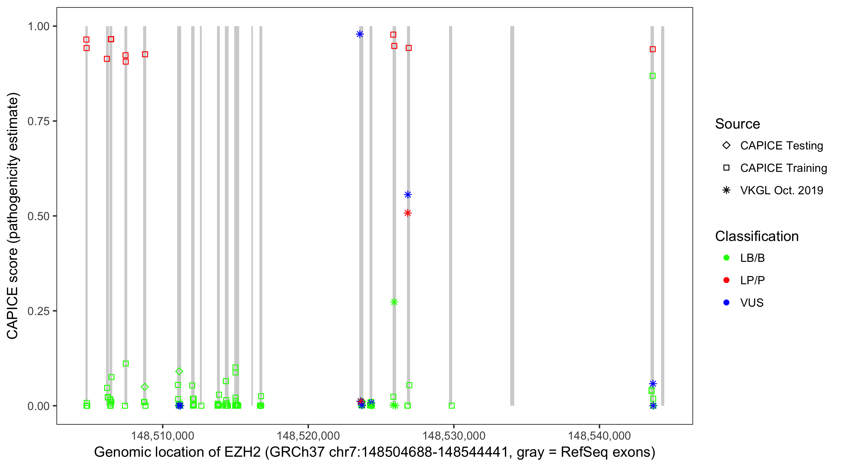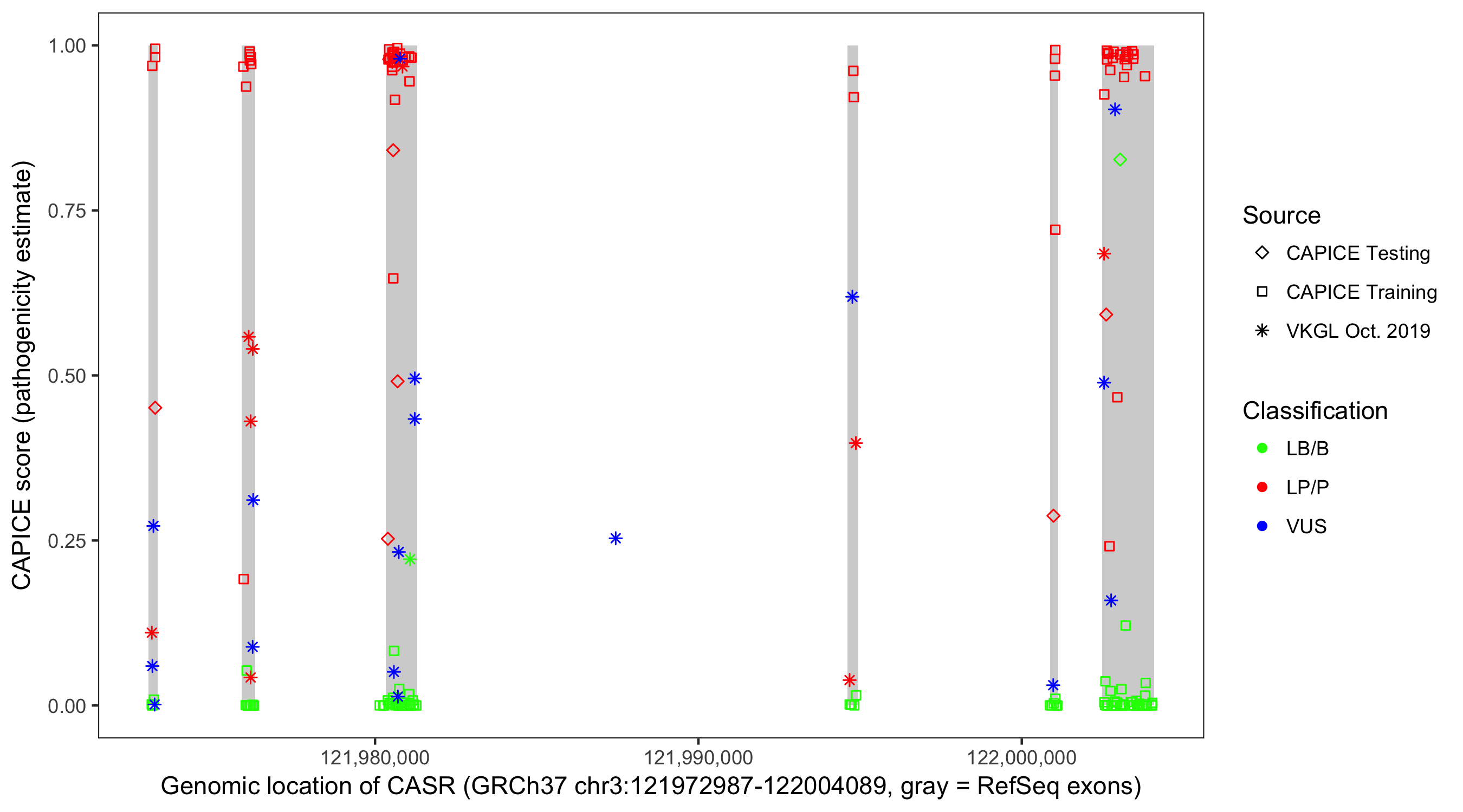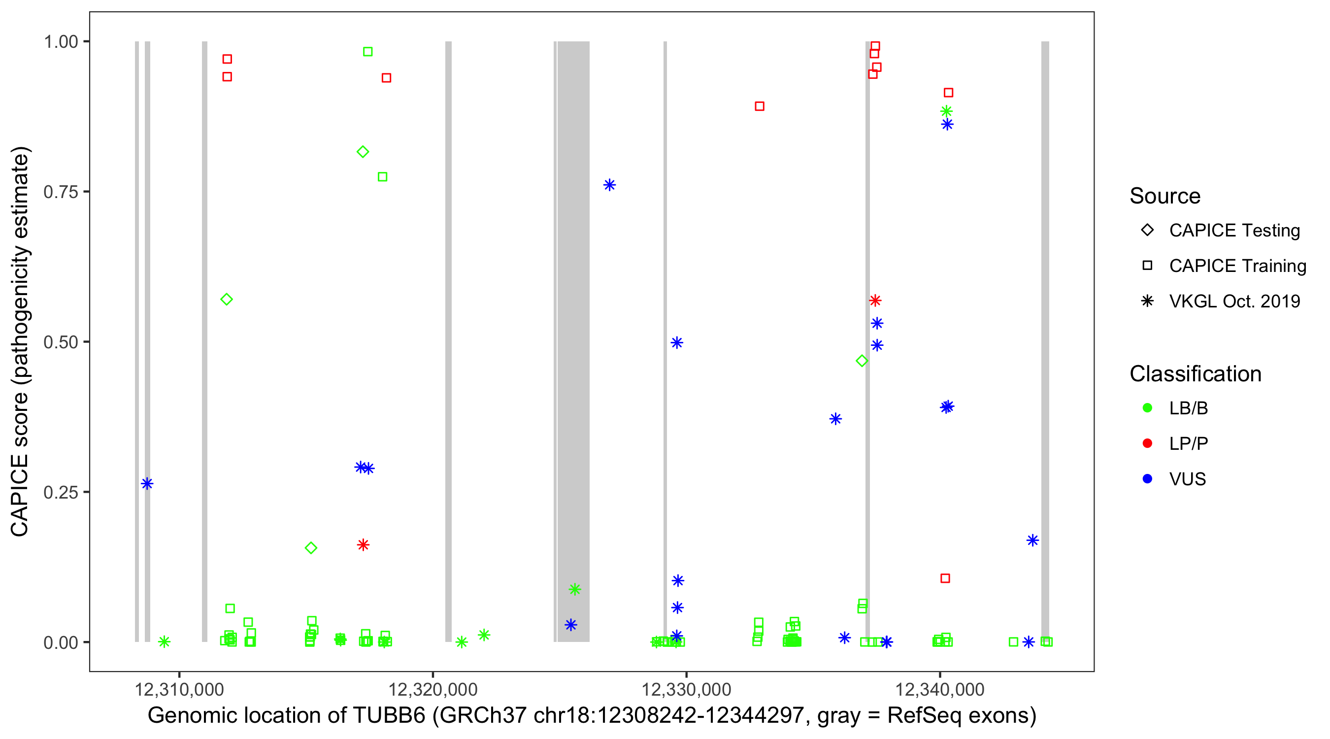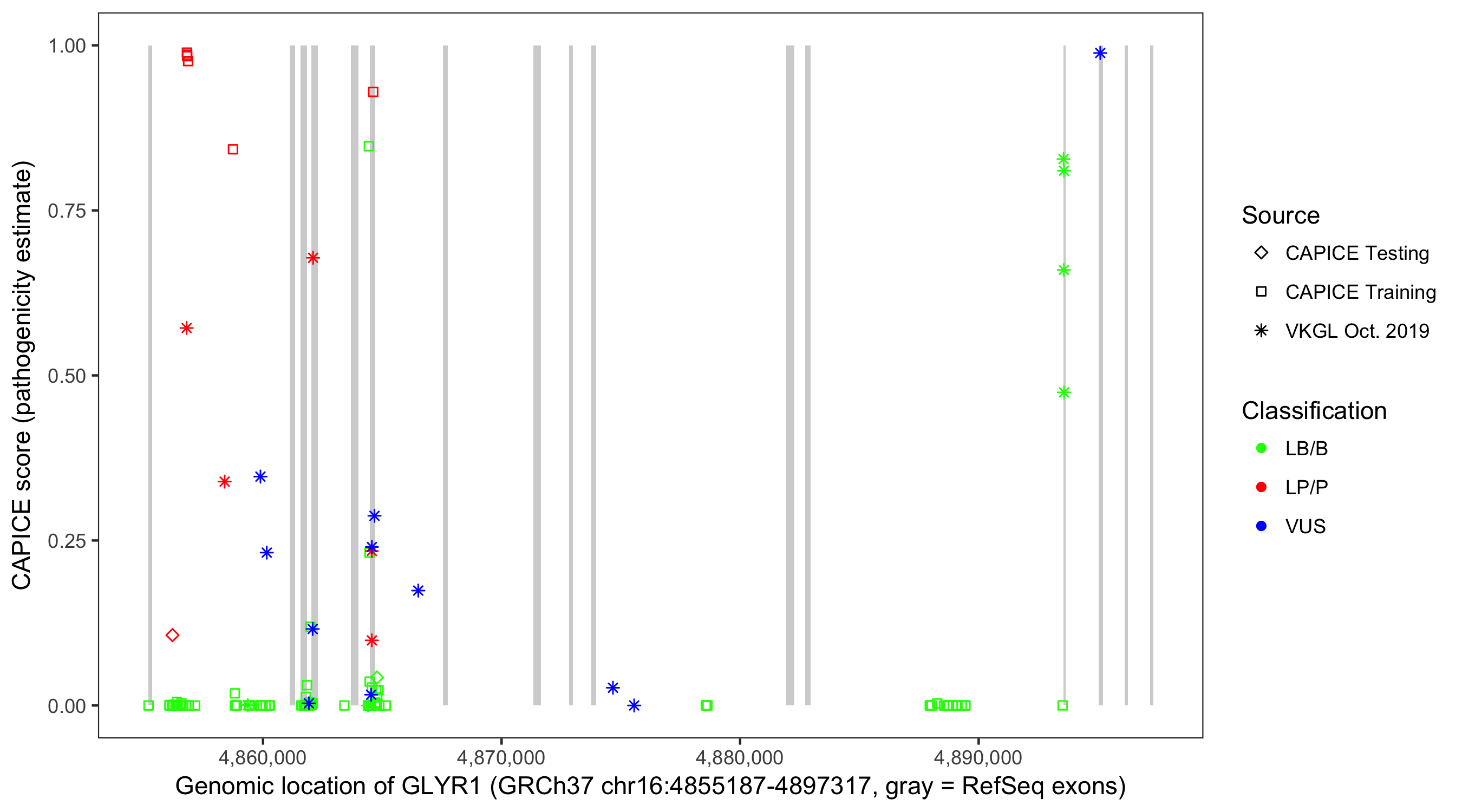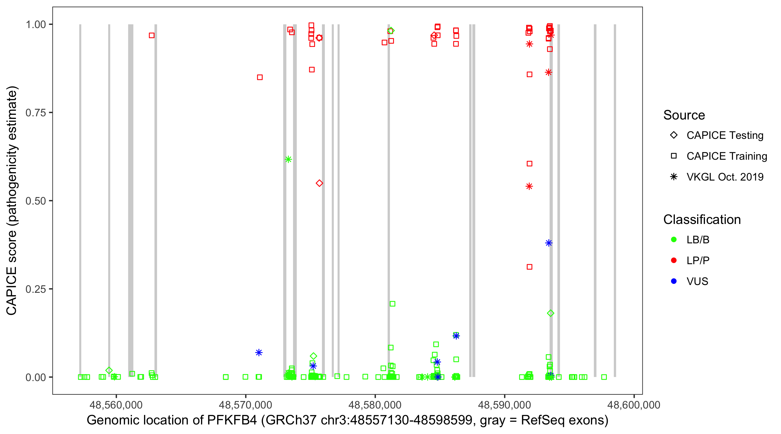 Shown are CAPICE train/test variants plus VKGL Oct 2019.