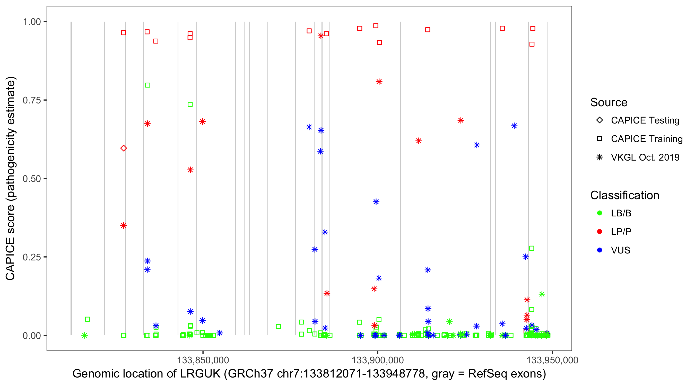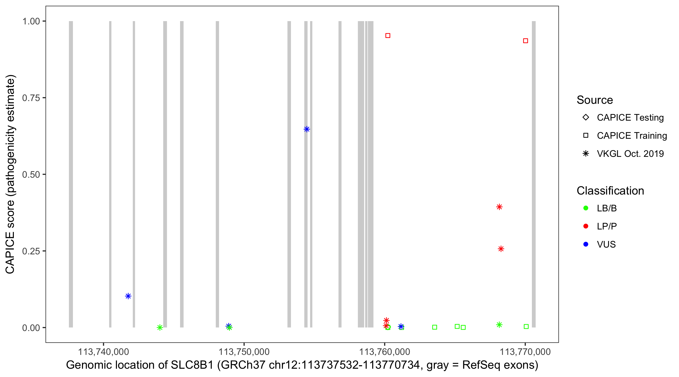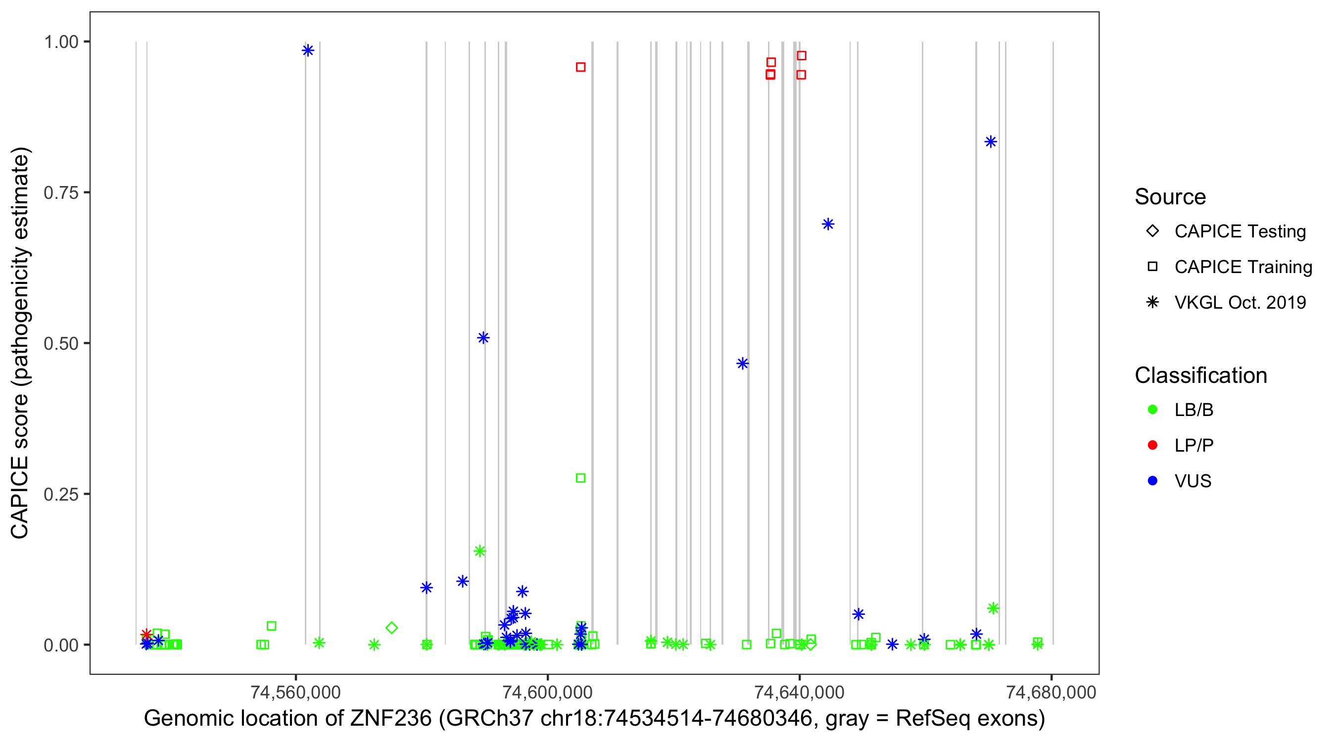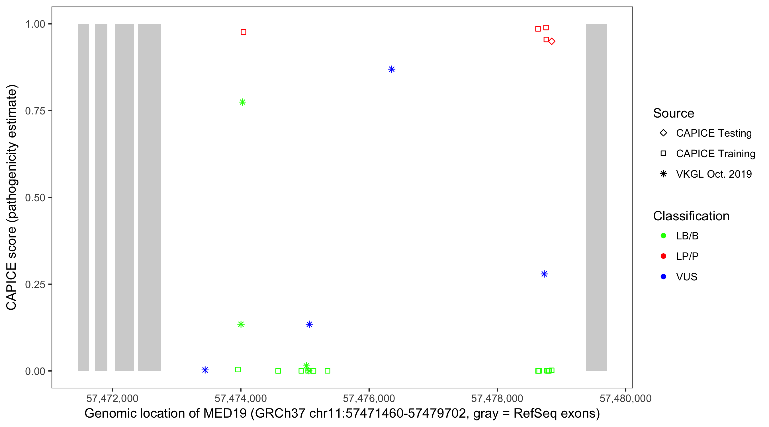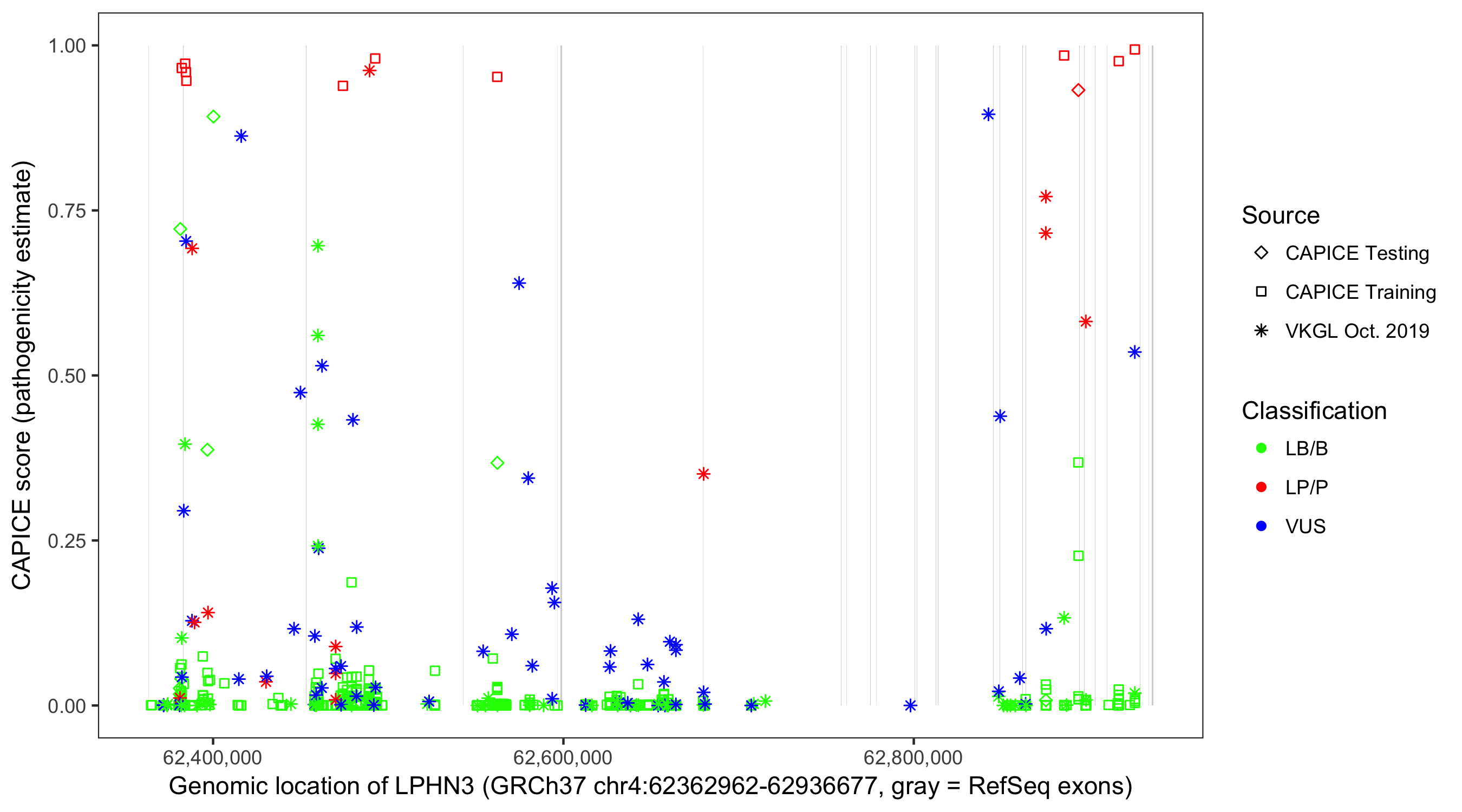 Shown are CAPICE train/test variants plus VKGL Oct 2019.