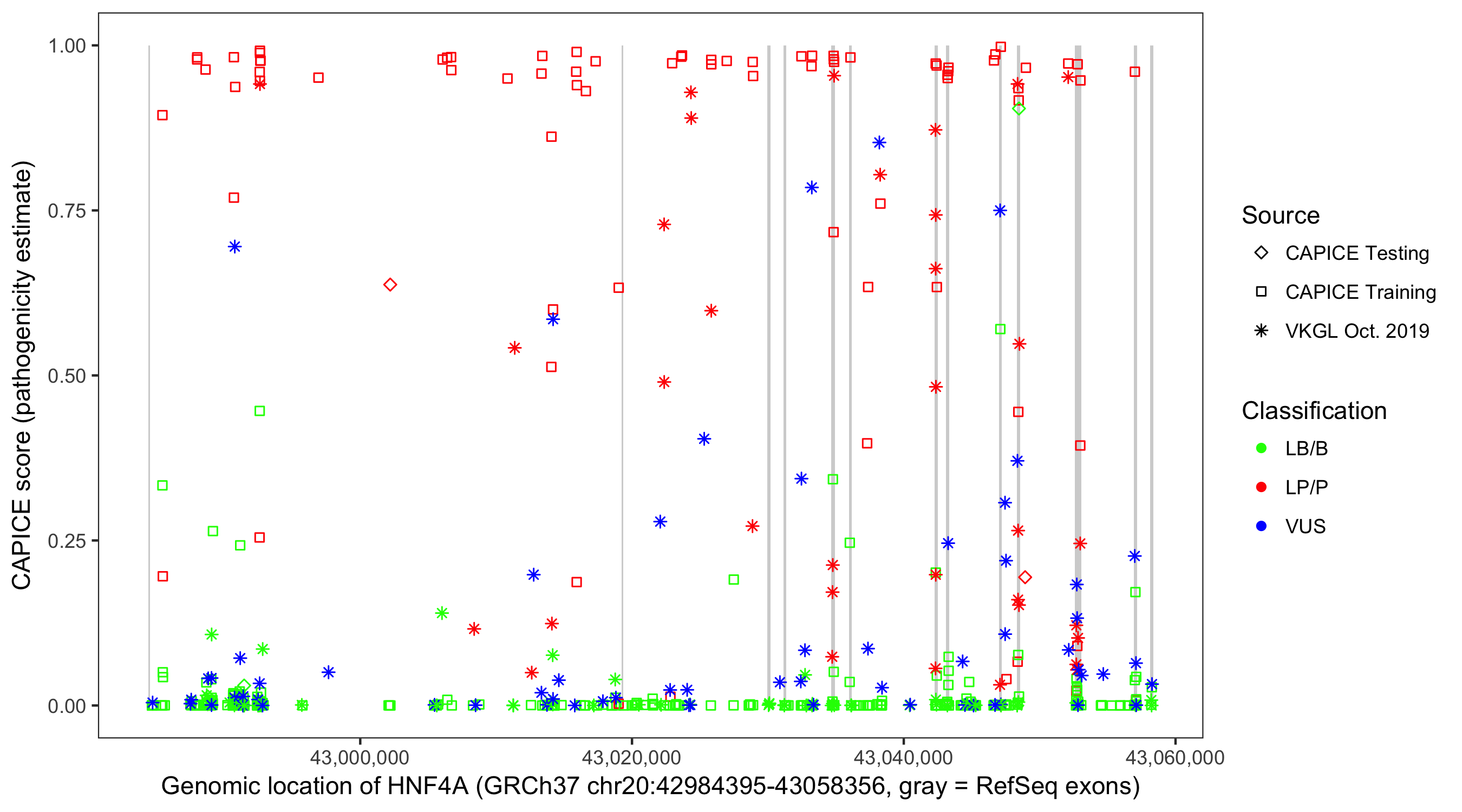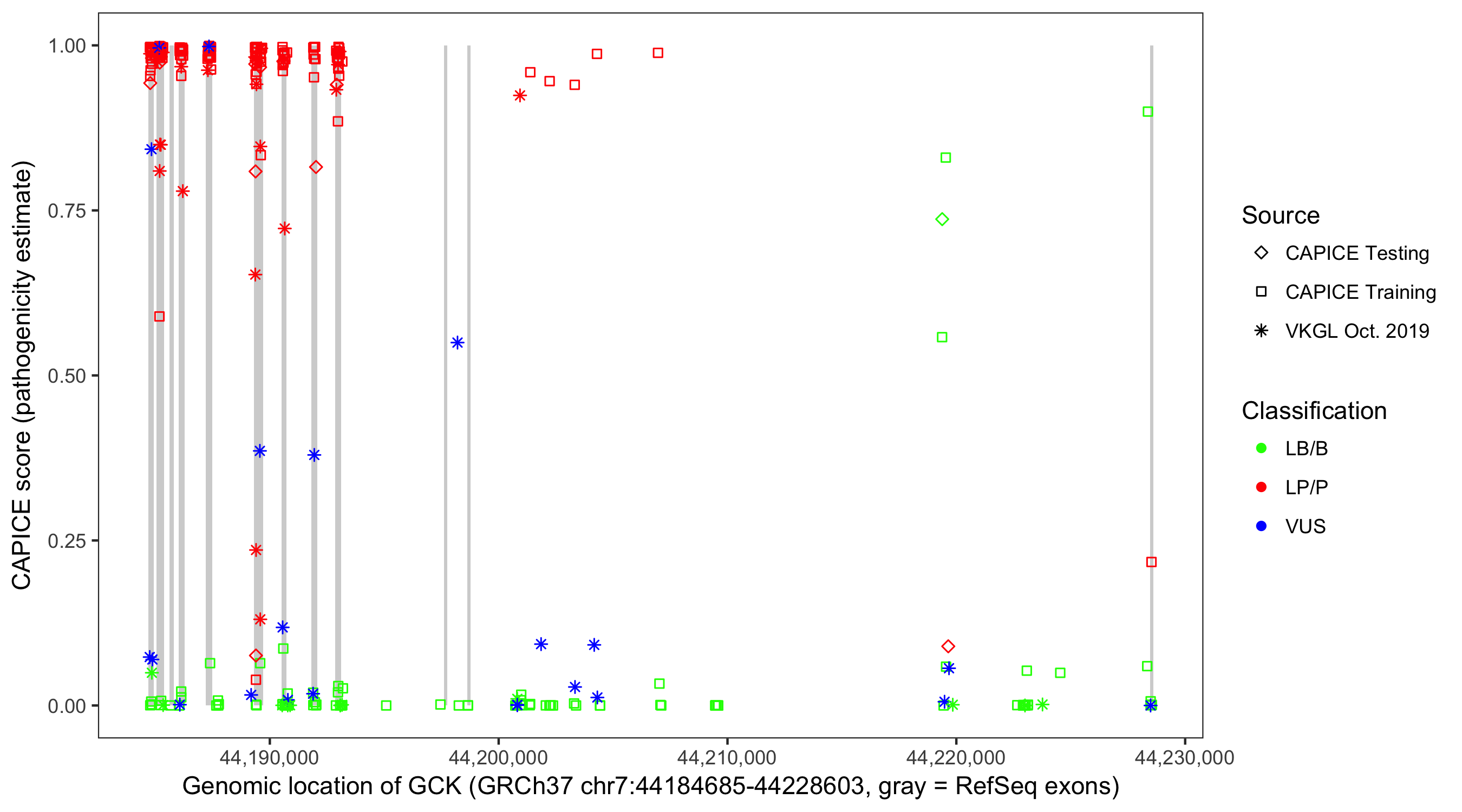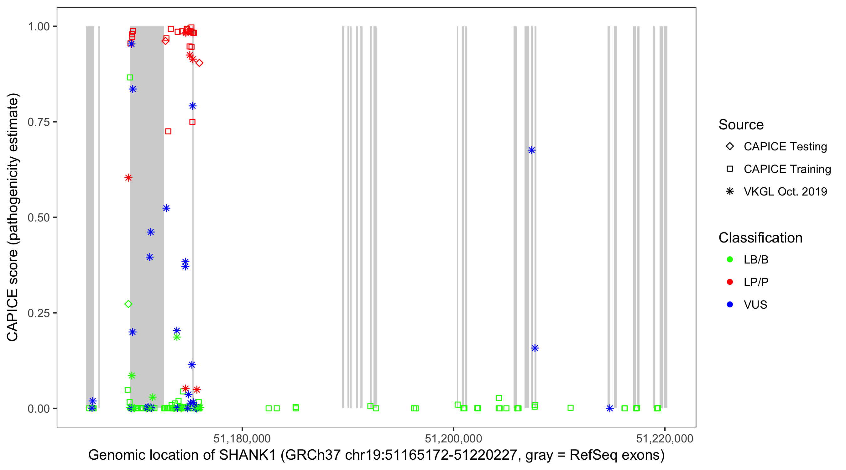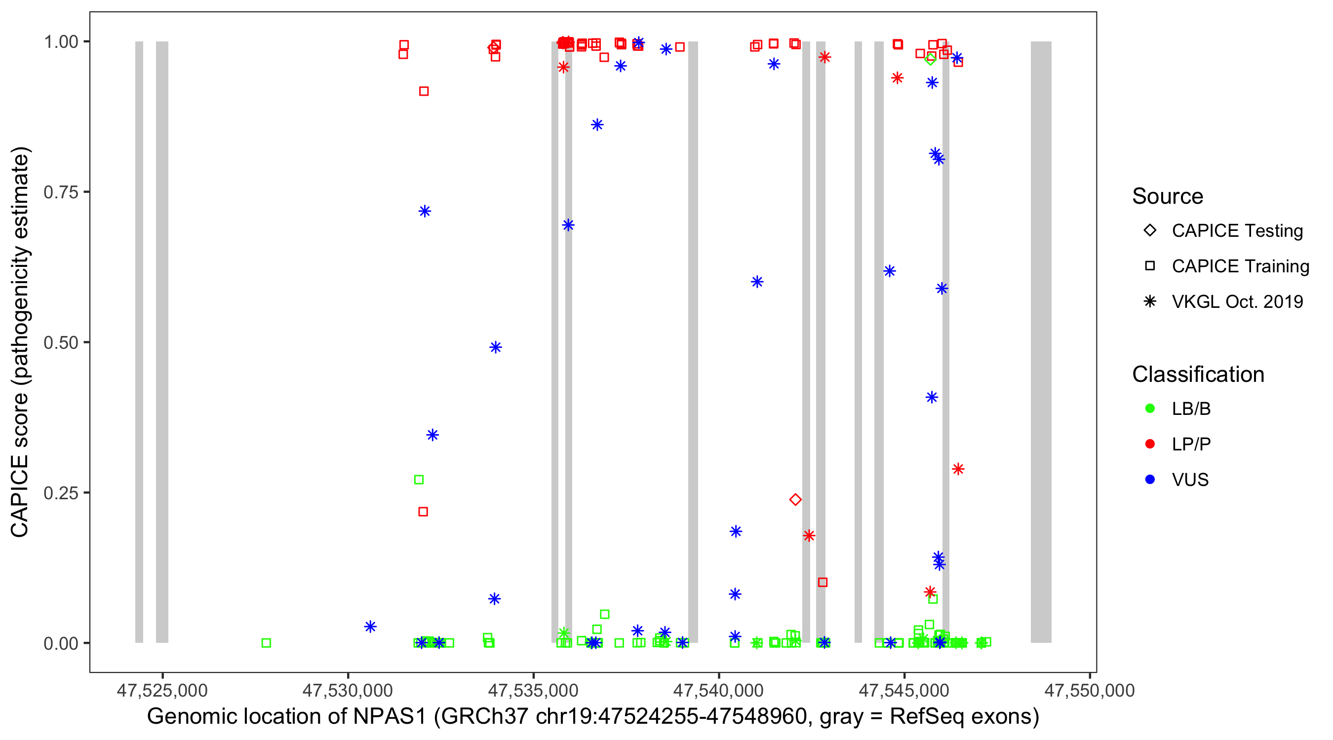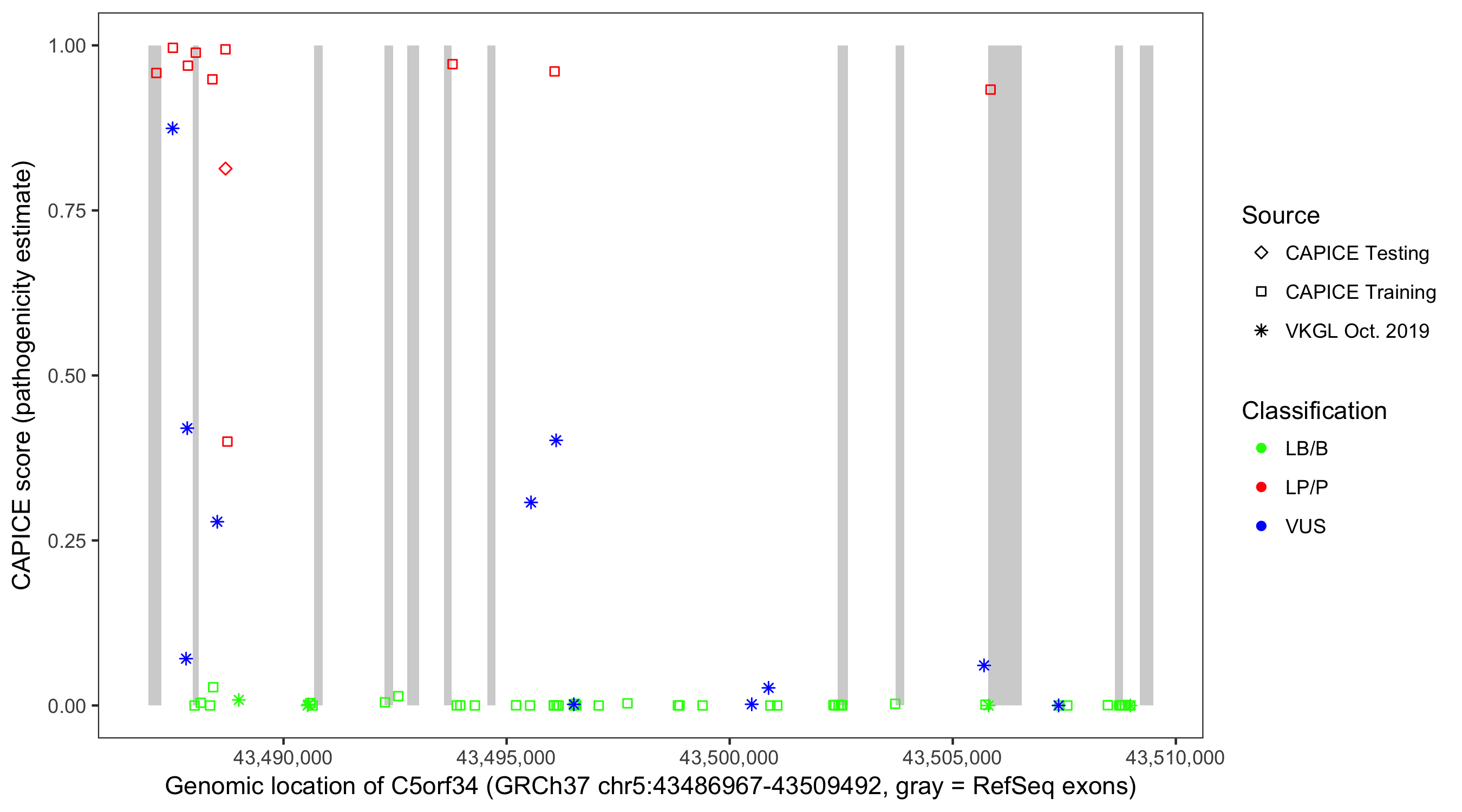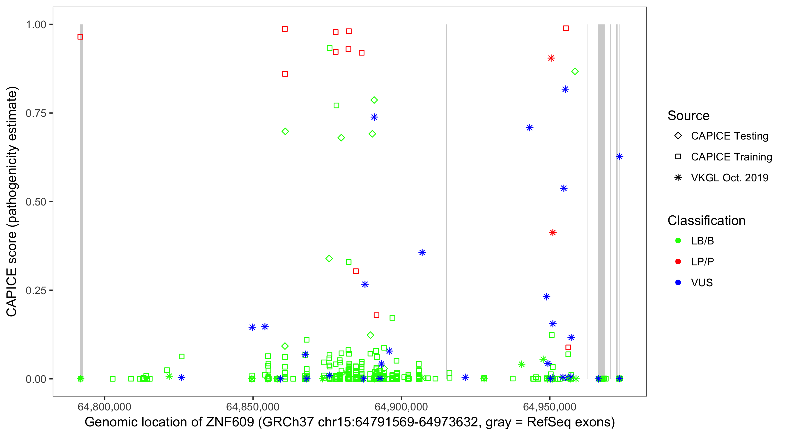 Shown are CAPICE train/test variants plus VKGL Oct 2019.