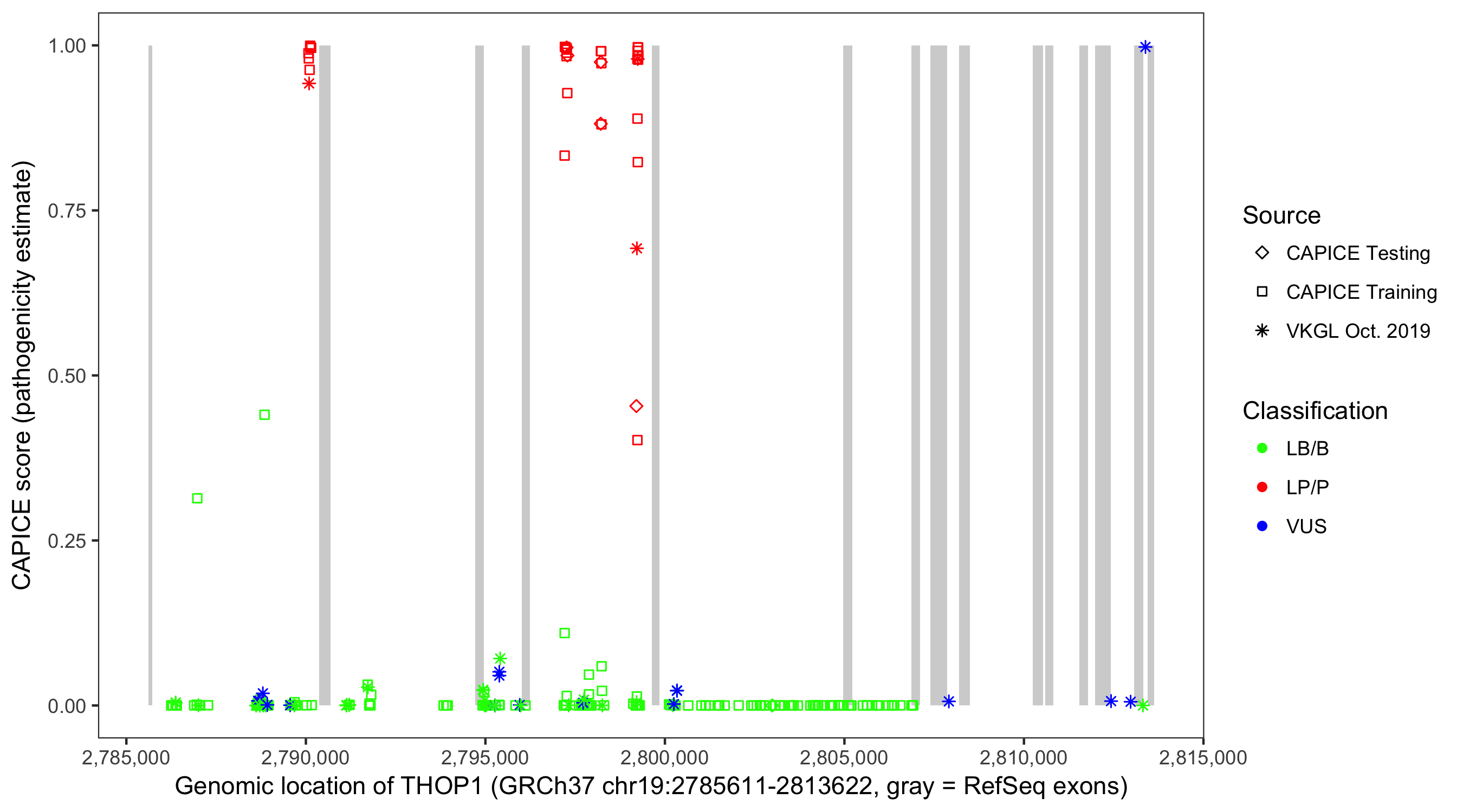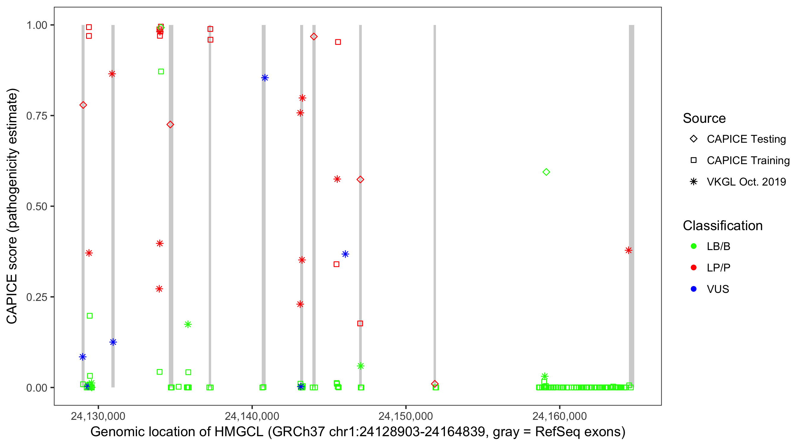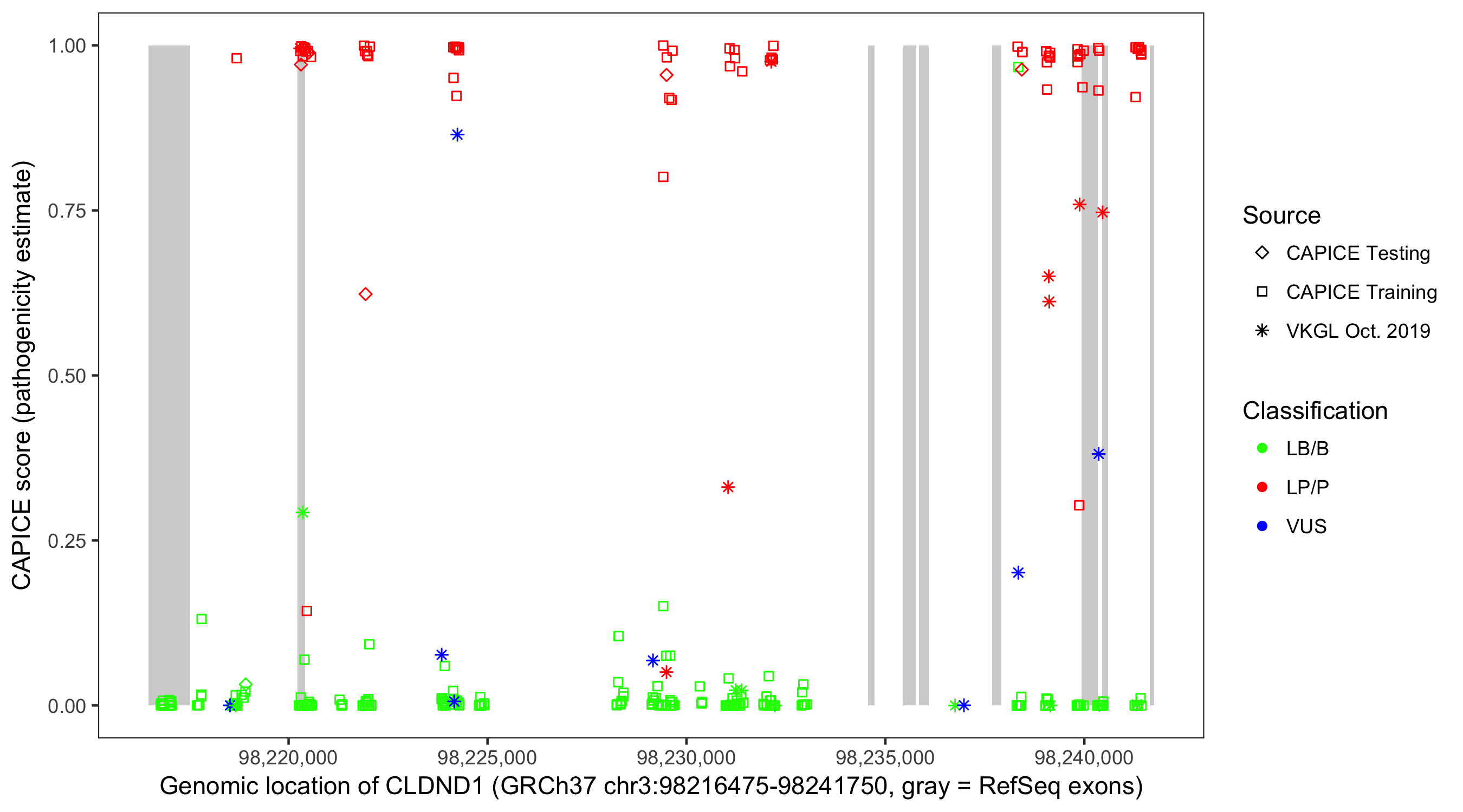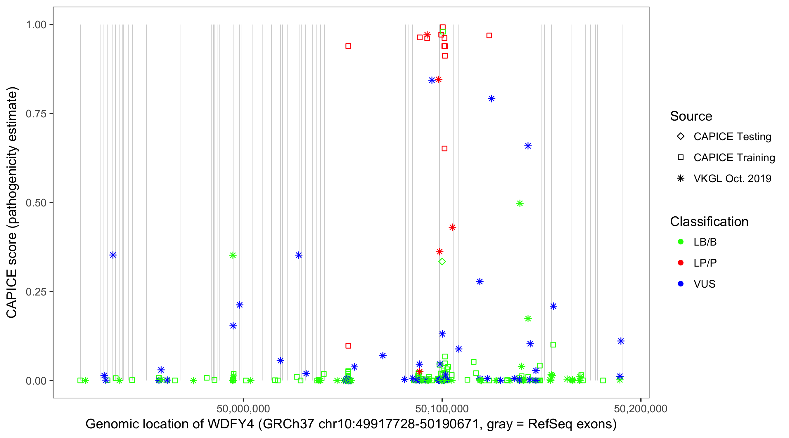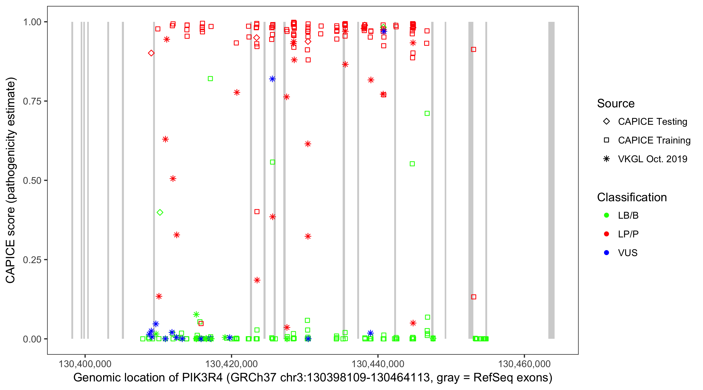 Shown are CAPICE train/test variants plus VKGL Oct 2019.