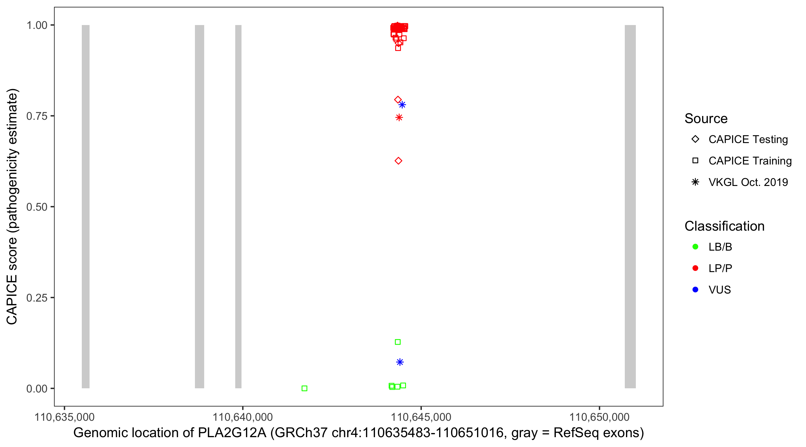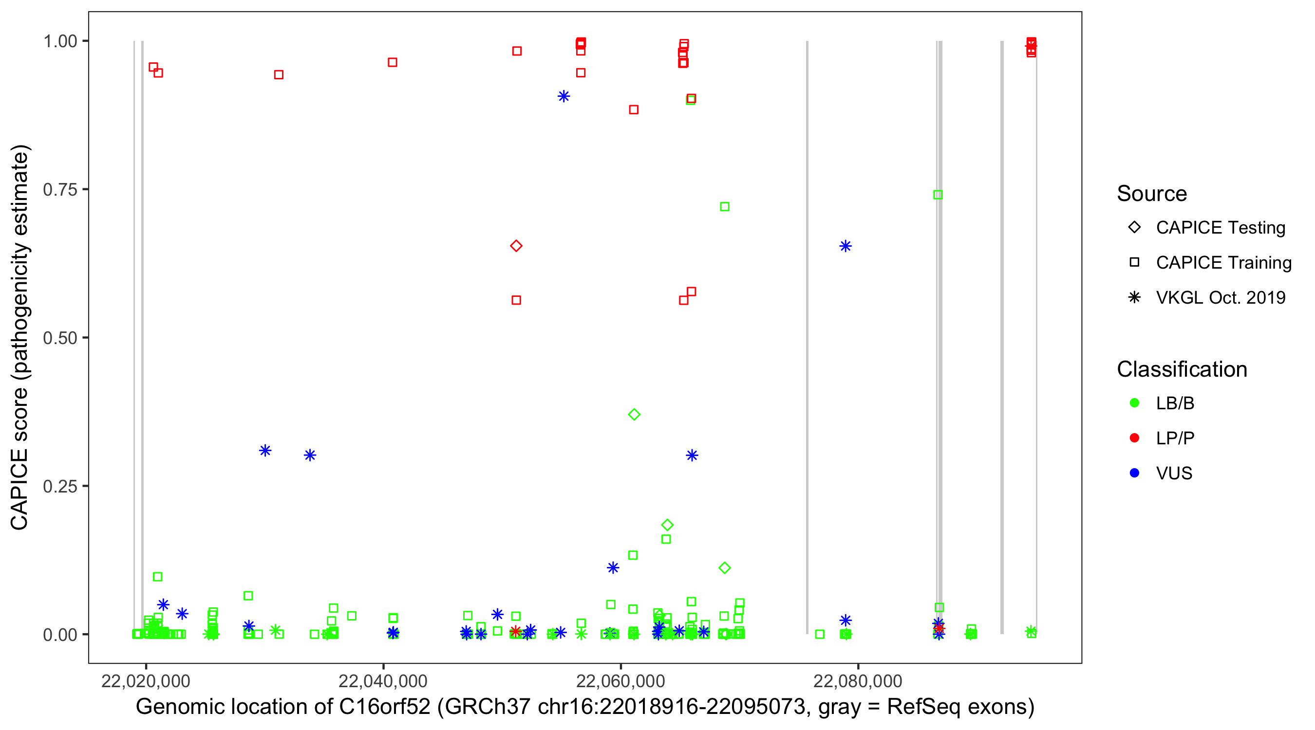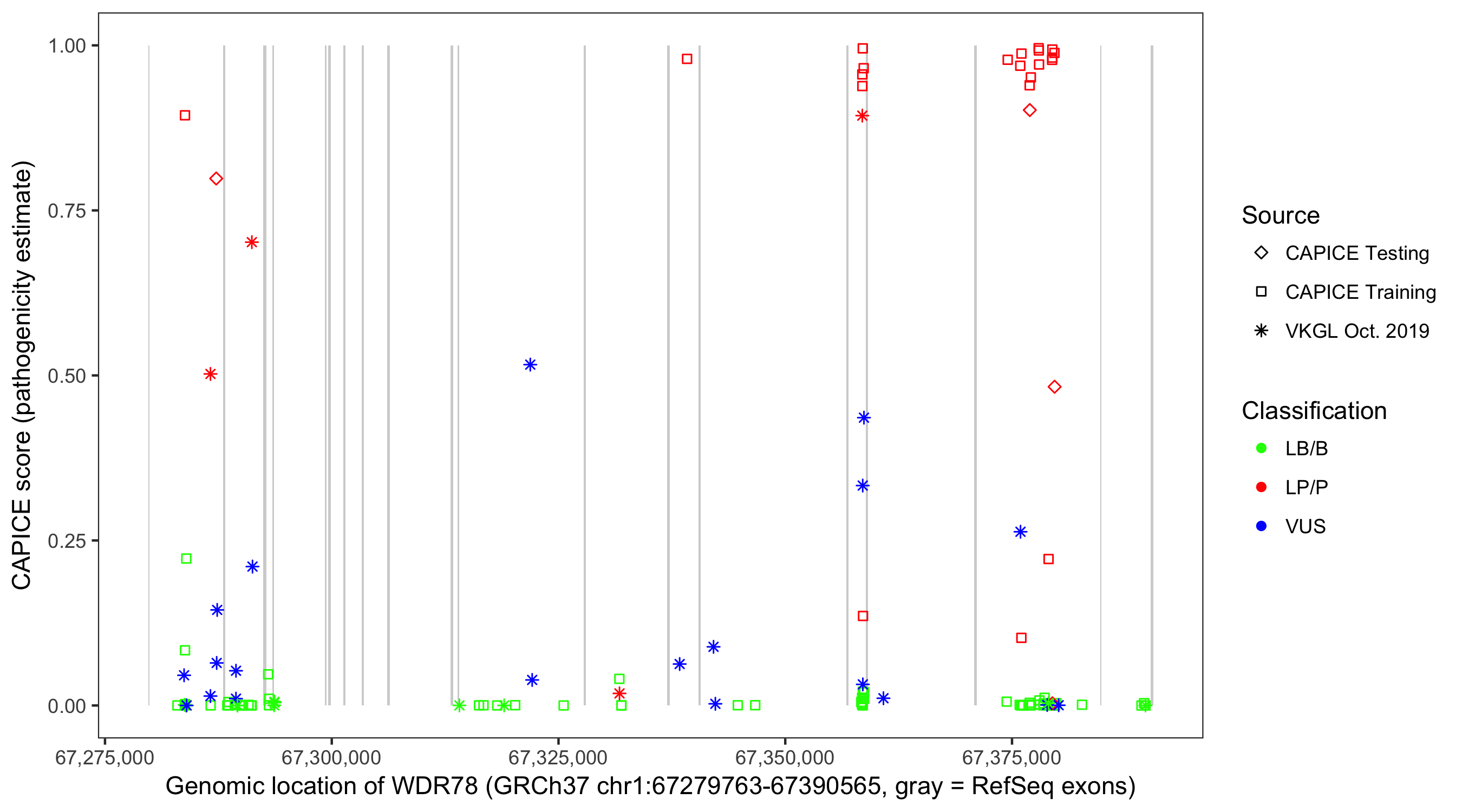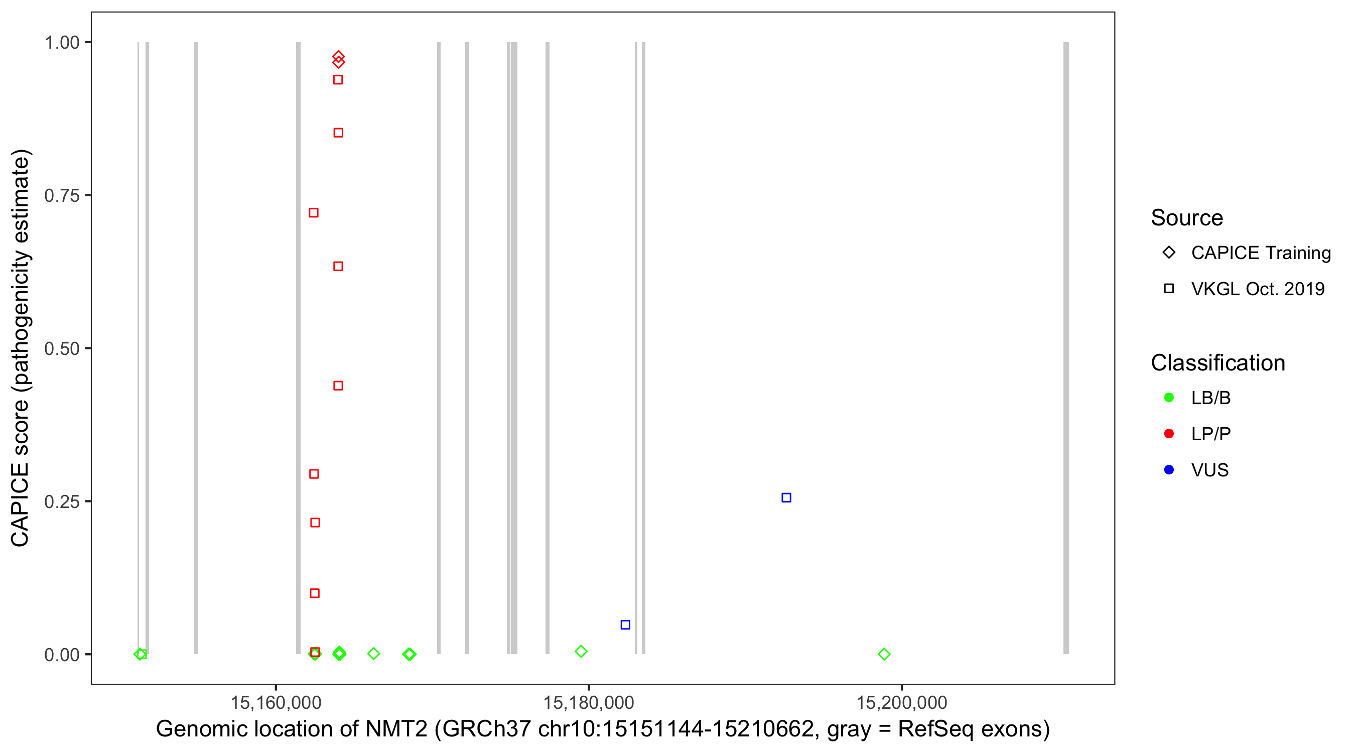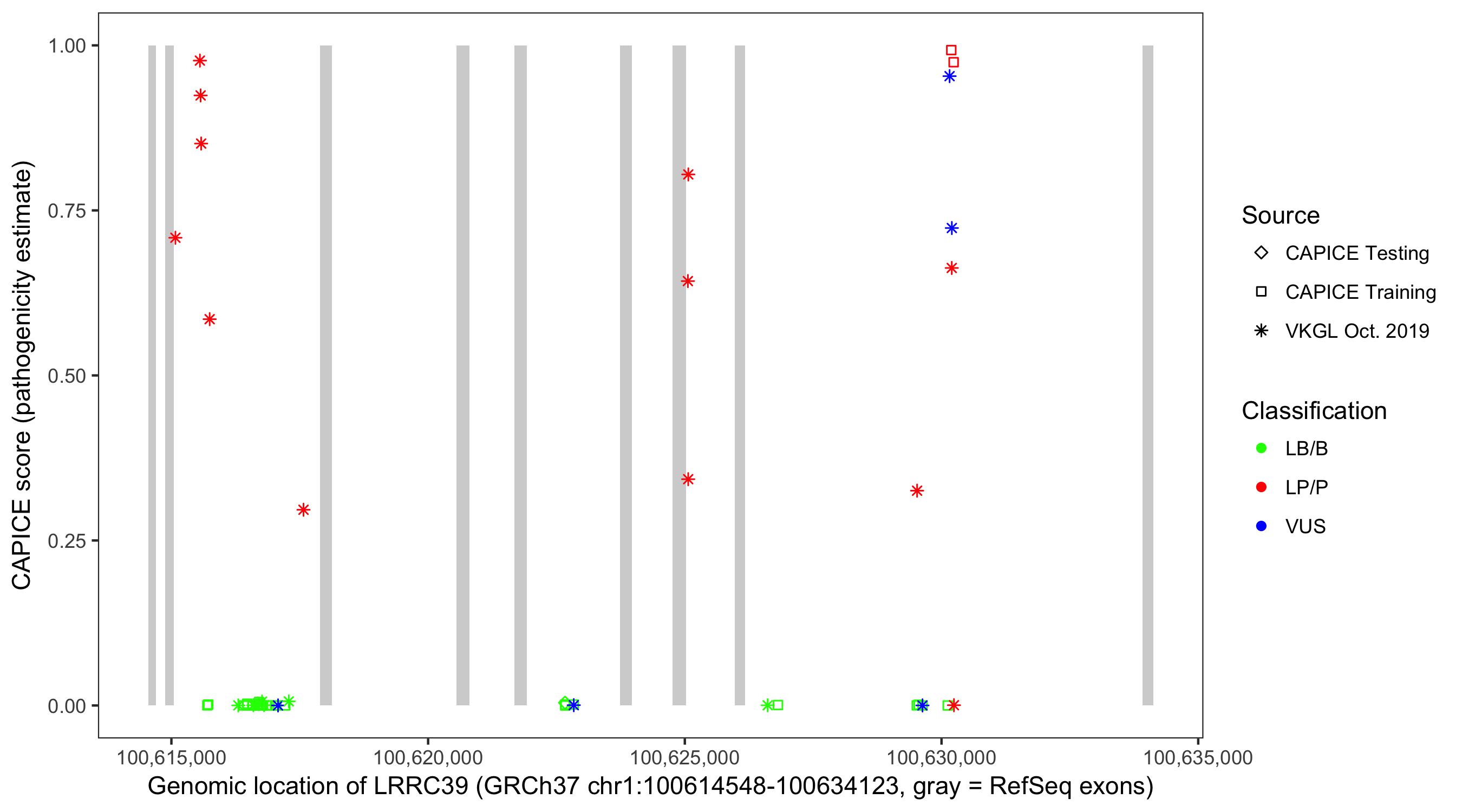 Shown are CAPICE train/test variants plus VKGL Oct 2019.