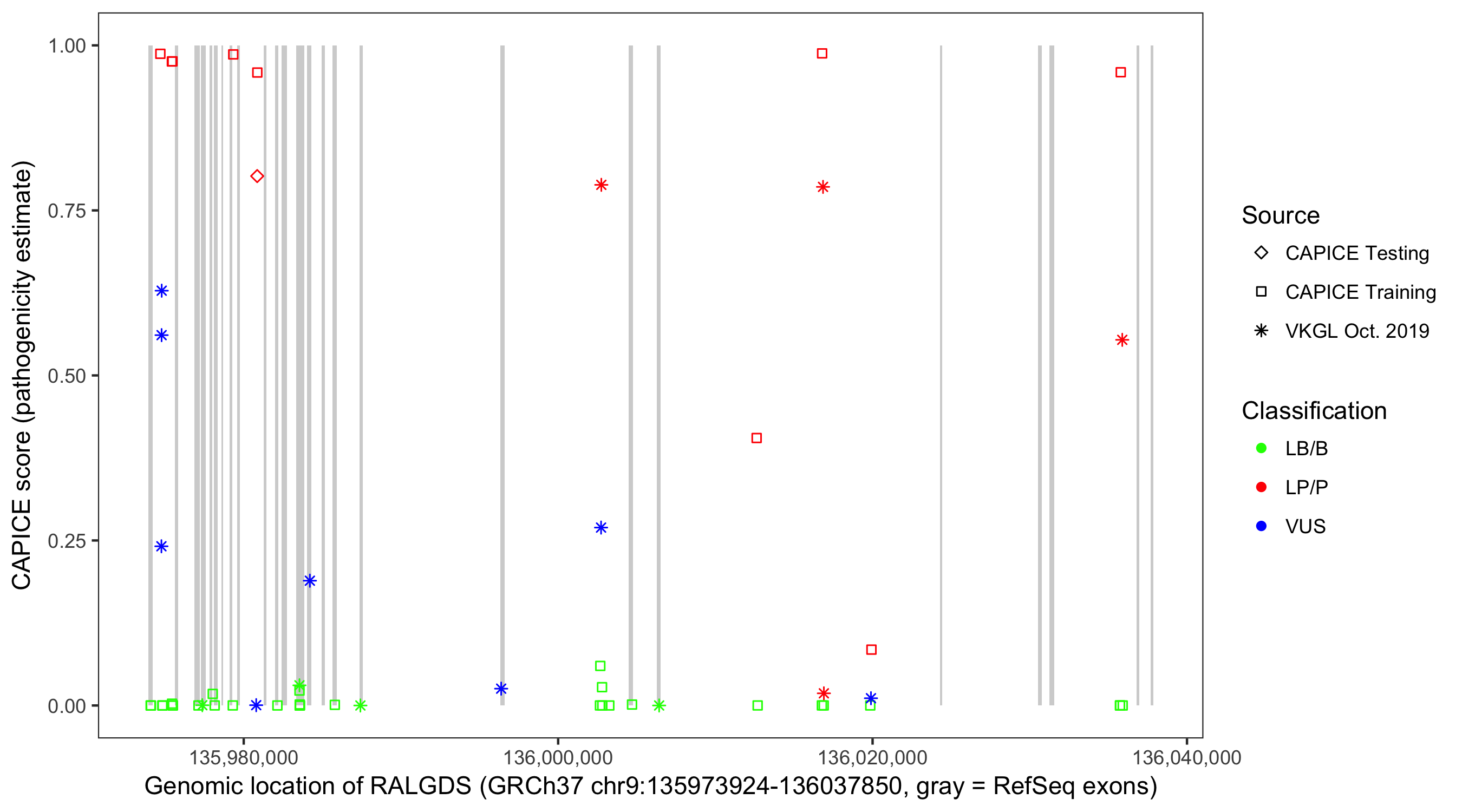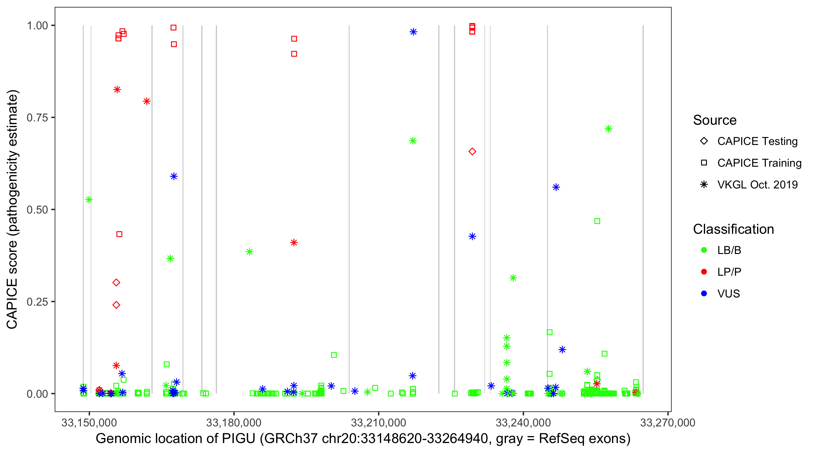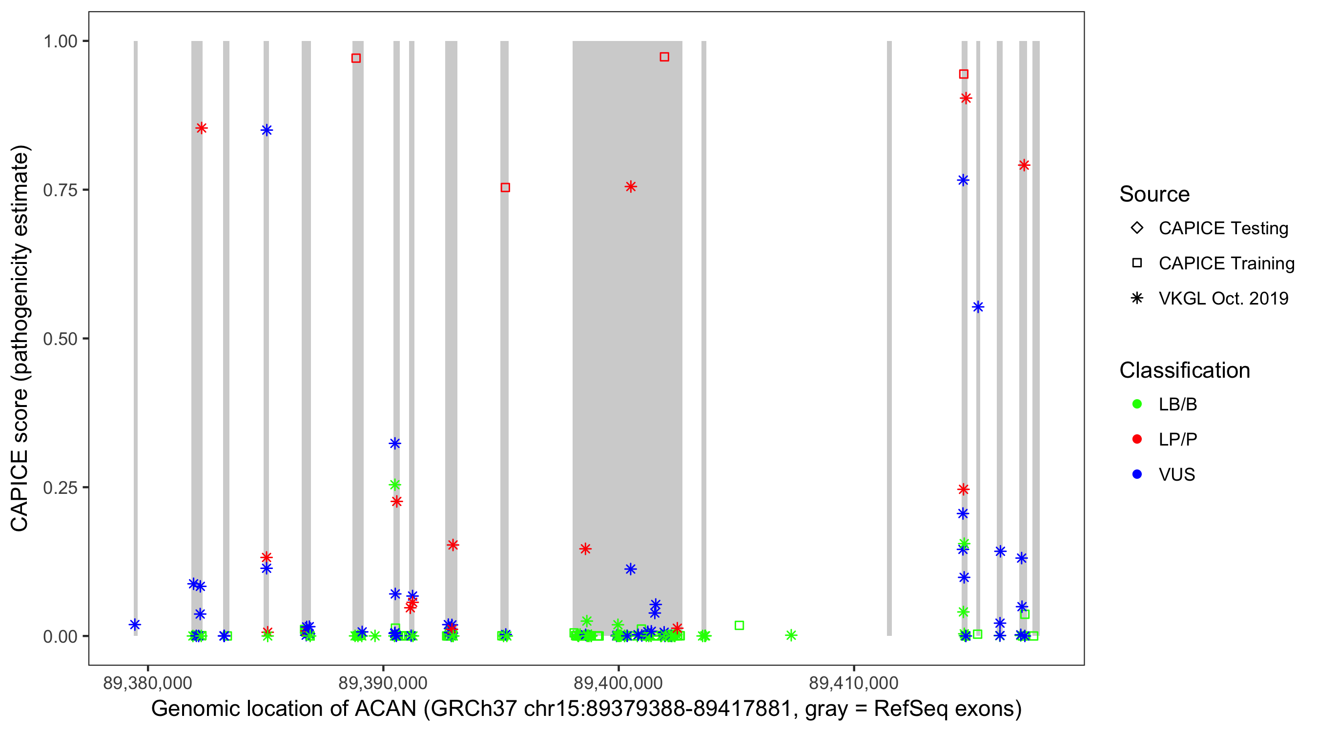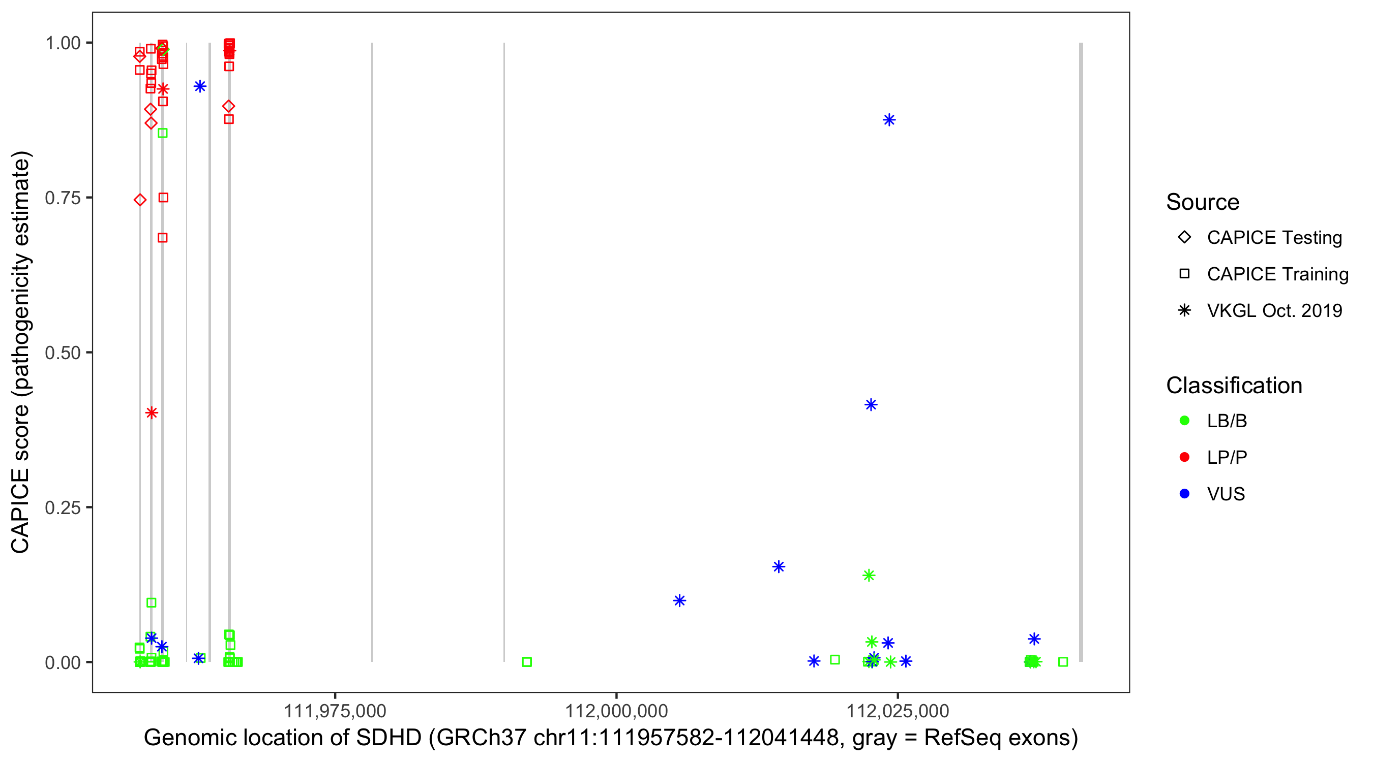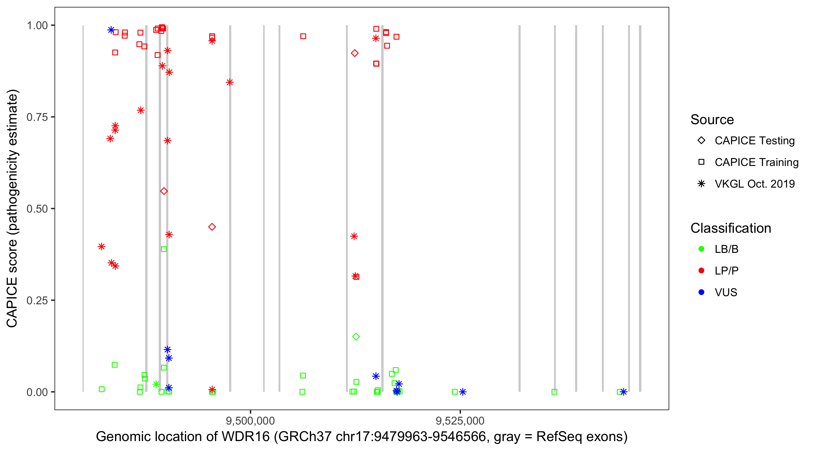 Shown are CAPICE train/test variants plus VKGL Oct 2019.