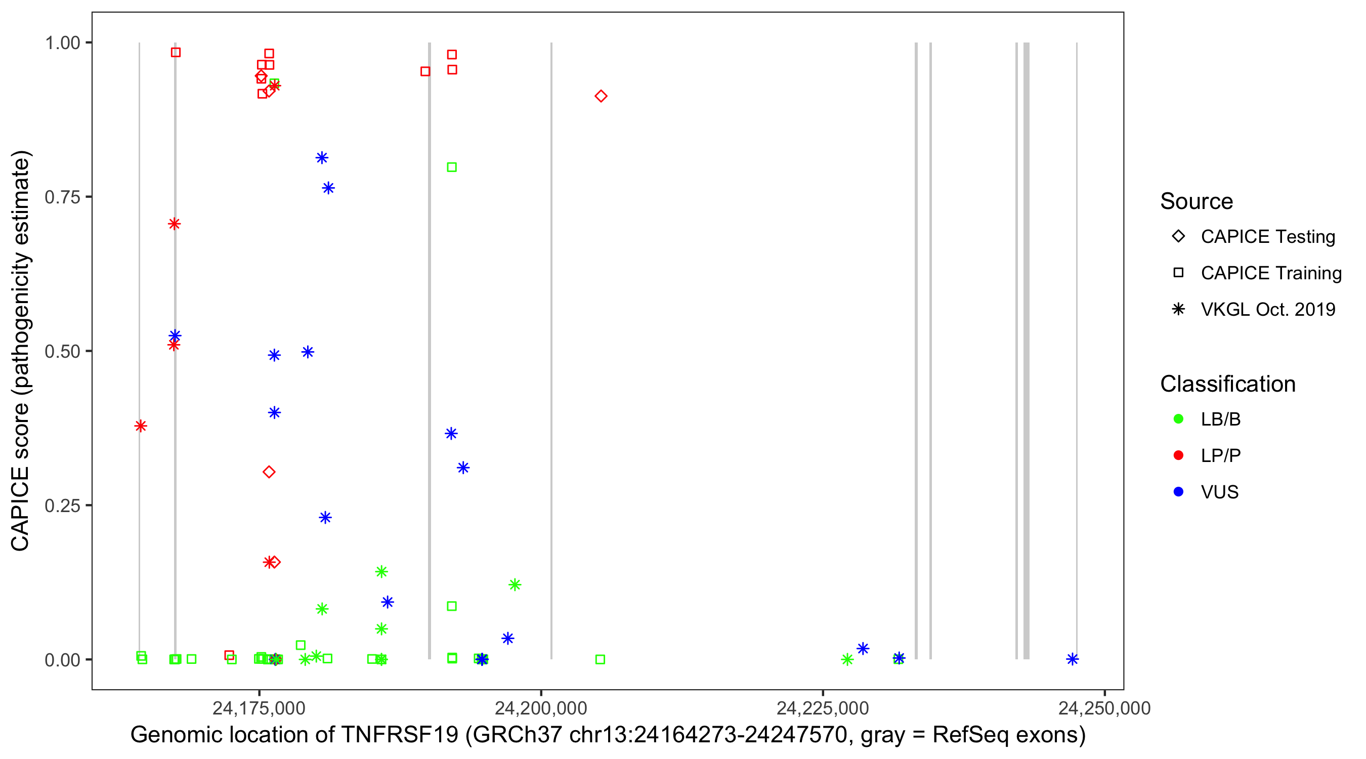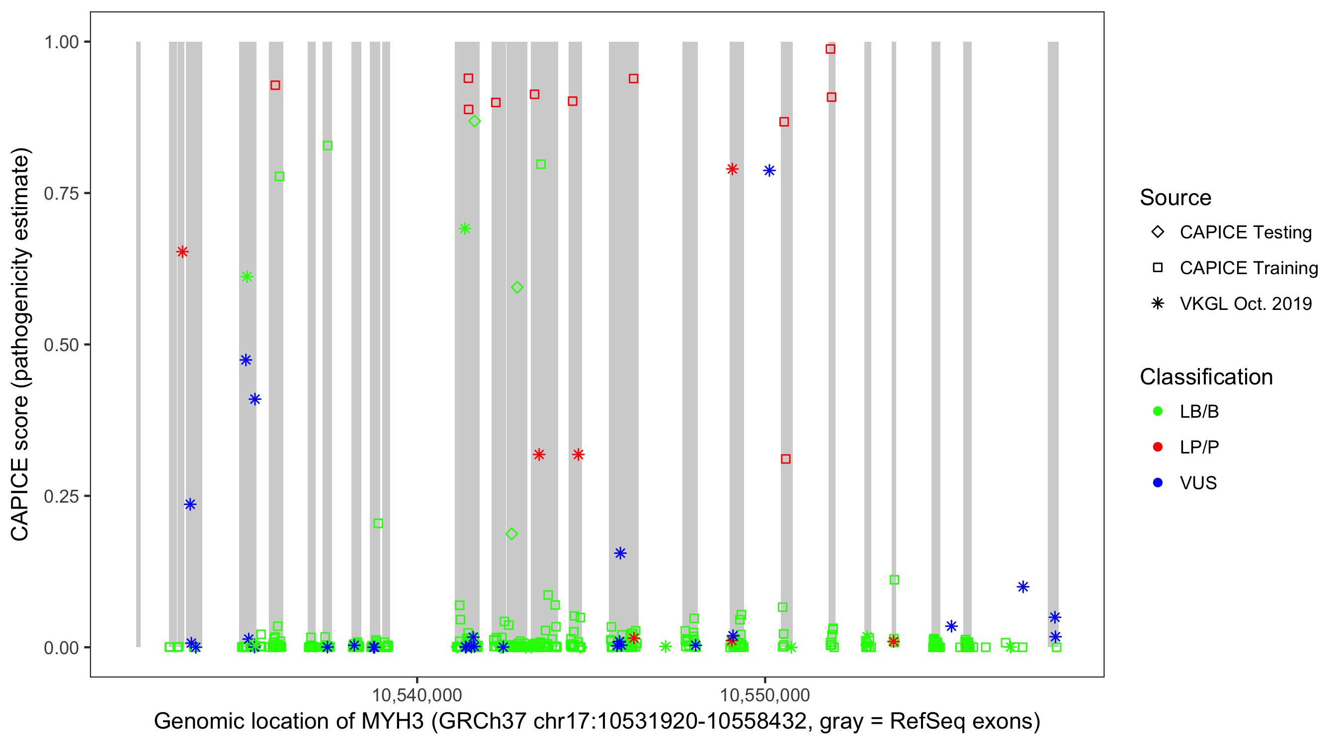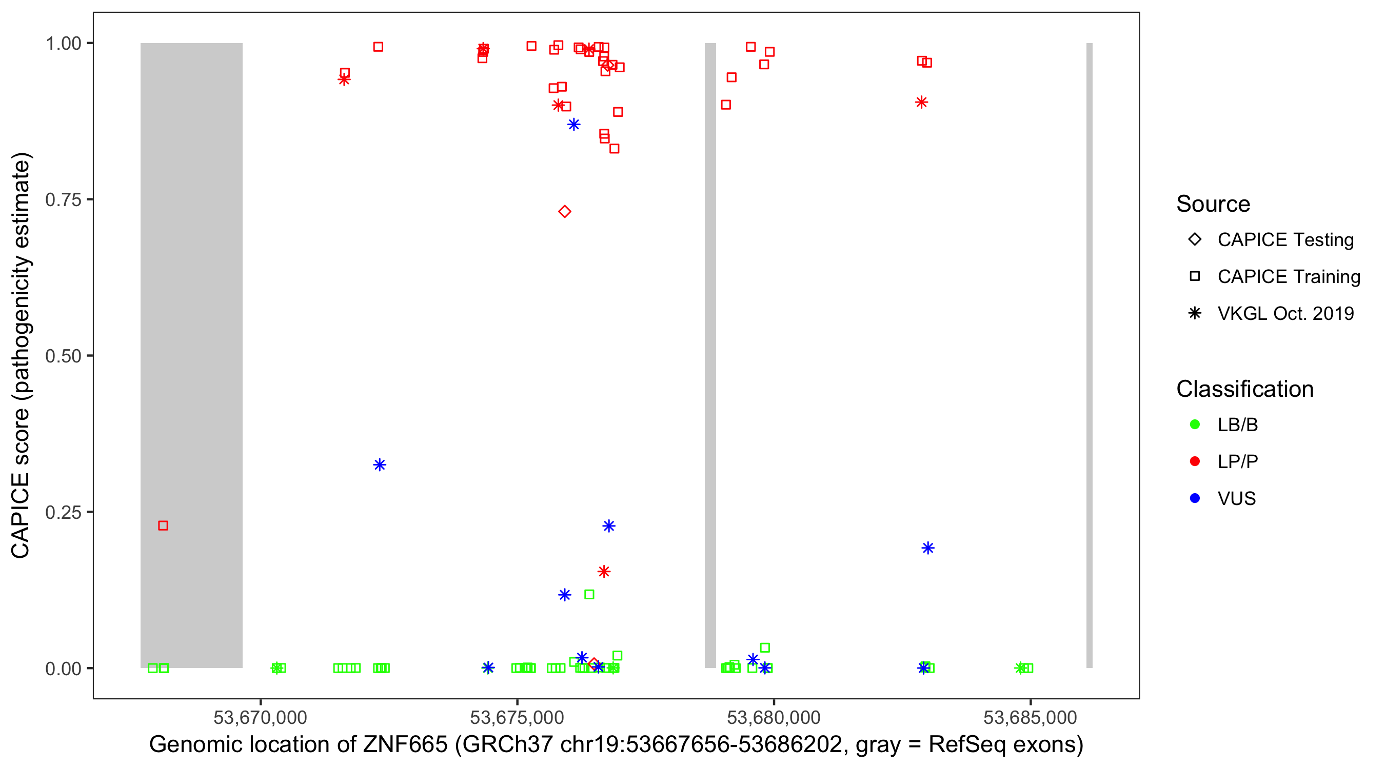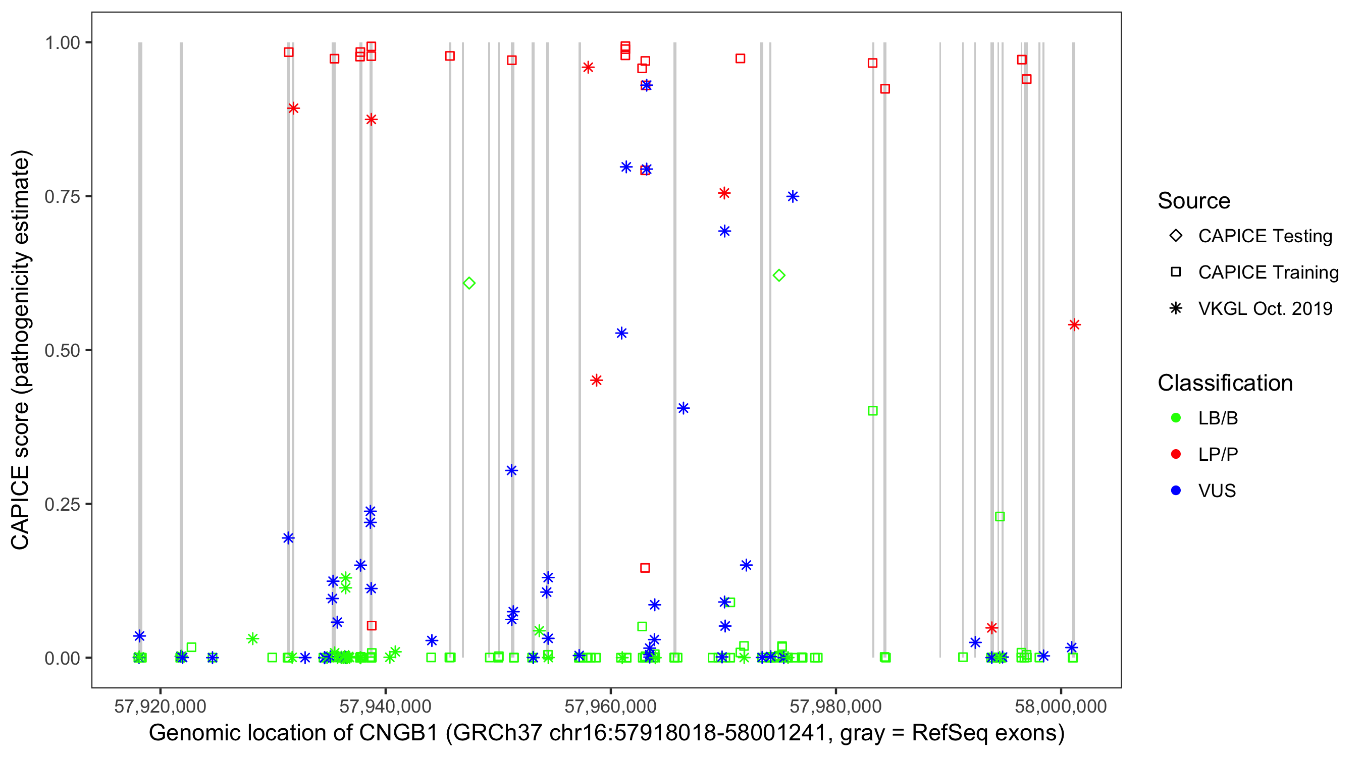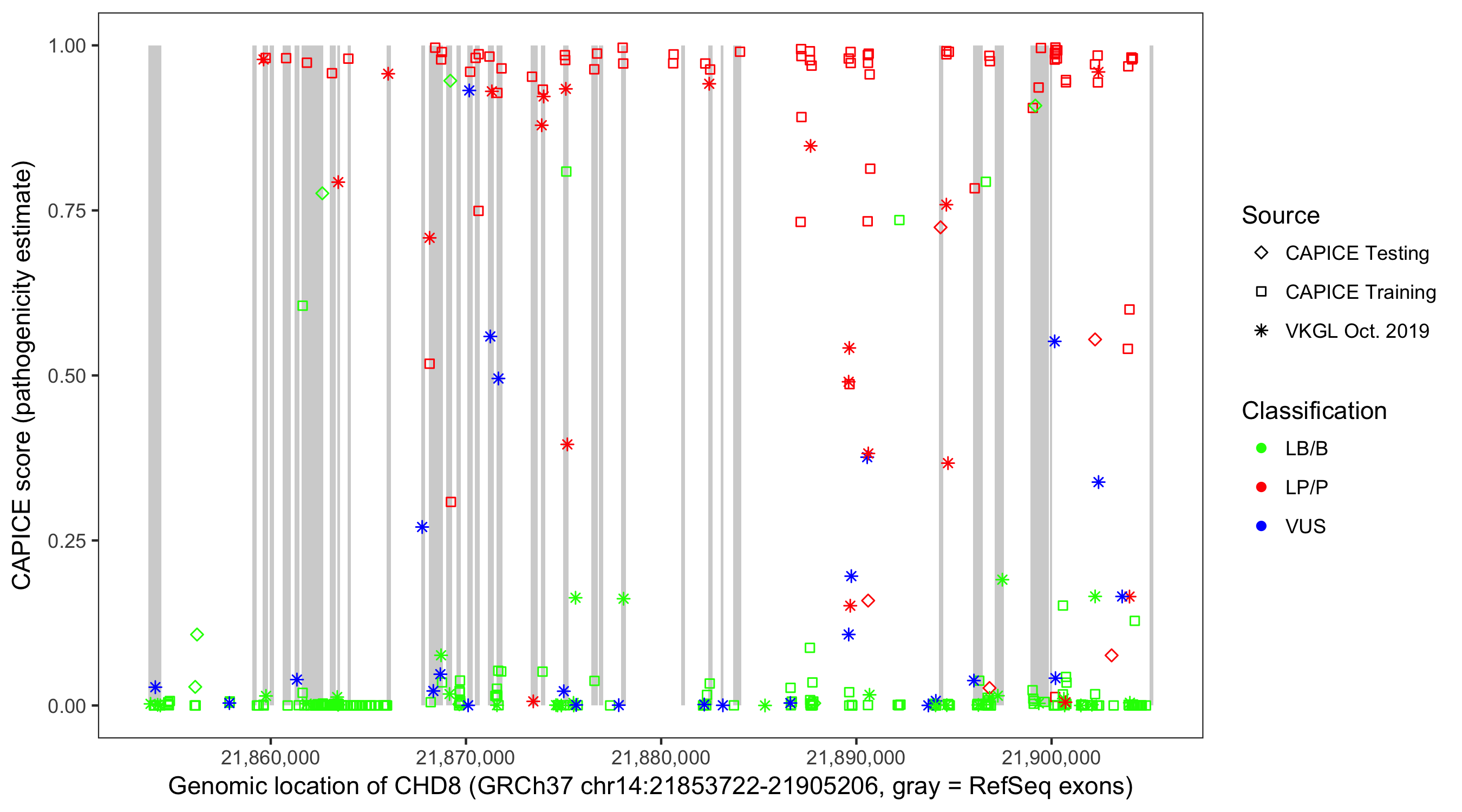 Shown are CAPICE train/test variants plus VKGL Oct 2019.