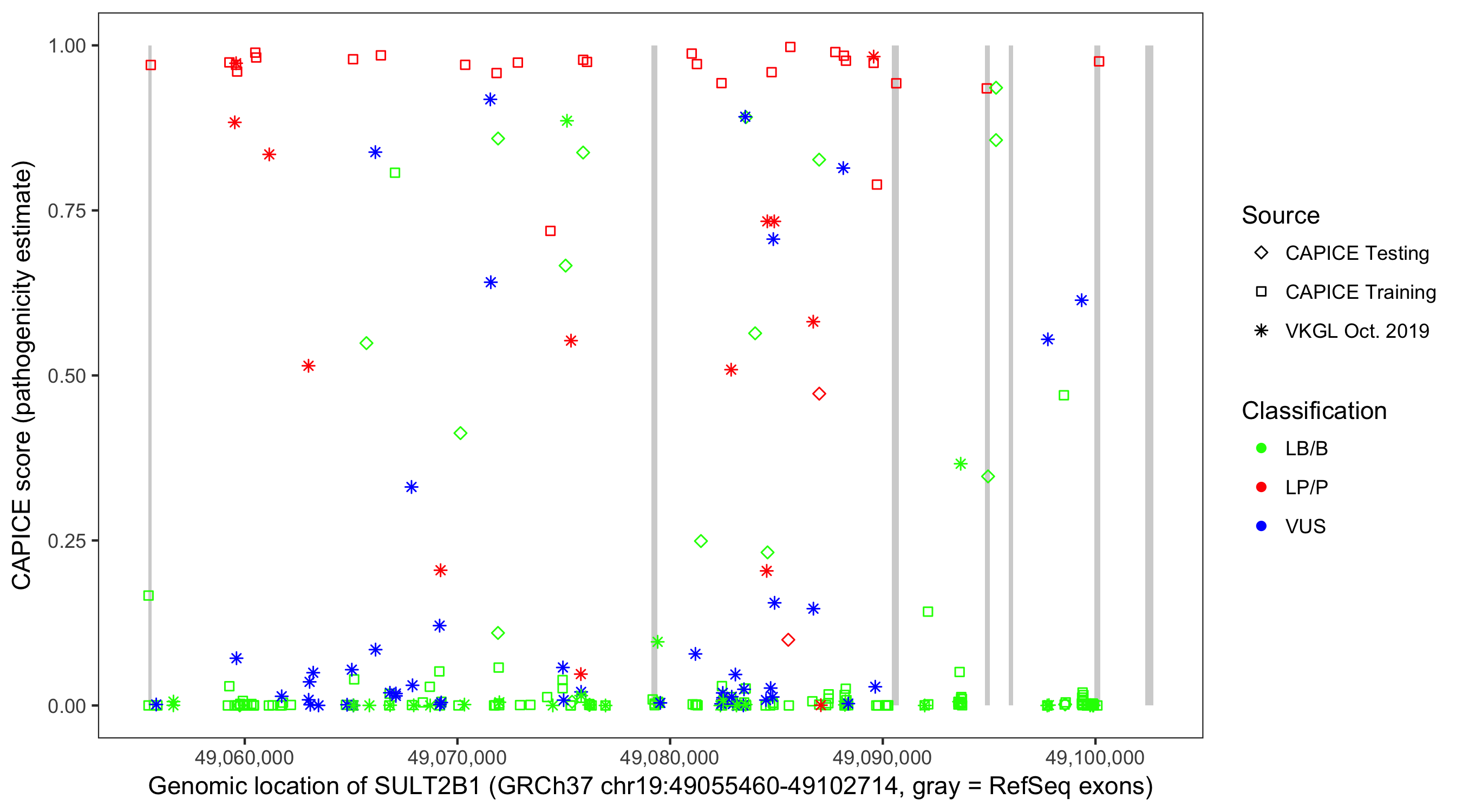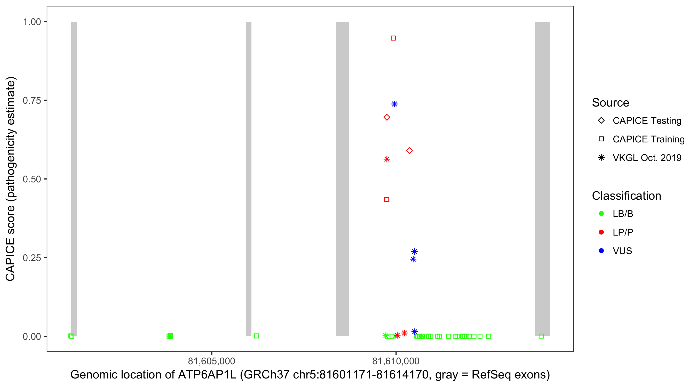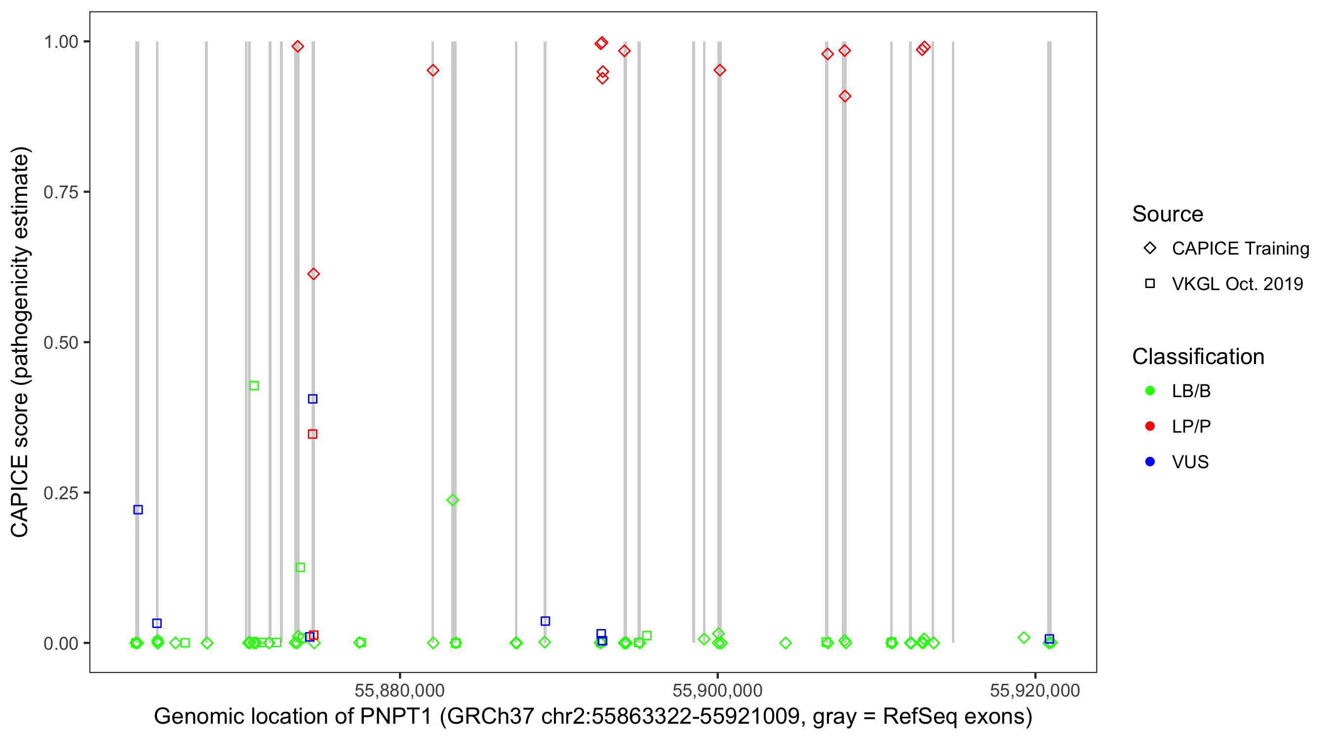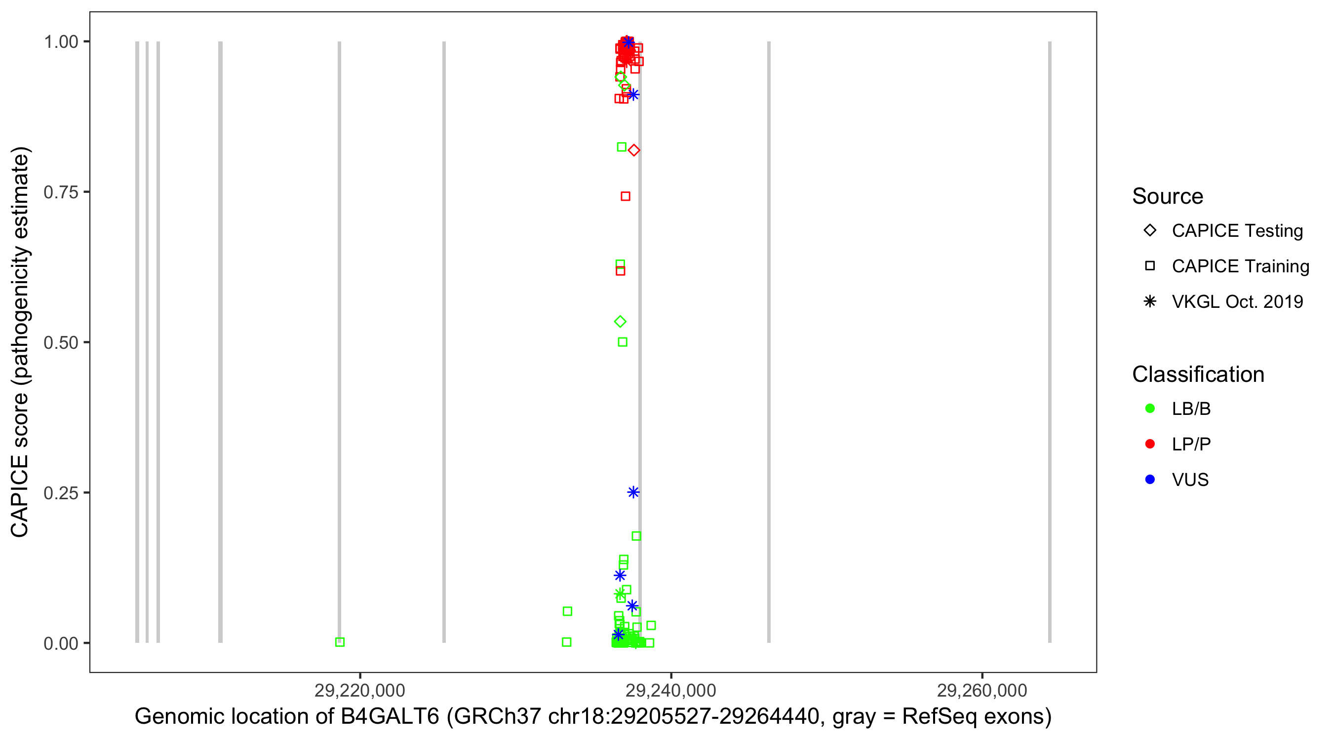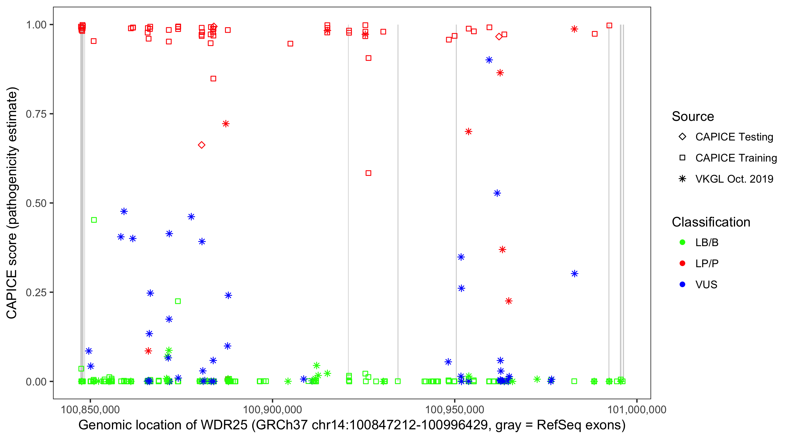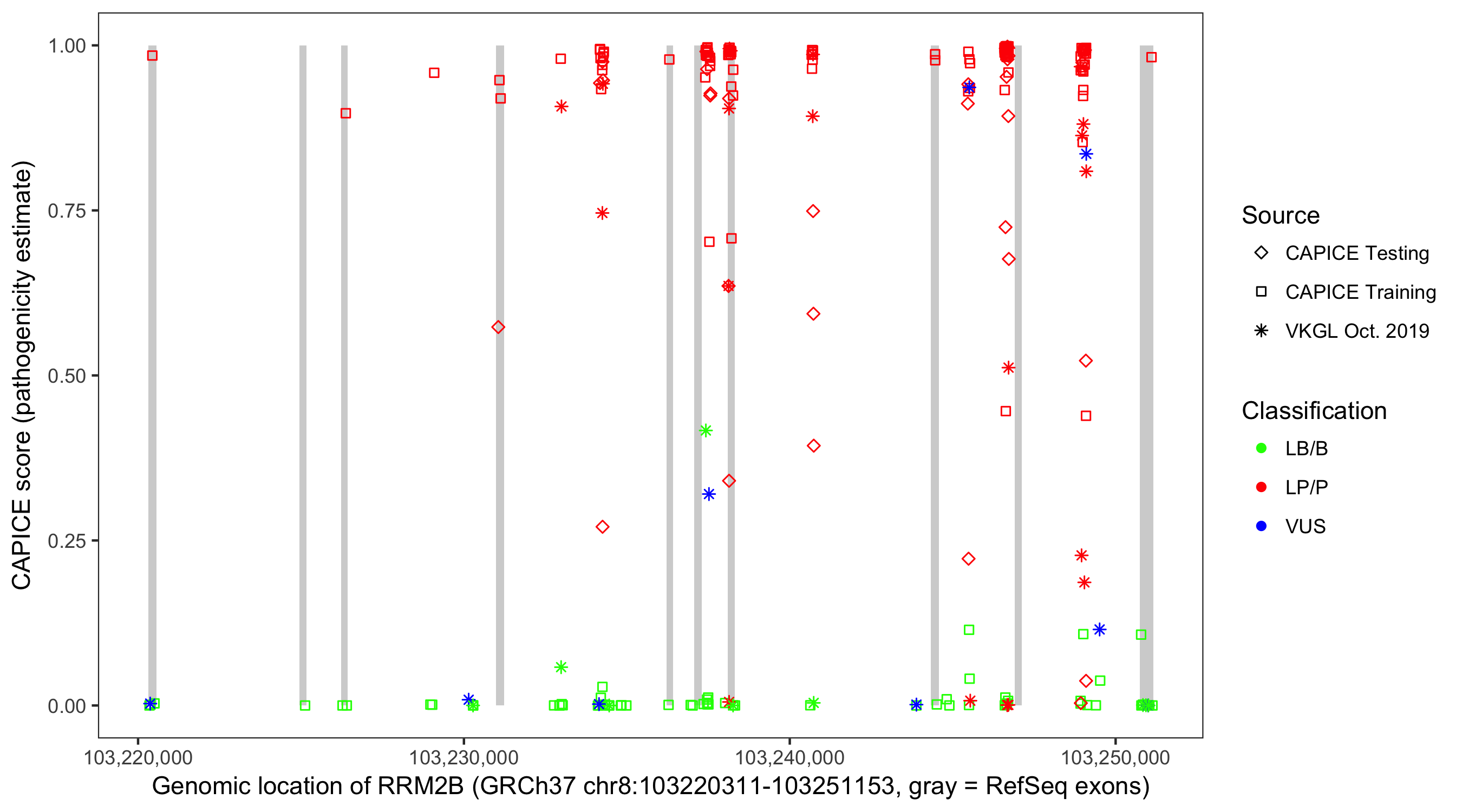 Shown are CAPICE train/test variants plus VKGL Oct 2019.