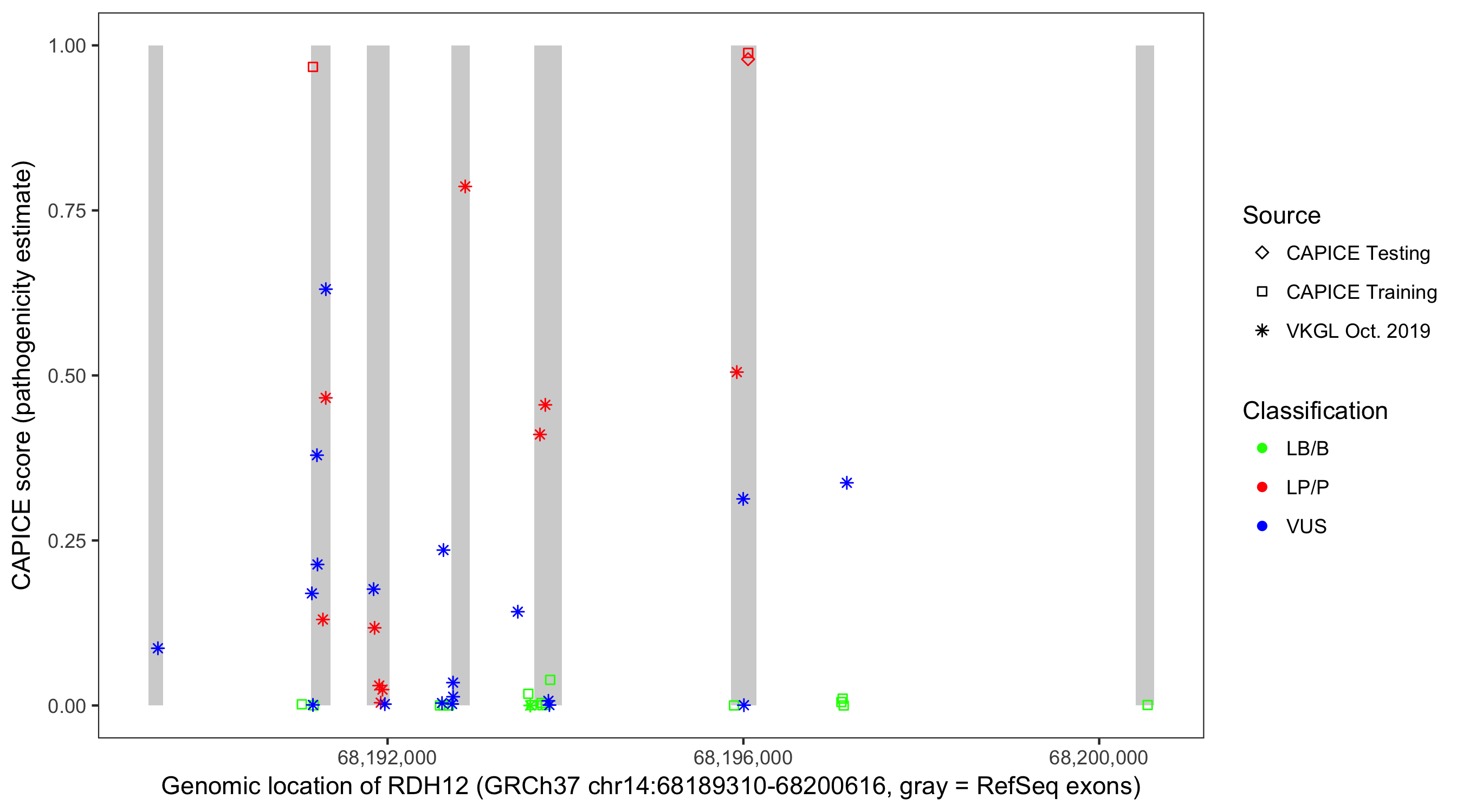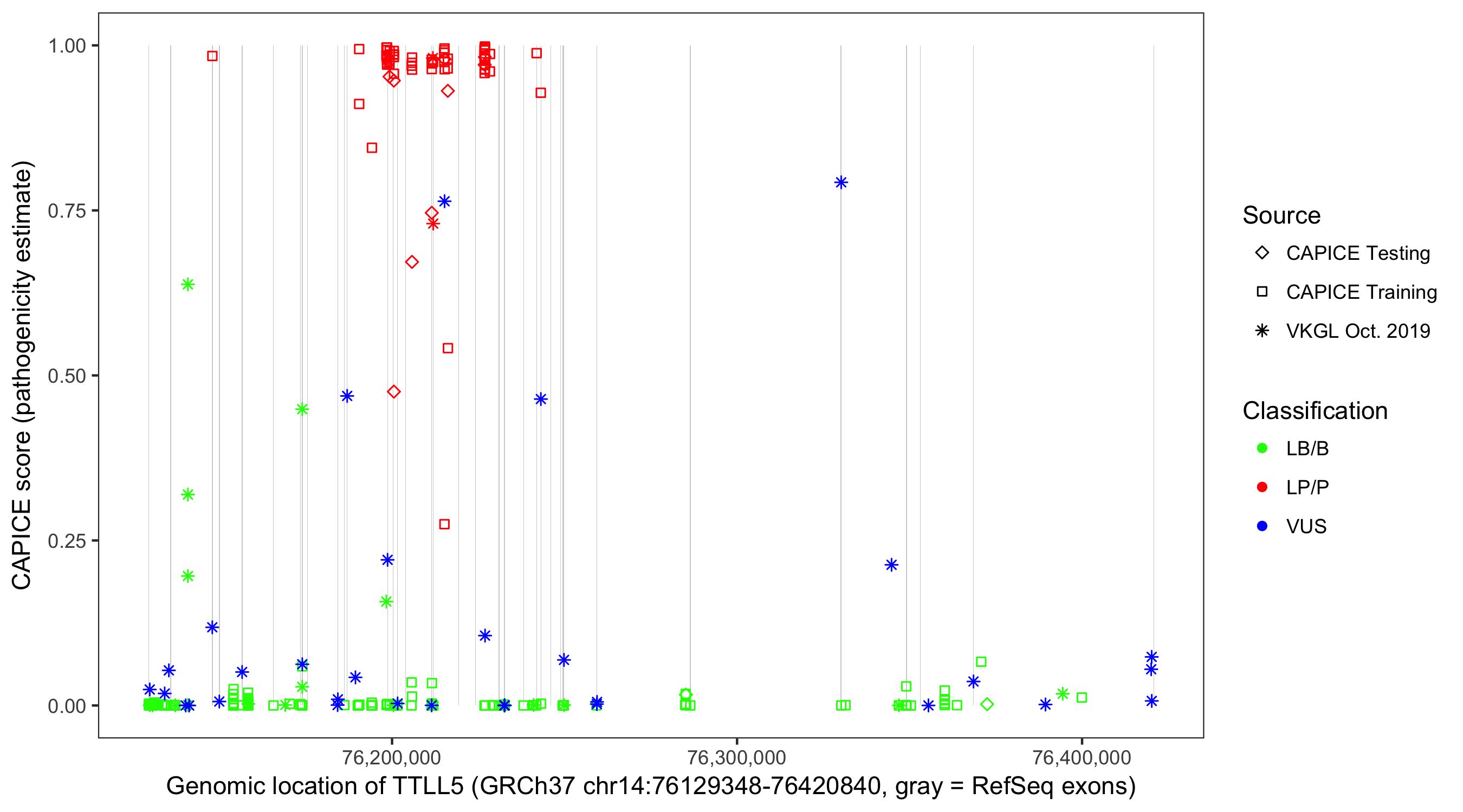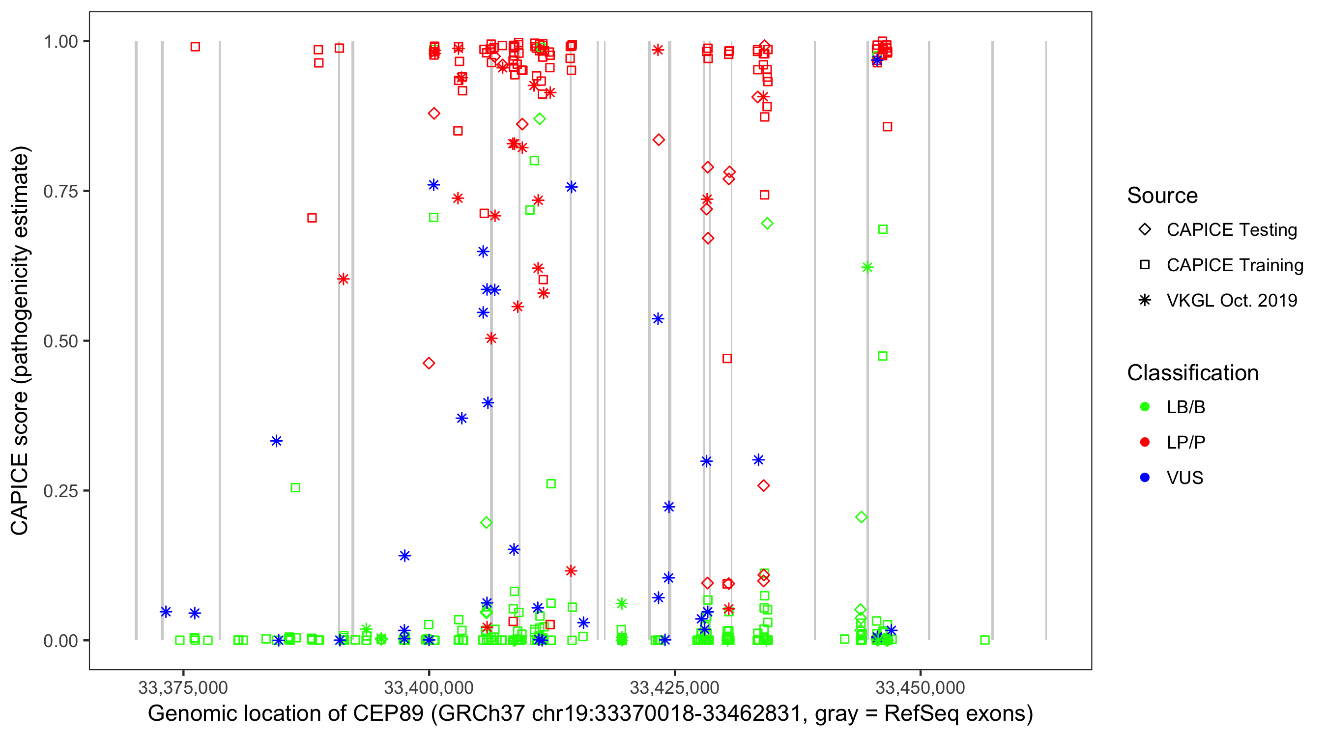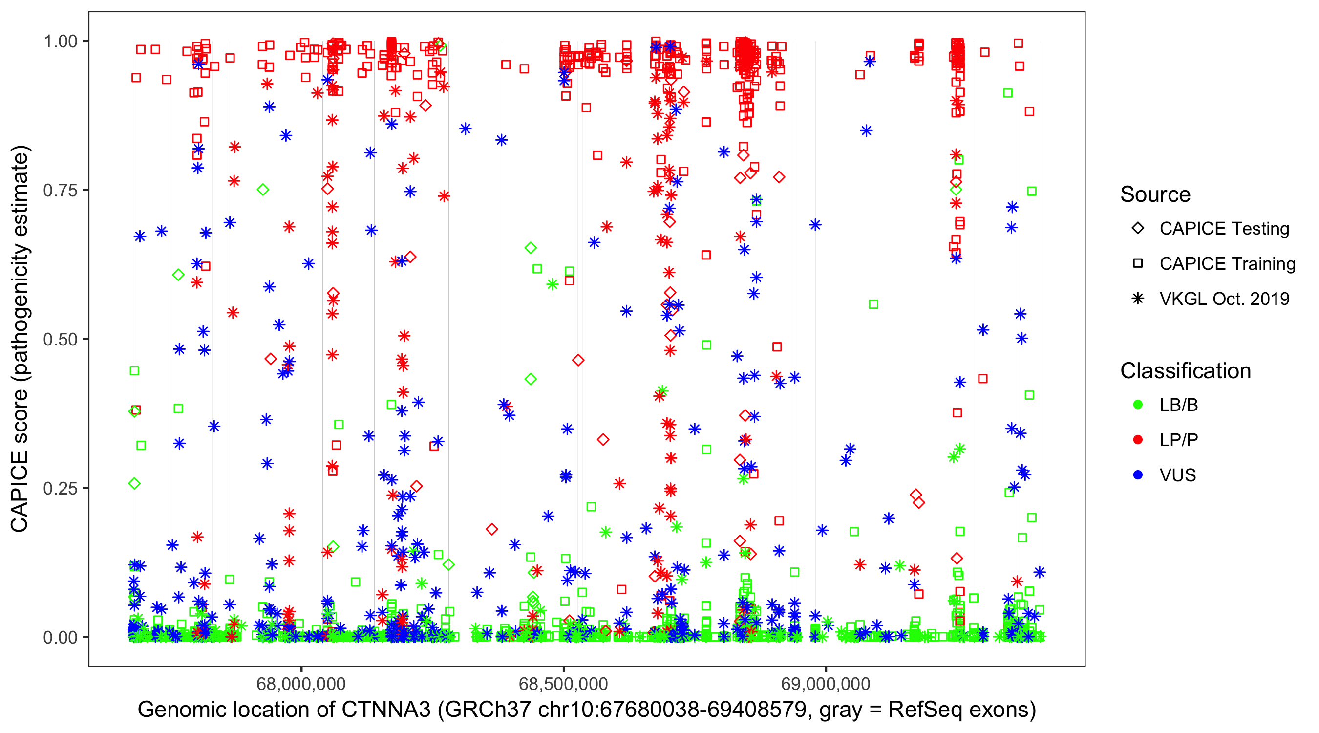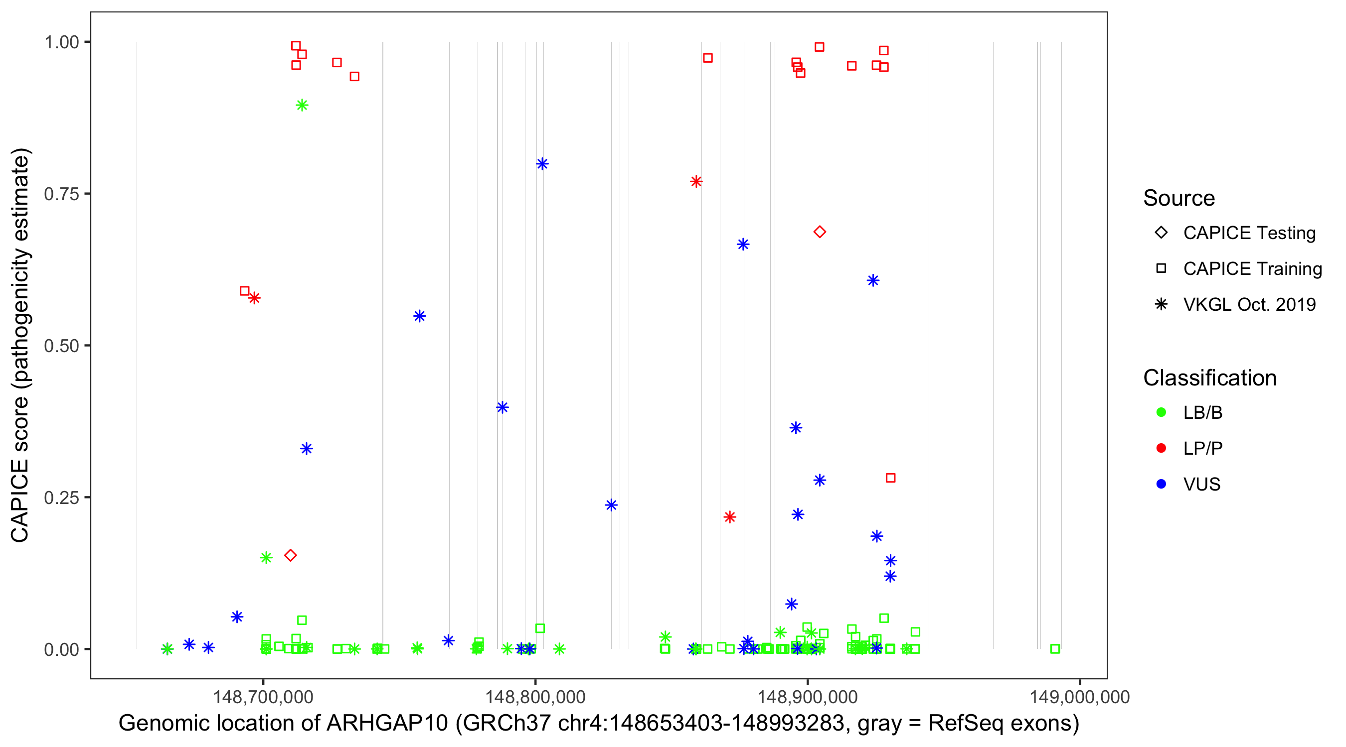 Shown are CAPICE train/test variants plus VKGL Oct 2019.