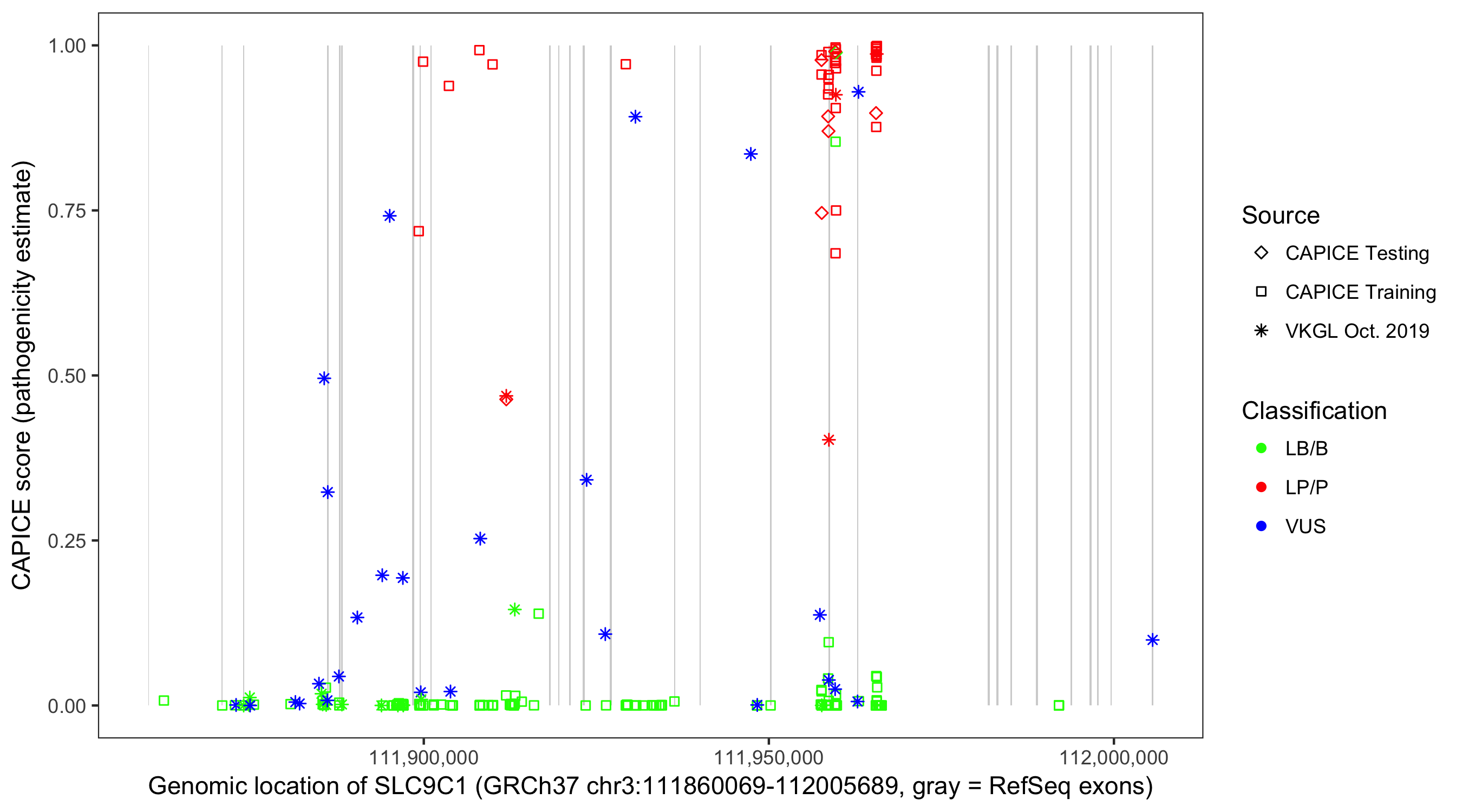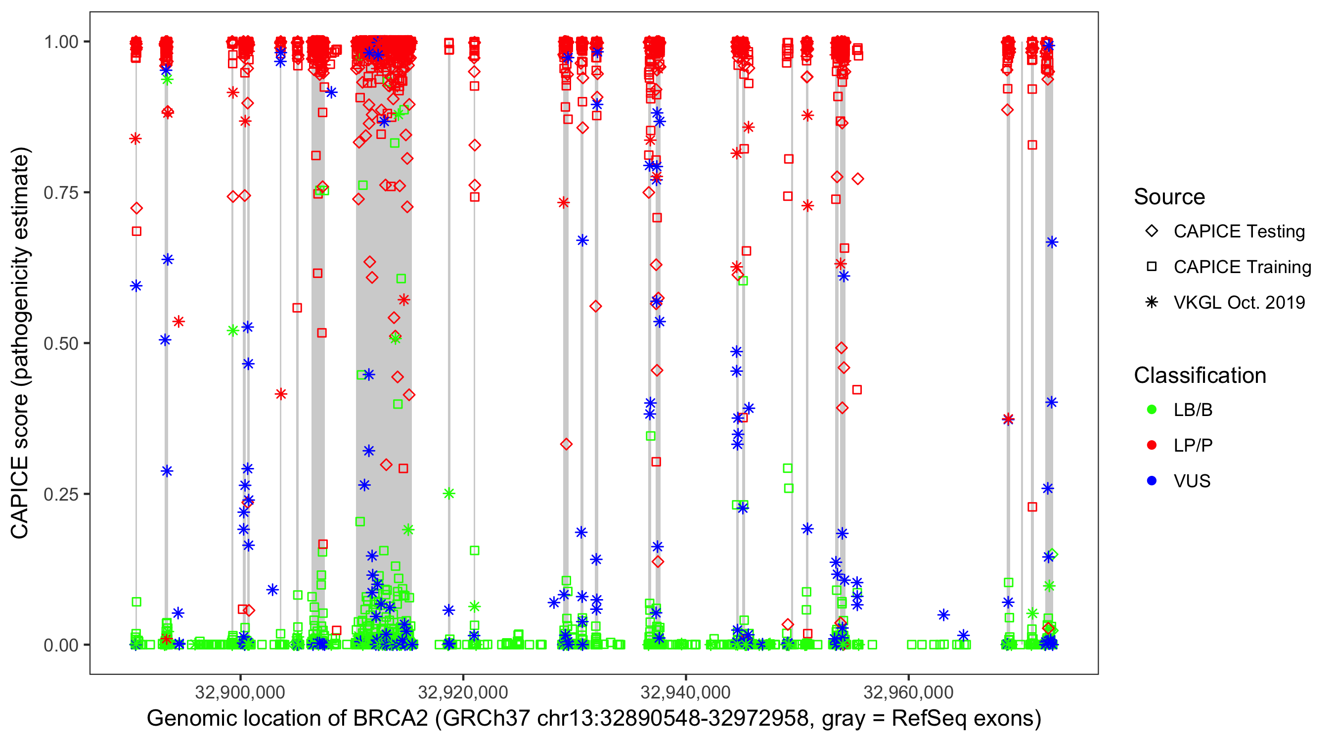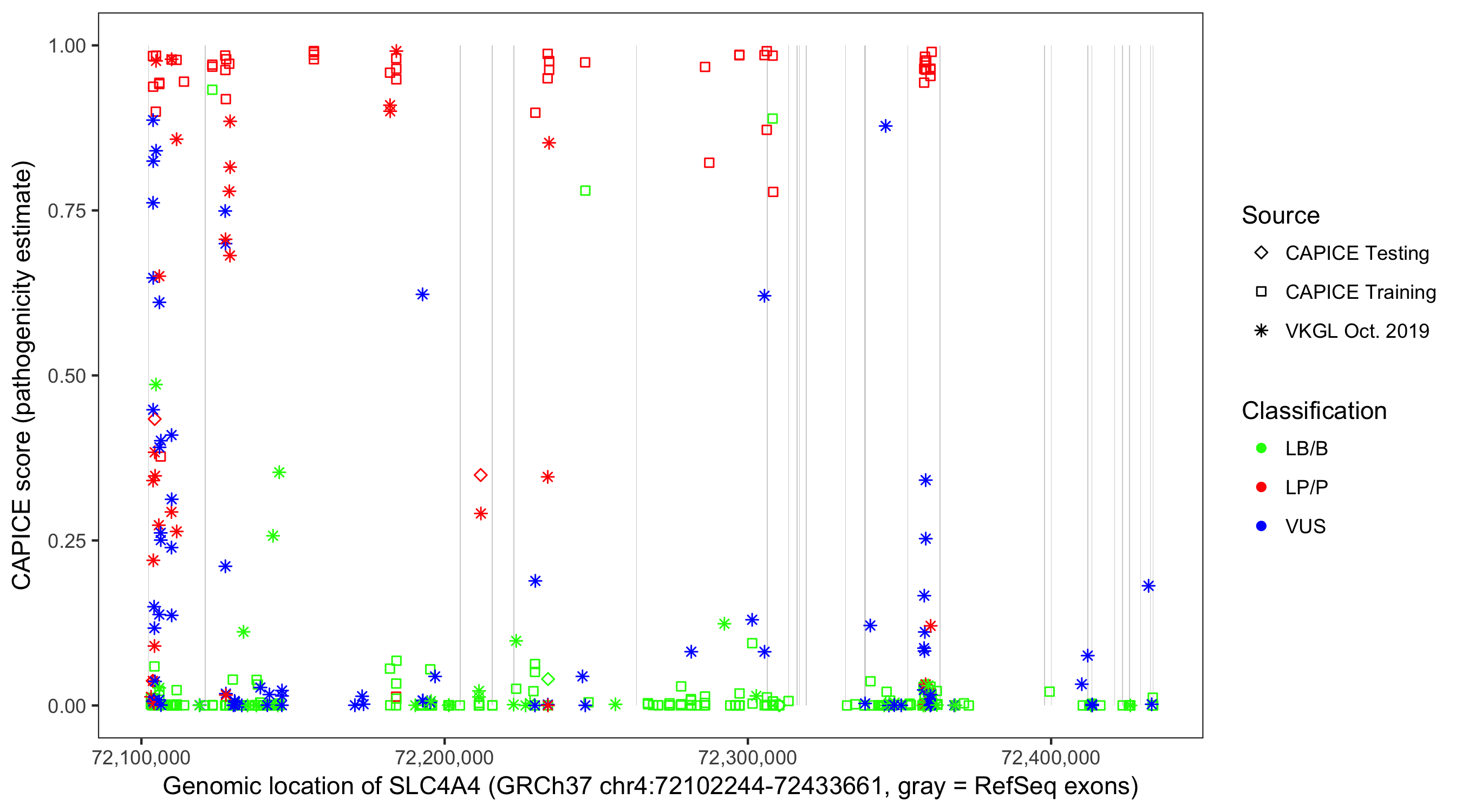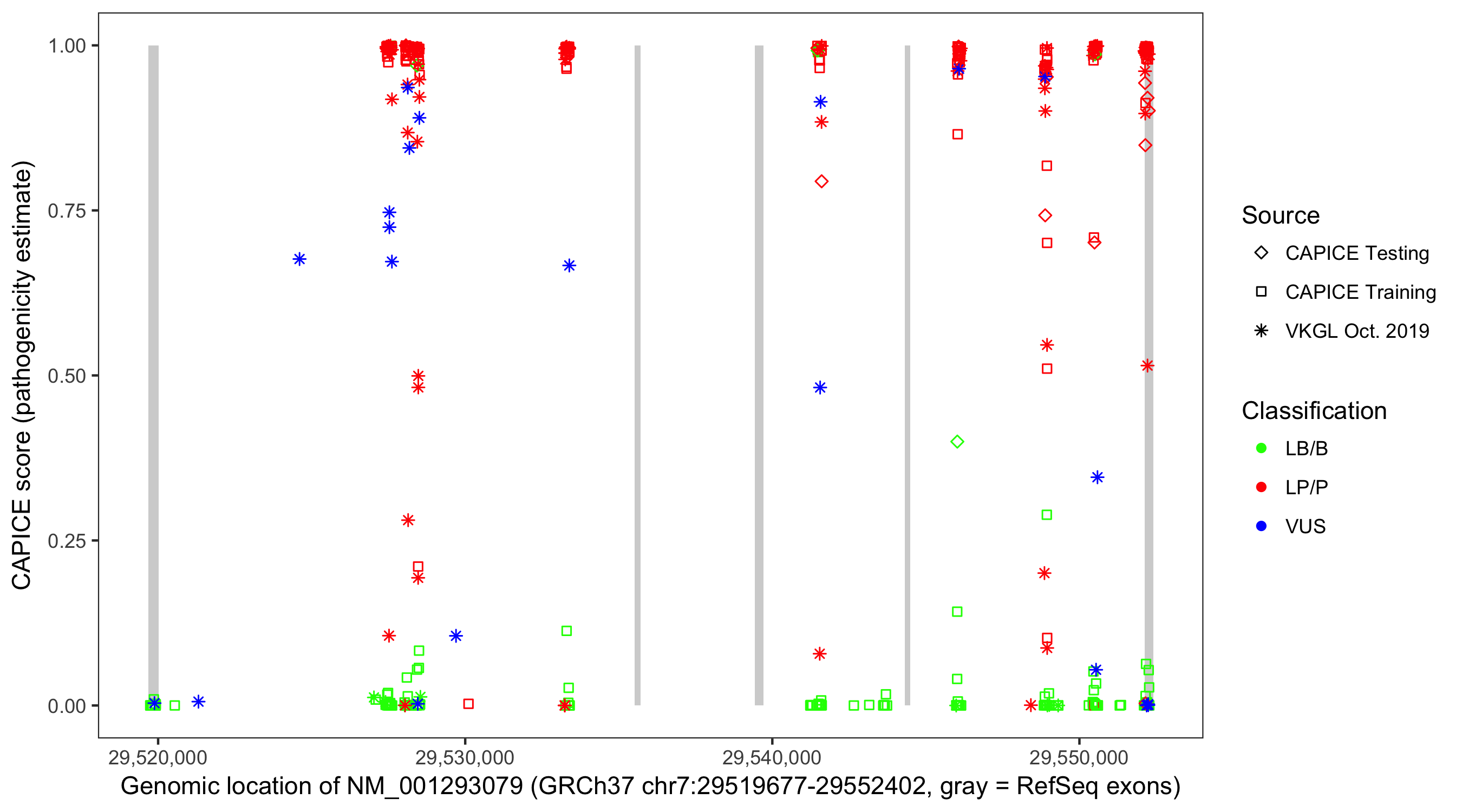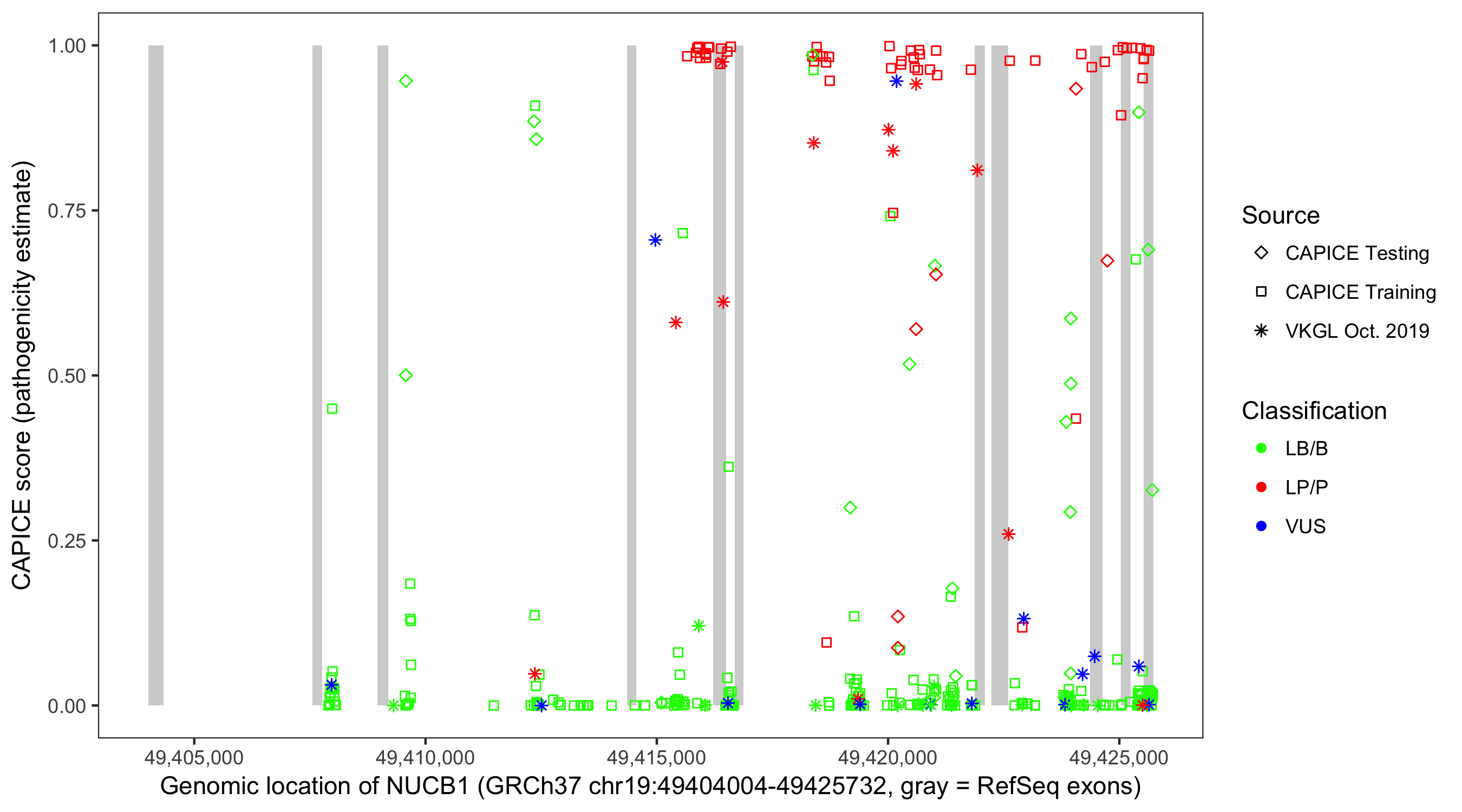 Shown are CAPICE train/test variants plus VKGL Oct 2019.