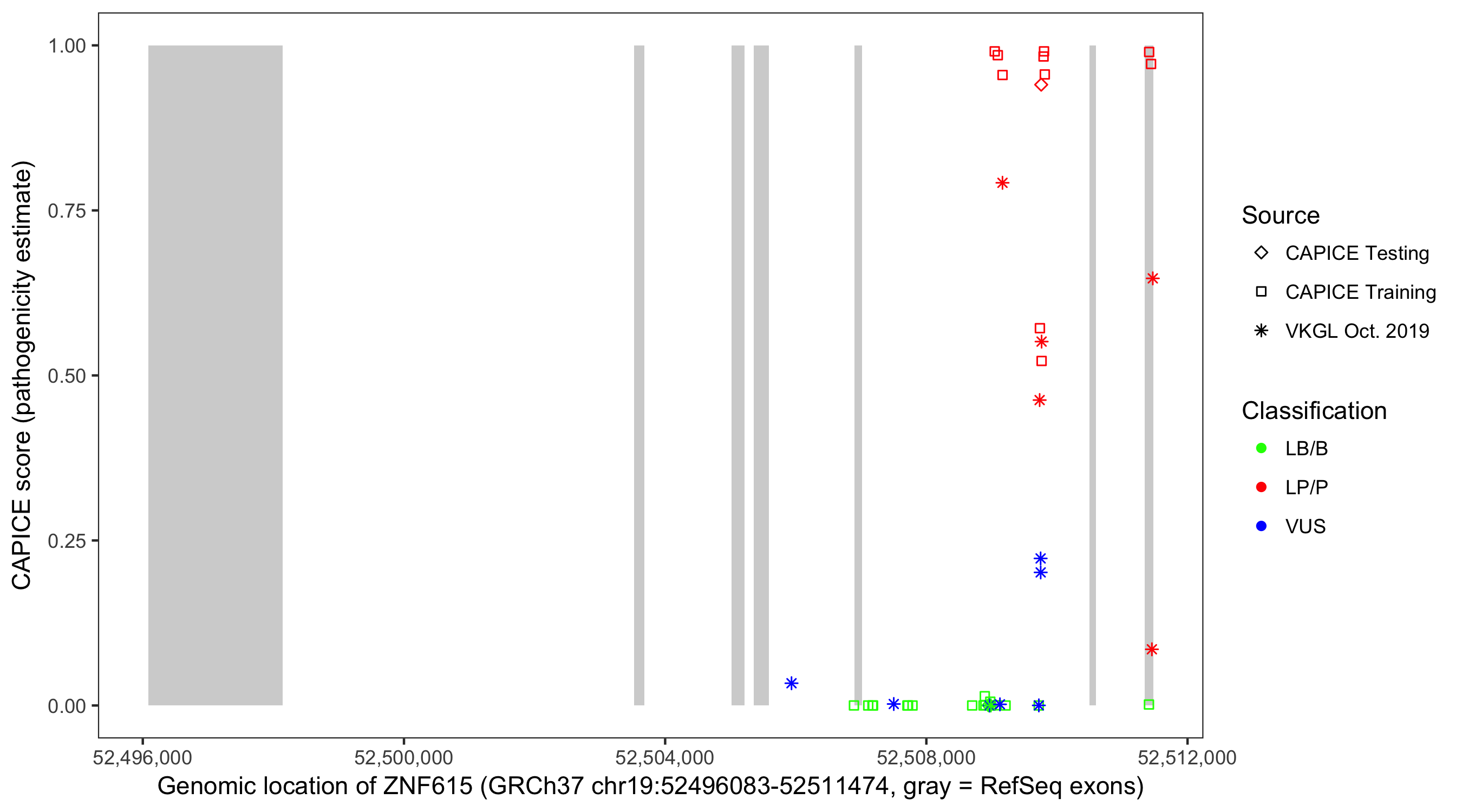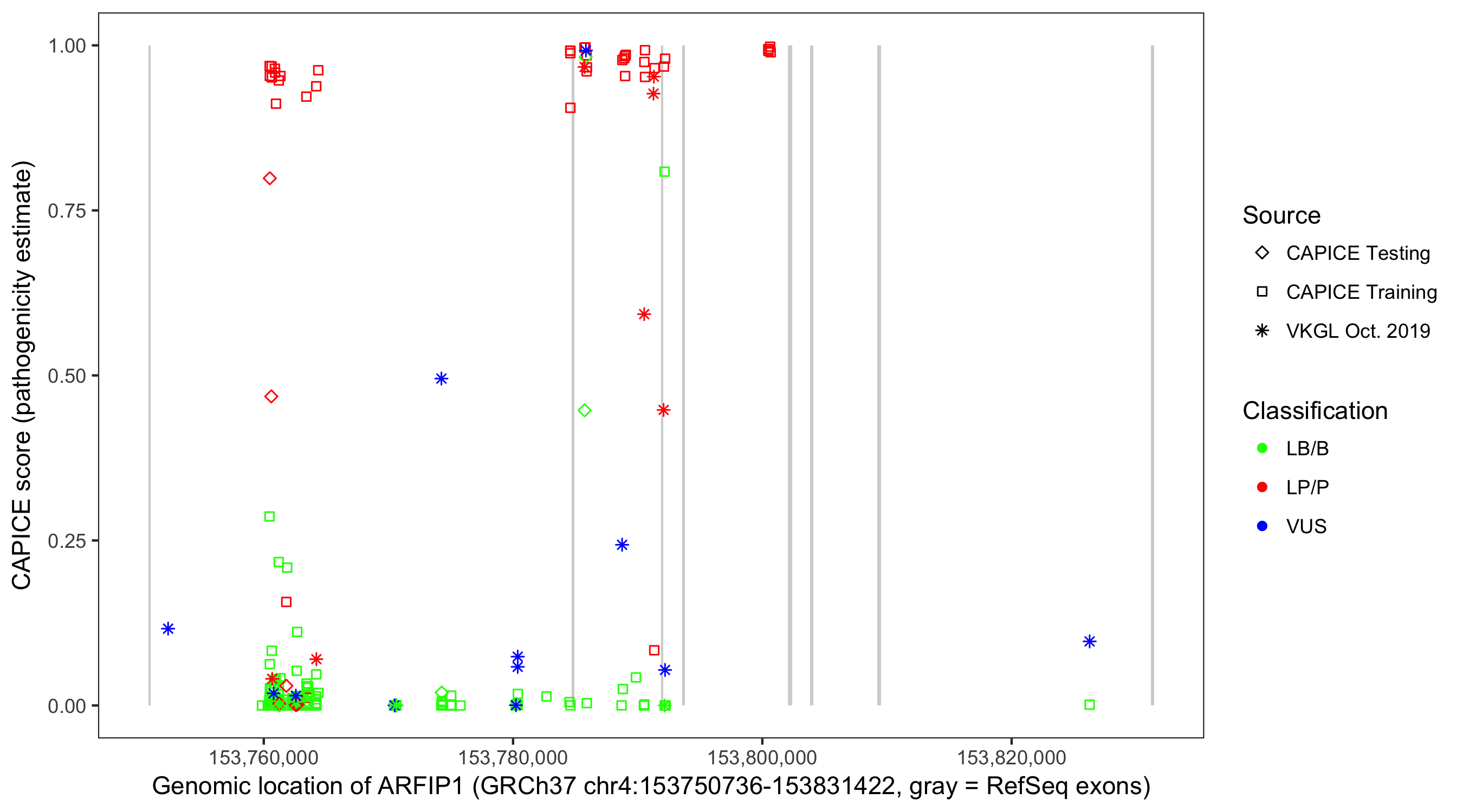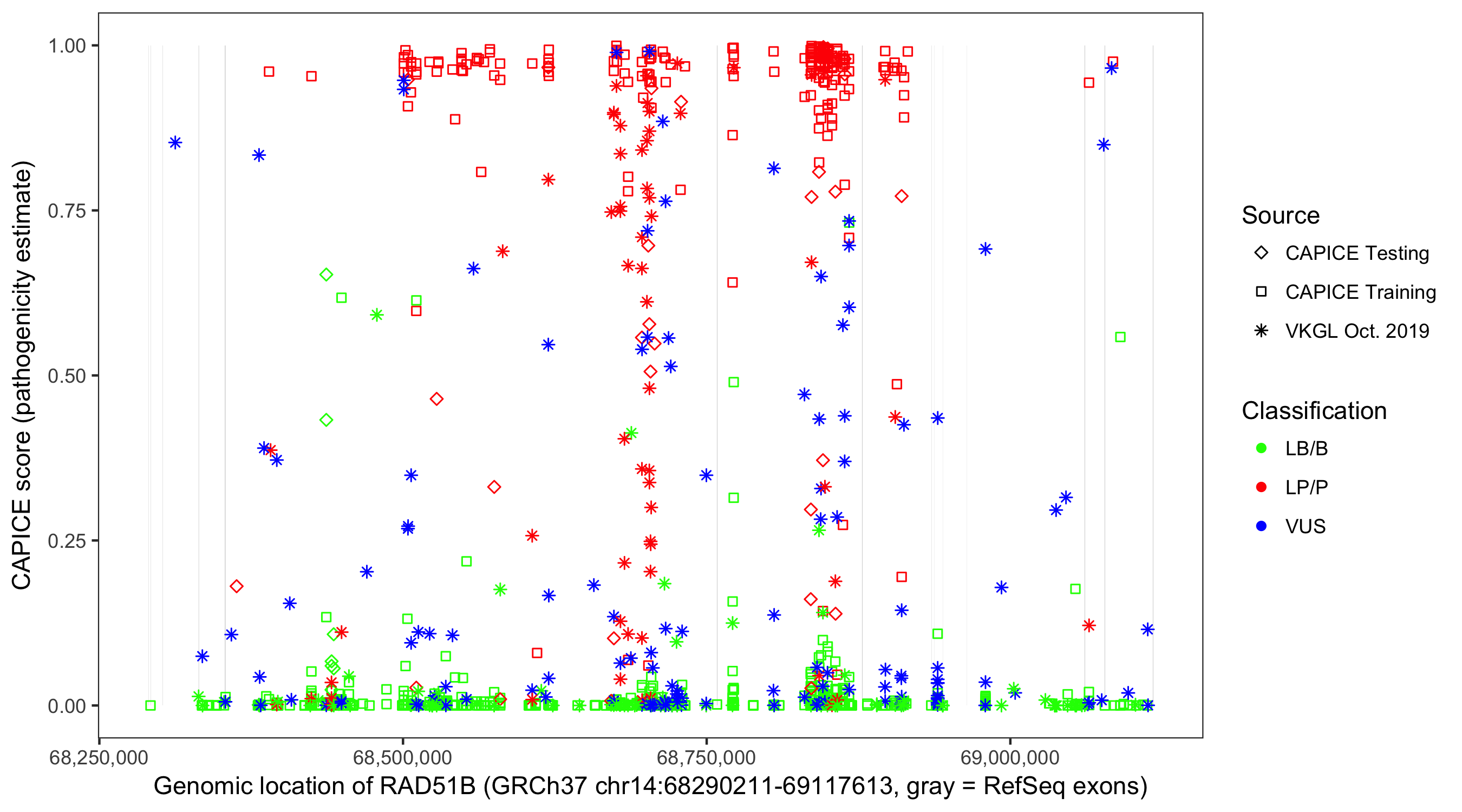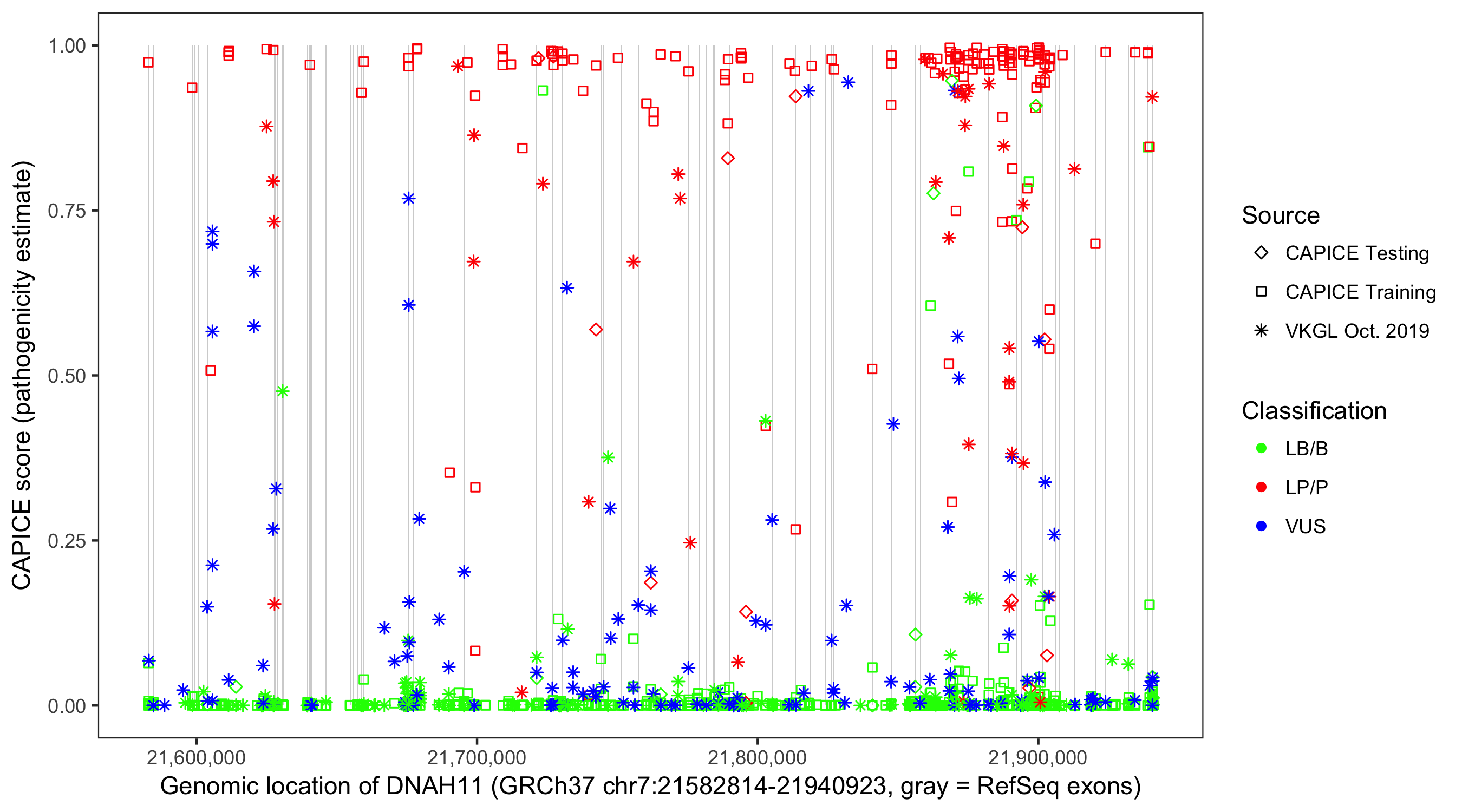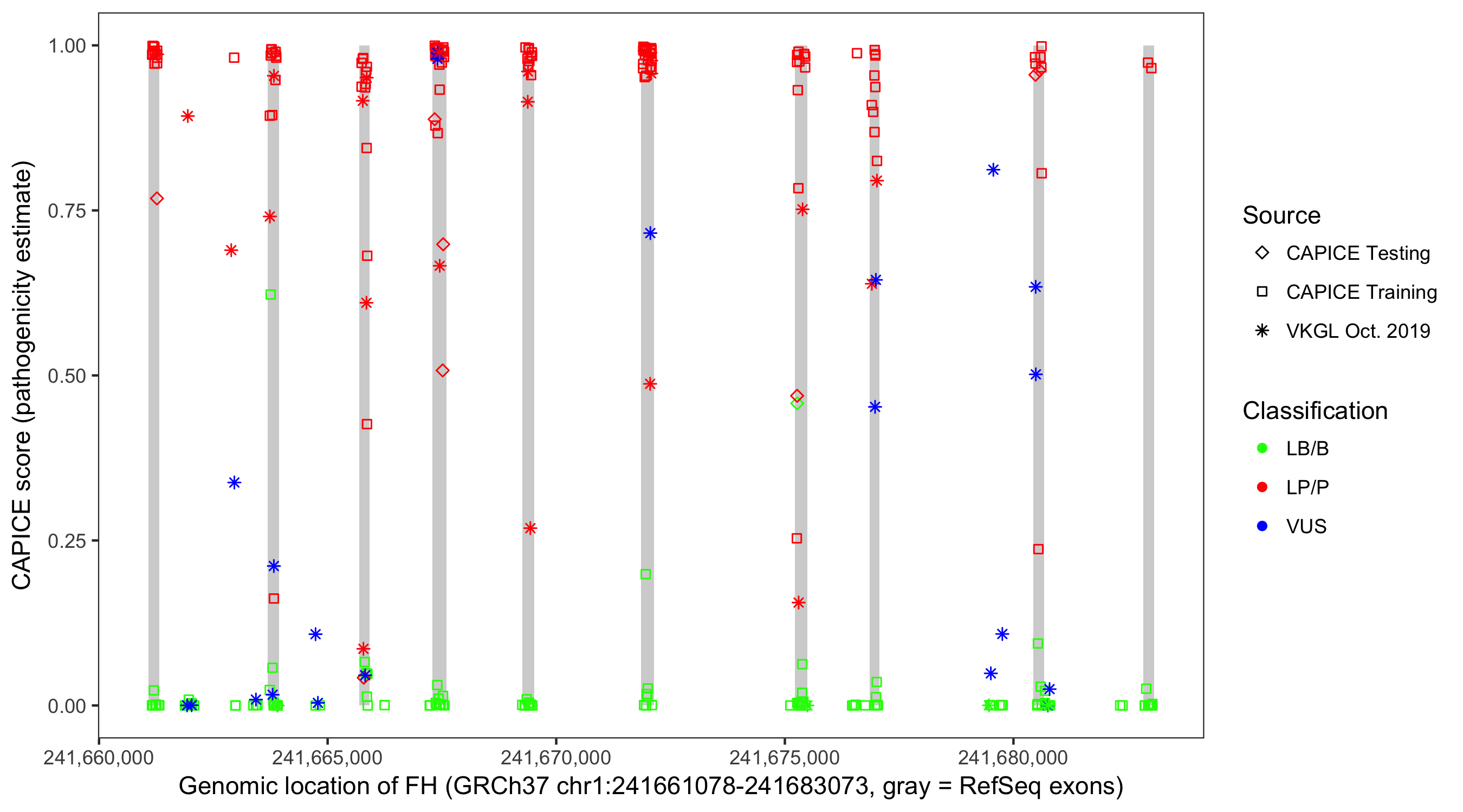 Shown are CAPICE train/test variants plus VKGL Oct 2019.