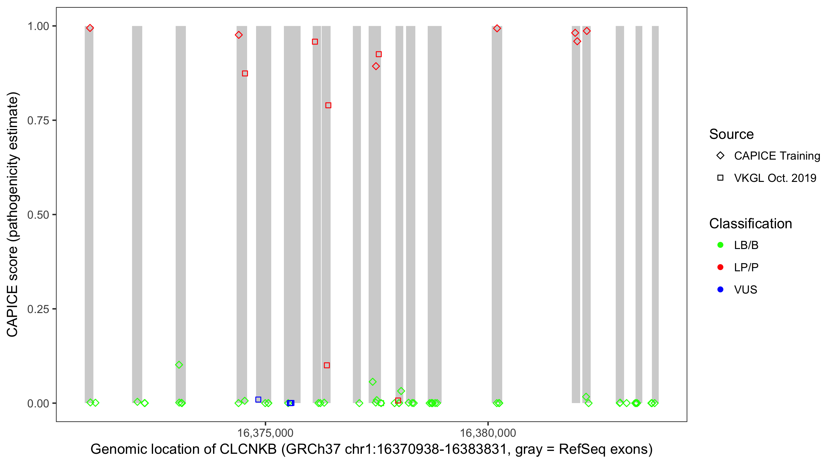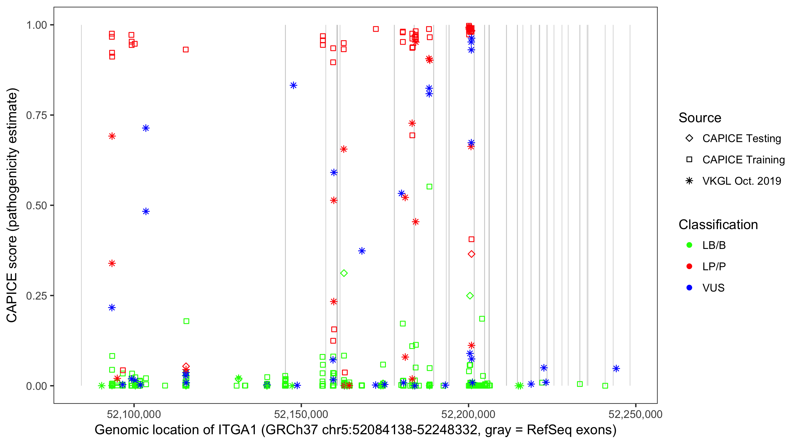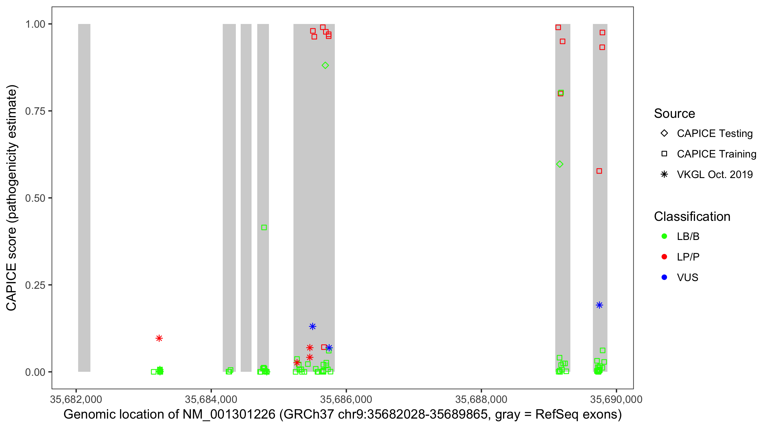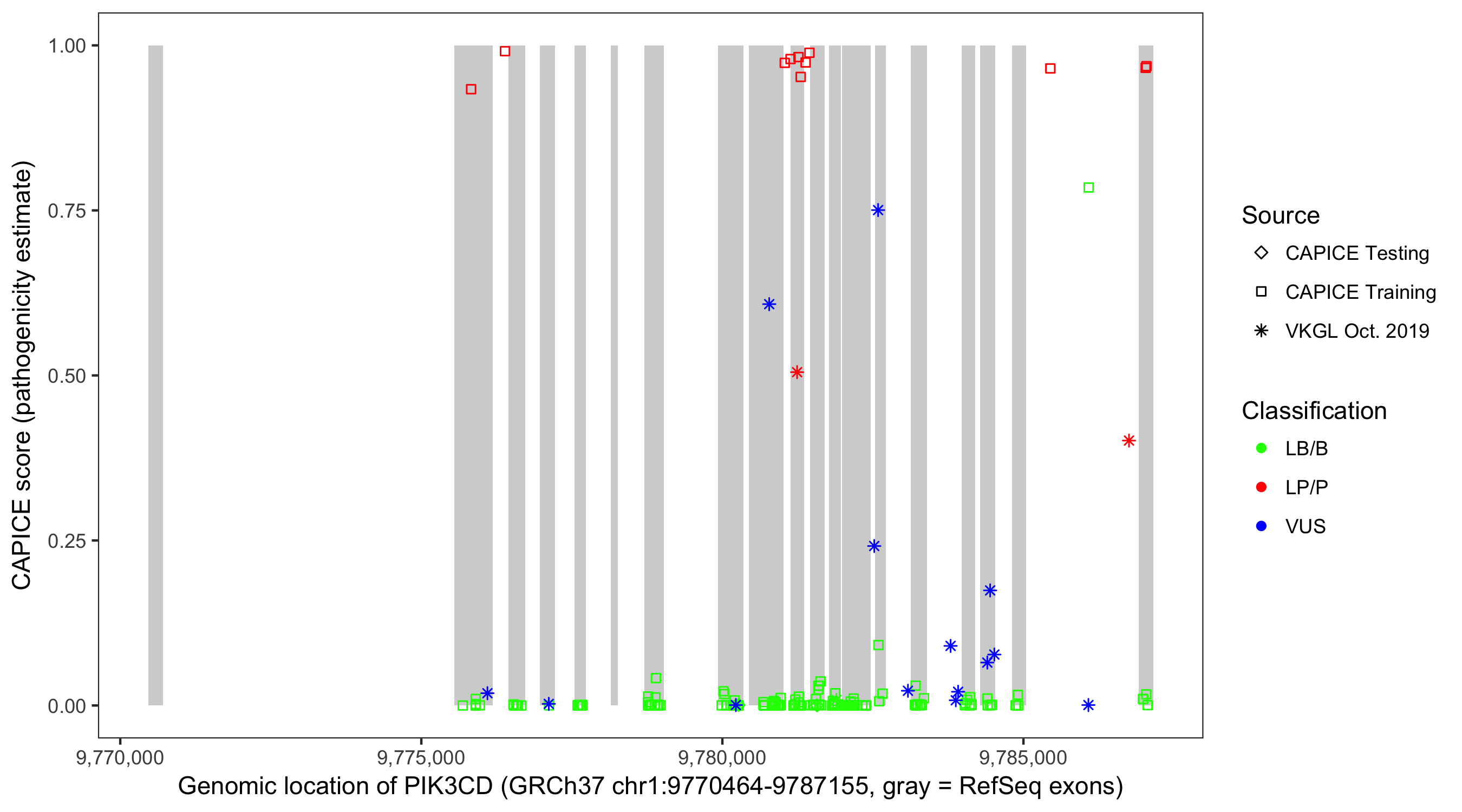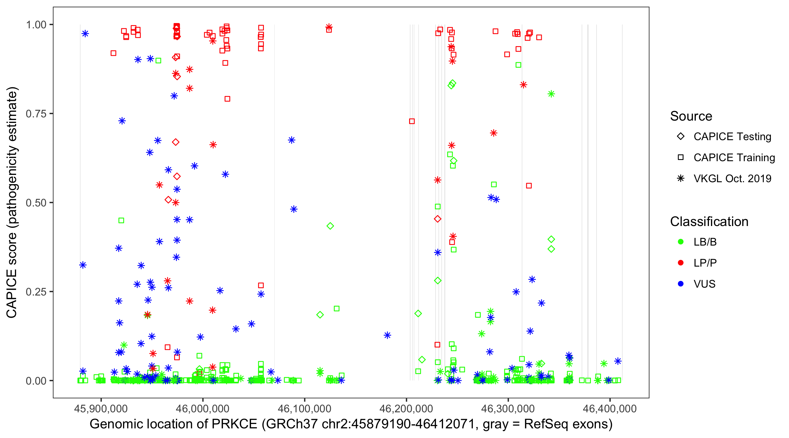 Shown are CAPICE train/test variants plus VKGL Oct 2019.