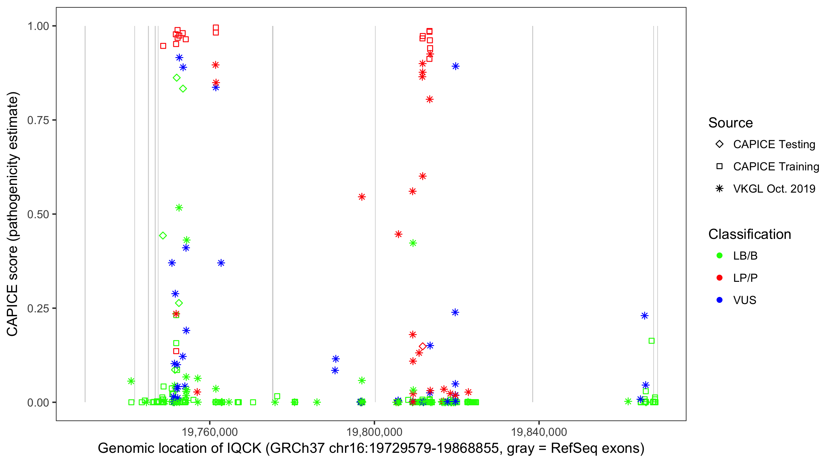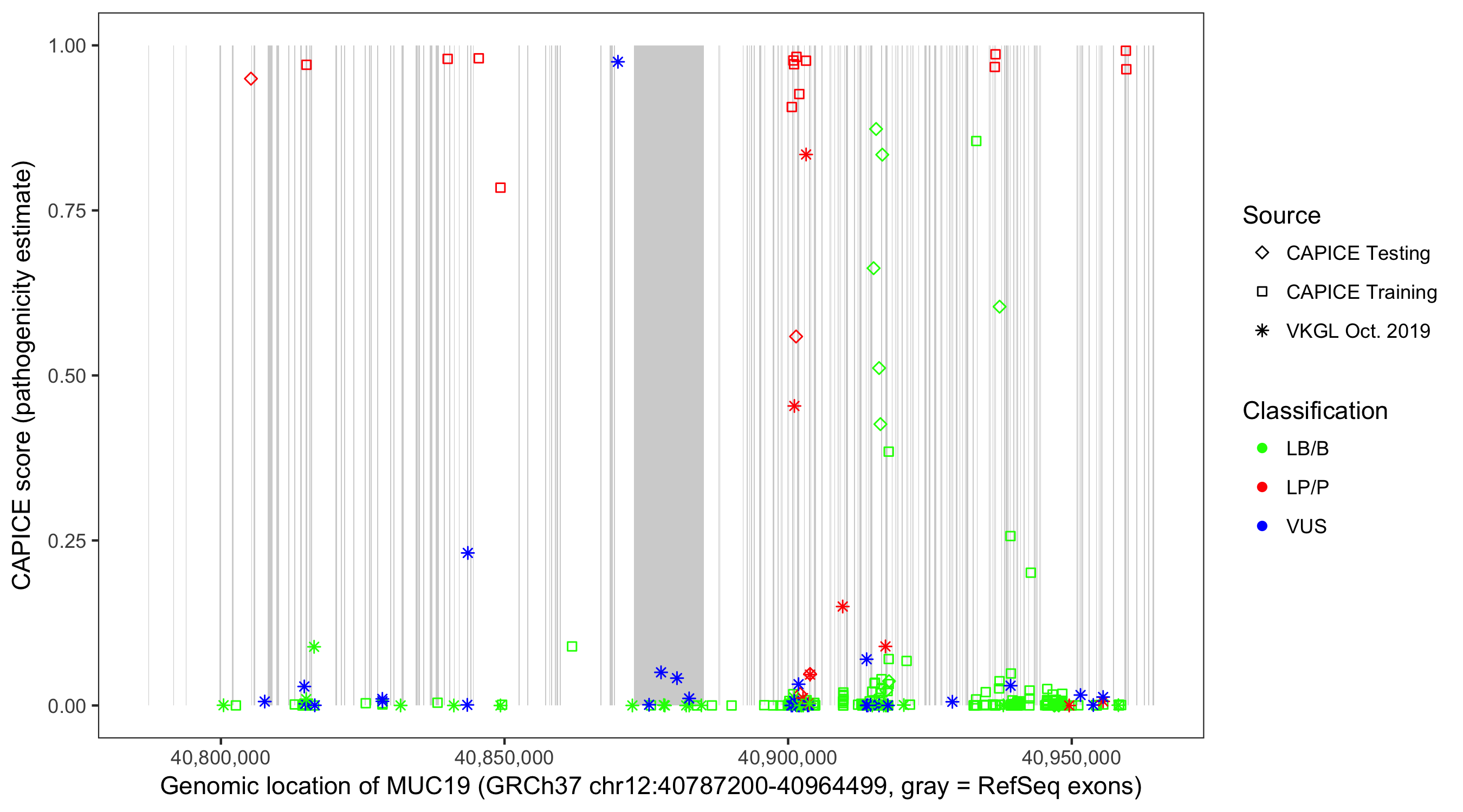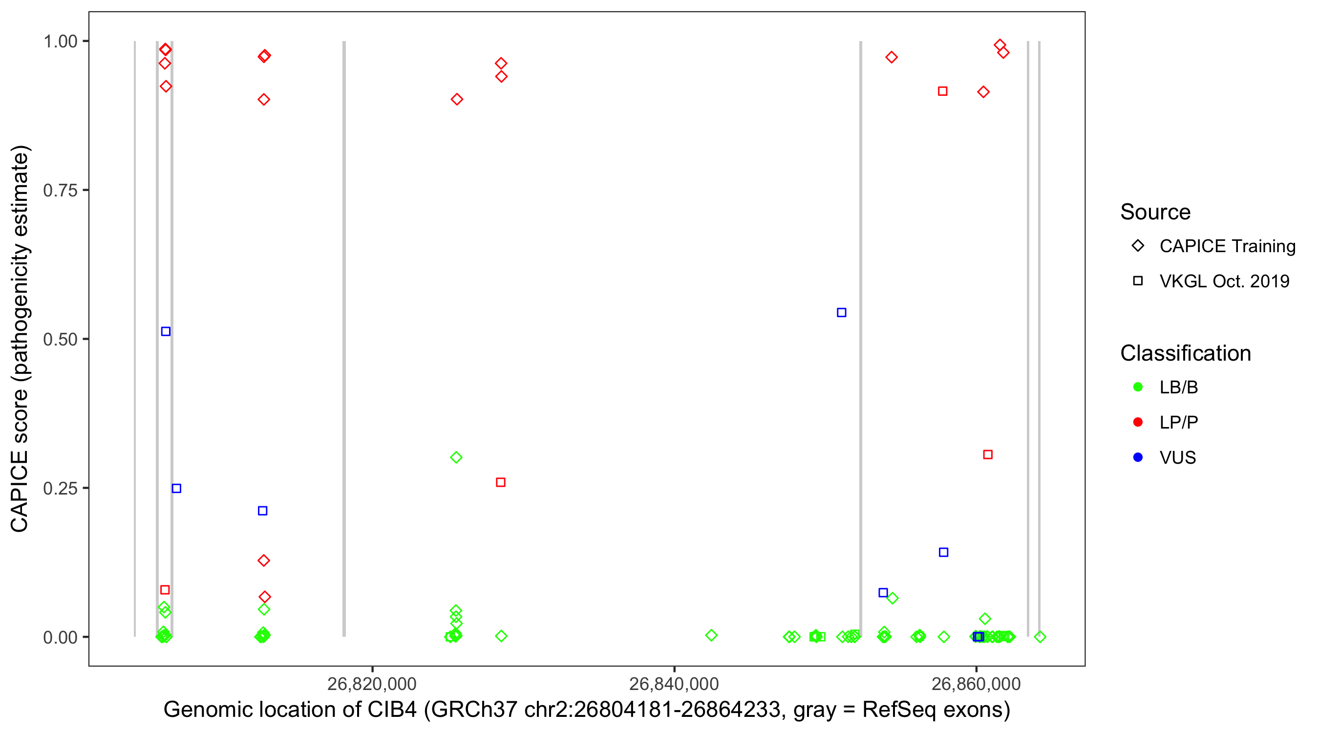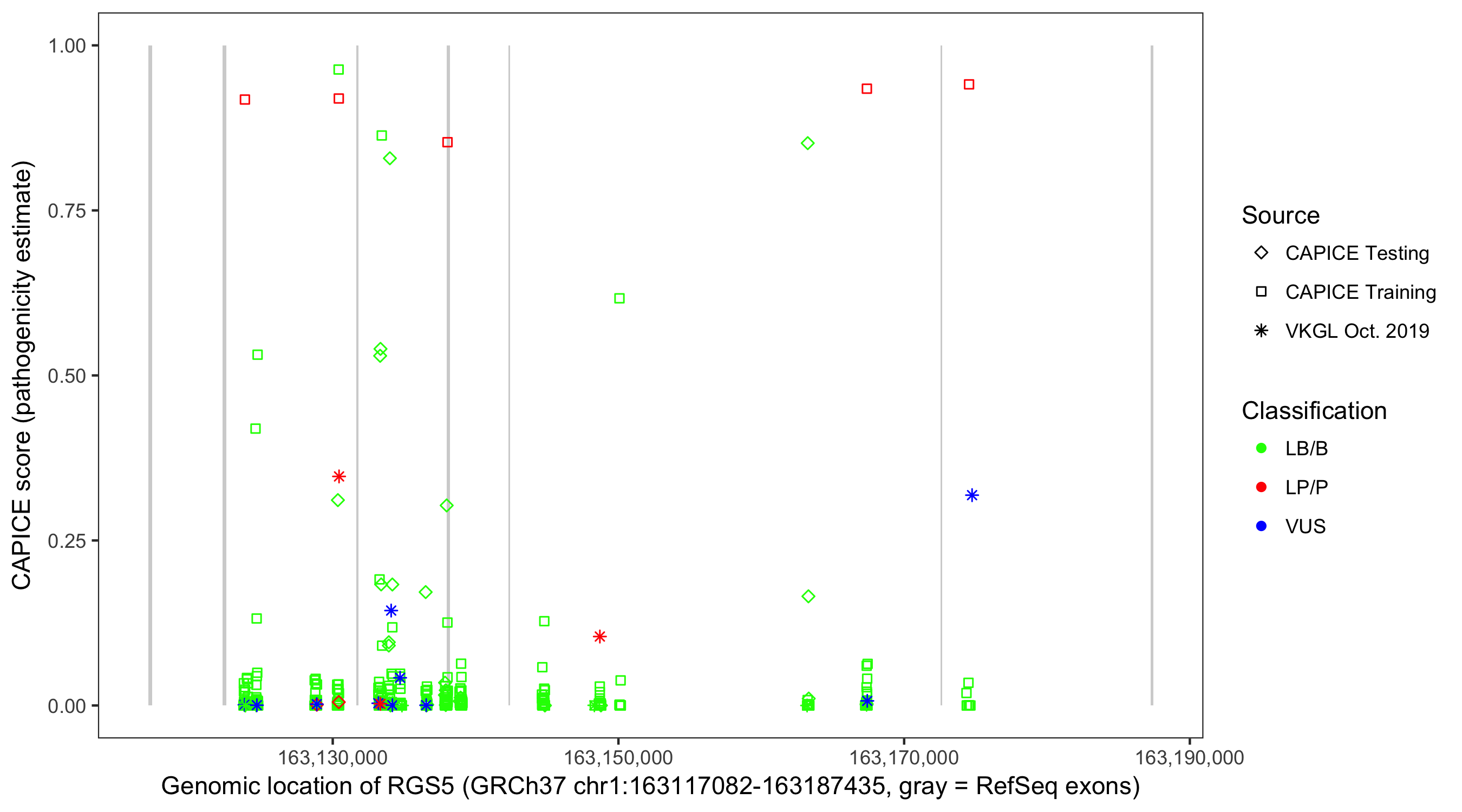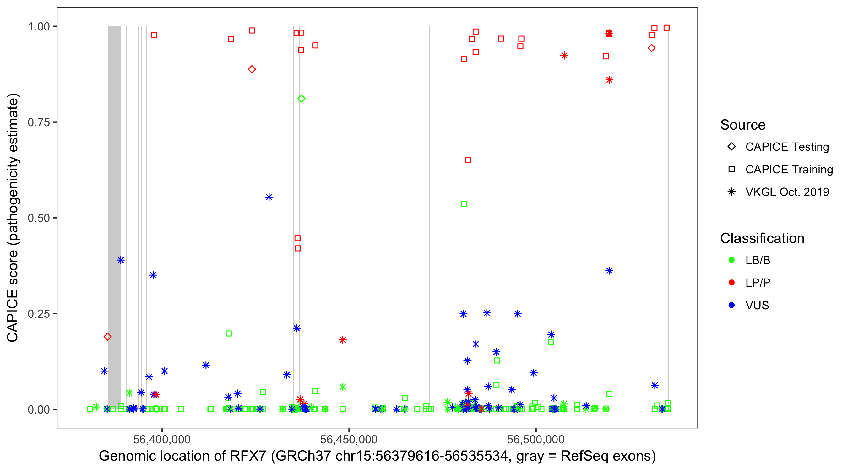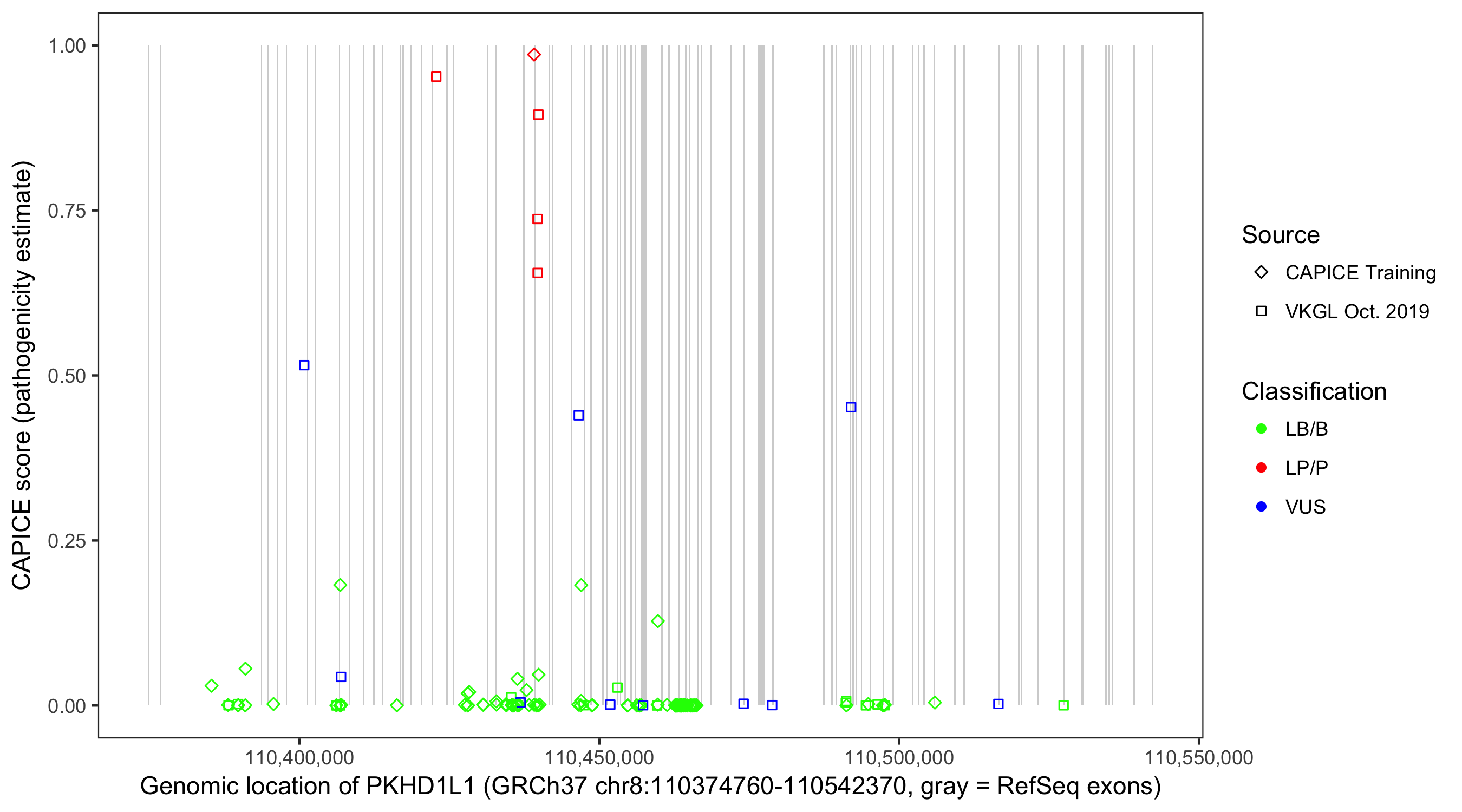 Shown are CAPICE train/test variants plus VKGL Oct 2019.