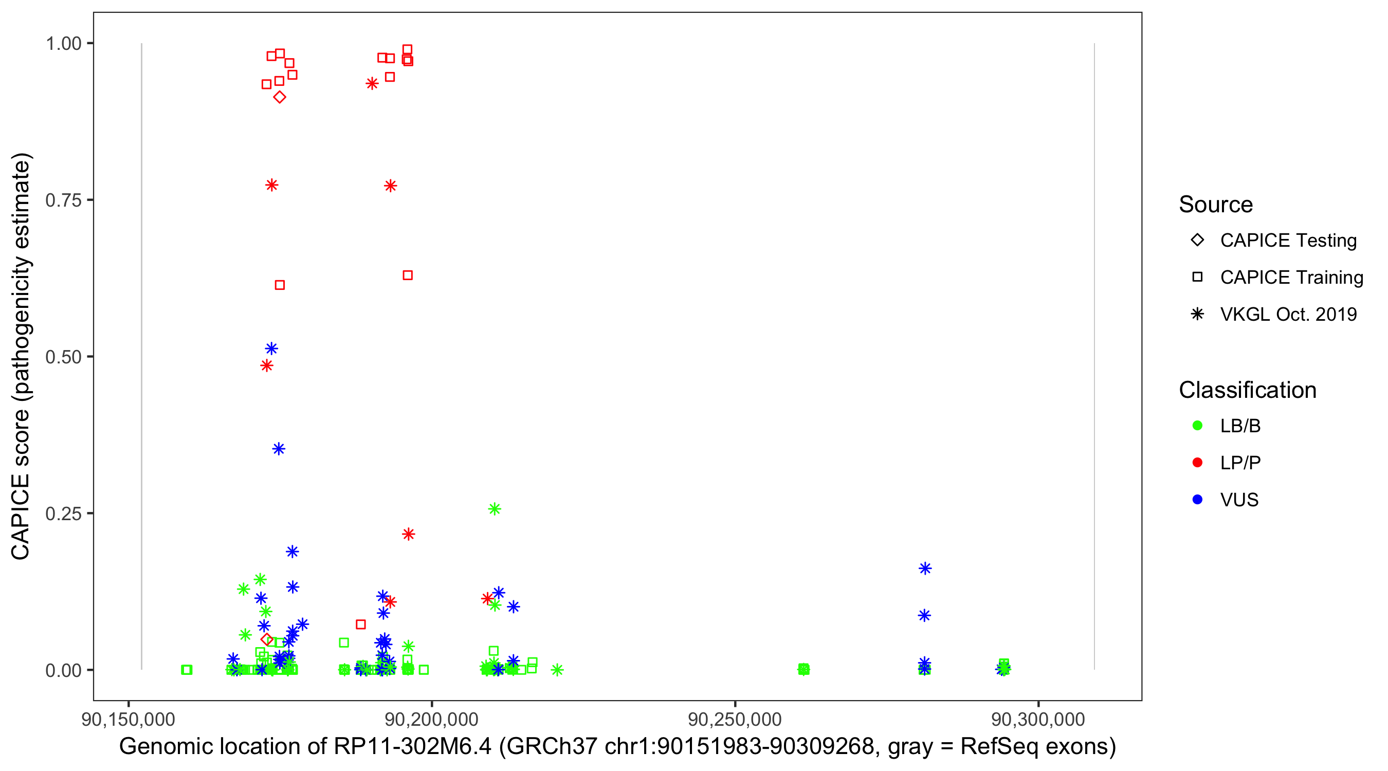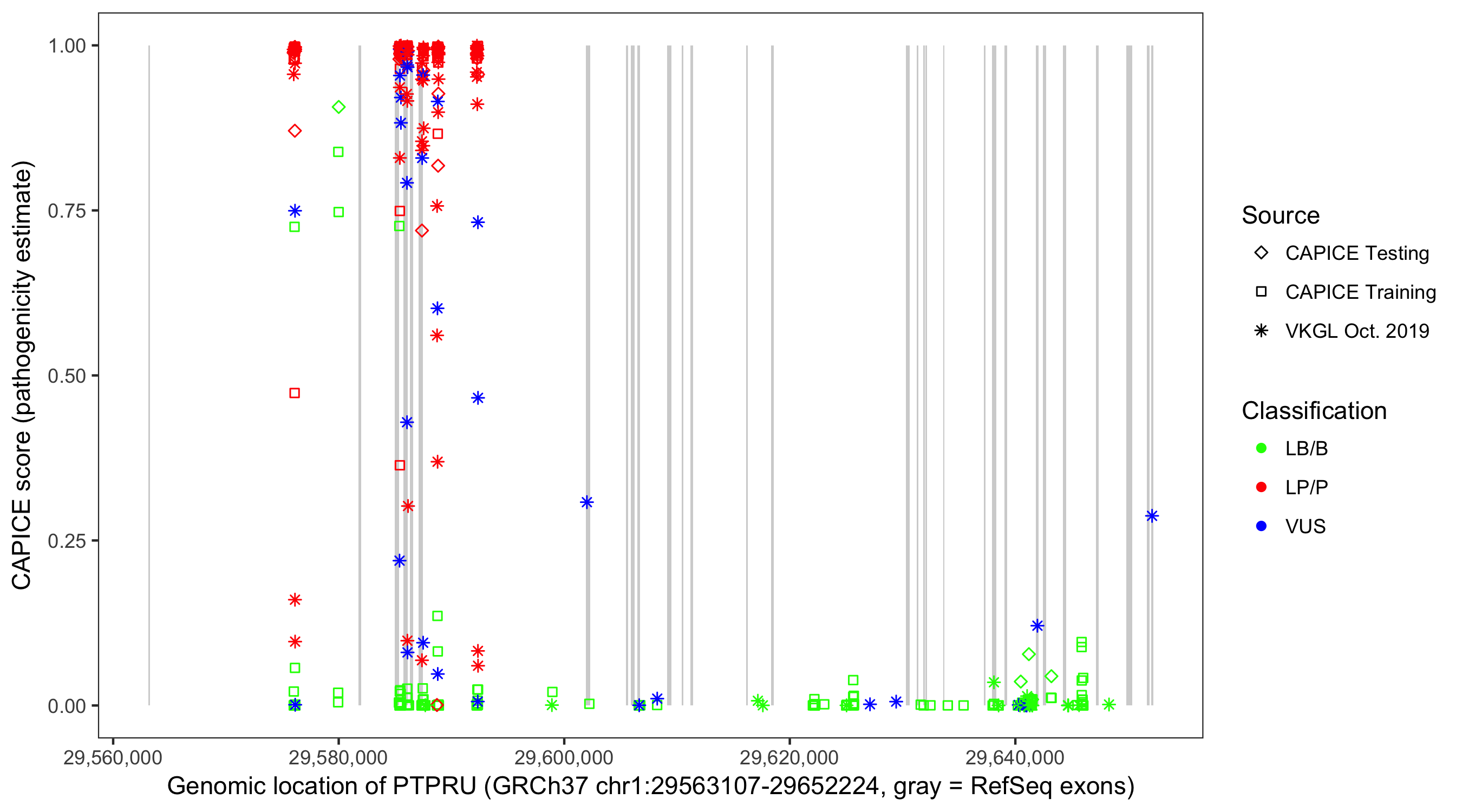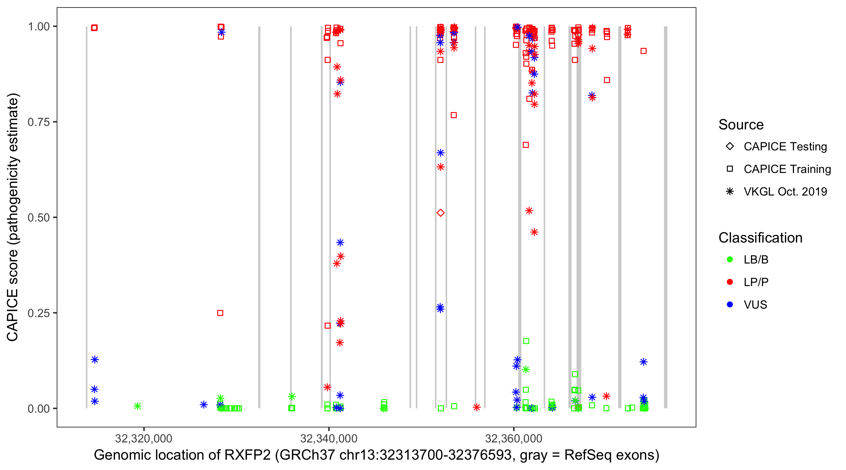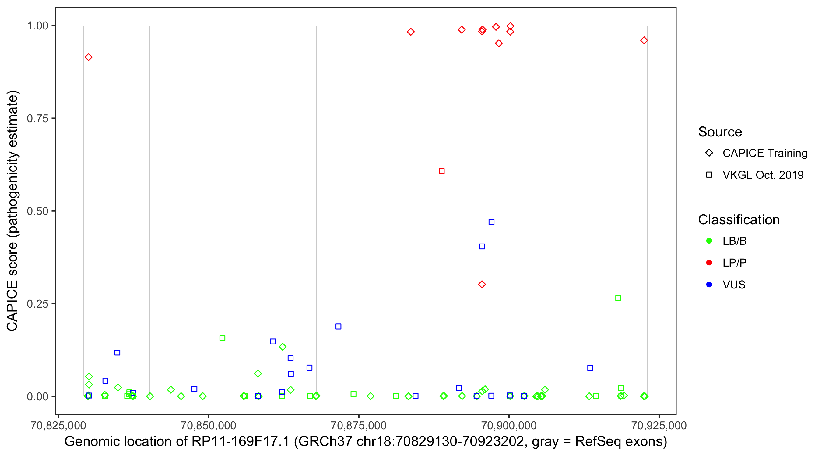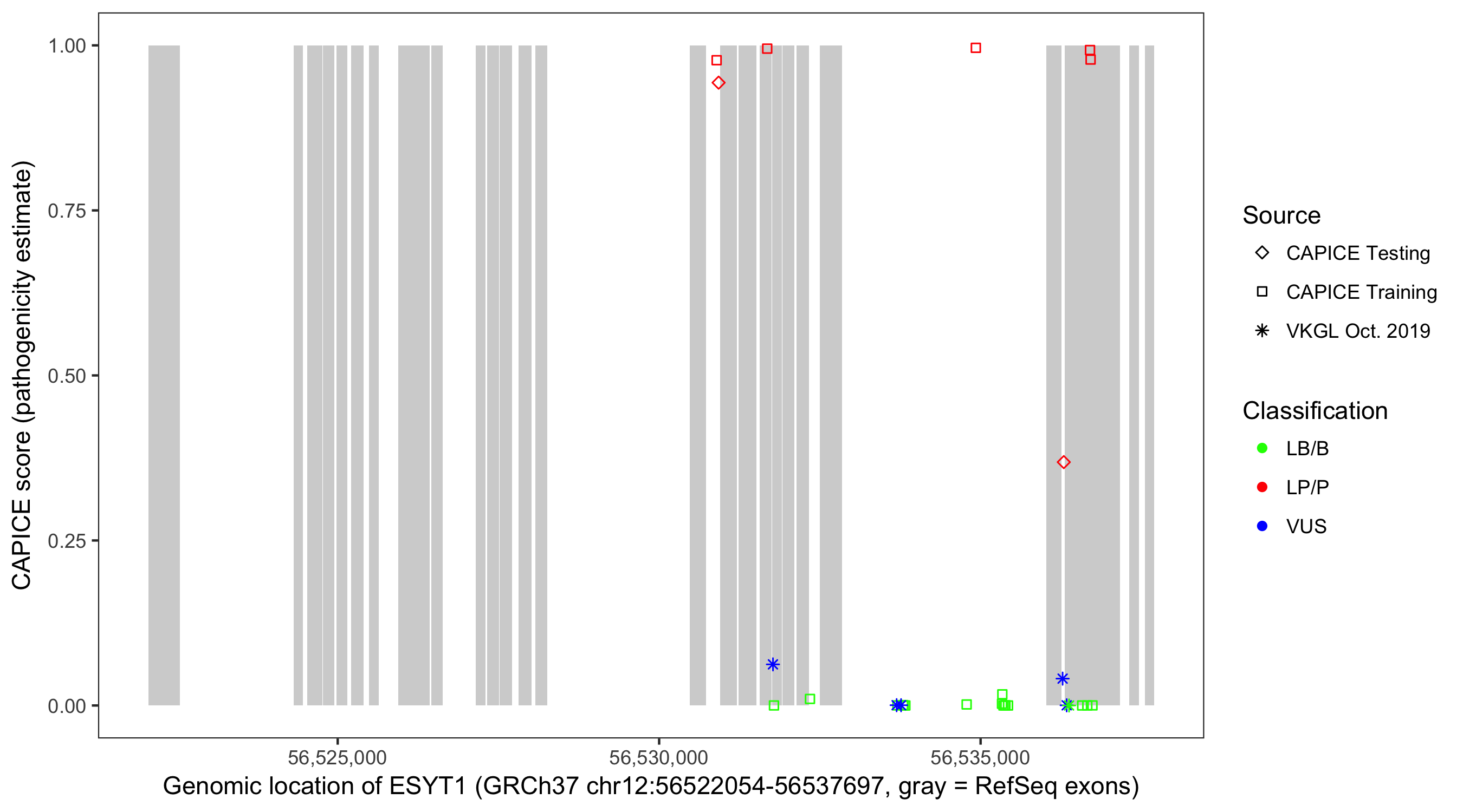 Shown are CAPICE train/test variants plus VKGL Oct 2019.