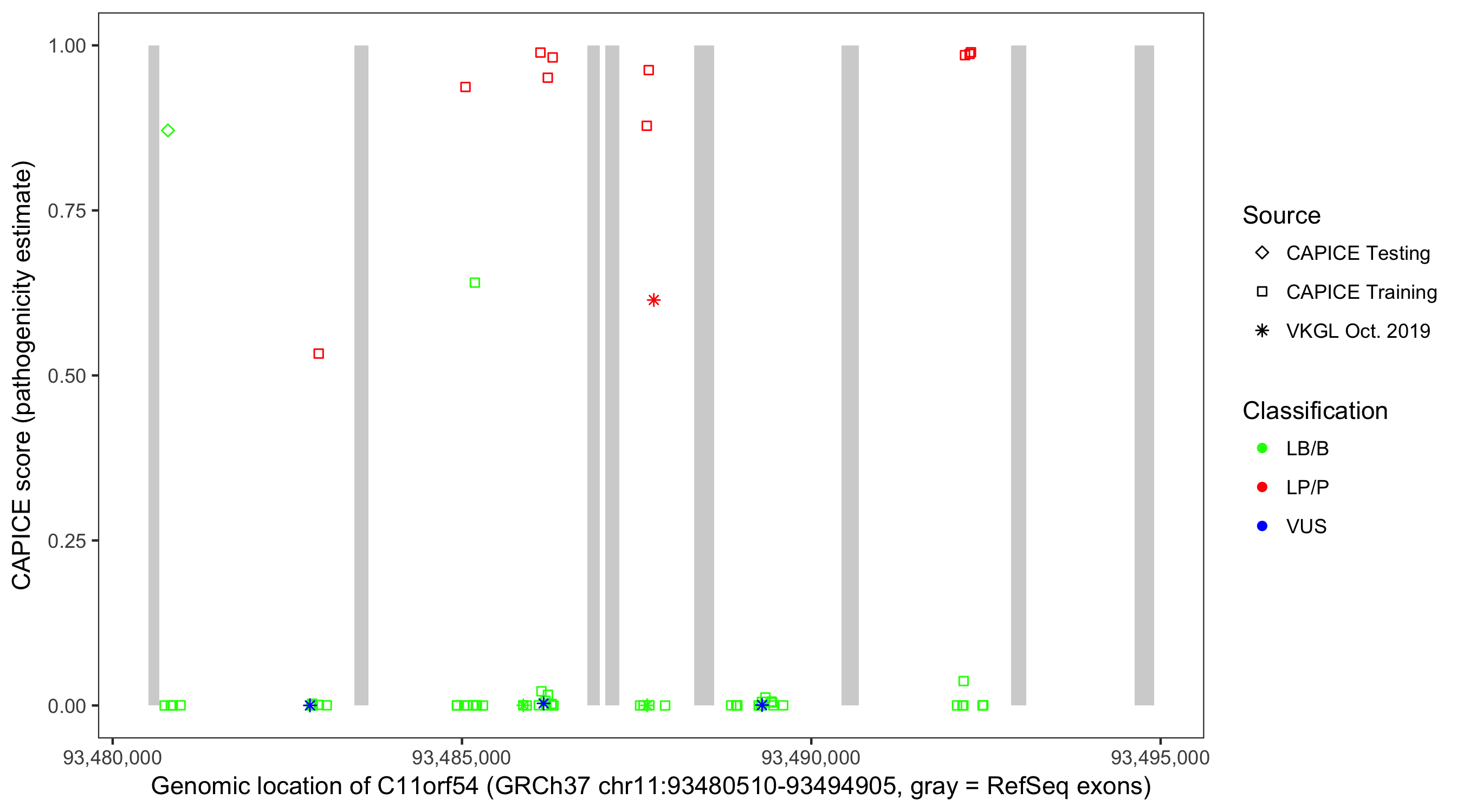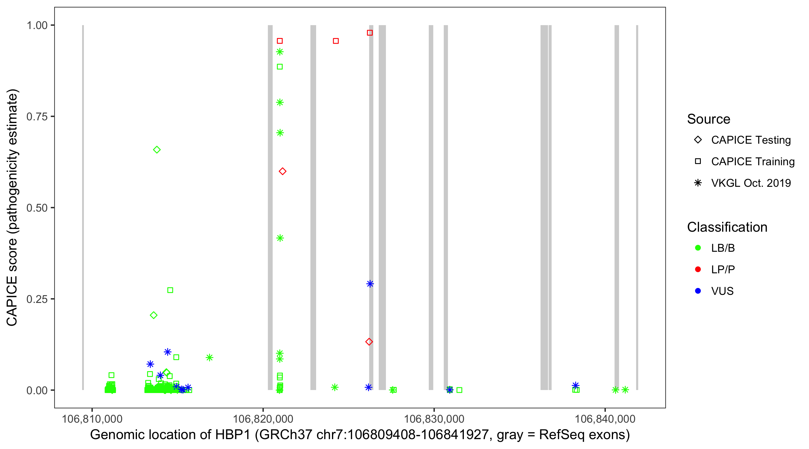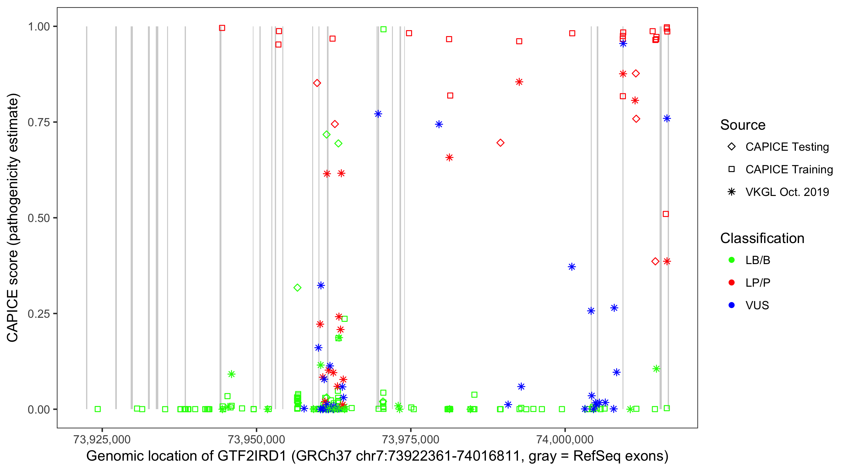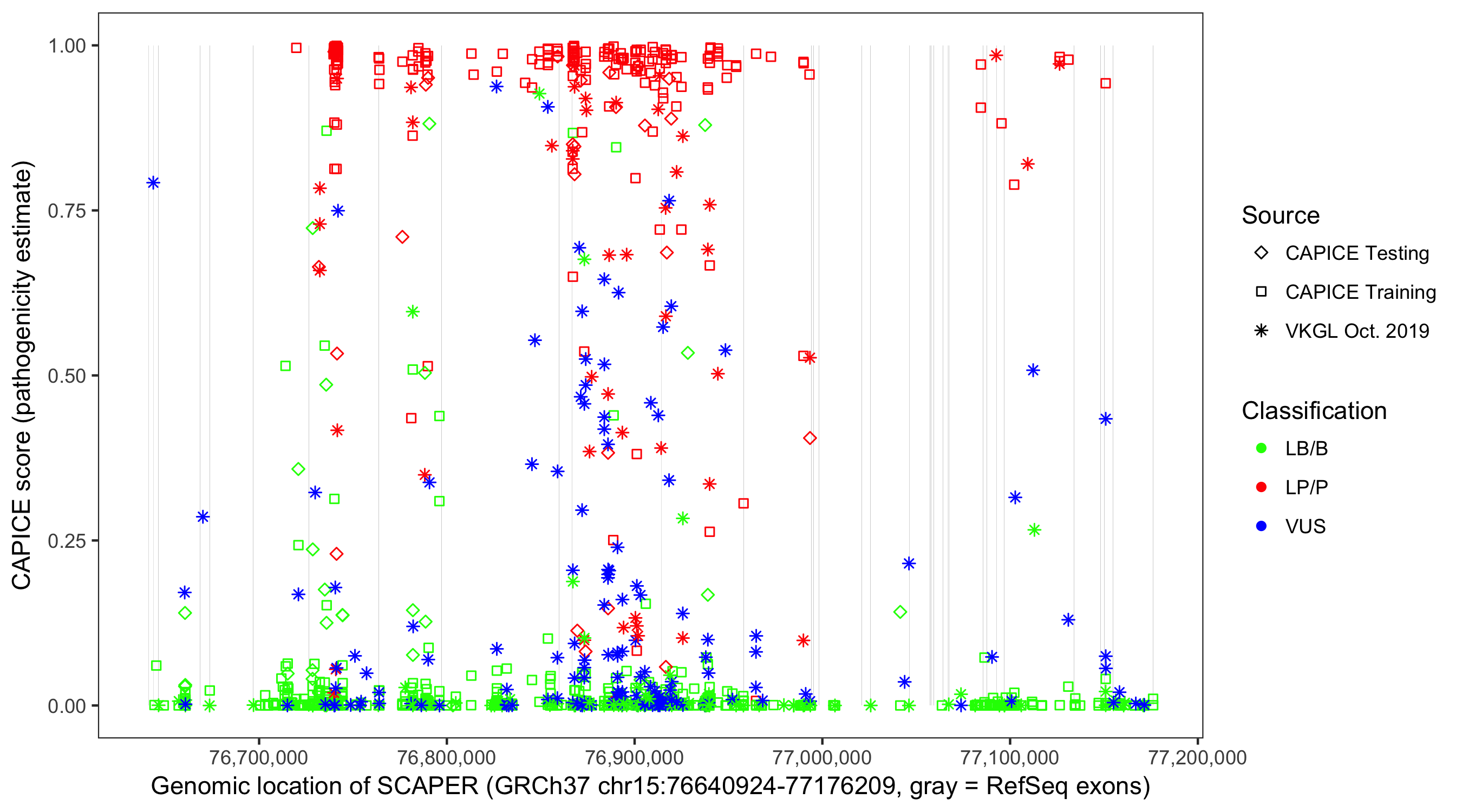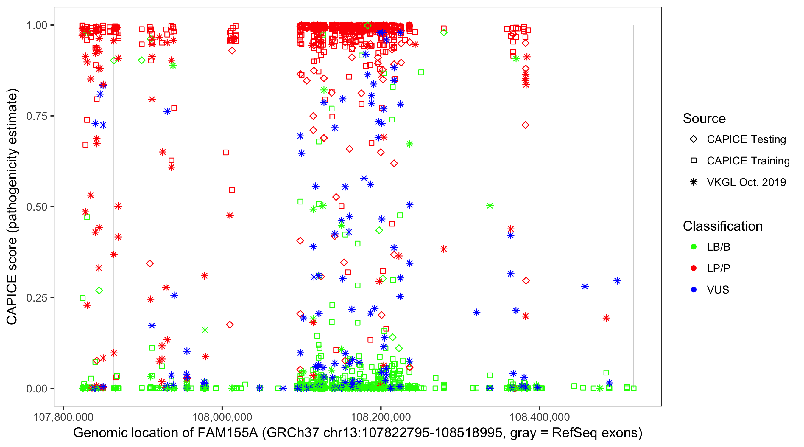 Shown are CAPICE train/test variants plus VKGL Oct 2019.