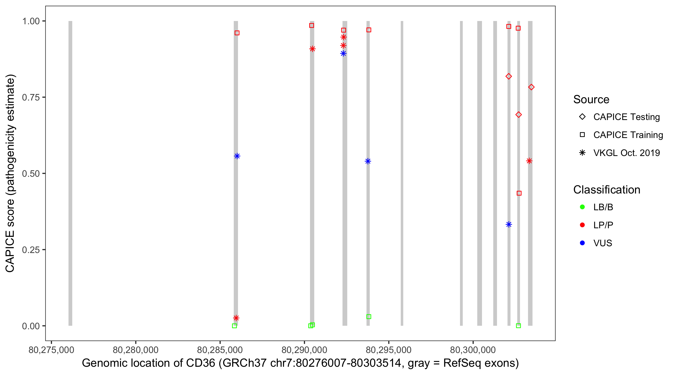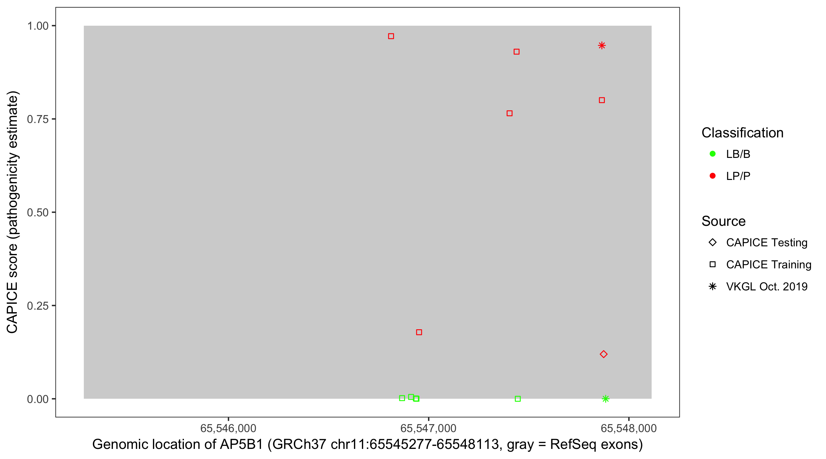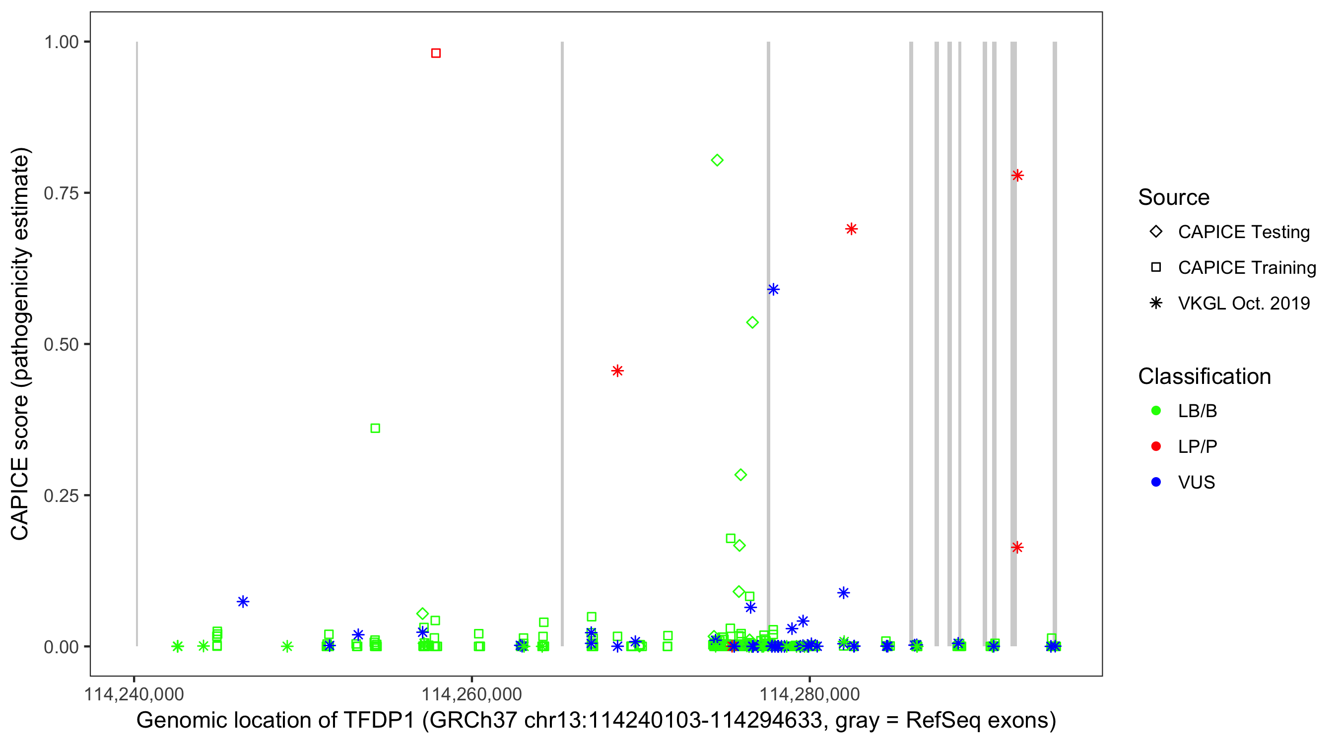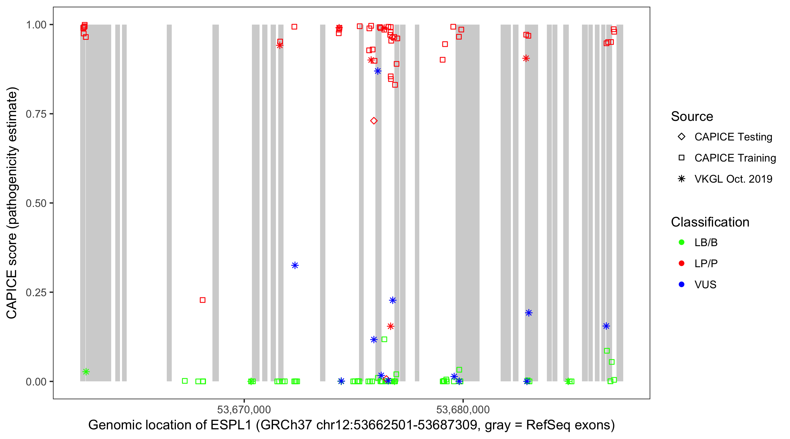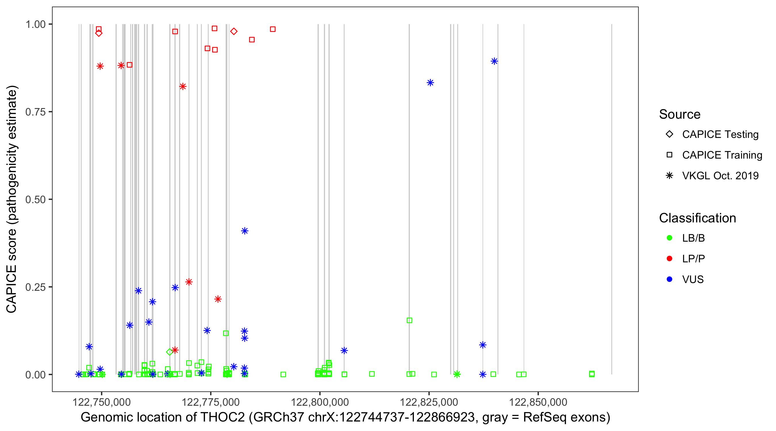 Shown are CAPICE train/test variants plus VKGL Oct 2019.