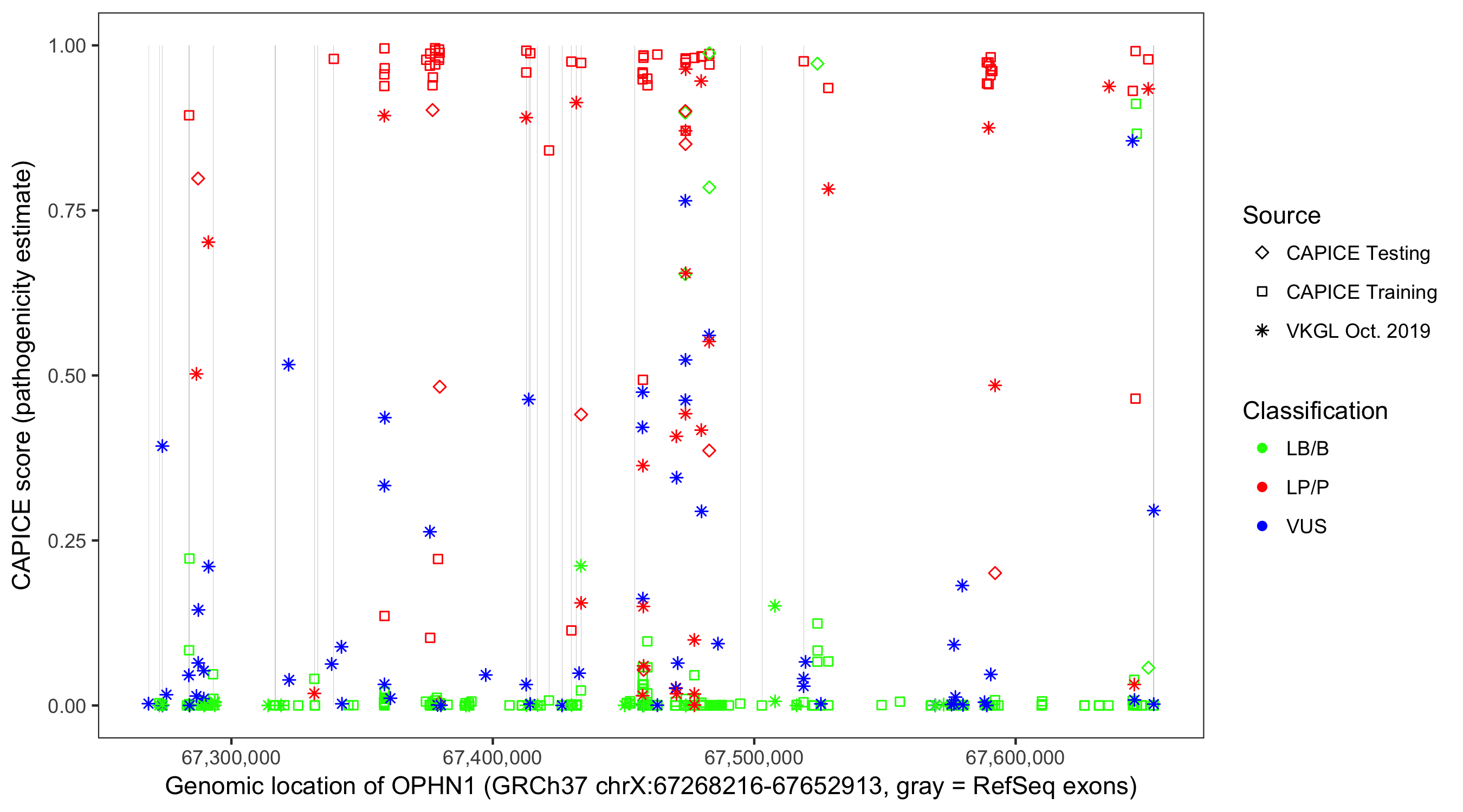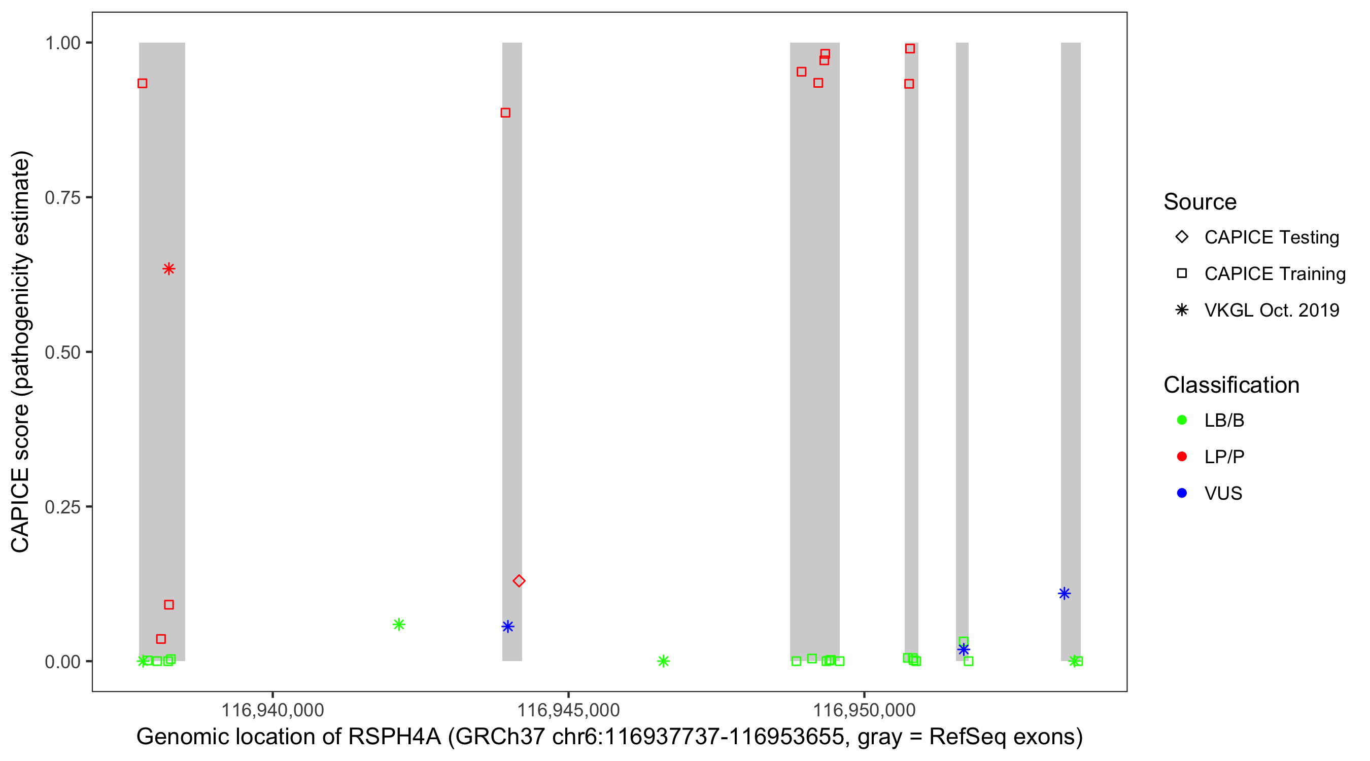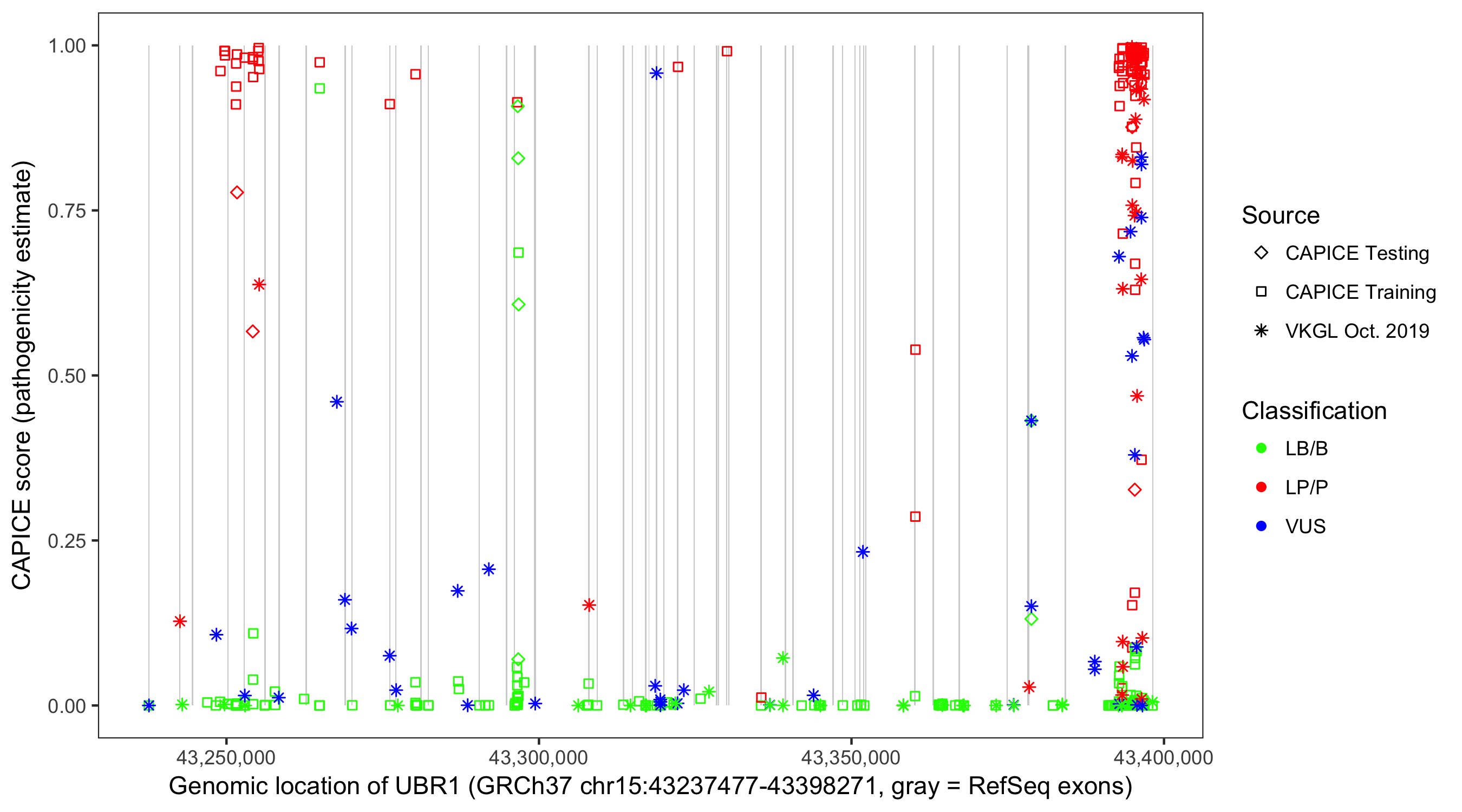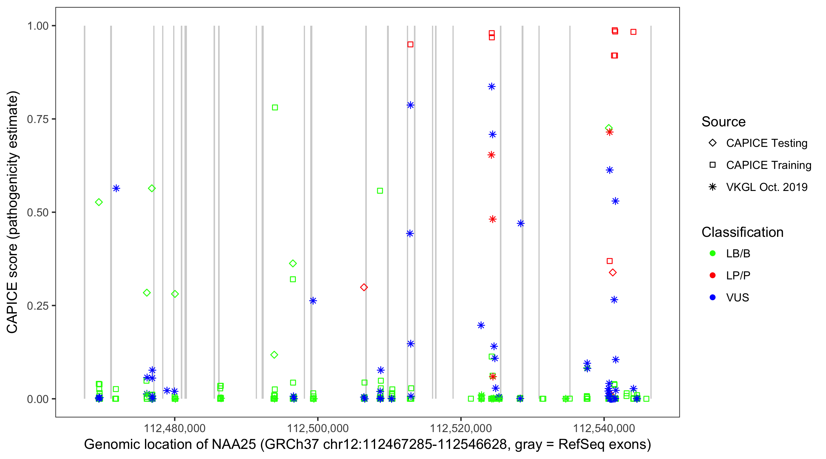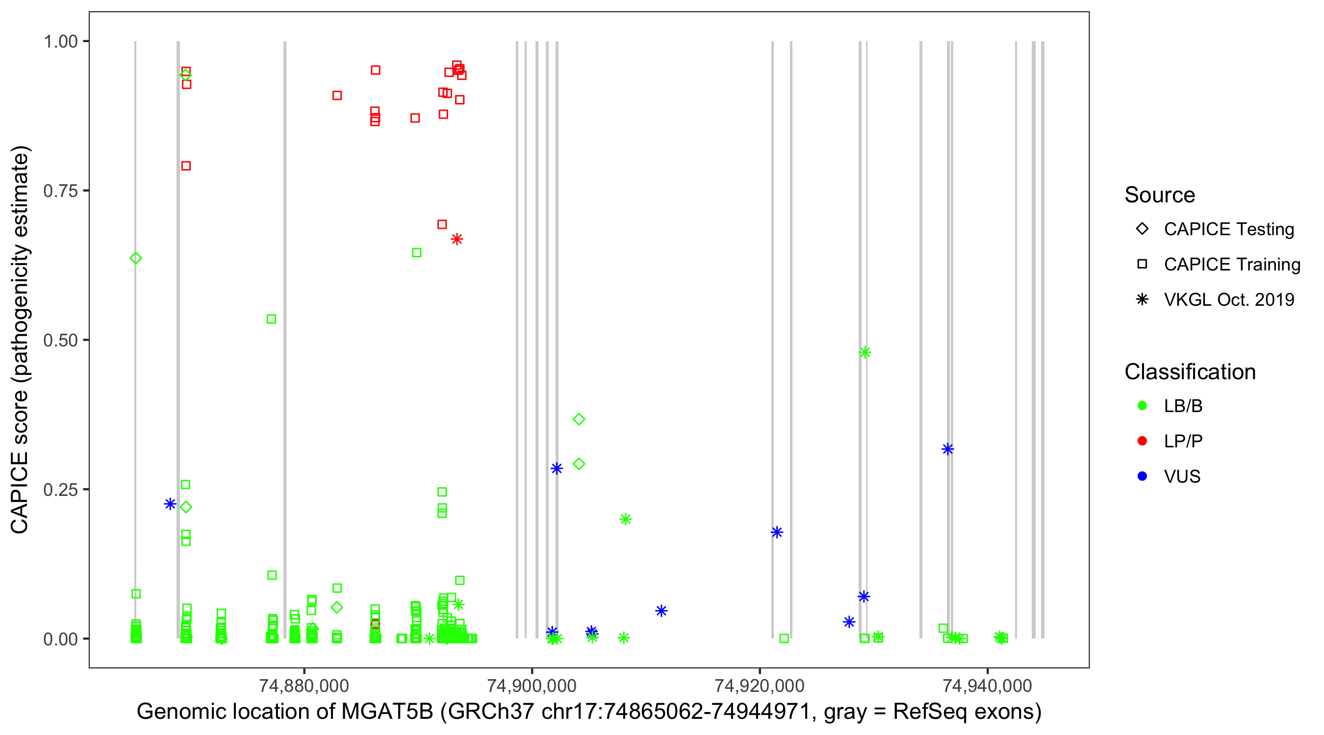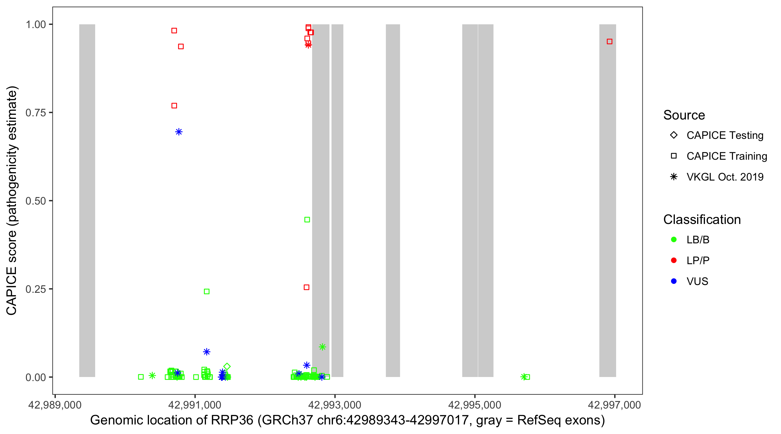 Shown are CAPICE train/test variants plus VKGL Oct 2019.