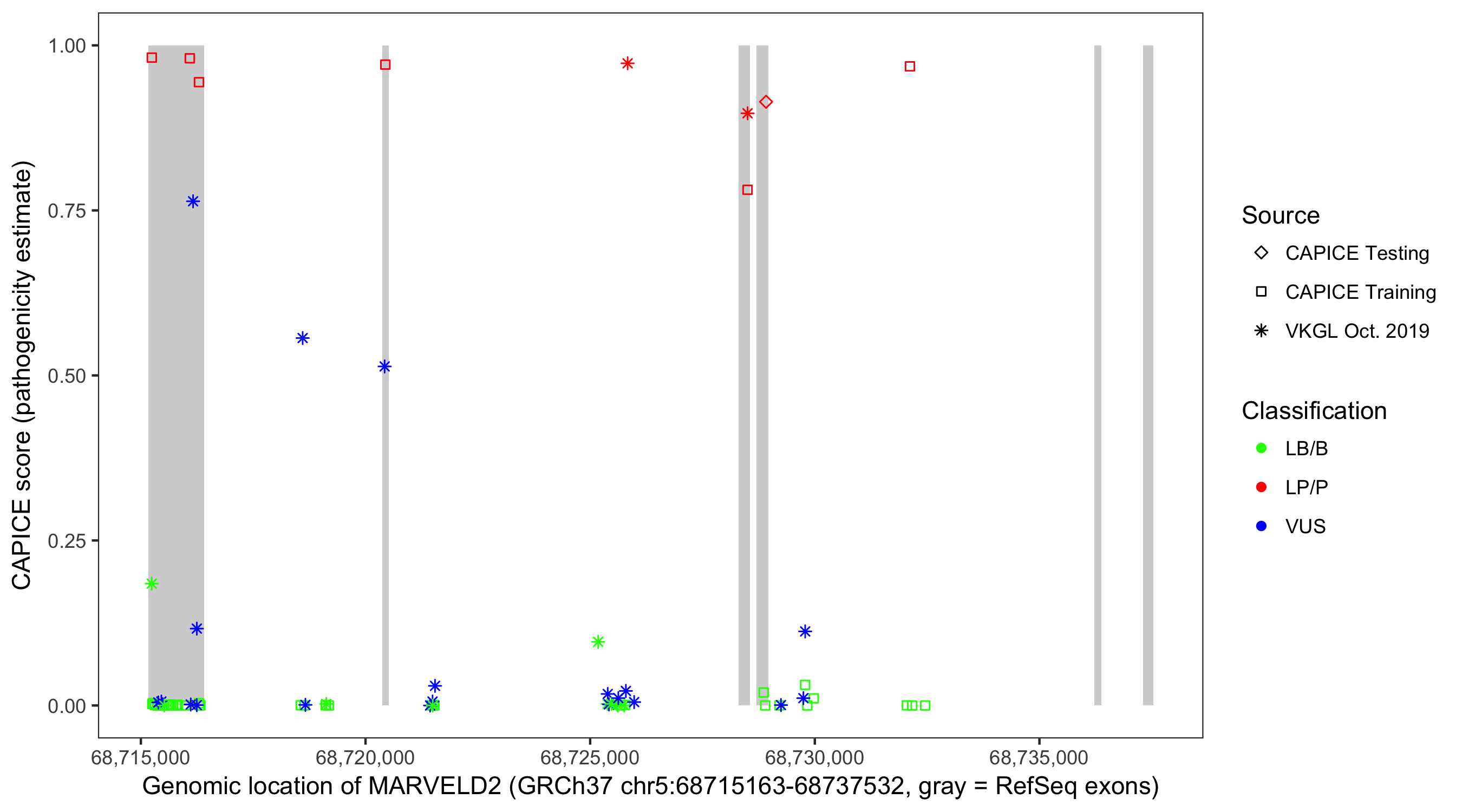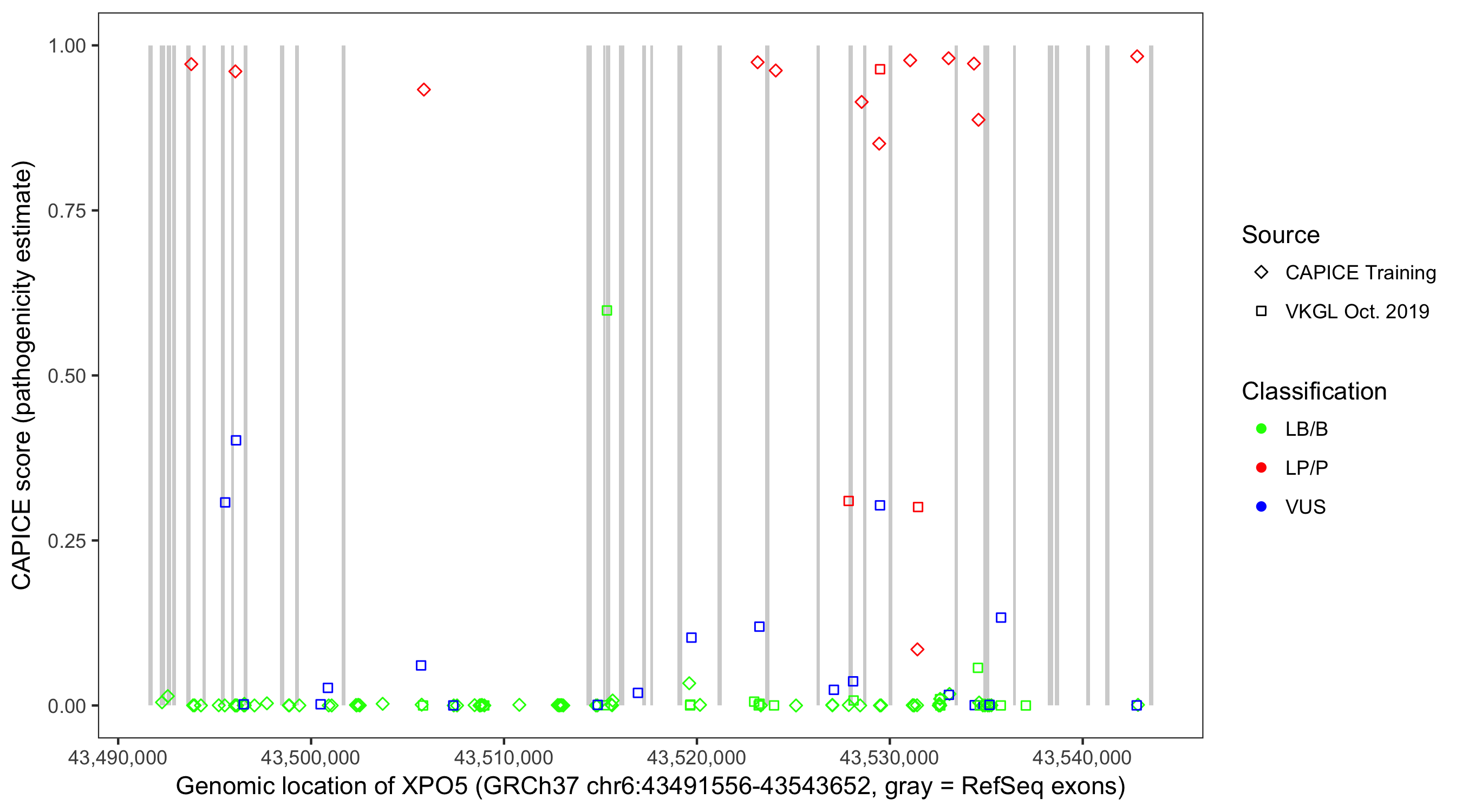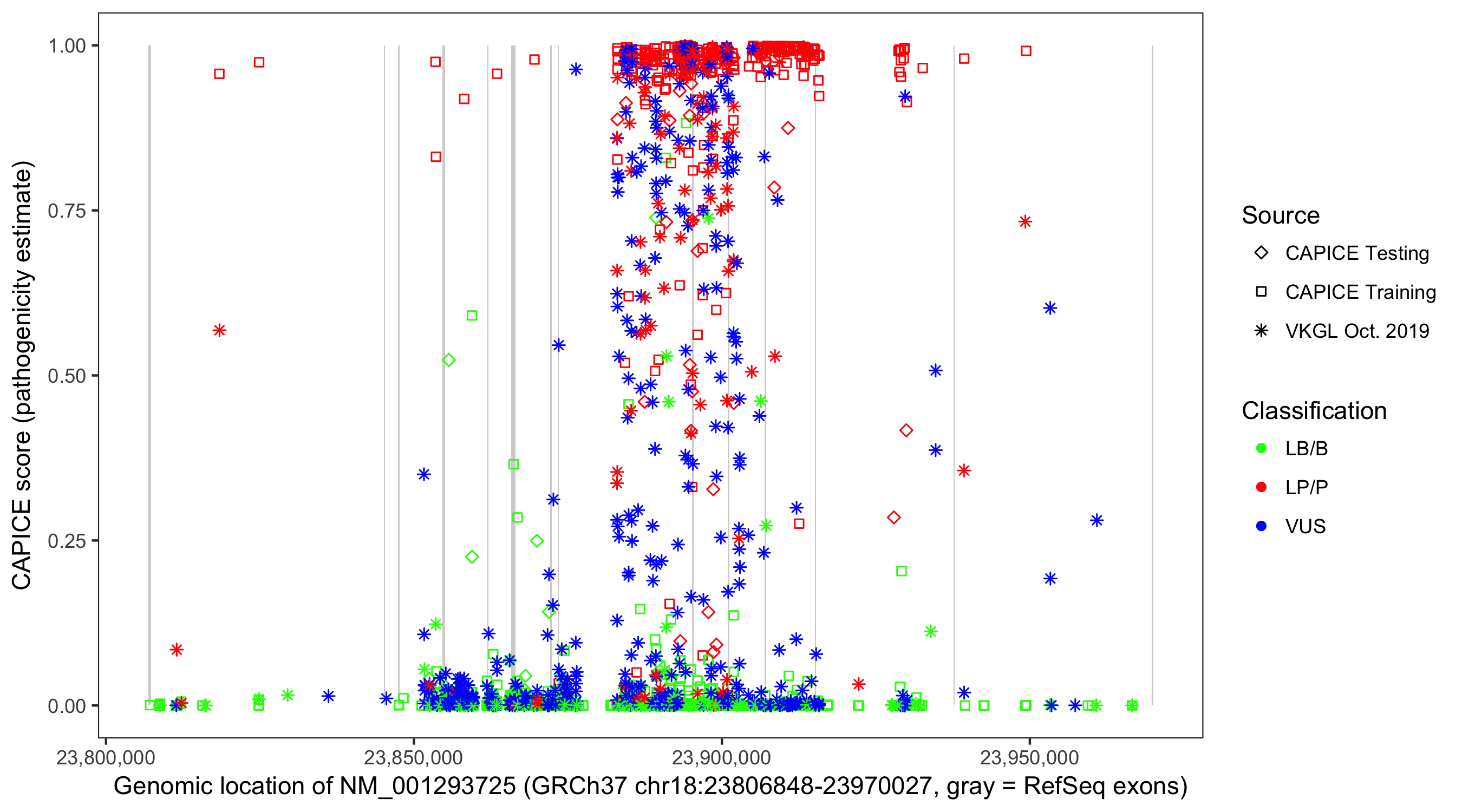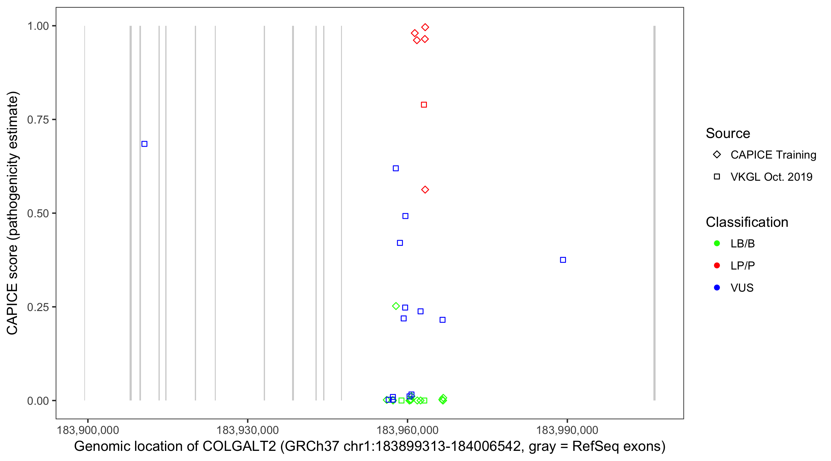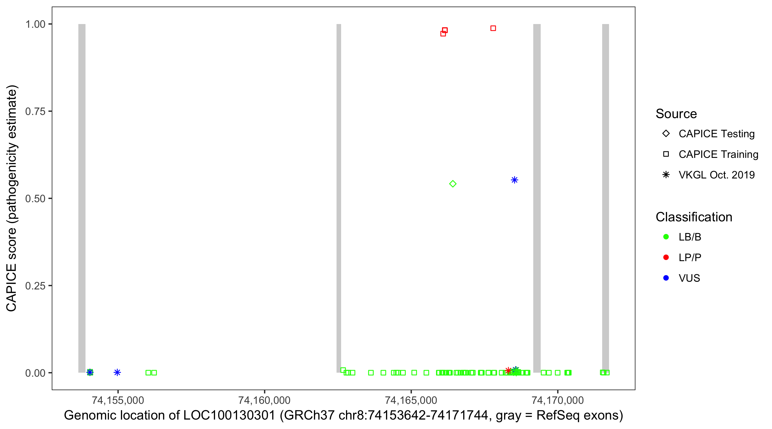 Shown are CAPICE train/test variants plus VKGL Oct 2019.